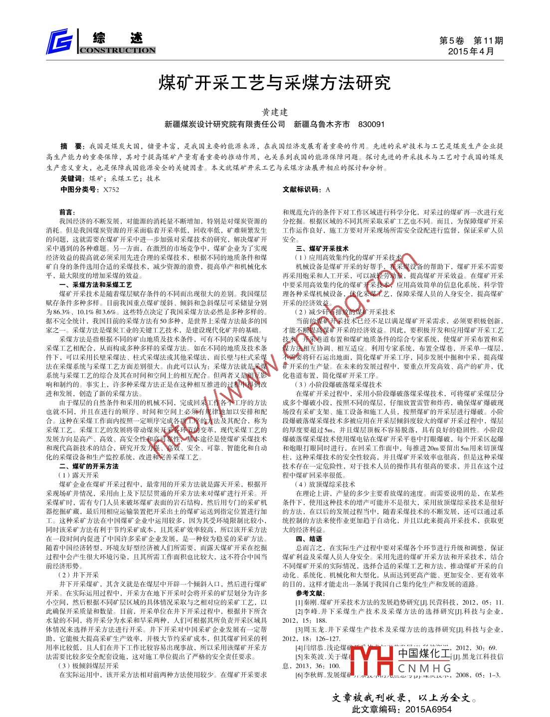 綜述第5卷第11期G|CONSTRUCTION2015年4月.煤礦開采工藝與采煤方法研究黃建建新疆煤炭設(shè)計研究院有限責(zé)任公司新疆烏魯木齊市 830091摘要:我國是煤炭大國,儲量豐富,是我國主要的能源來源,在我國經(jīng)濟發(fā)展有著重要的作用。先進的采礦技術(shù)與工藝是煤炭生產(chǎn)企業(yè)提高生產(chǎn)能力的重要保障,其對于提高煤礦產(chǎn)量有著重要的推動作用,也關(guān)系到我國的能源保障問題。探討先進的開采技術(shù)與工藝對于我國的煤炭生產(chǎn)意義重大,也是保障我國能源安全的關(guān)鍵因素。本文就煤礦開采工藝與采煤方法展開相應(yīng)的探討和分析。關(guān)鍵詞:煤礦;采煤工藝;技術(shù)中圖分類號: X752文獻標(biāo)識碼: A前言和規(guī)范允許的條件下對工作區(qū)城進行科學(xué)分化,對采過的煤礦再- -次進行充我國經(jīng)濟的不斷發(fā)展,對能源的消耗量不斷增加,特別是對煤炭資源的分挖掘。 根據(jù)區(qū)域的不同其所采取采礦工藝也不同。而且,為保障煤礦開采肖耗。但是我國煤炭資源的開采面臨著開采率低,回收率低,礦難頻繁發(fā)生 工作運作良好,施I方要對開采現(xiàn)場所需安全設(shè)配進行監(jiān)督,保證采礦人員的問題,這就需要在煤礦開采中進一一步 加強對采煤技術(shù)的研究,解決煤礦開安全。采中遇到的各種難題。另-方面, 在激烈的市場競爭中,煤礦企業(yè)為了實現(xiàn)三、煤礦開采技術(shù)經(jīng)濟效益的提高就必須采用先進合理的采煤技術(shù),根據(jù)不同的地質(zhì)條件和煤(1)應(yīng)用高效集約化的煤礦開采技術(shù)礦自身的條件選用合適的采煤技術(shù),減少資源的浪費,提高單產(chǎn)和機械化水機械設(shè)備是煤礦開采的好幫手,在采煤設(shè)備的幫助下,煤礦開采不需要平,最大限度的增加采煤的效益。再采用炮采和人工開采,可以減輕勞動量,提高煤礦開采效益。在煤礦開采一、采煤方法和采煤工藝中要采用高效集約化的煤礦開采技術(shù),應(yīng)用高效簡單的信息化系統(tǒng),科學(xué)管煤礦開采技術(shù)是隨著煤層賦存條件的不同而出現(xiàn)很大的差別。我國煤層理 各種采煤機械設(shè)備,優(yōu)化采煤工藝,保障采煤人員的人身安全,提高煤礦賦存條件多種多樣。目前我國重點煤礦緩斜、傾斜和急斜煤層可采儲量分別開 采的經(jīng)濟效益。為86.3%、10.1% 和3.6%。這些特點決定了我國采煤方法必然是多種多樣的。(2)減少矸石排放的煤礦開采技術(shù)據(jù)不完全統(tǒng)計,我國目前的采煤方法有50多種,是世界上采煤方法最多的國當(dāng)前的煤礦開采技術(shù)已經(jīng)不足以滿足煤礦開采需求,必須要積極創(chuàng)新,家之- -。采煤方法是煤炭工業(yè)的關(guān)鍵工藝技術(shù),是建設(shè)現(xiàn)代化礦井的基礎(chǔ)。才能不斷提高煤礦開采的經(jīng)濟效益。因此,要積極開發(fā)和應(yīng)用煤礦開采工藝采煤方法是指根據(jù)不同的礦山地質(zhì)及技術(shù)條件,可有不同的采煤系統(tǒng)與技術(shù)、開采巷道布置和煤礦地質(zhì)條件的綜合專家系統(tǒng),使煤礦開采布置和采采煤工藝相配合,從而構(gòu)成多種多樣的采媒方法。如在不同的地質(zhì)及技術(shù)條煤方法相互協(xié)調(diào)、 相互適應(yīng)。利用專家系統(tǒng),布置全煤巷,開采單一煤層,件下,可以采用長壁采煤法、柱式采煤法或其他采煤法,而長壁與柱式采煤不需 要將矸石運出地面,簡化煤礦開采工序,同步發(fā)展中掘和中采,提高煤法在采煤系統(tǒng)與采煤工藝方面差別很大。由此可以認(rèn)為:采煤方法就是采煤礦 "開采的生產(chǎn)量。在未來的發(fā)展過程中,要重點開發(fā)高效、高產(chǎn)的礦井,優(yōu)系統(tǒng)與采煤工藝的綜合及其在時間和空間上的相互配合。但兩者又是相互影化巷道布置, 簡化煤礦開采I序。響和制約的。事實上,許多種采煤方法正是在這種相互推進的過程中得到改(3)小階段爆破落煤采煤技術(shù)進和發(fā)展,創(chuàng)造了新的采煤方法。在煤礦開采過程中,采用小階段燦破落煤采煤技術(shù),可將煤礦采煤層分由于煤層的自然條件和采用的機械不同,完成回采工作各個工序的方法成 多個爆破小段,按照不同的煤層,仔細(xì)放置雷管和炸藥,確保煤礦爆破現(xiàn)也就不同,并且在進行的順序、時間和空間上必須有規(guī)律地加以安排和配場沒有采礦 支架、施工設(shè)備和施工人員,按照煤礦的開采層進行爆破。小階合。這種在采煤工作面內(nèi)按照一-定順序完成各項工序的方法及其配合,稱為段爆 破落煤采煤技術(shù)多被應(yīng)用在開采層傾斜度較大的煤礦開采過程中,煤層采煤工藝。采煤工藝的發(fā)展將帶動煤炭開采各環(huán)節(jié)的變革,現(xiàn)代采煤工藝的的厚度要 超過5m,并且煤層頂板不容易脫落,具有良好的穩(wěn)固性。小階段發(fā)展方向是高產(chǎn)、高效、高安全性和高可靠性,基本途徑是使煤礦采煤技術(shù)爆 破落煤采煤技術(shù)使用煤電鉆在煤礦開采平巷中打眼爆破,每個開采區(qū)起爆和現(xiàn)代高新技術(shù)的結(jié)合,研究開發(fā)力強、高效、安全、可靠、智能化和自動和炮眼打 眼同時進行,在回采工作面中,每推進20m要留出5m用來切頂煤化的采煤設(shè)備和生產(chǎn)監(jiān)控系統(tǒng),改進和完善采煤工藝。柱,這種采