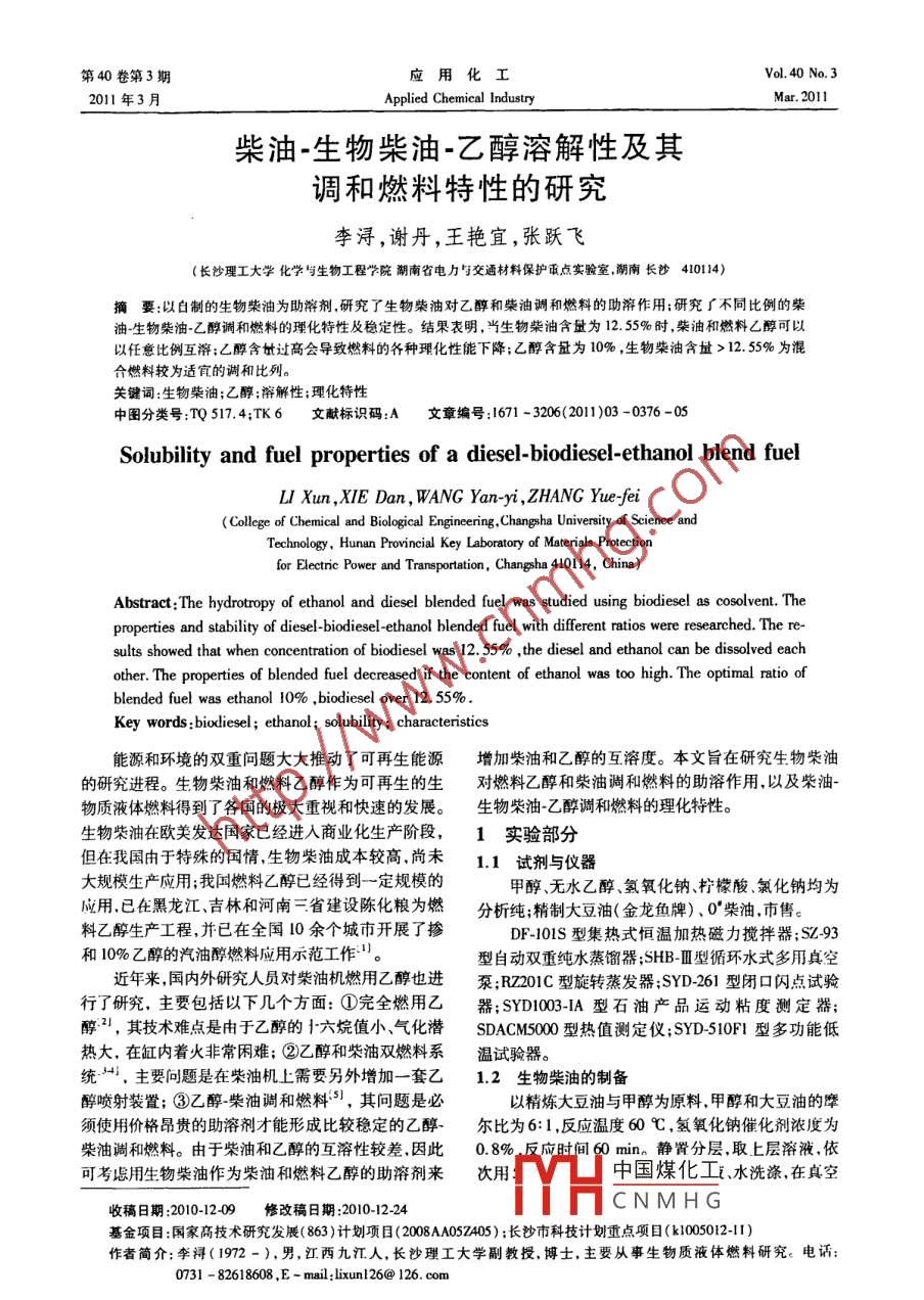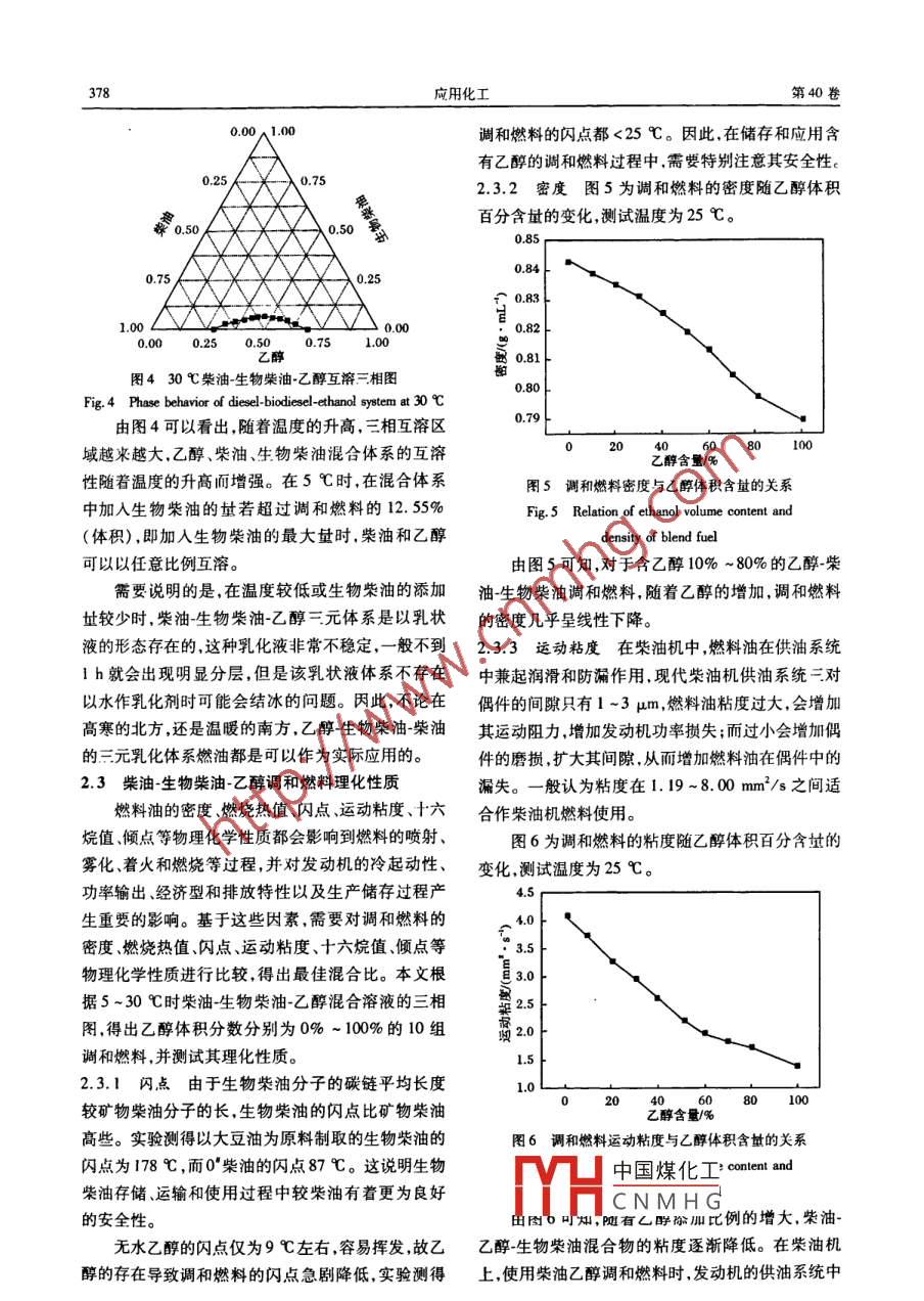 第40卷第3期應(yīng)用化工Vol 40 No. 3201l年3月Applied Chemical IndustryMar 2011柴油-生物柴油-乙醇溶解性及其調(diào)和燃料特性的研究李潯,謝丹,王艷宜,張躍飛(長沙理工大學(xué)化學(xué)與生物工程學(xué)院湖南省電力與交通材料保護重點實驗室湖南長沙410114)摘要:以白制的生物柴油為助溶劑,研究了生物柴油對乙醇和柴油調(diào)和燃料的助溶作用;研究了不同比例的柴油生物柴油-乙醇調(diào)和燃料的理化特性及穩(wěn)定性。結(jié)果表明,當生物柴油含量為12.55%時,柴油和燃料L醇可以以任意比例互溶;乙醇含過高會導(dǎo)致燃料的各種理化性能下降;乙醇含量為10%,生物柴油含量>12.5%為混合燃料較為適宜的調(diào)和比列。關(guān)鍵詞:生物柴油;乙醇;溶解性;理化特性中圖分類號:T5174;TK6文獻標識碼:A文章編號:1671-3206(2011)03-0376-05Solubility and fuel properties of a diesel-biodiesel-ethanol blend fuelLI Xun, XIE Dan, WANG Yan-yi, ZHANG Yue-feiCollege of Chemical and Biological Engineering, Changsha University of Science andhnology, Hunan Provincial Key Laboratory of Materials Protectionfor Electric Power and Transportation, Changsha 410114, ChinaAbstract: The hydrotropy of ethanol and diesel blended fuel was studied using biodiesel as cosolvent. Theproperties and stability of diesel-biodiesel-ethanol blended fuel with different ratios were researched. The results showed that when concentration of biodiesel was 12. 55%, the diesel and ethanol can be dissolved eachother. The properties of blended fuel decreased if the content of ethanol was too high. The optimal ratio ofblended fuel was ethanol 10%, biodiesel over 12. 55%Key words: biodiesel; ethanol; solubility; characteristics能源和環(huán)境的雙重問題大大推動了可再生能源增加柴油和乙醇的互溶度。本文旨在研究生物柴油的硏究進程。生物柴油和燃料乙醇作為可再生的生對燃料乙醇和柴油調(diào)和燃料的助溶作用,以及柴油·物質(zhì)液體燃料得到了各國的極大重視和快速的發(fā)展。生物柴油乙醉調(diào)和燃料的理化特性生物柴油在歐美發(fā)達國家已經(jīng)進入商業(yè)化生產(chǎn)階段,1實驗部分但在我國由于特殊的國情生物柴油成本較高尚未11試劑與儀器大規(guī)模生產(chǎn)應(yīng)用;我國燃料乙醇已經(jīng)得到一定規(guī)模的甲醇、無水乙醇、氫氧化鈉、檸檬酸、氯化鈉均為應(yīng)用已在黑龍江、吉林和河南三省建設(shè)陳化糧為燃分析純;精制大豆油(金龍魚牌)、0柴油市售。料乙醇生產(chǎn)工程,并已在全國10余個城市開展了摻DF-101S型集熱式恒溫加熱磁力攪拌器;S93和10%乙醇的汽油醇燃料應(yīng)用示范工作。型自動雙重純水蒸餾器;SHBⅢ型循環(huán)水式多用真空近年來國內(nèi)外研究人員對柴油機燃用乙醇也進泵RZ0C型旋轉(zhuǎn)蒸發(fā)器;SYD261型閉口閃點試驗行了研究,主要包括以下幾個方面:①完全燃用乙器;SYD103-IA型石油產(chǎn)品運動粘度測定器醇2,其技術(shù)難點是由于乙醇的十六烷值小氣化潛 SDACM0型熱值測定儀;SYD50F1型多功能低熱大,在缸內(nèi)著火非常閑難;②乙醇和柴油雙燃料系溫試驗器。統(tǒng),主要問題是在柴油機上需要另外增加一套乙12生物柴油的制備醇噴射裝置;③乙醇柴油調(diào)和燃料,其問題是必以精煉大豆油與甲醇為原料,甲醇和大豆油的摩須使用價格昂貴的助溶劑才能形成比較穩(wěn)定的乙醇爾比為6:1,反應(yīng)溫度60℃,氫氧化鈉催化劑濃度為柴油調(diào)和燃料。由于柴油和乙醇的互溶性較差,因此0.8%間的0mn靜置分層取上層溶液,依可考慮用生物柴油作為柴油和燃料乙醇的助溶劑來次用中國煤化工水洗滌,在真空收稿日期:2010-1209修改稿日期:201012-24CNMHG基金項目國家高技術(shù)研究發(fā)展(863)計劃項目(2008AAO57405);長沙市科技計劃重點項目(k10050121)作者簡介:李潯(1972-),男,江西九江人,長沙理工大學(xué)副教授,博士,主要從事生物質(zhì)液體燃料研究。電話0731-82618608,E-mail.lixunl26@126.com第3期潯等:柴油-生物柴油乙醇溶解性及其調(diào)和燃料特性的研究度為0.IMPa下減壓蒸餾,蒸出甲醇和水,得到精制和燃料的性能。生物柴油。2.2柴油-生物柴油-乙醇調(diào)和燃料的互溶性1.3柴油-生物柴油乙醇的溶解性由于乙醇是極性分子,使得乙醇柴油調(diào)和燃料柴油生物柴油-乙醇調(diào)和燃料溶解性的實驗步的穩(wěn)定性受柴油中碳氫化合物的構(gòu)成、含水址、密驟:①在-定溫度下,用移液管取柴油20m放入干度、溫度和添加劑t等的影響。生物柴油可以很好燥的100mL試管中,用滴定管添加乙醇并充分振蕩地解決溫度引起的分層問題故乙醇含水址將對混至混合溶液出現(xiàn)渾濁為止,記錄乙醇添加體積數(shù),確合溶液起關(guān)鍵性重要作用,但由于95%的乙醇含水定在不加生物柴油的情況下柴油中可以溶解的乙醇較大,與柴油很難形成穩(wěn)定的相,故本實驗采最大址;2在混合液中緩慢滴加生物柴油同時充分用無水乙醇。通過實驗得到了乙醇、柴油生物柴振蕩,至溶液恰由濁變清時停止,記下所加生物柴油油在常壓、不同溫度下的互溶三相圖(見圖1~圖4)的體積;③繼續(xù)逐次加人2m乙醇,若混合液變混0.00A100濁則滴加生物柴油,并不斷振蕩直至混合溶液完全互溶,直至所加乙醇的量與柴油相同時停止,記錄所加乙醇和生物柴油的體積數(shù);④在同樣溫度下在干燥試管中加入20m乙醇,用滴定管添加柴油并同時振蕩至混合溶液出現(xiàn)渾濁為止,記錄柴油添
