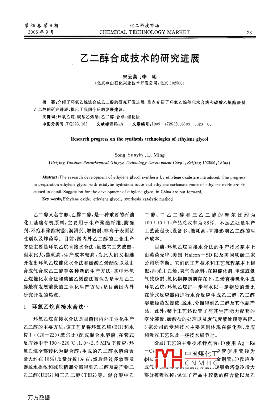 第29卷第9期化工科技市場2006年9月CHEMICAL TECHNOLOGY MARKET23乙二醇合成技術(shù)的研究進展宋云英,李明(北京燕山石化興業(yè)技術(shù)開發(fā)公司,北京102500)摘要:介紹了環(huán)氧乙烷法合成乙二醇的研究開發(fā)進展,重點介紹了環(huán)氧乙烷催化水合法和碳酸乙烯酯法制乙二醇的研究進展,提出了我國今后的發(fā)展建議關(guān)鍵詞:環(huán)氧乙烷;碳酸乙烯酯;乙二醇;合成;催化法中圖分類號:TQ223.162文獻標識碼:A文章編號:1009-4725(2006)09-0023-06Research progress on the synthesis technologies of ethylene glycol(Beijing Yanshan Petrochemical Xingye Technology Development Corp., Beijing 102500, China)Abstract: The research development of ethylene glycol synthesis by ethylene oxide are introduced. The progressin preparation ethylene glycol with catalytic hydration route and ethylene carbonate route of ethylene oxide arecussed in detail. Suggestion for the development of ethylene glycol in China are put forwarEthylene oxide; ethylene glycol; synthesis; catalytic method乙二醇又名甘醇、乙撐二醇,是一種重要的石油二醇、二乙二醇和三乙二醇的摩爾比約為化工基礎(chǔ)有機原料,主要用于生產(chǎn)聚酯纖維、防凍100:10:1,產(chǎn)品總收率為88%。不足之處是生產(chǎn)劑、不飽和聚酯樹脂、潤滑劑、增塑劑、非離子表面活工藝流程長、設(shè)備多、能耗高,直接影響乙二醇的生性劑以及炸藥等。目前,國內(nèi)外乙二醇的工業(yè)生產(chǎn)產(chǎn)成本。方法主要是環(huán)氧乙烷直接水合法,雖然它工藝成熟,目前,環(huán)氧乙烷直接水合法的生產(chǎn)技術(shù)基本上但水比大能耗高,生產(chǎn)成本較高,為此人們又相繼由英荷殼牌、美國 Halcon-SD以及美國聯(lián)碳三家開發(fā)出環(huán)氧乙烷催化水合法和碳酸乙烯酯法以及由公司所壟斷。它們的工藝技術(shù)和工藝流程基本上相合成氣合成乙二醇等各種新的生產(chǎn)方法,其中環(huán)氧似,即采用乙烯、氧氣為原料,在銀催化劑、甲烷或氮乙烷催化水合法和碳酸乙烯酯法被認為是今后乙二氣致穩(wěn)劑、氯化物抑制劑存在下,乙烯直接氧化生成醇最有發(fā)展前景的工業(yè)化生產(chǎn)方法,是目前國內(nèi)外環(huán)氧乙烷,環(huán)氧乙烷進一步與水以一定物質(zhì)的量比研究開發(fā)的熱點。在管式反應(yīng)器內(nèi)進行水合反應(yīng)生成乙二醇,乙二醇1環(huán)氧乙烷直接水合法溶液經(jīng)蒸發(fā)提濃、脫水、分餾得到乙二醇及其他副產(chǎn)品。此外,整個工藝還設(shè)置了與其生產(chǎn)能力配套的環(huán)氧乙烷直接水合法是目前國內(nèi)外工業(yè)化生產(chǎn)空分裝置、碳酸鹽的處理以及廢氣廢液處理等系統(tǒng)。乙二醇的主要方法,該工藝是將環(huán)氧乙烷(FO)和水3家公司的專利技術(shù)主要區(qū)別體現(xiàn)在催化劑、反應(yīng)按1:(20-22)(摩爾比)配成混合水溶液,在管式和吸收工藝以及一些技術(shù)細節(jié)上。反應(yīng)器中于190~220℃,1.0~2.5MPa下反應(yīng),環(huán)Shell工藝的主要技術(shù)特點為:1)使用Ag-氧乙烷全部轉(zhuǎn)化為混合醇,生成的乙二醇水溶液含中國煤化工管使用管徑為量大約在10%(質(zhì)量分數(shù))左右,然后經(jīng)過多效蒸發(fā)CNMH鋼管;3)反應(yīng)生器脫水提濃和減壓精餾分離得到乙二醇及副產(chǎn)物二成氣中我院吸收塔急冷段大乙二醇(DEG)和三乙二醇(TEG)等。混合醇中乙部分被吸收掉,保證了產(chǎn)品中較低的醛含量以及乙24化工科技市場第29卷第9期二醇產(chǎn)品的UV值;(4)從貧吸收水中抽出開發(fā)出類似二氧化硅骨架的聚有機硅烷銨鹽負載型20-30t/h送到解吸塔提濃段,將解吸過程中環(huán)氧催化劑及其催化下的環(huán)氧化物水合工藝。在水/環(huán)乙烷水解生成的醇濃縮(約含醇30%),以1.2t/h氧化物摩爾比為(1~15):1,反應(yīng)溫度80~200℃量排至醇閃蒸回收塔,避免了吸收水中醇的積累。反應(yīng)壓力0.2~2MPa條件下,環(huán)氧乙烷的轉(zhuǎn)化率D工藝的主要技術(shù)特點為:1)采用C9以上新為72%,乙二醇選擇性為95%。2001年殼牌公酸銀鹽制備的含銫銀催化劑;2)反應(yīng)管使用管徑為司又開發(fā)出負載于離子交換樹脂上的多羧酸衍生中38.1mm×3.4mm的無縫碳鋼管;3)設(shè)置環(huán)氧乙物催化劑。在水/環(huán)氧化物摩爾比為(1~6):1,反烷再吸收系統(tǒng),調(diào)節(jié)循環(huán)工藝水量恰好維持再吸收應(yīng)溫度90~150℃,反應(yīng)壓力0.2~2MPa條件下塔釜液中的環(huán)氧乙烷濃度(質(zhì)量分數(shù)約為10%),然環(huán)氧乙烷的轉(zhuǎn)化率大于97%,乙二醇選擇性高于后直接送入環(huán)氧乙烷精餾塔或乙二醇水合系統(tǒng),減94%。采用該工藝既可進行間歇操作,也可進行連少了系統(tǒng)中處理高濃度環(huán)氧乙烷的部位,裝置的安續(xù)生產(chǎn)。與現(xiàn)行環(huán)氧乙烷高溫高壓水解工藝相比,全性較好;4)裝置的整個水系統(tǒng)基本上采用閉環(huán)控該技術(shù)可節(jié)省環(huán)氧乙烷/乙二醇裝置總投資費用的制,各凝液量充分利用,使裝置水耗量較低,但因水15%左右。最近該公司又成功地開發(fā)出第一代水合系統(tǒng)置換量小,整個水系統(tǒng)雜質(zhì)積累較多,影響了產(chǎn)催化劑S100,并完成了催化劑篩選和40.0萬t/a環(huán)品UV值的控制。氧乙烷水合裝置的工藝設(shè)計,催化劑水合已經(jīng)完成UCC工藝的主要技術(shù)特點:1)使用含鋰、鈉、了單管和中試,試驗經(j