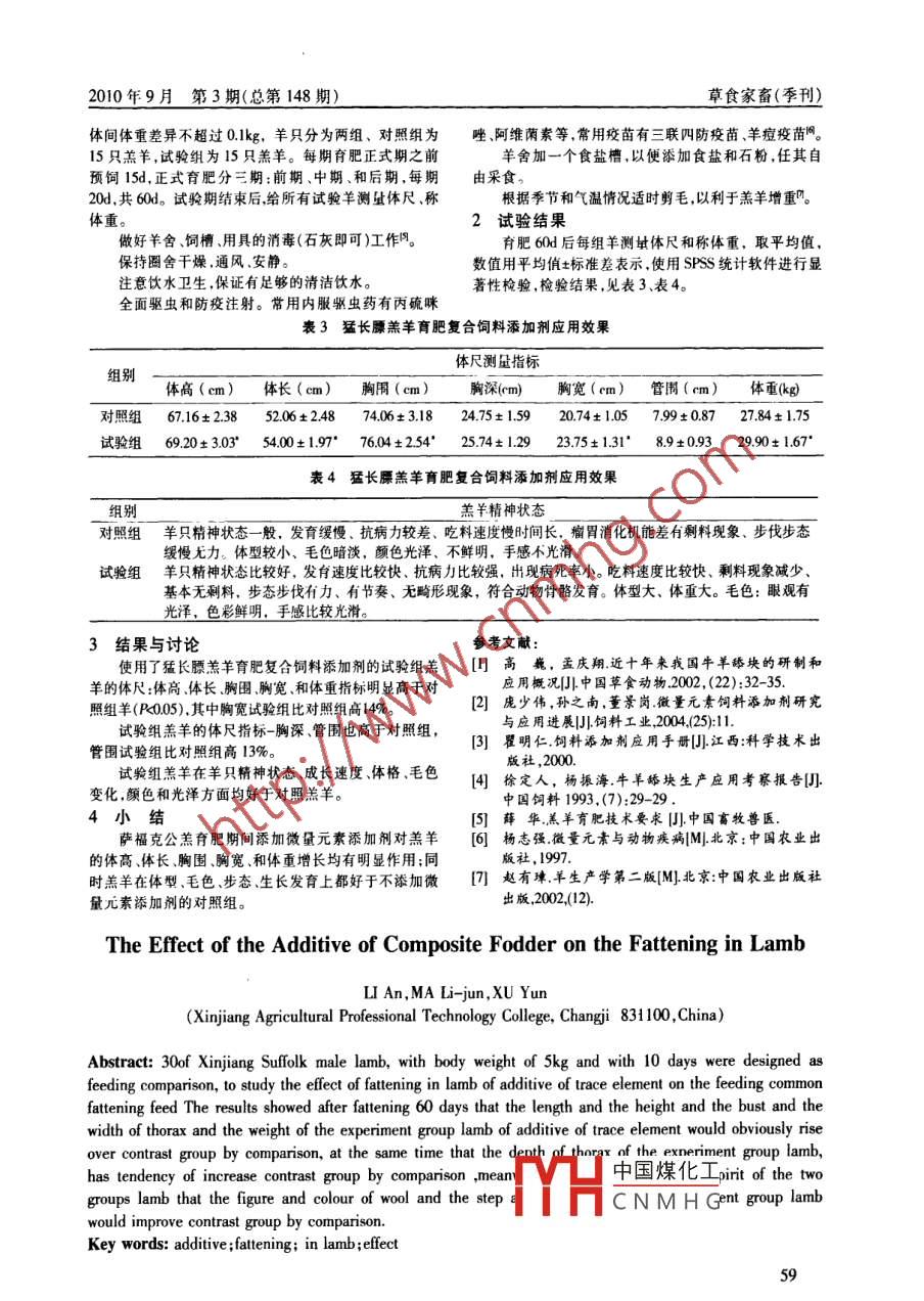 2010年9月第3期(總第 148期)草食家畜(季刊)復(fù)合飼料添加劑對羔羊育肥的影響李桉,馬麗筠,許蕓(新疆農(nóng)業(yè)職業(yè)技術(shù)學(xué)院,新疆昌吉831100)摘要:本試驗選取 30只、體重5kg左右,10日齡薩??斯?采用飼喂對比試驗設(shè)計研究微量元素添加劑對飼喂一般羔羊育肥飼料羔羊育肥的影響。結(jié)果表明育肥60d后,添加微量元素的試驗組羔羊體尺指標-體高、體長、胸圍、胸寬、和體重均明顯高于對照組;同時試驗組的體尺指標-胸深、管圍也有高于對照組的趨勢,于此同時觀察兩組羔羊精神狀態(tài),發(fā)現(xiàn)試驗組羔羊在體型、毛色、步態(tài)、生長發(fā)育上都好于對照組。關(guān)鍵詞:添加劑;羔羊;育肥;影 響中圖分類號:S816.7文獻標識碼:A文章編號:1003- 63772010)03- -058-02微量元素用于反當動物,可使飼料轉(zhuǎn)化率提高,出.1.1 試驗材料欄時間縮短,飼養(yǎng)成本降低,對產(chǎn)肉、產(chǎn)毛和產(chǎn)奶等生新疆華興種畜繁育公司羊場,試驗時間是2008年產(chǎn)性能影響顯著,還可提高家畜的生產(chǎn)性能和健康水3月。試驗動物是10日齡的薩??斯?試驗材料為猛平,其飼養(yǎng)效果是顯著的四。本文則是在飼喂- -般日糧.長膘羔羊育肥復(fù)合飼料添加劑。.的條件下,研究添加微冠元素添加劑對薩??烁嵫蝮w尺1.2 飼養(yǎng)管理指標、體重的影響,現(xiàn)將有關(guān)結(jié)果報道如下。試驗期內(nèi)羔羊均處于同等管理水平,實行舍飼,羔羊1材料和方法各期育肥日糧配方、添加敏見表1、表2。表1羔羊各期育肥 日糧配方羔羊育肥日糧配方%育肥期玉米豆粕前期60%25%15%中期65%10%后期70%20%2羔羊各期育肥日糧添加量羔羊育肥日糧添加晝補充精料(g)優(yōu)質(zhì)苜蓿干草(g)試驗組添加猛長膘(g)50-100 .500.9150-2001502.8250-3002503.3注:精料日喂2次,將精料總量均分成兩份,早、晚必要將猛長膘在精料中攪拌均勻。其它草秸自由采食,各喂一份,先精后粗,粗料苜蓿干草平均分成三份,日飲水不限”。猛長膘羔羊育肥復(fù)合飼料添加劑主要是由喂三次,早、中晚。試驗組精料里在添加猛長膘時,務(wù)池中的舔加劑.其中還有其中國煤化工進劑及其對有害收稿日期:2010-04-08微生YHC N M H G把期間飼喂"。作者簡介:李桉(1970-),女 ,碩士研究生,講師,主要從事動物營養(yǎng)與飼料研究。試驗前將供試羔羊稱體重,根據(jù)體重分組,每組個582010年9月第3期(總第 148期)草食家畜(季刊)體間體重差異不超過0.1kg,羊只分為兩組、對照組為唑、阿維蔭素等,常用疫苗有三聯(lián)四防疫苗、羊痘疫苗間。15只羔羊,試驗組為15只羔羊。每期育肥正式期之前羊舍加一個食鹽槽 .以便添加食鹽和石粉,任其自預(yù)飼15d,正式育肥分三期:前期、中期、和后期,每期由采食,20d,共60d。試驗期結(jié)束后,給所有試驗羊測墜體尺、稱根據(jù)季節(jié)和氣溫情況適時剪毛,以利于羔羊增重"。體重2試驗結(jié)果.做好羊舍、飼槽用具的消毒(石灰即可)工作。育肥60d后每組羊測甘體尺和稱體重,取平均值,保持圈舍干燥.通風.安靜。數(shù)值用平均值t標準差表示.使用SPSS統(tǒng)計軟件進行顯注意飲水衛(wèi)生,保證有足夠的清潔飲水。著性檢驗,檢驗結(jié)果,見表3、表4。全面驅(qū)蟲和防疫注射。常用內(nèi)服驅(qū)蟲藥有丙硫瞇表3猛長膘羔羊育肥復(fù)合飼料添加劑應(yīng)用效果體尺測量指標組別體高(cm)體長 (cm)胸闈(cm)胸深(cm)胸寬(em)管圍( cm)體重(kg)對照組67.16+2.38 52.06 士2.4874.06+3.18 24.75士 1.5920.74+1.05 799+0.87 27.84土 1.75試驗組69.20土3.03° 54.00+ 1.97*76.04+2.54' 25.74士 1.2923.75+1.31' 8.9 士0.9329.90士1.67*表4猛長膘羔羊育肥復(fù)合飼料添加劑應(yīng)用效果羔¥精神狀態(tài)對照組羊只精神狀態(tài)一般. 發(fā)育緩慢、抗病力較差、吃料速度慢時間長,瘤胃消化機能差有剩料現(xiàn)象、步伐步態(tài)緩慢尤力。體型較小、毛色暗淡,顏色光澤、不鮮明,手感不光滑。試驗組羊 只精神狀態(tài)比較好,發(fā)自速度比較快、抗病力比較強,出現(xiàn)病死率小。吃料速度比較快、剩料現(xiàn)象減少、基本無剩料,步態(tài)步伐有力、有節(jié)奏、無畸形現(xiàn)象,符合動物骨骼發(fā)育。體型大、體重大。毛色:眼觀有光澤,色彩鮮明,手感比較光滑。3結(jié)果與討論參考文獻:使用了猛長膘羔羊育肥復(fù)合飼料添加劑的試驗組羔1] 高巍,孟慶翔.近十年來我國牛羊舔塊的研制和羊的體尺:體高、體長胸圍胸寬、和體重指標明顯高于對應(yīng)用概況[J中國草食動物2002,(22):32-35.照組羊(P0.05),其中胸寬試驗組比對照組高14%。[2] 龐少偉 ,孫之南,董景崗.微量元素飼料添加劑研究與應(yīng)用進展|J],飼料工業(yè),2004.(25);11.試驗組羔羊的體尺指標胸深管圍也高于對照組,[3] 瞿明仁.飼料添加劑應(yīng)用手冊[].江西:科學(xué)技術(shù)出管圍試驗組比對照組高13%。版社2000.0試驗組羔羊在羊只精神狀態(tài)、成長速度、體格、毛色[4]徐定人, 楊振海.牛羊舔塊生產(chǎn)應(yīng)用考察報告小]變化,顏色和光澤方面均好于對照羔羊。中國飼料1993,(7):29 -29.4小結(jié)[5]薛華羔羊育肥技術(shù)要求[J].中國畜牧獸醫(yī).薩??斯嵊势陂g黍加微量元素添加劑對羔羊[6] 楊志強.微量元素 與動物疾病|M].北京:中國農(nóng)業(yè)出的體高、體長.胸圍胸寬、和體重增長均有明顯作用;同版社,1997.時羔羊在體型.毛色、步態(tài)、生長發(fā)