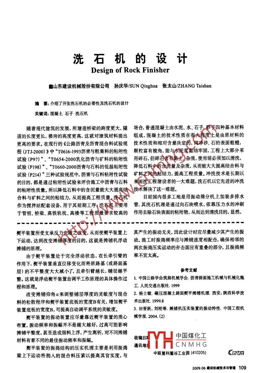 洗石機的設(shè)計Design of Rock Finisher山東建設(shè)機械股份有限公司 孫慶華/SUN Qinghua 張?zhí)?ZHANG Taishan摘要: 介紹了開發(fā)洗石機的必要性及洗石機的設(shè)計關(guān)鍵詞:混凝土石子洗石機隨著現(xiàn)代建筑的發(fā)展,所建造橋梁的跨度更大,隧場合, 普通混凝土由水泥水石子砂子四種基本材料道的長度更長,樓房的高度更高,這就對建筑材料提出組成,混凝土的技術(shù)性質(zhì)在很大程度上是由原材料的更高的要求。在現(xiàn)行的《公路瀝青及瀝青混合料試驗規(guī)技術(shù)性質(zhì)和相對含量決定的,純凈砂石的表面粗糙,程(JT_2000)》中“T0616-1993瀝青與粗集料的粘附性顆粒富有棱角,能與水泥漿黏結(jié)牢固,工程上大部分采試驗(P97)”、“T0654-2000乳化瀝青 與礦料的粘附性用碎石,但碎石含有黏土,雜質(zhì),使用前必須加以清洗,試驗(P198)”、“T0660-2000瀝青與石料的低溫粘附性降低石料中的含泥量及雜質(zhì),從而能大大提高結(jié)合料與試驗(P214)”三種試驗規(guī)范中,瀝青與石料粘附性試驗礦料之間的粘結(jié)力, 提高工程質(zhì)量。沖洗技術(shù)是長期以的目的,都是通過粘附性試驗來評價施工中瀝青與石料來困擾工程建設(shè)者的一大難題,洗石機以它先進(jìn)的沖洗的粘附性質(zhì)量。所以降低石料中的含泥量能大大提高結(jié)技術(shù)解決了這一難題。合料與礦料之間的粘結(jié)力,從而提高工程質(zhì)量。洗石機目前國內(nèi)很多工地是用振動篩分機上加裝多排水作為攪拌站配套設(shè)備,用于其前期工序,洗石機主要用管,其洗石機理是通過向石塊噴水,依靠壓力水的沖刷于管樁、橋梁、高鐵軌枕、高樓等工程質(zhì)量要求較高的作用去除石塊表面的粘附物, 從而達(dá)到清洗目的,顯然,熨平裝置所受支承反力也隨之改變,從而使熨平裝置上其產(chǎn)生的振動無關(guān),因此設(shè)計時應(yīng)盡量減少其產(chǎn)生的振下運動,達(dá)到改變攤鋪厚度的目的,這就是攤鋪機浮動動。施工時振搗頻率應(yīng)與攤鋪速度相配合,確保相鄰的攤鋪的原理。兩次振搗壓實運動的夯擊面應(yīng)有重疊的部分,且振搗頻由于熨平裝置處于完全浮動狀態(tài),在長牽引臂的率不宜太高。作用下,熨平裝置垂直位移變化而將原路基(或路面基層)的不平整度大大減小了,且牽引臂越長,鋪層越平參考文獻(xiàn)整。這就是浮動熨平裝置自調(diào)平工作原理的具體操作過1.中國公路學(xué)會筑路機械學(xué)會.瀝青路面施工機械與機械化施程和原理。工人民交通出版社.1999改變攤鋪仰角a來調(diào)整鋪層厚度的靈敏度與混合2.楊士敏.碾壓混凝土路面熨平攤鋪機理西安:陜西科學(xué)技料的松散程序和熨平裝置底板的寬度B有關(guān),增加熨平術(shù)出版社.199.8裝置底板的寬度B,可提高自動調(diào)平系統(tǒng)的靈敏度。3.田晉躍,劉剛等攤鋪機壓實裝置的振動特性.中國工程機熨平裝置的振動裝置應(yīng)盡量靠近熨平裝置的質(zhì)心械學(xué)報. 2004 (2)布置,振動頻率和振幅并不是越大越好,過高可能影響攤鋪平整度,甚至造成細(xì)料上浮,產(chǎn)生離析,對不同攤鋪中國煤化工收稿日期材料有著不同的最佳振動頻率和振幅。熨平裝置的振搗結(jié)構(gòu)的壓實機理主要是利用振搗通訊地;fYHCNMHG中聯(lián)重科麓谷工業(yè)園(410205)Cmtn梁.上下運動將擁入的混合料壓緊以提高其官實度,與.2009.06設(shè)機械技術(shù)與管理 109對于水沖洗不到的地方,很難達(dá)到?jīng)_洗目的,即使水沖皮帶機主要由電動滾簡、平輥、立輥、機架等組成,洗到的地方,對于粘附比較牢固的雜質(zhì),單靠水的壓力皮 帶機保證石子勻速、連續(xù)地進(jìn)料,其進(jìn)料速度與滾筒沖刷也很難清洗干凈,所以洗滌效果很差且耗水量巨轉(zhuǎn)速結(jié)合, 保證洗石的均勻,高效。大,開發(fā)洗石機迫在眉睫?,F(xiàn)有國產(chǎn)洗石機多為螺旋軸滾簡是洗石機的核心部件,洗石工作主要在滾筒內(nèi)輸送式,耗水量大,況且洗滌不干凈,洗后石子含水率完成, 石料由皮帶機進(jìn)入滾簡后隨滾簡一起旋轉(zhuǎn),滾筒高,再有就是工作時噪聲大,環(huán)境惡劣。隨著國民環(huán)保內(nèi)帶螺旋葉片,螺旋葉片的作用是使石子按- -定速度前意識的增強,本著節(jié)約水資源的原則,應(yīng)開發(fā)節(jié)水、環(huán)進(jìn),起攬拌作用,加強洗滌效果,石子前進(jìn)的動力主要來保的洗石機。.自隨螺旋葉片的推動力,阻力為石子與筒體的摩擦力、我公司開發(fā)的洗石機是滾筒式的,與目前市場上普石子與石子間的擠壓 力前進(jìn)方向螺旋葉片的阻力等。遍采用的螺旋式洗石機相比,有下列優(yōu)點:石子依靠蝶旋葉片的推動,在離心力、摩擦力和自身重洗石效果更好,在螺旋葉片的強制攪拌下,石子由力作用下達(dá)到攪拌,前進(jìn)的目的,清洗效果好,在最后出清水不斷沖洗,洗滌充分干凈料端滾簡上有濾網(wǎng)過濾水,污水和雜質(zhì)由此過濾出去,洗滌后石子的含水率低,滾筒的后半部分上帶有均而洗凈的石子由出料口排出, 出料口設(shè)計有出料葉片,石勻的出水孔,污水早早就排出,石子含水率低子連續(xù)進(jìn)料連續(xù)出料,生產(chǎn)率高。由于石子與簡體內(nèi)表耗水量小,污水經(jīng)沉淀池循環(huán)利用,節(jié)約水資源,而面、螺旋葉片之間相互強烈碰裝和摩擦,要求筒體材