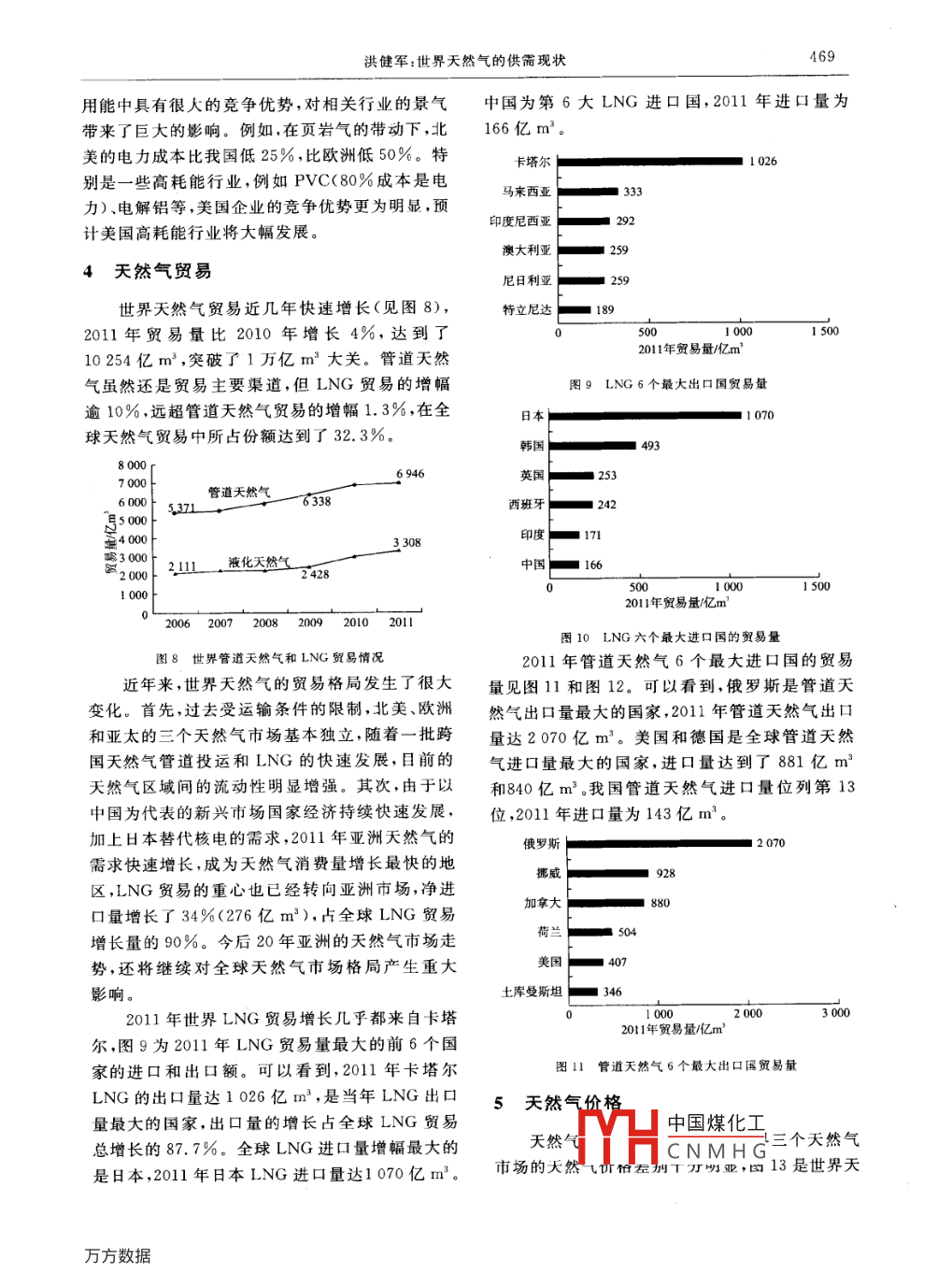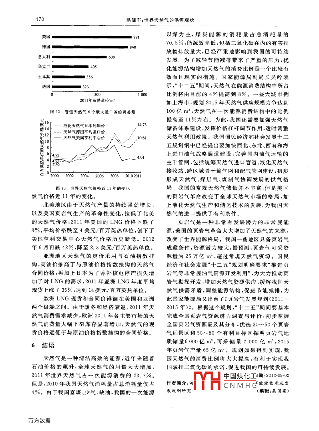 第33卷第5期2012年10月電力與能源467世界天然氣的供需現(xiàn)狀洪健軍(上海市能源研究會(huì),上海200020)摘要:根據(jù)有關(guān)資料對(duì)2011年全球天然氣的生產(chǎn)和消費(fèi)進(jìn)行了歸納和評(píng)價(jià),分析了近年來全球天然氣生產(chǎn)和消費(fèi)的發(fā)展勢(shì)頭,特別是美國的貞巖氣革命對(duì)世界天然氣的貿(mào)易格局的影響,可以為我國提高天然氣使用比例、優(yōu)化我國能源結(jié)構(gòu)決策的制定,包括開發(fā)我國豐富頁巖氣資源提供參考,關(guān)鍵詞;天然氣;頁巖氣;世界天然氣市場(chǎng)格局;能源結(jié)構(gòu)優(yōu)化圖分類號(hào):TK01文獻(xiàn)標(biāo)志碼:C文章編號(hào):2095-1256(2012)05-0467-04Supply and demand situation of Natural Gas in WorldHong jianjun( Shanghai Energy ResearchInstitute, Shanghai 20020, China)天然氣是一種清潔優(yōu)質(zhì)的化石能源。隨著探量為3.1萬億m3,排列第13位。明儲(chǔ)量的增加和生產(chǎn)消費(fèi)規(guī)模的擴(kuò)大,特別是全6球氣候變化和環(huán)保壓力的激增,天然氣日益受到伊朝人們的重視,并在迅速變動(dòng)的世界能源格局中具卡塔爾土庫曼斯坦有舉足輕重的作用,所占地位不斷提升。本文將美國對(duì)全球天然氣的發(fā)展情況作些介紹,并對(duì)我國天沙特阿拉伯然氣的利用前景作些分析。論文中的圖表由BP阿拉伯聯(lián)合長(zhǎng)圖61公司的統(tǒng)計(jì)數(shù)據(jù)制作委內(nèi)瑞拉尼日利亞1天然氣探明儲(chǔ)量天然氣探明儲(chǔ)量/萬億m3在枻界各國的努力勘探下,全球天然氣探明圖2天然氣探明儲(chǔ)量在5億t以上的前9位國家儲(chǔ)量的數(shù)據(jù)毎年都在增加,據(jù)統(tǒng)計(jì)2011年底達(dá)208.4萬億m3,見圖1,按世界各國目前的消費(fèi)水2天然氣生產(chǎn)與消費(fèi)平可以滿足全球63.6年的需要。其中俄羅斯天進(jìn)入21世紀(jì)后,世界天然氣生產(chǎn)和消費(fèi)平穩(wěn)然氣的探明儲(chǔ)量最大,2011年底探明儲(chǔ)量達(dá)增長(zhǎng),2000-2011年11年間,全球天然氣生產(chǎn)和44.6萬億m3,儲(chǔ)產(chǎn)比達(dá)到73.5年消費(fèi)的年均增速為2.8%和2.7%,供需基本保持平衡,見圖3。2011年全球的天然氣產(chǎn)量為3.28萬億m3,比2010年增長(zhǎng)3.1%,略高于歷史2005190187.3平均水平(2.8%)。2011年全球天然氣消費(fèi)量為g180171.33.22萬億m3,比2010年增長(zhǎng)2.2%,略低于歷史173.2160黑150平均水平(2.7%)。40全球天然氣產(chǎn)量最多的6個(gè)國家的天然氣生130產(chǎn)情況見圖4??梢钥吹?美國和俄羅斯是世界1995200020032006200920102011最大的天然氣生產(chǎn)國和消費(fèi)國。其中美國2011圖1世界天然氣探明儲(chǔ)量年的天然氣V凵中國煤化工2010年增加2011年天然氣探明儲(chǔ)量在5萬億m3以上的了470億CNMHG率(7.8%),9個(gè)國家如圖2所示。其中中國探明的天然氣儲(chǔ)相當(dāng)于2011年當(dāng)年全球增量的48%。468洪健軍:世界天然氣的供需現(xiàn)狀美國6930300322293005128300俄羅斯奀然氣需費(fèi)伊朗本106200020022004200620082010201100020022004200620082010201l圖3世界天然氣生產(chǎn)與消費(fèi)圖6天然氣消費(fèi)最多的5個(gè)國家2000-2011年的消費(fèi)量中國天然氣市場(chǎng)規(guī)模在過去5年里擴(kuò)大了俄羅斯60倍多。天然氣供應(yīng)主要來自于國內(nèi)天然氣增產(chǎn)美國651400(增長(zhǎng)8%)、管道天然氣進(jìn)口(來自于土庫曼斯坦,143億m3),以及LNG進(jìn)口(主要來自澳大利加拿大161亞、卡塔爾、印度尼西亞和馬來西亞,166億m3)。1009朗102二中1033頁巖氣開發(fā)2000200220042006200820102011近幾年,在美國頁巖氣勘探開發(fā)技術(shù)取得突圖4天然氣生產(chǎn)最多的5個(gè)國家2000-2011年產(chǎn)量2011年全球天然氣生產(chǎn)增速最快的國家還破、產(chǎn)量快速增長(zhǎng)的推動(dòng)下,世界主要資源國家都有卡塔爾、土庫曼斯坦和秘魯,增長(zhǎng)率分別為加大了對(duì)頁巖氣的勘探開發(fā)力度,不少國家取得25.8%,40.6%和56.9%。特別是卡塔爾,201了重要進(jìn)展。頁巖氣已經(jīng)并將進(jìn)一步對(duì)國際天然年的產(chǎn)量已經(jīng)超過中國,成為全球第五大天然氣氣市場(chǎng)及世界能源格局產(chǎn)生重大影響。生產(chǎn)國。相反,由于老氣田產(chǎn)量的衰減、設(shè)備陳舊目前,美國已形成一套先進(jìn)有效的頁巖氣開維修時(shí)間的增加和區(qū)域消費(fèi)需求的萎靡,2011年采技術(shù),這些先進(jìn)技術(shù)的大規(guī)模應(yīng)用提高了單井歐盟的天然氣的產(chǎn)量出現(xiàn)了有史以來的最大降幅產(chǎn)量,降低了頁巖氣開采的成本,促進(jìn)了頁巖氣的(降低11.4%);特別是英國,天然氣減產(chǎn)20.8%。大規(guī)模開發(fā),被稱為美國的頁巖氣革命。2007全球天然氣消費(fèi)在世界一次能源消費(fèi)中的比010年期間,美國的頁若氣的產(chǎn)量見圖7,年均增重逐年增大,2011年達(dá)23.7%,見圖5。幅達(dá)60.4%,2010年美國頁巖氣生產(chǎn)量達(dá)到了1500億m3,約占美國天然氣生產(chǎn)總量的四分之水力核能、64%可再生資源一(24.7%)。美國能源信息署數(shù)據(jù)顯示,2011年美國頁巖氣生產(chǎn)量約達(dá)2018億m3,為美國天然氣生產(chǎn)總量的32.4%,2012年美國頁巖氣產(chǎn)量預(yù)煤炭計(jì)將達(dá)2600億m30.3%天然氣1600123.7%1494.08圖52011年世界一次能源消費(fèi)的構(gòu)成世界天然氣消費(fèi)量最大的5個(gè)國家天然氣消870.8費(