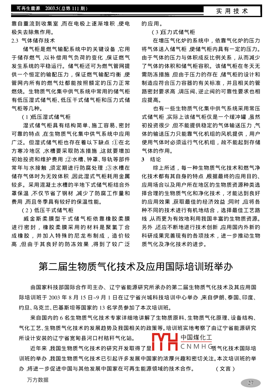 實(shí)用技術(shù)RENEWABLE ENERGY No 5 2003(111 Issue in All)各種生物質(zhì)氣化集中供氣系統(tǒng)的技術(shù)特點(diǎn)唐春福,王瑩,任永志2,崔亨哲2(1遼寧省農(nóng)村能源辦公室,遼寧沈陽(yáng)110001;2.遼寧省能源研究所,遼寧營(yíng)口115000摘要:介紹了生物質(zhì)氣化集中供氣系統(tǒng)中常見的幾種生物質(zhì)氣化、氣體凈化以及存儲(chǔ)技術(shù)的特點(diǎn)同時(shí),針對(duì)各種技術(shù)的特點(diǎn)給出了其應(yīng)用的場(chǎng)合和應(yīng)用條件提出了因地制宜地應(yīng)用不同生物質(zhì)氣化、氣體凈化以及存儲(chǔ)技術(shù)將各種技術(shù)進(jìn)行有機(jī)地結(jié)合并且應(yīng)用國(guó)內(nèi)外新的科研成果不斷完善現(xiàn)有各項(xiàng)技術(shù)的觀點(diǎn)從而達(dá)到更為有效地利用生物質(zhì)資源的目的。關(guān)鍵詞:生物質(zhì);氣化;凈化菠術(shù)特點(diǎn)中圖分類號(hào):S216.2文獻(xiàn)標(biāo)識(shí)碼:B文章編號(hào):1671-529X2003O5-0024-04Characteristics of technologies in various biomassgasification for supplying systemTANG Chun-fu, WAGN Ying, REN Yong-zhi, CUI Heng-zhe1引言一步過濾,所得到的潔凈氣體由羅茨鼓風(fēng)機(jī)送入生物質(zhì)氣化技術(shù)作為一項(xiàng)可再生能源利用儲(chǔ)氣柜,氣體依靠?jī)?chǔ)氣柜的配重所產(chǎn)生的壓力送技術(shù)在世界范圍內(nèi)得到了普遍重視其新技術(shù)新工藝不斷涌現(xiàn)。目前我國(guó)利用生物質(zhì)氣化技術(shù)建設(shè)集中供氣系統(tǒng)以滿足居民炊事和采暖用氣的應(yīng)用形式較多系統(tǒng)中應(yīng)用的生物質(zhì)氣化和燃?xì)鈨艋夹g(shù)以及產(chǎn)出氣體的存儲(chǔ)技術(shù)多種多樣,分析了解各種技術(shù)形式的特點(diǎn)并將各種有圖1系統(tǒng)工藝流程圖效的技術(shù)和工藝相結(jié)合有助于推動(dòng)整個(gè)生物質(zhì)1-螺旋輸送機(jī);2-氣化爐;3-旋風(fēng)除塵器;4-噴淋凈化器;5-氣水分離器;6-過濾器;7-鼓風(fēng)機(jī);8-水封;9氣化領(lǐng)域的技術(shù)進(jìn)步同時(shí)也可以保證正確地選灶具;10-儲(chǔ)氣柜用生物質(zhì)氣化技術(shù)路線,有效地利用生物質(zhì)資供氣管網(wǎng)并最終送到用戶。源從而實(shí)現(xiàn)能源可持續(xù)發(fā)展的目標(biāo)。本文僅對(duì)生物質(zhì)氣化集中供氣系統(tǒng)中所包含的技術(shù)當(dāng)前應(yīng)用較多的幾種技術(shù)的特點(diǎn)進(jìn)行分析主要有氣化技術(shù)、氣體凈化技術(shù)和儲(chǔ)存技術(shù)而2各種生物質(zhì)氣化及其相關(guān)技術(shù)的特點(diǎn)管網(wǎng)設(shè)計(jì)、輔機(jī)選型和燃?xì)鈶?yīng)用等其它技術(shù)一般生物質(zhì)氣化集中供氣系統(tǒng)由氣化、氣體凈為通用技術(shù)目前應(yīng)用的各個(gè)系統(tǒng)基本沒有太多化、氣體存儲(chǔ)、氣體輸送以及氣體最終應(yīng)用等部區(qū)別。分組成較為典型的生物質(zhì)氣化集中供氣系統(tǒng)如2.1氣化技術(shù)圖1所示。生物質(zhì)氣化技術(shù)的主體是生物質(zhì)氣化爐氣生物質(zhì)物料由螺旋輸送杋送λ氣化爐氣化,化爐產(chǎn)岀旳粗燃?xì)庵薪褂偷暮渴怯绊懴到y(tǒng)產(chǎn)岀產(chǎn)出氣經(jīng)過旋風(fēng)除塵器去除飛灰后進(jìn)入噴淋凈氣質(zhì)量乃至系統(tǒng)運(yùn)行效果的關(guān)鍵。若產(chǎn)出氣中焦化器進(jìn)行清洗去除焦油和細(xì)灰再進(jìn)入氣水分油含中國(guó)煤化工化設(shè)備的負(fù)擔(dān)。生物離器去除氣體中攜帶的水滴然后經(jīng)過過濾器進(jìn)質(zhì)氣CNMH〔、運(yùn)行壓力、原料與收稿日期2003-06-04作者簡(jiǎn)介搪春福1951—)男教授研究員級(jí)高級(jí)農(nóng)藝師主要從事農(nóng)村能源管理及技術(shù)推廣工作24可再生能源2003.5(總第1l1.)實(shí)用技術(shù)氣化介質(zhì)接觸方式的不同而變化多樣。目前主要上吸式氣化爐工作在微正壓狀態(tài)下,氣化爐應(yīng)用的有熱解氣化爐、上吸式氣化爐、增壓上吸負(fù)荷量可由進(jìn)風(fēng)量控制。由于氣化爐的進(jìn)料點(diǎn)正式氣化爐、下吸式氣化爐以及流化床氣化爐等幾好是燃?xì)獬隹诘奈恢?因此通常采用間歇加料的種形式。方式防止燃?xì)獾男孤?。上吸式氣化爐爐膛上部做(1泩物質(zhì)熱解氣化爐得較大能儲(chǔ)存一段時(shí)間的用料量運(yùn)行時(shí)將上部熱解氣化(干餾氣化肭的原理是生物質(zhì)在隔密閉爐內(nèi)原料用完后停爐加料。如連續(xù)運(yùn)行則須絕空氣或提供極有限的空氣的條件下加熱后進(jìn)采用較復(fù)雜的進(jìn)料裝置。因此上吸式氣化器一般行裂解反應(yīng)的氣化過程。熱解反應(yīng)是一個(gè)吸熱過適用于木材等堆積密度較大的生物質(zhì)原料,對(duì)原程,但由于生物質(zhì)原料中含較多的氧,當(dāng)溫度升料的尺寸和水分的要求并不苛刻,但也存在原料高到一定程度后氰氧將參加反應(yīng)而使溫度迅速提搭橋后局部燒穿不產(chǎn)氣的現(xiàn)象。高,從而加速完成熱解反應(yīng)減減少外部熱源的輸上吸式氣化爐的優(yōu)點(diǎn):①由于熱解層和干燥入。一般固定床熱解氣化爐產(chǎn)出物的比例為沐木層利用了還原反應(yīng)后氣體的余熱,出口燃?xì)獾臏亟褂?%~10%,木醋液30%~35%,木炭28%~度較低汽氣化爐最下層是氧化層這里有充足的空30%,可燃?xì)怏w25%~30%。熱解氣化爐的突岀優(yōu)氣供燃燒