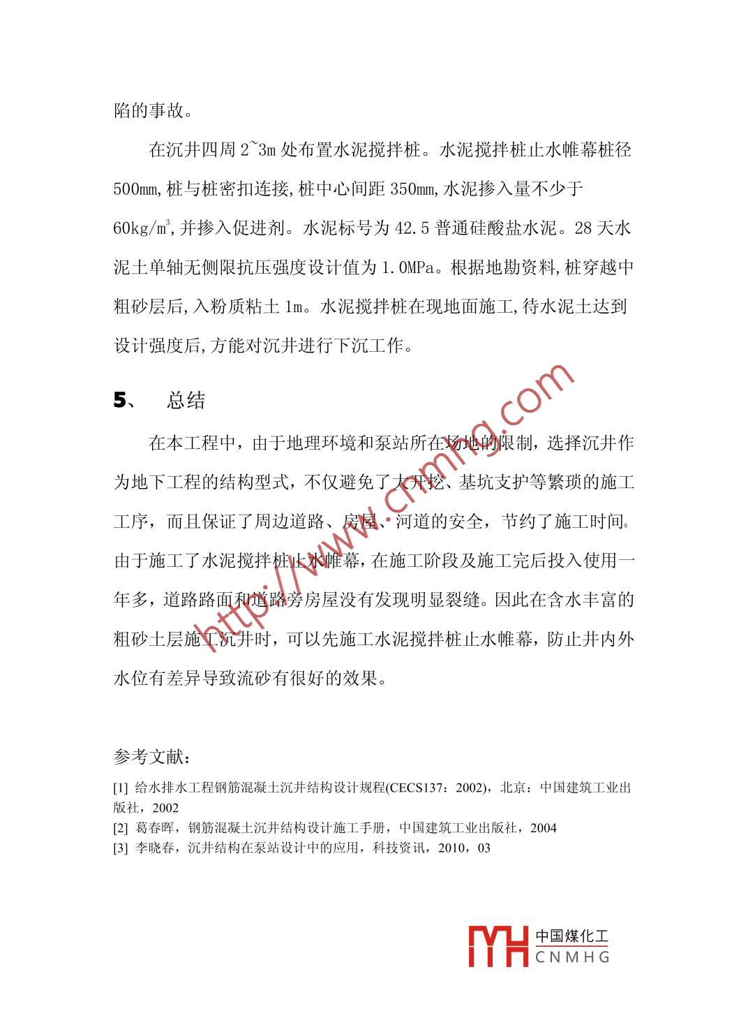 廣東某污水泵站沉井設(shè)計(jì)廣州市市政工程設(shè)計(jì)研究院張吉波510000摘要:隨著我國的社會(huì)經(jīng)濟(jì)發(fā)展,人口的增長,越來越多的污水收集、處理設(shè)施正在興建。由于城市用地的緊缺,某些污水泵站的建造只能采用少占地,對(duì)交通影響小的施工工藝一沉井。 本文對(duì)泵站沉井設(shè)計(jì)作了簡要介紹,在含水豐富的粗砂土層沉井周圍使用了水泥攪拌樁止水,取得了不錯(cuò)的工程效果。關(guān)鍵詞:沉井;泵站;水泥攪拌樁Abstract: Along with our country's social and economic development,population growth, sewage collection, treatment facilities, more and more isbeing built. Because the city land shortage, some sewage pumping station canonly be built using less land, construction technology of small impact on traffic- Open caisson. This paper gives a brief introduction to the pumping stationcaisson design, in the surrounding water rich sand soil using cement mixingpile sinking, and achieved good effect of engineering.Key words: open caisson; pumping station; cement mixing pile中圖分類號(hào): TU992. 25文獻(xiàn)標(biāo)識(shí)碼: A文章編號(hào):沉井是修筑深基礎(chǔ)和地下構(gòu)筑物的一種施工工藝。施工時(shí)先在地面或基坑內(nèi)制作開口的鋼筋混凝土井身,待其達(dá)到規(guī)定強(qiáng)度后,在井身內(nèi)部分層挖土運(yùn)出,隨著挖士和土面的降低,沉井井身藉其自重或在其他措施協(xié)助下克服與土壁間的摩阻力和刃腳反力,不斷下沉,直至設(shè)計(jì)標(biāo)高就位,然后進(jìn)行封底。沉井施工工藝的優(yōu)點(diǎn)是:可在場地狹窄情況~下施工較深(可達(dá)50余米)的地下工程,且對(duì)周圍環(huán)境影響較小;可在地質(zhì)、水文條件復(fù)雜地區(qū)施工;中國煤化工設(shè)HCNMH G備;與大開挖相比,可減少挖、運(yùn)和回填的土方量。其缺點(diǎn)是施工工序較多;技術(shù)要求高、質(zhì)量控制難。在給排水工程中,沉井被廣泛的運(yùn)用在埋深較大的取水泵站和排水泵站中。1、工程概況該工程為污水整治工程配套提升泵站,根據(jù)使用要求,沉井被分為兩大格,因?yàn)榭缍容^大,在中間設(shè)置鋼管對(duì)撐。下沉到位后再進(jìn)行二次混凝土澆注。沉井頂面高出地面0.3m。最高地下水位使用階段位于地面下2.50m,施工階段位于地面下1.00m。沉井制作高度6.05m+2.8m,采用兩次制作,--次下沉。第--節(jié)的制作高度為6.05mo本工程上部結(jié)構(gòu)采用現(xiàn)澆鋼筋混凝土框架結(jié)構(gòu)。2、地質(zhì)情況地質(zhì)條件如表1-1所示,地下水位較高,并且沉井主要位于中粗砂層,施工采用不排水法一次下沉。土層示意圖:4.500.雜填土中粗砂地下水中粗石-3.550中國煤化工-5.550_MHCNMH G表1 (根據(jù)地勘資料)土層標(biāo)高(相對(duì)標(biāo)高)土層,土層厚度0. 00^ ~-1.50雜填土1. 50m .-1.50^ -11.80中粗砂10.30m-11.80^ -16.90粉質(zhì)粘土5. 10m表2單位摩阻承載力綜重度粘聚力內(nèi)摩擦角力合建議值8CφfyRkN/m3kPa1710018-202402(2724252503、 計(jì)算過程__Cc76503350沉井計(jì)算簡圖如上圖所示,沉井施工順序?yàn)?先開挖基坑至4.5m (絕對(duì)標(biāo)高)處,再開始制作沉井,沉井分兩次制作,制作完畢再一.次下沉至設(shè)計(jì)-5.55m絕對(duì)標(biāo)高處。(1)使用階段抗浮驗(yàn)算沉井自重: Gk=14573kN①施工階段地下水位取1m(絕對(duì)高程),.中國煤化工HCNMH GFew.=9120kN,沉井抗浮系數(shù): kw=Gx/F.k=14573/9120=1. 6>1.0②使用階段地下水位取3.5m(絕對(duì)高程),水浮托力標(biāo)準(zhǔn)值:Frw.k=12601kN,沉井抗浮系數(shù): k,w=Gn/Fr.=14573/12601=1. 16>1.0(2) 下沉驗(yàn)算①多層土的加權(quán)平均單位摩阻力標(biāo)準(zhǔn)值:沉井從中砂層開始下沉: fa=20kPa②沉井外壁為階梯式,根據(jù)沉井規(guī)程,取臺(tái)階以上摩阻力為0. 5f,井壁摩阻力標(biāo)準(zhǔn)值為: Fn=6338kN③下沉過程中水對(duì)沉井的浮力標(biāo)準(zhǔn)值:施工中,內(nèi)外水差為0,F(xiàn)w.z=3633kN④沉井下沉系數(shù)計(jì)算k。=:Gre-Fme =0.96<1.05,不滿足要求。考慮加載650kN,此時(shí)下沉系數(shù)為k。=Gk-Fwiw*k=1.06>1.05, 滿足要求。F(3)下沉前井壁豎向彎曲計(jì)算(采用每邊2個(gè)支點(diǎn))支座彎矩: M支=274kN.m;跨中彎矩: M =1220kN*mLo=10. 75/8. 85<2,按照深梁進(jìn)行設(shè)計(jì),構(gòu)造配筋即可。(4)刃腳計(jì)算沉井在施工中,刃腳受水壓力、土壓力、自重、側(cè)摩阻力、刃腳下土反力等外力作用,可能產(chǎn)生向內(nèi)或向外撓曲彎矩。一般情況下,當(dāng)沉井剛下沉?xí)r,刃腳向外撓曲彎矩為最大,而當(dāng)沉井沉至設(shè)計(jì)標(biāo)高時(shí),刃腳可能產(chǎn)生最大向內(nèi)撓曲彎矩。沿井周邊取1m寬計(jì)算,刃腳產(chǎn)生最大向內(nèi)撓曲彎矩為28. 7kN. m。根據(jù)現(xiàn)行中國煤化工現(xiàn)范YHCNM HG(GB50010- 2010)》進(jìn)行配筋計(jì)算,選用φ 25@200 (As =2534mm2)。(5)井壁計(jì)算當(dāng)沉井下沉至設(shè)計(jì)標(biāo)高,且刃腳下土已掏空時(shí),作用于井壁上的水平內(nèi)力為最大,按照前述刃腳向內(nèi)撓曲計(jì)算方式計(jì)算井壁上水、土壓力,將沉井井壁視為水平框架,計(jì)算井壁各分段的內(nèi)力及水平鋼筋。以刃腳頂面以上1. 5t=1. 5*600=900的井壁進(jìn)行內(nèi)力計(jì)算。井壁所受荷載為:P’=PA’=55. 2kN,刃腳所受的水平荷載:P=49.3kN。因a f>1.0,水平框架的水平荷載不作修正。井壁所受的總荷載為P1=P1