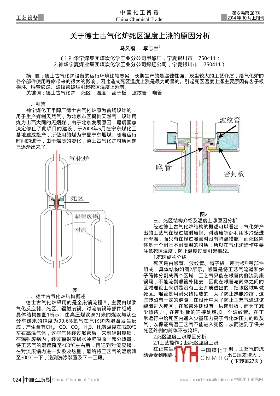 中國化工貿(mào)易第6卷第28期工藝設(shè)備China Chemical Trade2014年10月上旬刊關(guān)于德士古氣化爐死區(qū)溫度上漲的原因分析馬風(fēng)?!钪咎m2( 1.神華寧煤集團(tuán)煤炭化學(xué)工業(yè)分公司甲醇廠,寧夏銀川市750411 ;2.神華寧夏煤業(yè)集團(tuán)煤炭化學(xué)工業(yè)分公司烯烴公司,寧夏銀川市750411 )摘要:德士古氣化爐設(shè)備的運(yùn)行環(huán)境比較惡劣,長期生產(chǎn)的是腐蝕性強(qiáng)、灰塵較大的工藝介質(zhì),給氣化爐的各個部件使用壽命帶來的很大的影響,因此造成死區(qū)溫度上漲是最為明顯的。引起死區(qū)溫度上漲主要原因有齒子板損壞、喉管破爛、波紋管破爛引起死區(qū)溫度上漲等。關(guān)鍵詞:德士古氣化爐死區(qū)溫度齒子板 波紋管喉管一、引言神寧煤化工甲醇廠德士古氣化爐原為首鋼設(shè)計(jì)的用于生產(chǎn)媒制天然氣,為北京市區(qū)提供天然氣,設(shè)計(jì)用煤為山西大同的無煙煤,由于北京發(fā)展原因,最后國家波紋管決定停止了此項(xiàng)目的建設(shè),于2008年5月在寧東煤化工基地建成投產(chǎn),所使用的煤為寧夏寧東煙煤。隨著運(yùn)行時(shí)間的進(jìn)行,由于煤質(zhì)的變化,德士古氣化爐材質(zhì)問題已逐漸出來了。氣化爐喉管密封板死區(qū)圖2輻射廢鍋)三、死區(qū)結(jié)構(gòu)介紹及溫度上漲原因分析經(jīng)過德土古氣化爐結(jié)構(gòu)的概述可以看出,氣化爐產(chǎn)對流出的工藝氣在經(jīng)過輻射廢鍋、對流廢鍋都利用水冷壁進(jìn)行降溫,而只有在經(jīng)過喉管時(shí)沒有降溫措施。而死區(qū)筒體是一個耐壓不耐高溫的材質(zhì),所以在氣化爐造作中要注意死區(qū)溫度,防止溫度過高引起事故。1.死區(qū)結(jié)構(gòu)介紹死區(qū)是由喉管、波紋管、齒子板、密封板["等部件組成,具體結(jié)構(gòu)如圖2所示。喉管是將工藝氣流道和爐子筒體分割成兩個區(qū)域,工藝氣只能在喉管內(nèi)側(cè)流到廢鍋段,不能流到喉管外側(cè)去,因此在喉管與筒體之間的區(qū)域理論上來講是沒有工藝介質(zhì)進(jìn)出的,把該區(qū)域叫做圖1死區(qū)。喉管是用耐火磚砌成的,為了防止熱脹冷縮,這二、德士古氣化爐結(jié)構(gòu)概述德士古氣化爐采用的是全廢鍋流程[1] ,主要由煤漿些磚留有一定的縫隙 ,在設(shè)計(jì)中為了防止工藝氣通過該氣化反應(yīng)器、死區(qū)、輻射廢鍋、對流廢鍋等部件組成,縫隙進(jìn)入死區(qū),在喉管外側(cè)設(shè)有一層密封板,而為了減具體結(jié)構(gòu)如圖1所示。由高壓煤漿泵打來的煤漿與從空少熱應(yīng)力,在密封板的連接處增加一個波紋管。在正分車送來的純度為99.6%氧氣在氣化爐內(nèi)混合發(fā)生反常運(yùn)行中給死區(qū)內(nèi)通入少量壓力高于氣化爐壓力的吹灰應(yīng),產(chǎn)生含有CH。、CO、 CO,H,S、 H,等溫度在1200°C氣,以保證高溫工藝氣不能進(jìn)入死區(qū),從而達(dá)到了保護(hù)左右高溫氣體,這些氣體經(jīng)過喉管后,來到輻射廢鍋,死區(qū)外側(cè)的筒體不被燒壞。在輻射廢鍋內(nèi),經(jīng)過輻射廢鍋水冷壁吸收-部分熱量2.死區(qū)溫度上漲原因分析將工藝氣的溫度降至400°C左右后,再送到對流廢鍋,2.1工藝操作引起死區(qū)溫度.上漲在對流廢鍋內(nèi)進(jìn)-步吸收熱量,最終將工藝氣的溫度降動會受到阻礙在正常生中國煤化工時(shí),工藝氣的流至300°C一下,送到洗滌裝置及下一工段。YHCN M H 2出口壓差增大、(下轉(zhuǎn)第27頁)024 |中國化工貿(mào)易| C hina Chemical Tradewww.chinachemicatrade.com第6卷第28期中國化工貿(mào)易2014年10月上旬刊China Chemical Trade工藝設(shè)備作;此外還應(yīng)成立搶險(xiǎn)救護(hù)組,配備足夠的搶險(xiǎn)設(shè)備和作為試壓介質(zhì)時(shí),處理問題前應(yīng)將壓力降到0.02Mpa時(shí)材料。才可以作業(yè)。2.用水作為試壓介質(zhì)時(shí),用來試壓的設(shè)備和工具距五、結(jié)語離管線的距離不應(yīng)小于30米;用氣作為試壓介質(zhì)時(shí),設(shè)長輸管線的試壓是油建工作的重要組成部分,在試備和工具距離管線的距離不應(yīng)小于50米。壓過程中應(yīng)注意的問題很多,由于篇幅所限,本文僅從3.用水作為試壓介質(zhì)時(shí),當(dāng)試壓壓力低于4Mpa時(shí),幾個方面進(jìn)行 了簡單分析,希望能為相關(guān)的工作人員提應(yīng)將管線兩側(cè)30米的范圍劃為警戒區(qū),試壓壓力大于供一些有益的參考。4Mpa時(shí)應(yīng)將管線兩側(cè)50米的范圍劃為警戒區(qū);當(dāng)采用氣體作為介質(zhì)時(shí),試壓壓力小于4Mpa時(shí)應(yīng)將管線兩側(cè)50米參考文獻(xiàn):的范圍劃為警戒區(qū),試壓壓力大于4Mpa時(shí)應(yīng)將管線兩側(cè)[]王強(qiáng) ,劉高生.淺談長輸管線清管、測徑、試壓應(yīng)注意80米的范圍劃為警戒區(qū)。在警戒區(qū)內(nèi)應(yīng)設(shè)置專人負(fù)責(zé)警事項(xiàng)]:價(jià)值工程 , 2012 ( 11)戒[2]王同浩.天然氣長輸管線泄漏檢測與定位系統(tǒng)的實(shí)施0].4.在試壓過程中應(yīng)對出現(xiàn)的問題及時(shí)處理。用氣體北京化工大學(xué) , 2006 ( 06)(上接第24頁)密封板損壞情況這樣--部分高溫工藝氣會逼迫竄入死區(qū)內(nèi),從而引起死區(qū)溫度上漲。由于泄漏、吹灰壓縮機(jī)故障、吹灰閥門故障、吹灰管線堵塞等原因,通入死區(qū)內(nèi)的吹