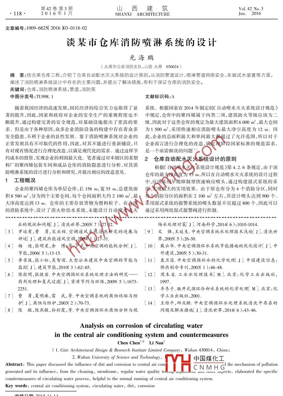 第42卷第3期山西Vol. 42 No. 32016年1月SHANXI ARCHITECTUREJan. .2016文章編號(hào):1009-6825( 2016 )03-01 16-03中央空調(diào)循環(huán)水系統(tǒng)腐蝕分析與對(duì)策陳晨!2李南'( 1.中信建筑設(shè)計(jì)研究總院有限公司,湖北武漢430014; 2.武漢理工大學(xué),湖北武漢430014 )摘要:論述了污垢及腐蝕對(duì)中央空調(diào)系統(tǒng)的影響,并介紹了管道污染生成的機(jī)理及其產(chǎn)生的影響,從清洗、預(yù)膜、定期水質(zhì)檢測(cè)調(diào)整等方面,闡述了循環(huán)水處理的具體對(duì)策,有利于中央空調(diào)系統(tǒng)的正常運(yùn)行。關(guān)鍵詞:中央空調(diào)系統(tǒng),循環(huán)水,污垢,腐蝕中圖分類號(hào):TB657.2文獻(xiàn)標(biāo)識(shí)碼:A中央空調(diào)系統(tǒng)具有投資成本低、安全可靠容易管理控制、節(jié)響管道內(nèi)水的流動(dòng),當(dāng)高濃度的難溶或微溶鹽補(bǔ)入時(shí),就更容易約能耗等優(yōu)點(diǎn),因此被廣泛的應(yīng)用在各種高樓大廈中。中央空調(diào)發(fā)生結(jié)垢現(xiàn)象 ,尤其是在管道中流速緩慢的位置。而且在中央空系統(tǒng)主要由冷卻水系統(tǒng)和冷(熱)媒水系統(tǒng)兩部分組成,在這兩大調(diào)的冷卻水系統(tǒng)中,水中難溶鹽或微溶鹽的含量會(huì)隨著其濃縮倍循環(huán)水系統(tǒng)的長(zhǎng)時(shí)間運(yùn)行下,中央空調(diào)系統(tǒng)的各種管道會(huì)受到不數(shù)的升高而提高,水溫和其與管壁的溫差變化則是引起水的濃縮同程度的污染,其中結(jié)垢和腐蝕是最常見(jiàn)的現(xiàn)象。它們會(huì)使中央蒸發(fā)的 主要原因。循環(huán)水系統(tǒng)中含有很多不穩(wěn)定的鹽類在傳熱空調(diào)系統(tǒng)的工作效率急速下降,同時(shí)伴隨著超額的能量消耗,而過(guò)程中容易分解,比如碳酸氫鹽的分解反應(yīng)如下[41:且結(jié)垢和腐蝕會(huì)導(dǎo)致中央空調(diào)系統(tǒng)的不正常運(yùn)行,減少受損設(shè)備Ca( HCO3 )2→CaCO3↓+CO2 ↑+H20的使用期限”。本文主要是針對(duì)這些問(wèn)題,對(duì)結(jié)垢和腐蝕現(xiàn)象從此反應(yīng)中的沉淀物CaCO,會(huì)沉積在管道內(nèi)壁或換熱器的傳機(jī)理層面進(jìn)行解釋,然后根據(jù)機(jī)理分析提出應(yīng)對(duì)措施。熱面上,產(chǎn)生的氣體CO2則會(huì)在中央空調(diào)循環(huán)的敞開(kāi)的部分從水1污垢及腐蝕對(duì)中央空調(diào)系統(tǒng)的影響中逸出,進(jìn)而導(dǎo)致水的pH值升高,形成堿性環(huán)境,發(fā)生以下反應(yīng):1.1設(shè)備使用期限減少,維修經(jīng)費(fèi)增加Ca( HCO3 )2 +20H-→CaCO,↓+2H20 +C0號(hào)-中央空調(diào)循環(huán)水系統(tǒng)及其設(shè)備都有-定的使用壽命,容易受Ca2+ +C03-→CaCO3↓到一些因素的影響,尤其是結(jié)垢和腐蝕。當(dāng)中央空調(diào)循環(huán)水系統(tǒng)產(chǎn)生的這些水垢有著較低的導(dǎo)熱性能,這對(duì)中央空調(diào)系統(tǒng)中發(fā)生輕微的結(jié)垢時(shí).會(huì)造成管路堵塞,增加維修費(fèi)用;當(dāng)中央空調(diào)的換熱器的傳熱效率及各種設(shè)備的穩(wěn)定運(yùn)行產(chǎn)生嚴(yán)重的影響,首循環(huán)水系統(tǒng)結(jié)垢已久甚至發(fā)生腐蝕現(xiàn)象時(shí),則會(huì)造成管道滲漏、先會(huì)使能量消耗明顯增加,如果結(jié)垢處數(shù)量繁多且垢點(diǎn)較厚,則泄露以及設(shè)備穿孔等現(xiàn)象,使系統(tǒng)運(yùn)行癱瘓.需更換管道設(shè)備,使會(huì)造 成管路堵塞,使中央空調(diào)系統(tǒng)的流量減小,管路運(yùn)行壓力不人力物力大大增加。正常,以至于最后導(dǎo)致系統(tǒng)癱瘓,無(wú)法運(yùn)行。1.2運(yùn)行效率降低,能量消耗增加2.2 腐蝕運(yùn)行效率是表征中央空調(diào)系統(tǒng)主要性能指標(biāo)之一-,而運(yùn)行效由于中央空調(diào)循環(huán)系統(tǒng)中的各管道及設(shè)備的構(gòu)成材質(zhì)主要率的高低主要體現(xiàn)在導(dǎo)熱的快慢21。物體的導(dǎo)熱量受到很多因是碳鋼、銅等,所以腐蝕現(xiàn)象尤其是電化學(xué)腐蝕是不可避免的。素的影響,有環(huán)境溫差、導(dǎo)熱厚度、導(dǎo)熱系數(shù)等。不同的物體有不這些 金屬材質(zhì)表面凹凸不平,容易形成電池。當(dāng)碳鋼與含有溶解同的導(dǎo)熱系數(shù),中央空調(diào)的循環(huán)水系統(tǒng)中的管道材質(zhì)主要有碳鋼氧的循環(huán)水接觸后,一-些微小的腐蝕電池就會(huì)在碳鋼表面形和紫銅兩種,其導(dǎo)熱系數(shù)分別為48 w/(m.K),380 w(m.K),成5],主要發(fā)生氧化- 還原反應(yīng),如下:引起管道結(jié)垢的碳酸鹽垢和油脂層的導(dǎo)熱系數(shù)則較小,分別為陽(yáng)極反應(yīng):Fe- +Fe2+ +2e;陰極反應(yīng):O2 +2H2O +4e-→+40H- ;0.58 w/(m.K),0. 117 w/( m . K),僅占碳鋼導(dǎo)熱系數(shù)的在循環(huán)水中:Fe2+ +20H-→Fe( 0H)2。1.21%和0.24%、紫銅導(dǎo)熱系數(shù)的0. 15%和0.03% ,從而導(dǎo)熱效若是水中溶解氧含量多,白色沉淀物Fe( 0H)2中的Fe?+極率下降。導(dǎo)熱量的大小還與壁厚成反比,故隨著結(jié)垢厚度的增易被氧化為 Fe'+ ,故而生成紅棕色的鐵銹,即FeO,的水合物。加熱交換效率下降,若要維持熱交換量,則需要增加耗電量,造沉淀物的生 成會(huì)加速陽(yáng)極反應(yīng)的進(jìn)行,使Fe不斷的溶解為Fe+成能源的消耗。使Fe腐蝕,同時(shí)水中的溶解氧會(huì)富集在陰極表面,影