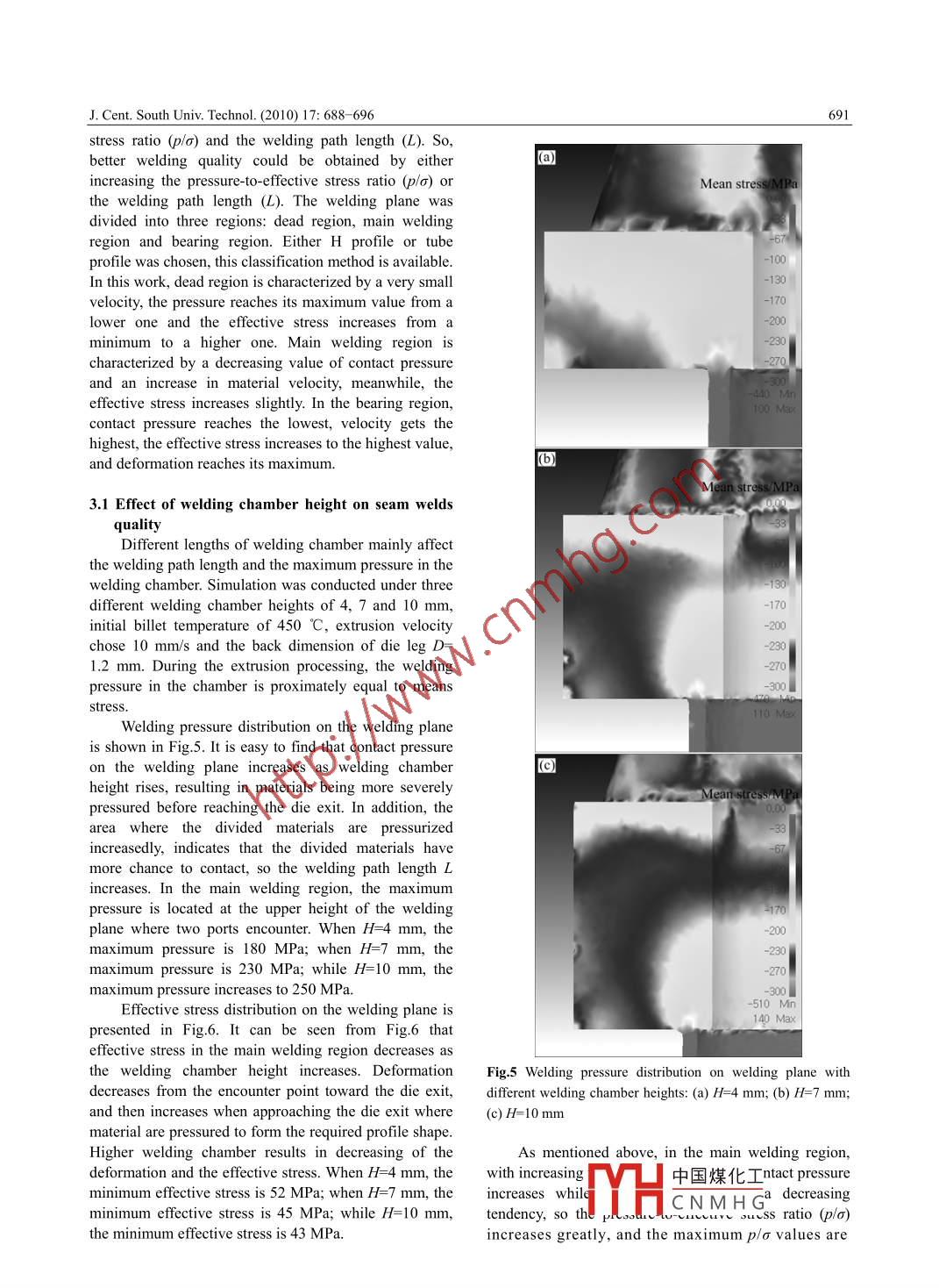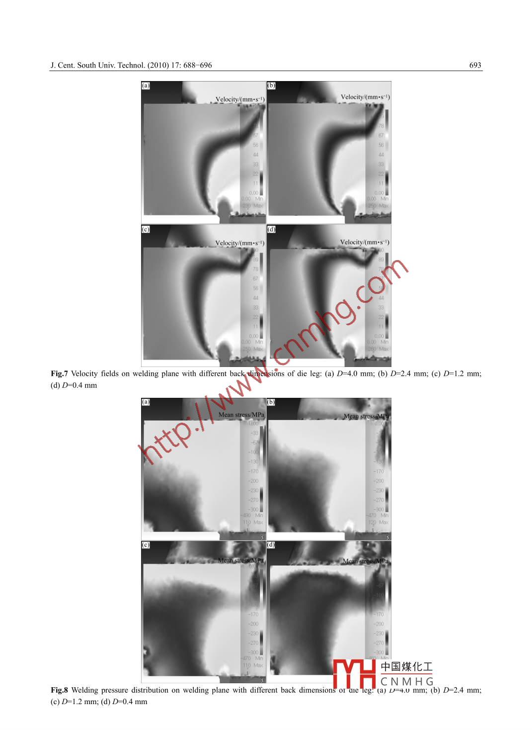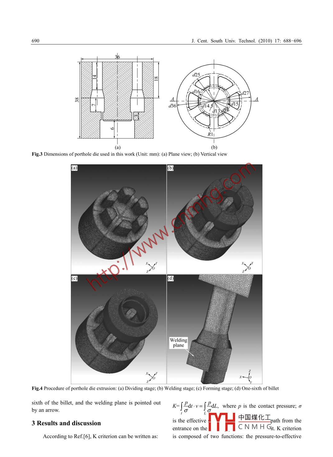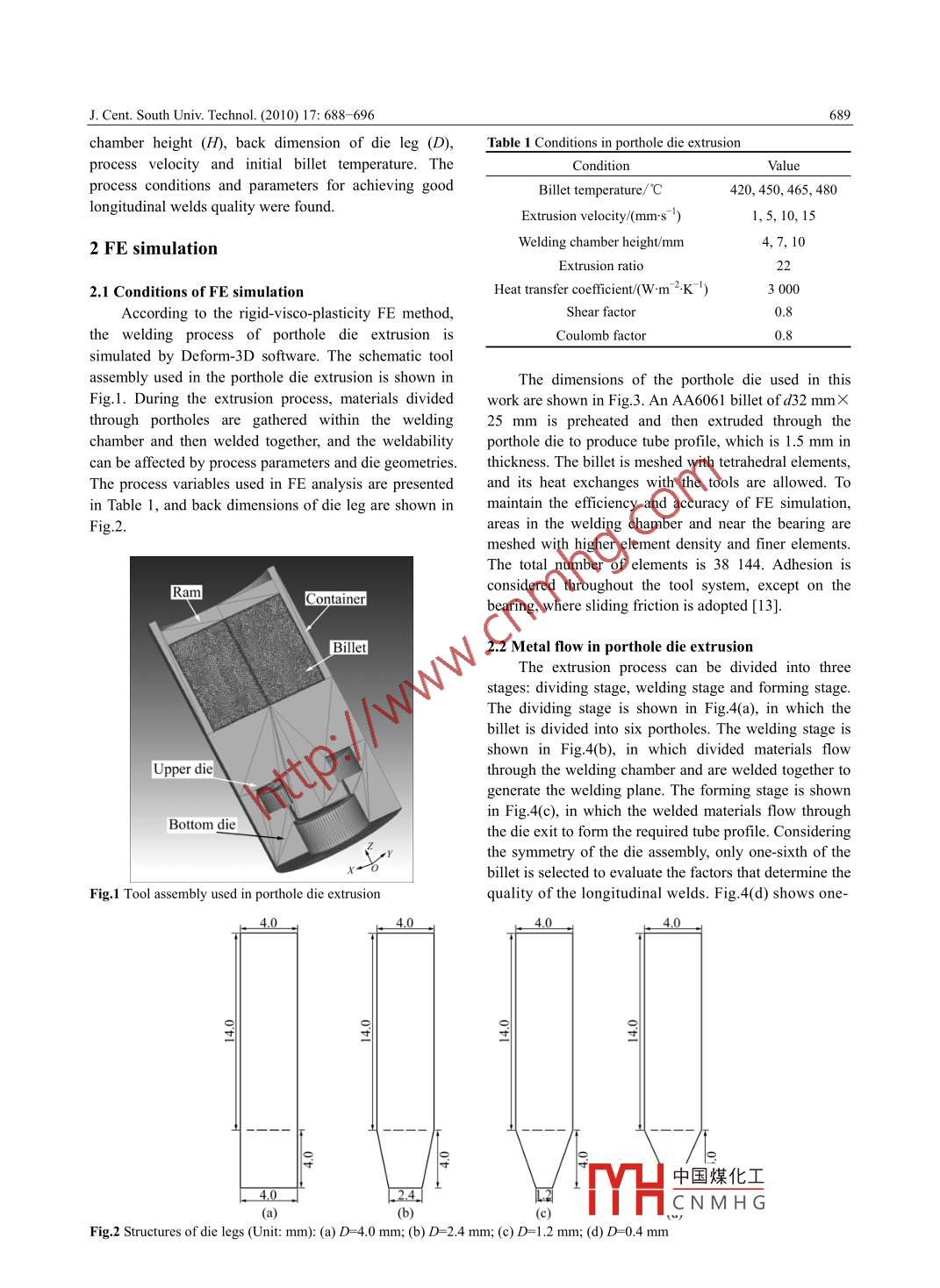 J. Cent. South Univ. Technol. (2010) 17: 688- 696包SpringerDOI: 10. 1007/11771-010-0541-1Effects of process parameters and die geometry on longitudinal welds quality inaluminum porthole die extrusion processLIU Jian(劉健), LIN Gao-yong(林高用), FENG Di(馮迪), Z0U Yan-ming(鄒艷明), SUN Li-ping(孫利平)School of Materials Science and Engineering, Central South University, Changsha 410083, ChinaC Central South University Press and Springer-Verlag Berlin Heidelberg 2010Abstract: By using the rigid-visco-plasticity finite element method, the welding process of aluminum porthole die extrusion to forma tube was simulated based on Deform-3D software. The welding chamber height (H), back dimension of die leg (D), processvelocity and initial billet temperature were used in FE simulations so as to determine the conditions in which better longitudinalwelding quality can be obtained. According to K criterion, the local welding parameters such as welding pressure, effective stress andwelding path length on the welding plane are linked to longitudinal welds quality. Simulation turns out that pressure-to-effectivestress ratio (p!o) and welding path length (L) are the key factors affecting the welding quality. Higher welding chamber best andsharper die leg give better welding quality. When H=10 mm and D=0.4 mm, the longitudinal welds have the best quality. Higherprocess velocity decreases welds quality. The proper velocity is 10 mm/s for this simulation. In a certain range, higher temperature isbeneficial to the longitudinal welds. It is found that both 450 and 465 °C can satisfy the requirements of the longitudinal welds.Key words: aluminum alloy; longitudinal welds; porthole die; die geometry; extrusion process; K criterionafter introducing the time factor. This criterion greatly1 Introductionemphasizes the dead zone in the welding chamber. Basedon this observation, DONATI and TOMESANI [6]In recent years, aluminum alloy hollow profiles areintroduced speed as a correction factor and proposed theincreasingly used in manufacturing processes, mainly forK criterion (pressure -time -flow criterion). By applyinglightweight components in the vehicles for ground, seathese criteria to experiments performed by VALBERGand air transportation. The hollow profile producedet al [7-8] and FE simulation [6], it was found that Kthrough porthole die contains a number of seam weldscriterion can discriminate the welding quality efficiently.along its length, which are called the longitudinal welds.Meanwhile, FANG et al [9] demonstrated that 3D FEMIt is a common view that cracking happens preferentiallysimulation is a viable predictive tool in both dienear the welding lines of the extruded profiles [1]. Thedesigning and process optimization for any extrudedfailure of hollow extruded products mostly occurs alongshapes. LIU et al [10] simulated the longitudinal weldsthe weld lines when the products are subject to severeformation process during porthole die extrusion andinternal pressure or expansion in the practical use [2]. So,evaluated the factors determining the quality of the weldthe welds often represent the weakest points of theseams. LI et al [11] suggested that the ratio of theprofile's section. Therefore, it is of particular importancemaximum normal pressure in the welding chamber to theto increase the welding quality of longitudinal welds.flow stress of the billet material on the welding planeSo far, few studies have been done on longitudinaldetermined the weld quality. DONATI and TOMESANIwelds. Earlier researches about longitudinal welds12] defined the workability area under differentformation process were performed by AKERET [3- 4],processing conditions and used tensile strength andwho considered once the maximum pressure inside theequivalent fracture strain to assess the effectiveness ofwelding chamber exceeds a critical limit, which dependslongitudinal welds.on the physical state of the material at that point, thewelding could be assessed as available. In FE analysis,parameters and die geometries on longitudinal weldsthe criterion can be normalized by rating pressure toquality were analyzed by means of thermo-mechanicaleffective stress at a specific point. PLATA and PIWNIKFE simulation and according to K criterion. The process[5] proposed the Q criterion (pressure- time criterion)parameters an中國煤化工the weldingFoundation item: Project(2007BAE38BO4) supported by the National Science and Technology PillMYHCNMHGReceived date: 2009- 11-25; Accepted date: 2010-03- 12Corresponding author: LIN Gao-yong, PhD, Professor; Tel: +86- -731- 88879341; Fax: +86- 731-88876692; E-mail: mater218@ 163.comJ. Cent. South Univ. Technol. (2010) 17: 688- -696_689chamber height (H), back dimension of die leg (D),Table 1 Conditions in porthole die extrusionprocess velocity and initial billet temperature. TheCondition_Valueprocess conditions and parameters for achieving goodBillet temperature/C420, 450, 465, 480 .longitudinal welds quality were found.Extrusion velocity/(mms ")1,5, 10, 152 FE simulationWelding chamber height/mm4, 7, 10Extrusion ratio222.1 Conditions of FE simulationHeat transfer cofficient/(W-m-2.K)3 000According to the rigid-visco-plasticity FE method,Shear factor0.8the welding process of porthole die extrusion isCoulomb factorsimulated by Deform-3D software. The schematic tooassembly used in the porthole die extrusion is shown inhe dimensions of the porthole die used in thisFig.1. During the extrusion process, materials dividedwork are shown in Fig.3. An AA6061 billet of d32 mmXthrough portholes are gathered within the welding25 mm is preheated and then extruded through thchamber and then welded together, and the weldabilityporthole die to produce tube profile, which is 1.5 mm incan be affected by process parameters and die geometries.thickness. The billet is meshed with tetrahedral elements, .The process variables used in FE analysis are presentedand its heat exchanges with the tools are allowed. Tci