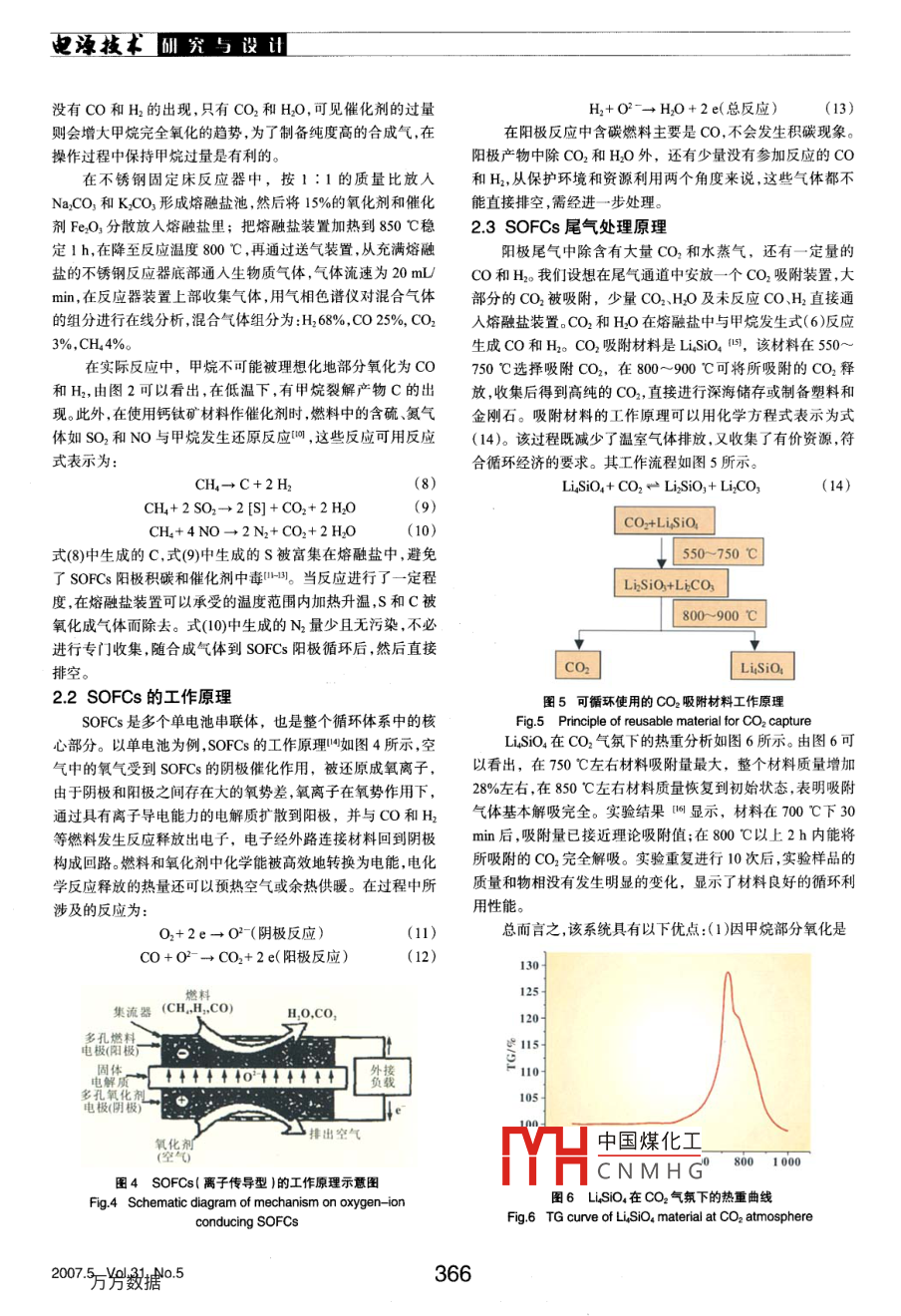 生物質(zhì)氣在 SOFCS中的循環(huán)系統(tǒng)設計及原理劉榮輝口,馬文會口,王華,魏永剛',于潔1,戴永年(1.昆明理工大學材料與冶金工程學院,云南昆明650093;2.昆明理工大學真空冶金國家工程實驗室,云南昆明650093)摘要:設計了一種生物質(zhì)氣在固體氧化物燃料電池堆( SOFCS)中的循環(huán)流程。在本技術(shù)中生物質(zhì)氣的主要成分甲烷首先被熔融鹽中的晶格氧部分氧化為H2和CO生物質(zhì)氣中的雜質(zhì)S和重金屬被熔融鹽吸收;CO和H2在 SOFCS陽極室被電化學氧化為CO2和HO,反應釋放的大部分能量轉(zhuǎn)化為電能;大部分cO2在特定溫度下,經(jīng)可再生材料LisO4吸收、解吸被提純回收。少量CO2和Ho被循環(huán)到熔融鹽池與甲烷發(fā)生重整反應,反應所需要的熱量由甲烷部分氯化釋放的熱量提供。本系統(tǒng)中 SOFCS抗積碳及對含S和N燃料的容忍性比較好;整個系統(tǒng)能量利用率高,可以實現(xiàn)CO2的零排放。關(guān)鍵詞:熔融鹽部分氧化甲烷;固體氧化物燃料電池;循環(huán)系統(tǒng);二氧化碳零排放中圖分類號:TM91145文獻標識碼:A文章編號:1002-087X(2007)050364-Design and principle of cyclic system for biogas in solid oxide fuel cellsLIU Rong-hui, MA Wen-hui 2, WANG Hua, WEI Yong-gang, YU Jie,DaAl Yong-nian(1. Faculty of Materials and metallurgical Engineering, Kunming University of Science and Technology, Kunming Yunnan 650093, China;2. National Engineering Laboratory of vacuum Metallurgy, Kunming University of Science and Technology, Kunming Yunnan 650093, ChinaAbstract: a cyclic system for biogas in solid fuel cells(SOFCs)was designed. The main composition methane inbiogas was partially oxidized to be Co and H2 syngas by lattice oxygen in molten salt, the impurities sulfur andheavy metals in biogas were absorbed into molten salt and which prevented the anodic catalyst to be poisonedThere was no other but CO and H2o products in the electrochemical oxidation reactions of Co and H2 in the anodechamber of SOFCs. Pure CO, was obtained after which was captured by reusable material Li Sio, and desorbed atsome special temperatures. A small amount of Co2 and H2o was fed again into molten salt and reacted withmethane, the thermal energy for this reforming reaction was supplied by the partial oxidation of methane. Compareto the reforming of methane in SOFCs, this technique has many advantages such as no carbon deposition, bettertolerance to S and N, higher energy-utilization rate and zero emission of greenhouse gasKey words: partial oxidation of methane in molten salt; solid oxide fuel cell; cyclic system; zero emission of COz我國幅員遼闊,特別是廣大農(nóng)村地區(qū)有著豐富的生物質(zhì)在陽極形成積碳現(xiàn)象致使電池性能迅速衰減;此外,水蒸氣資源。這些生物質(zhì)氣制備方便,價格便宜,是固體氧化物燃氣內(nèi)部重整反應的強吸熱效應仍會導致陽極內(nèi)部溫差較大料電池(SOFC)潛在的燃料。固體氧化物燃料電池使用生物增加了操作過程中溫度控制難度;二是生物質(zhì)氣中的S和重質(zhì)氣為燃料時存在兩個問題。一是由于生物質(zhì)氣的主要成分金屬等雜質(zhì)會導致 SOFCs陽極催化劑中毒和大氣污染。我們甲烷性能穩(wěn)定,其電化學活性明顯不如H2,所以一般需要先在總結(jié)了前人研究工作的基礎(chǔ)上,提出了利用熔融鹽中的品用水蒸氣將甲烷重整制備CO和H2等氣體。在使用外部格氧部分氧化甲烷制CO和H2合成氣的新工藝,這種工藝重整時,由于重整反應是一個強吸熱反應,而且所需熱量不應用于 SOFCS中,可望克服甲烷水蒸氣重整工藝中存在的多能由燃料的電化學反應熱直接供給,需要額外的加熱裝置和個問題,而且S和重金屬等被熔融鹽吸收,避免了 SOFCS陽能量消耗,增加了工藝的復雜性和生產(chǎn)成本,在目前所開發(fā)極催化劑的中毒和大氣污染。此外,甲烷燃料最終反應產(chǎn)物的SOFC發(fā)電系統(tǒng)中,這種甲烷重整方式被逐漸淘汰口。在使是CO2和HO,為了減少溫室效應,CO2不能直接排空,而且用內(nèi)部重整方式時,由于催化劑缺陷操作條件不當,很容易純的CO2還可以用來制備塑料、金剛石等,因此作者還針對收稿日期:2006-11-01SOFCs的工作特點,提出了一種CO2收集、提純和零排放新基金項目:國家自然科學基金項目(50204007,50574046);云南思路中國煤化工省中膏年學術(shù)技術(shù)帶頭人后備人才項目(2005PY01-33)CNMH物燃料電池堆作者簡介:劉榮輝(1981-),男,河南省人,博士研究生,主要研究方向為中溫固體氧化物燃料電池。中的循環(huán)系統(tǒng)思路Biography: LIU Rong-hui(1981-), male, candidate for Ph D生物質(zhì)氣在 SOFCs中的循環(huán)系統(tǒng)思路如圖1所示。在循2005萬數(shù)據(jù)05364仙究勹設山也淖技本環(huán)流化床或固定床反應器中,放入一定量的熔融鹽(如示為:Na2CO3和KCO3),高價態(tài)的變價金屬氧化物或鈣鈦礦O+CH4→CO+H2(ABO3)型催化材料分散在熔融鹽里或負載在蜂窩狀載體上放置在熔融鹽里,生物質(zhì)氣被送入熔池中,其主要成分甲烷與在反應過程中還有甲烷完全氧化(燃燒)和甲烷的重整晶格氧發(fā)生反應生成CO和H2,然后輸送到 SOFCS的陽極反應窒;在甲烷與熔融鹽作用后,空氣被鼓入熔池中以補充甲烷部MOO)+CH4→M+CO2+2HO分氧化時消耗的晶格氧;空氣在 SOFCs的陰極室被還原成3CH+CO2+2HO→4CO+8H2O2-,O3在氧勢的作用下,通過電解質(zhì)擴散到 SOFCs的陽極把式(1),(2),(5)和(6)相加或(3),(4),(5)和室,然后與CO和H2發(fā)生反應。陽極反應主要產(chǎn)物CO2經(jīng)過(6)相加整個反應過程方