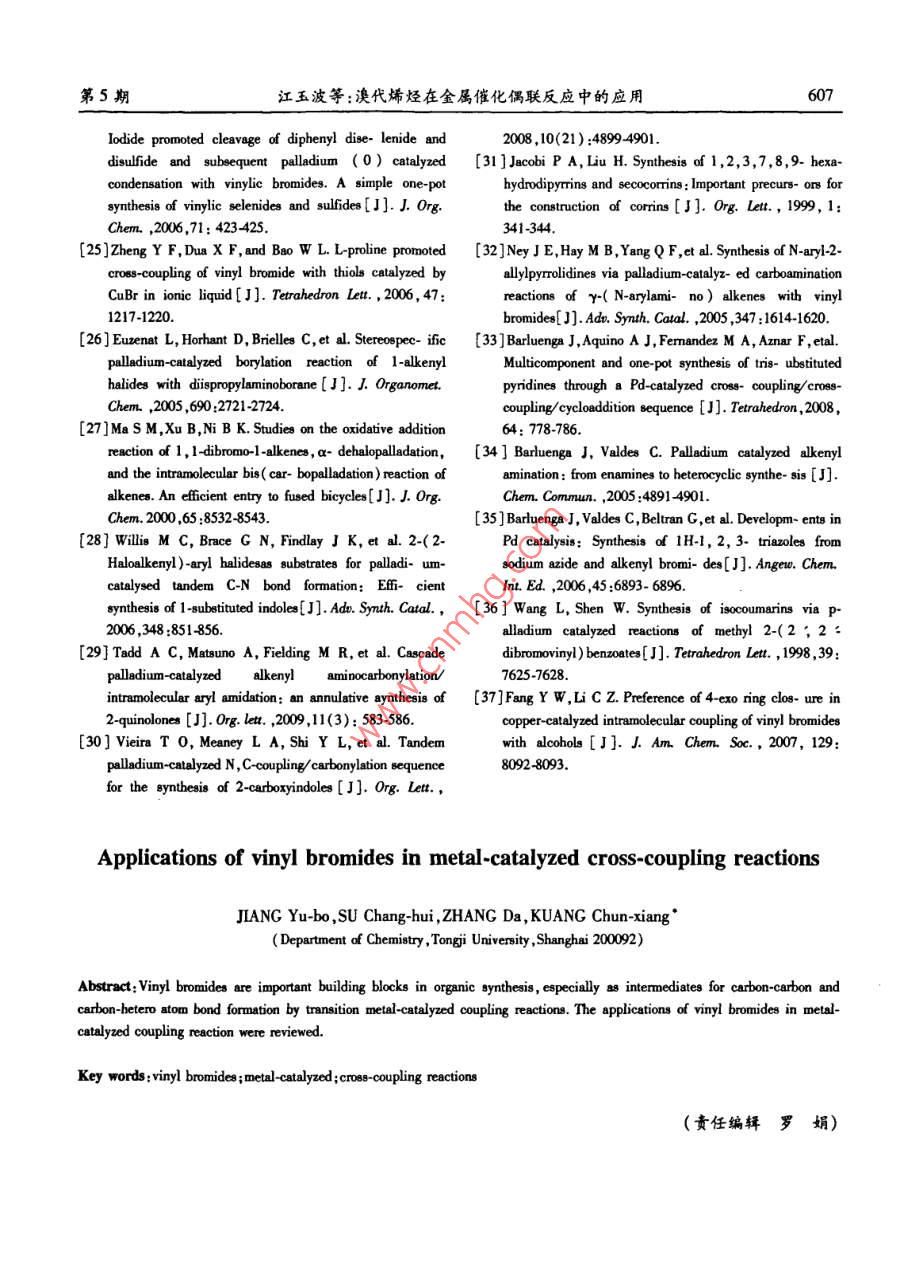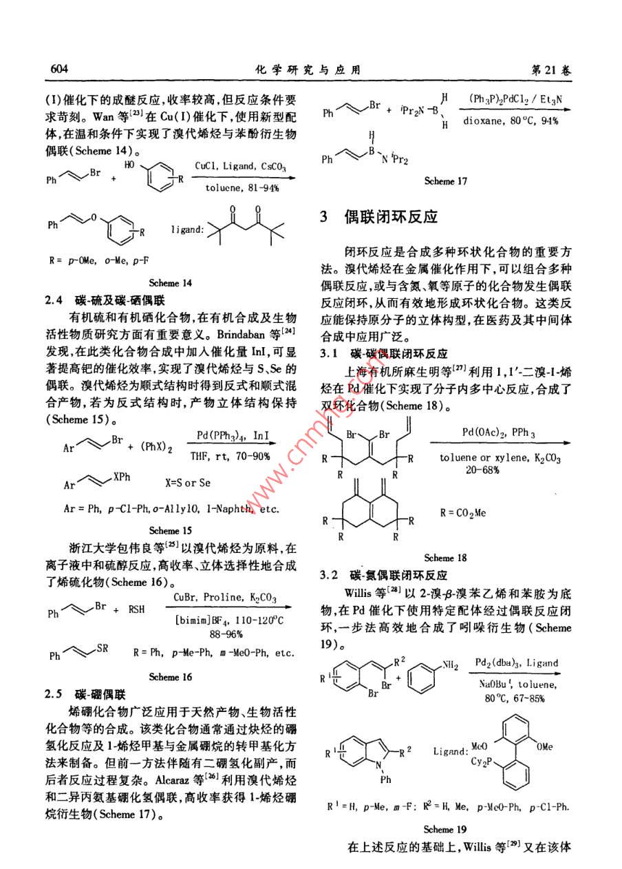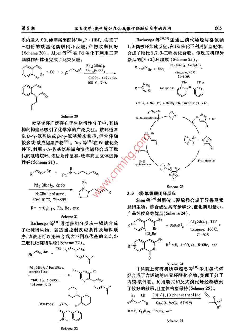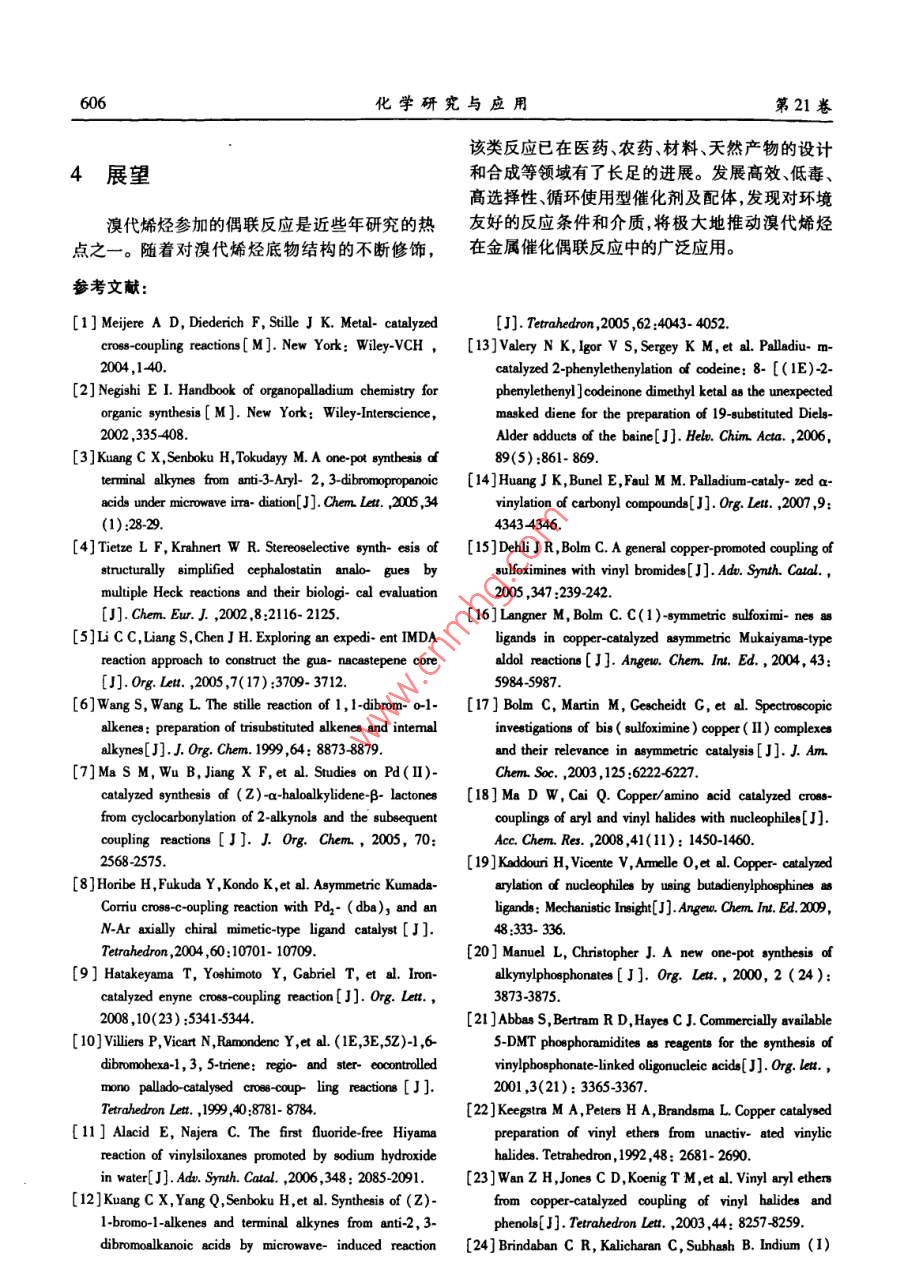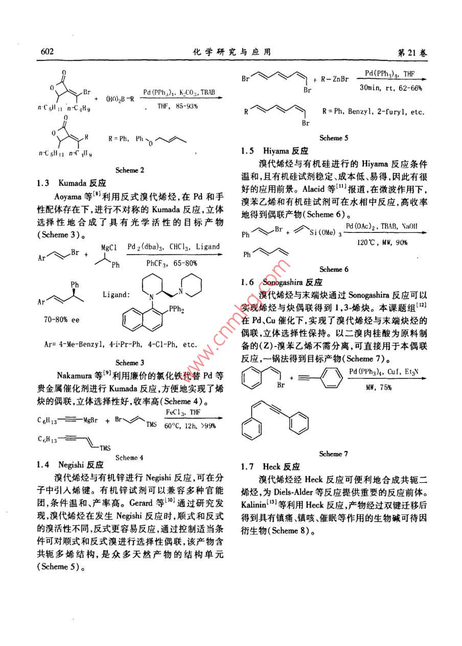 第21卷第5期化學(xué)研究與。應(yīng)用,Vol.21 ,No. 52009年5月Chemical Research and ApplicationMay ,2009文章編號(hào):1004-1656(2009 )05-0601 07溴代烯烴在金屬催化偶聯(lián)反應(yīng)中的應(yīng)用江玉波,蘇長(zhǎng)會(huì),張達(dá),匡春香°(同濟(jì)大學(xué)化學(xué)系,上海200092)摘要:溴代烯烴是一類重要的有機(jī)合成中間體,通過金屬催化的偶聯(lián)反應(yīng)可以有效地形成碳-碳及碳-雜鍵。本文綜述了溴代烯烴在金屬催化偶聯(lián)反應(yīng)中應(yīng)用的最新進(jìn)展。關(guān)鍵詞:澳代烯烴;金屬催化;偶聯(lián)反應(yīng)中圖分類號(hào):0623.22文獻(xiàn)標(biāo)識(shí)碼:A鹵代烯烴是一類不飽和鹵代烴,主要包括烯應(yīng)等。.丙基型鹵代烯烴和乙烯型鹵代烯烴。烯丙基型鹵1.1 Stille反應(yīng)代烯烴鹵原子的活性高,乙烯型鹵代烯烴的鹵原在Pd等過渡金屬的催化作用下,溴代烯烴與子反應(yīng)活性低,因而乙烯型鹵代烯烴長(zhǎng)期以來在有機(jī)錫發(fā)生Stille交叉偶聯(lián)反應(yīng)可形成碳碳鍵,該有機(jī)合成中應(yīng)用并不廣泛。直到上世紀(jì)八十年反應(yīng)可兼容多種官能團(tuán),立體選擇性好、效率高,代,有機(jī)化學(xué)家發(fā)現(xiàn),芳鹵和烯鹵在過渡金屬催化且有機(jī)錫試劑穩(wěn)定,該法常用于藥物及天然產(chǎn)物劑存在下可進(jìn)行眾多的偶聯(lián)反應(yīng),鹵代烯烴特別的合成中。Wang 等[6]報(bào)道了溴代烯烴與有機(jī)錫是乙烯型鹵代烯烴得到了有機(jī)合成化學(xué)家的高度試劑的碳碳偶聯(lián)。但由于有機(jī)錫化合物毒性大,重視,因此本文所述溴代烯烴均為乙烯型溴代烯限制了Sille反應(yīng)在藥物合成中的應(yīng)用(Scheme烴。在過渡金屬催化下,溴代烯烴的反應(yīng)活性遠(yuǎn)1)。高于氯代烯烴,而穩(wěn)定性優(yōu)于碘代烯烴,且易于制,B備,因而應(yīng)用最為廣泛。溴代烯烴在過渡金屬催PhSnBu3化劑Pd等存在下,可進(jìn)行Stille、Suzuki .Sonogashira、Heck.、Buchwald Ulmann等偶聯(lián)反應(yīng),立體選擇性地Pd2(dba)3, TFP合成烯烴共軛烯烴、烯胺、烯醚及環(huán)狀化合物,也可to luene, 100°C, 70%EtO2C V組合多種偶聯(lián)反應(yīng)合成結(jié)構(gòu)新穎的雜環(huán)化合物15]。溴代烯烴已廣泛應(yīng)用于醫(yī)藥、農(nóng)藥液晶、天然產(chǎn)物及1.2 Suzuki 反應(yīng)Schemel功能材料等的合成。本文綜述了溴代烯烴在金屬催Suzuki交叉偶聯(lián)反應(yīng)中使用無毒的有機(jī)硼,化偶聯(lián)反應(yīng)中的最新進(jìn)展。反應(yīng)條件溫和,對(duì)底物的選擇性較廣,且副產(chǎn)物少,在有機(jī)合成中應(yīng)用最廣泛。中科院上海有機(jī)1碳-碳偶聯(lián)反應(yīng)所麻生明等門]報(bào)道了在Pd催化下,溴代烯烴經(jīng):溴代烯烴在過渡金屬催化下,可與多種金屬Suzuki偶聯(lián)實(shí)現(xiàn)碳-碳成鍵,得到含有β-內(nèi)酯四元有機(jī)化合物發(fā)生交叉偶聯(lián)反應(yīng),進(jìn)行碳碳成鍵, .環(huán)的烯烴(Scheme 2)。立體選擇性地得到偶聯(lián)產(chǎn)物。主要反應(yīng)類型包括:tille反應(yīng)、Suzuki反應(yīng)、Kumada反應(yīng)、Negishi反應(yīng)、Hiyama反應(yīng)、Sonogashira反應(yīng)、Heck反收稿日期2008-10-07 ;修回日期:200902-18基金項(xiàng)目:上海市自然科學(xué)基金項(xiàng)目(06ZR14058) ;教育部留學(xué)回國(guó)人員科研啟動(dòng)基金項(xiàng)目聯(lián)系人筒介:匡春香( 1964-) ,男,教授,從事金屬有機(jī)化學(xué)及藥物化學(xué)研究。Email: kuangcx@ mail. tongi. edu. cn602化學(xué)研究與應(yīng)用第21卷+ R- ZnBrPd(PPh3)4, THF(HO)2B-RPd PPb,) K(CO., TBABB30min, rt, 62-66%nCsH ntgHgTHF,85-93%R=Ph, Benzyl, 2-fury1, etc.BrR=Ph,Phin 人人Scheme 5ntsHu nf lly1.5 Hiyama反應(yīng)溴代烯烴與有機(jī)硅進(jìn)行的Hiyama反應(yīng)條件Scheme 2溫和,且有機(jī)硅試劑穩(wěn)定、成本低、易得,因此有很1.3 Kumada 反應(yīng)Aoyama等[利用反式溴代烯烴,在Pd和手好的應(yīng)用前景。Alacid 等"報(bào)道,在微波作用下,性配體存在下,進(jìn)行不對(duì)稱的Kumada反應(yīng),立體溴苯乙烯和有機(jī)硅試劑可在水相中反應(yīng),高收率選擇性地合成了具有光學(xué)活性的目標(biāo)產(chǎn)物地得到偶聯(lián)產(chǎn)物(Scheme 6)。(Scheme 3)。Ph'Msi(Me) s-Pd (0Ac)2, TBAB, V\aOl120C, MW, 90%Pd 2(dba), CHClg, Li gandAr-P4PhPhCF3, 65-80%Scheme 61.6 Sonogashira 反應(yīng)Ligand: .溴代烯烴與末端炔通過Sonogashira反應(yīng)可以PPh2實(shí)現(xiàn)烯烴與炔偶聯(lián)得到1,3-烯炔。本課題組[12]70-80% ee在Pd、Cu催化下,實(shí)現(xiàn)了溴代烯烴與末端炔烴的偶聯(lián),立體選擇性保持。以二溴肉桂酸為原料制Ar= 4-Me-Benzyl, 4-i-Pr-Ph, 4-C1-Ph, etc.備的(Z)-溴苯乙烯不需分離,可直接用于本偶聯(lián)Scheme 3反應(yīng),一鍋法得到目標(biāo)產(chǎn)物(Scheme 7)。Pd(PPh3)4, Cul, EtgNNakamura等[9]利用廉價(jià)的氯化鐵代替Pd等rk》ww, 75%貴金屬催化劑進(jìn)行Kumada反應(yīng),方便地實(shí)現(xiàn)了烯炔的偶聯(lián),立體選擇性好,收率高(Scheme 4)。FeCls, THClHls= -WgBr + BrVr nxs60°C, 12h, >9%CsHis三\-TMSScheme 71.4 Negishi 反應(yīng)Scheme 41.7 Heck反應(yīng)溴代烯烴與有機(jī)鋅進(jìn)行Negishi反應(yīng),可在分溴代烯烴經(jīng)Heck反應(yīng)可便利地合成共軛二子中引入烯鍵。有機(jī)鋅試劑可以兼容多種官能烯烴,為Diels-Alder等反應(yīng)提供重要的反應(yīng)前體。團(tuán),條件