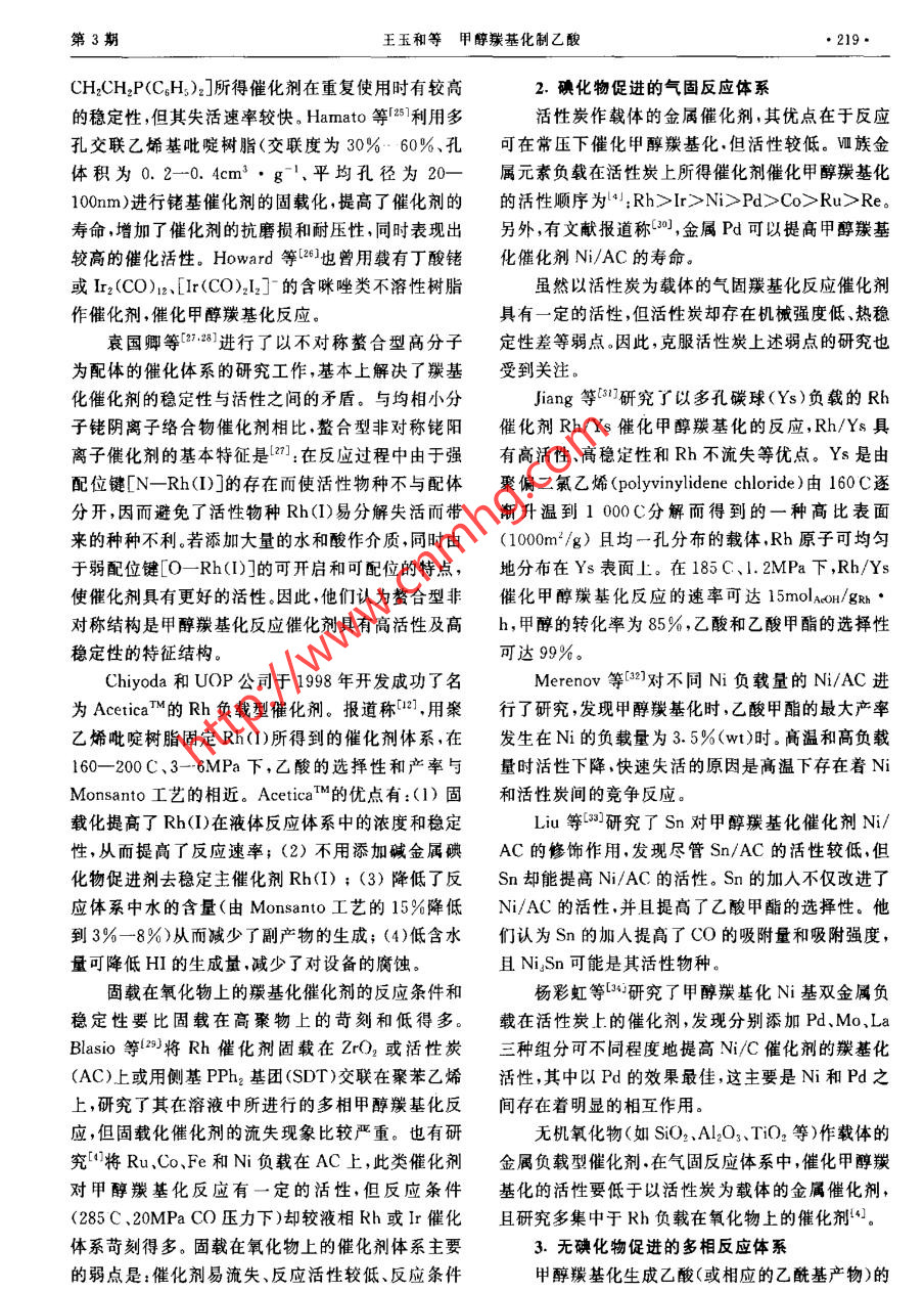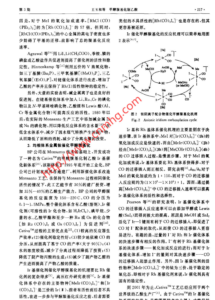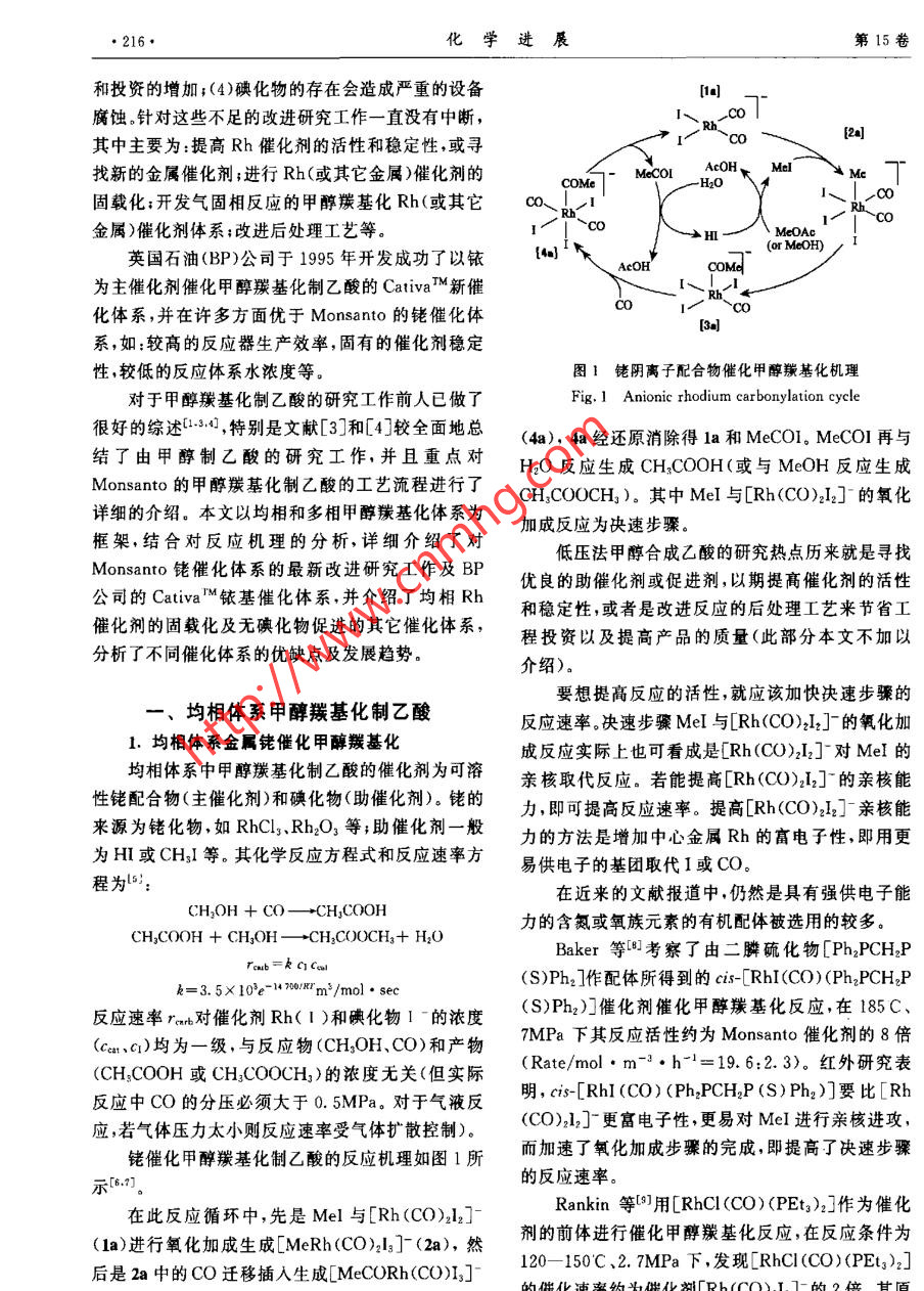 第15卷第3期化學(xué)進(jìn)展Vol. 15 No.32003年5月PROGRESS IN CHEMISTRYMay, 2003甲醇羰基化制乙酸王玉和賀德華徐柏慶“(清華大學(xué)化學(xué)系一碳化學(xué)與化工國(guó)家重點(diǎn)實(shí)驗(yàn)室北京 100084)摘要Monsanto公司的甲醇羰基化制乙酸工藝具有甲醇轉(zhuǎn)化率高、產(chǎn)物產(chǎn)率高等優(yōu)點(diǎn),但也存在著.主催化劑銠價(jià)格昂貴、助催化劑碘化物腐蝕設(shè)備等缺點(diǎn)。本文重點(diǎn)從催化機(jī)理研究方面介紹了國(guó)內(nèi)外對(duì)Monsanto技術(shù)的最新改進(jìn)研究工作、英國(guó)石油(BP)公司的甲醇羰基化制乙酸銥基催化體系(名為CativaM工藝),并介紹了無(wú)碘化物促進(jìn)的甲醇羰基化催化體系,分析了不同催化體系的優(yōu)缺點(diǎn)及研究發(fā)展趨勢(shì)。關(guān)鍵詞甲醇羰基化反應(yīng)乙酸銠(Rh)催化劑銥(Ir)催化劑 碘化物中圖分類(lèi)號(hào): 0643.3; TQ225文獻(xiàn)標(biāo)識(shí)碼: 文章編號(hào): 1005-281X (2003)03-0215-07Studies of Producing Acetic Acidby Carbonylation of MethanolWang Yuhe He Dehua Xu Boqing "(State Key Laboratory of Cl Chemistry and Technology ,Department ofChemistry , Tsinghua University, Beijing 100084, China)Abstract The Monsanto process for the carbonylation of methanol to acetic acid has many advantagessuch as high conversion of reactants and high yield of the product,but the disadvantages are also apparent,which include the high cost of the catalyst (rhodium) and the severe corrosion to equipment by the co-catalyst iodide. The improvement of Monsanto's technology, the Ir-based catalyst of BP (CativaTMtechnology ) and especially the catalytic mechanism are reviewed. In addition, the advantages anddisadvantages of different catalytic systems and the progress tendencies of those systems in the future arealso introduced.Key wordsmethanol ; carbonylation; acetic acid; rhodium (Rh) catalyst; iridium (Ir) catalyst;iodide作為一種應(yīng)用廣泛的重要化工原料,乙酸主要條件為150- 200C.3-6MPa(此法常被稱(chēng)為低壓被用于合成乙酸乙烯酯的單體(VAM)、合成乙酸法甲醇合成乙酸),乙酸的收率基于甲醇為99%,基酐的原料以及生產(chǎn)精制對(duì)苯二甲酸(PTA)的溶劑于CO為85%。Monsanto工藝也存在一些固有的等。乙酸的合成方法主要有碳水化合物的發(fā)酵,石腦缺點(diǎn)網(wǎng):(1)主催化劑金屬銠價(jià)格昂貴;(2)Rh(I )油或正丁烷的氧化,乙烯或乙醛的氧化以及甲醇的催化劑不穩(wěn)定,在CO不足時(shí)(如在生產(chǎn)后期分離產(chǎn)羰基化等方法”。其中,甲醇羰基化法占目前世界乙物時(shí))易被氧化為Rh(I)而從體系中沉淀出RhIs$.酸生產(chǎn)量的60%。Monsanto公司以銠為主催化劑、(3)反應(yīng)體系中存在大量的水(加水主要是為了避免碘化物為助催化劑的甲醇羰基化制乙酸工藝的反應(yīng)銠的沉淀和提高反應(yīng)速率)會(huì)造成產(chǎn)物分離的困難收稿: 2002年6月,收修改稿: 2002年8月*通訊聯(lián)系人e mail:bqxu@mail. tsinghua. edu. cn化.學(xué)進(jìn)展第15卷●. 216●和投資的增加;(4)碘化物的存在會(huì)造成嚴(yán)重的設(shè)備[1a]腐蝕。針對(duì)這些不足的改進(jìn)研究工作-直沒(méi)有中斷,2]~c其中主要為:提高Rh催化劑的活性和穩(wěn)定性,或?qū)eCOlAcOH rAM找新的金屬催化劑;進(jìn)行Rh(或其它金屬)催化劑的CoMe 1H2O固載化;開(kāi)發(fā)氣固相反應(yīng)的甲醇羰基化Rh(或其它c(diǎn)→HIMeOAc金屬>催化劑體系;改進(jìn)后處理工藝等。(or MeOH){w]英國(guó)石油(BP)公司于1995年開(kāi)發(fā)成功了以銥AcOHCOMe為主催化劑催化甲醇羰基化制乙酸的CativaM新催co化體系,并在許多方面優(yōu)于Monsanto的銠催化體[3a]系,如:較高的反應(yīng)器生產(chǎn)效率,固有的催化劑穩(wěn)定圖1銠陰離子配合物 催化甲醇羰基化機(jī)理性,較低的反應(yīng)體系水濃度等。Fig. 1 Anionic rhodium carbonylation cyele對(duì)于甲醇羰基化制乙酸的研究工作前人已做了很好的綜述01-.0,特別是文獻(xiàn)[3]和[4]較全面地總(4a). 4a經(jīng)還原消除得1a和MeCOl. MeCOl再與結(jié)了由甲醇制乙酸的研究工作,并且重點(diǎn)對(duì)H,O反應(yīng)生成CH,CO0H(或與MeOH反應(yīng)生成Monsanto 的甲醇羰基化制乙酸的工藝流程進(jìn)行了CH,COOCH,)。其中MeI與[Rh(CO)212]-的氧化詳細(xì)的介紹。本文以均相和多相甲醇羰基化體系為加成反應(yīng)為決速步驟??蚣?結(jié)合對(duì)反應(yīng)機(jī)理的分析,詳細(xì)介紹了對(duì)低壓法甲醇合成乙酸的研究熱點(diǎn)歷來(lái)就是尋找Monsanto銠催化體系的最新改進(jìn)研究工作及BP優(yōu)良的助催化劑或促進(jìn)劑,以期提高催化劑的活性公司的CativaM銥基催化體系,并介紹了均相Rh和穩(wěn)定性,或者是改進(jìn)反應(yīng)的后處理工藝來(lái)節(jié)省工催化劑的固載化及無(wú)碘化物促進(jìn)的其它催化體系,.程投資以及提高產(chǎn)品的質(zhì)量(此部分本文不加以分析了不同催化體系的優(yōu)缺點(diǎn)及發(fā)展趨勢(shì)。介紹)。.要想提高反應(yīng)的活性,就應(yīng)該加快決速步驟的-、均相體系甲醇羰基化制乙酸反應(yīng)速率。決速步驟Mel與[Rh(C0):]-的氧化加1.均相體系金屬銠催化甲醇羰基化成反應(yīng)實(shí)際上也可看成是[Rh(CO)1]-對(duì)Mel的均相體系中甲醇羰基化制乙酸的催化劑為可溶親核取代反應(yīng)。若能提高[Rh(C0)1]~的親核能性銠配合物(主催化劑)和碘化物(助催化劑)。銠的力,即可提高反應(yīng)速率。提高[Rh(CO)2I2]-