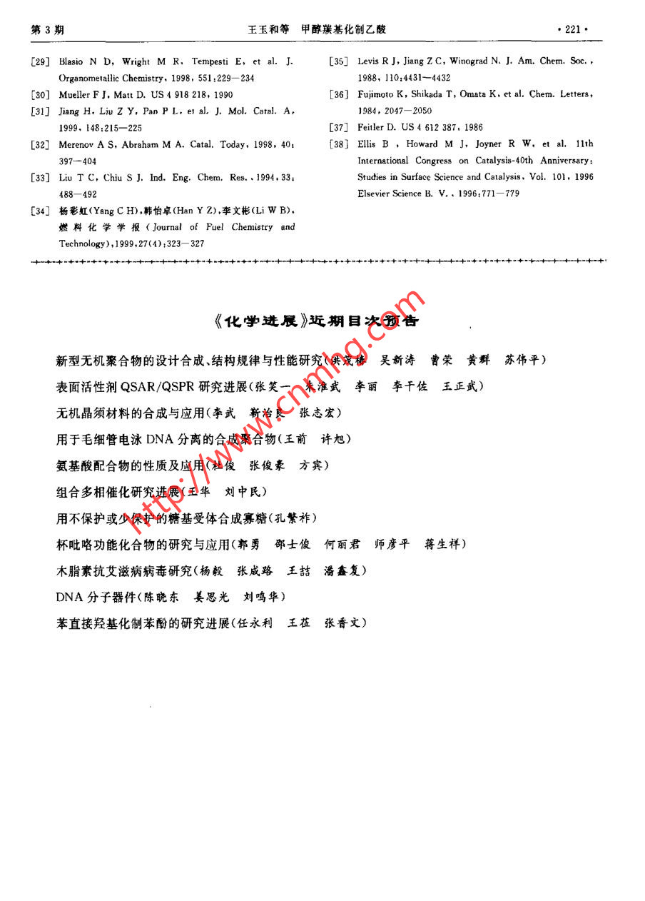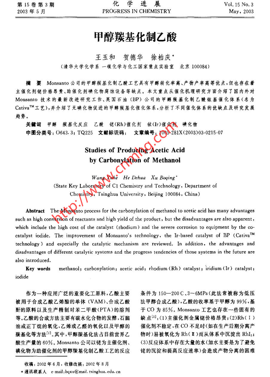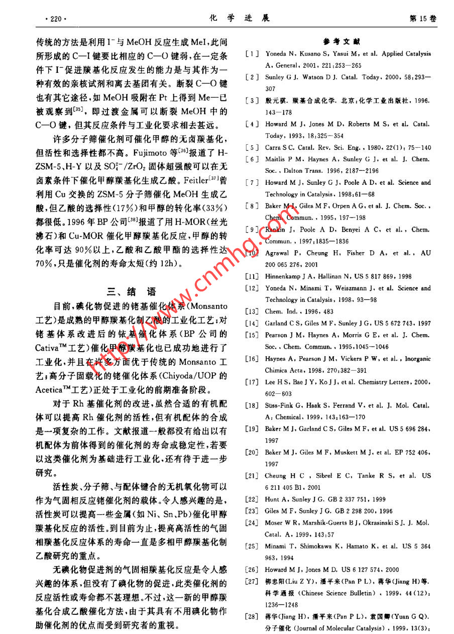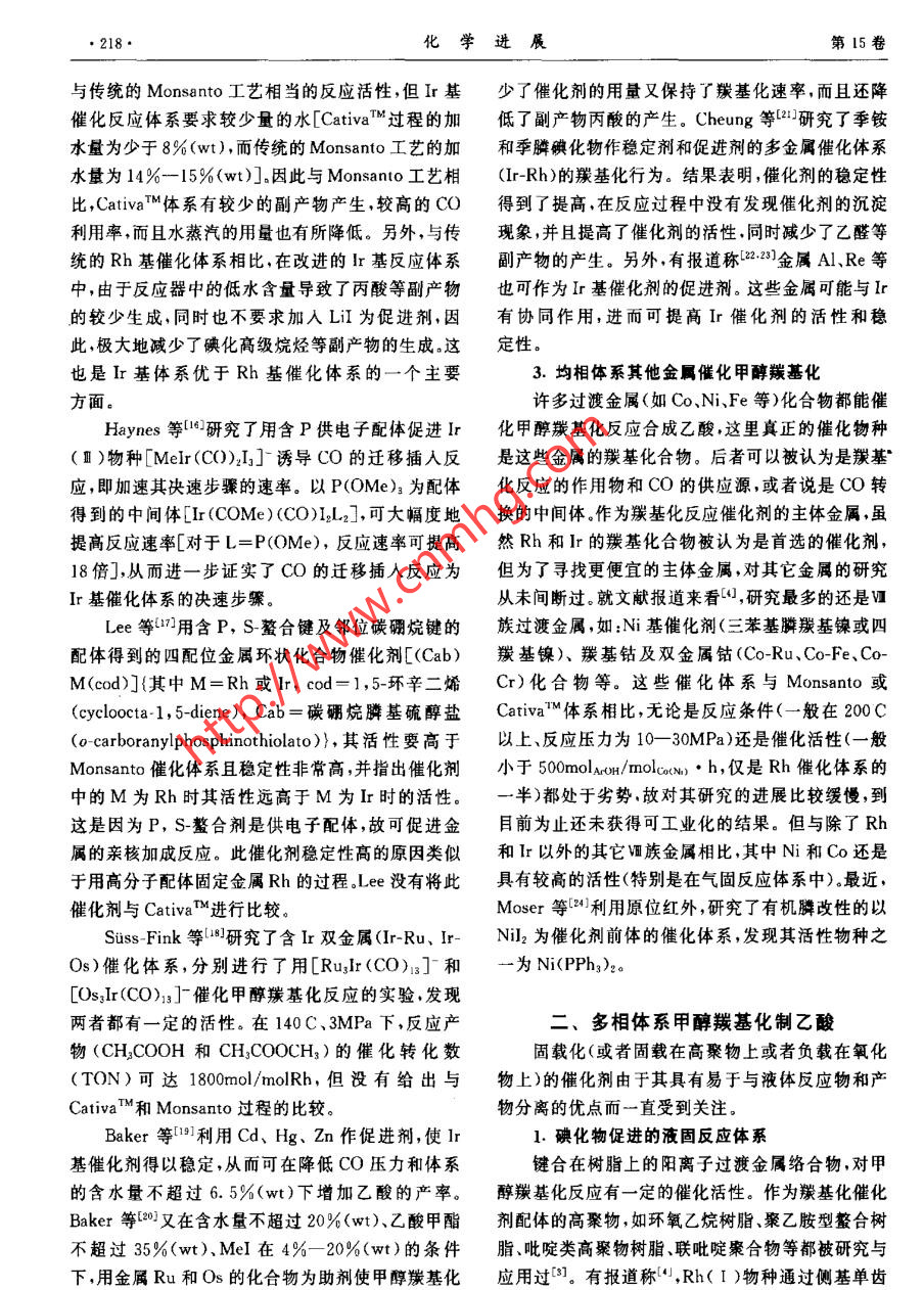 第15卷第3期化學(xué)進(jìn)展Vol. 15 No.32003年5月PROGRESS IN CHEMISTRYMay, 2003甲醇羰基化制乙酸王玉和賀德華徐柏慶“(清華大學(xué)化學(xué)系一碳化學(xué)與化工國(guó)家重點(diǎn)實(shí)驗(yàn)室北京 100084)摘要Monsanto公司的甲醇羰基化制乙酸工藝具有甲醇轉(zhuǎn)化率高、產(chǎn)物產(chǎn)率高等優(yōu)點(diǎn),但也存在著.主催化劑銠價(jià)格昂貴、助催化劑碘化物腐蝕設(shè)備等缺點(diǎn)。本文重點(diǎn)從催化機(jī)理研究方面介紹了國(guó)內(nèi)外對(duì)Monsanto技術(shù)的最新改進(jìn)研究工作、英國(guó)石油(BP)公司的甲醇羰基化制乙酸銥基催化體系(名為CativaM工藝),并介紹了無(wú)碘化物促進(jìn)的甲醇羰基化催化體系,分析了不同催化體系的優(yōu)缺點(diǎn)及研究發(fā)展趨勢(shì)。關(guān)鍵詞甲醇羰基化反應(yīng)乙酸銠(Rh)催化劑銥(Ir)催化劑 碘化物中圖分類(lèi)號(hào): 0643.3; TQ225文獻(xiàn)標(biāo)識(shí)碼: 文章編號(hào): 1005-281X (2003)03-0215-07Studies of Producing Acetic Acidby Carbonylation of MethanolWang Yuhe He Dehua Xu Boqing "(State Key Laboratory of Cl Chemistry and Technology ,Department ofChemistry , Tsinghua University, Beijing 100084, China)Abstract The Monsanto process for the carbonylation of methanol to acetic acid has many advantagessuch as high conversion of reactants and high yield of the product,but the disadvantages are also apparent,which include the high cost of the catalyst (rhodium) and the severe corrosion to equipment by the co-catalyst iodide. The improvement of Monsanto's technology, the Ir-based catalyst of BP (CativaTMtechnology ) and especially the catalytic mechanism are reviewed. In addition, the advantages anddisadvantages of different catalytic systems and the progress tendencies of those systems in the future arealso introduced.Key wordsmethanol ; carbonylation; acetic acid; rhodium (Rh) catalyst; iridium (Ir) catalyst;iodide作為一種應(yīng)用廣泛的重要化工原料,乙酸主要條件為150- 200C.3-6MPa(此法常被稱(chēng)為低壓被用于合成乙酸乙烯酯的單體(VAM)、合成乙酸法甲醇合成乙酸),乙酸的收率基于甲醇為99%,基酐的原料以及生產(chǎn)精制對(duì)苯二甲酸(PTA)的溶劑于CO為85%。Monsanto工藝也存在一些固有的等。乙酸的合成方法主要有碳水化合物的發(fā)酵,石腦缺點(diǎn)網(wǎng):(1)主催化劑金屬銠價(jià)格昂貴;(2)Rh(I )油或正丁烷的氧化,乙烯或乙醛的氧化以及甲醇的催化劑不穩(wěn)定,在CO不足時(shí)(如在生產(chǎn)后期分離產(chǎn)羰基化等方法”。其中,甲醇羰基化法占目前世界乙物時(shí))易被氧化為Rh(I)而從體系中沉淀出RhIs$.酸生產(chǎn)量的60%。Monsanto公司以銠為主催化劑、(3)反應(yīng)體系中存在大量的水(加水主要是為了避免碘化物為助催化劑的甲醇羰基化制乙酸工藝的反應(yīng)銠的沉淀和提高反應(yīng)速率)會(huì)造成產(chǎn)物分離的困難收稿: 2002年6月,收修改稿: 2002年8月*通訊聯(lián)系人e mail:bqxu@mail. tsinghua. edu. cn化.學(xué)進(jìn)展第15卷●. 216●和投資的增加;(4)碘化物的存在會(huì)造成嚴(yán)重的設(shè)備[1a]腐蝕。針對(duì)這些不足的改進(jìn)研究工作-直沒(méi)有中斷,2]~c其中主要為:提高Rh催化劑的活性和穩(wěn)定性,或?qū)eCOlAcOH rAM找新的金屬催化劑;進(jìn)行Rh(或其它金屬)催化劑的CoMe 1H2O固載化;開(kāi)發(fā)氣固相反應(yīng)的甲醇羰基化Rh(或其它c(diǎn)→HIMeOAc金屬>催化劑體系;改進(jìn)后處理工藝等。(or MeOH){w]英國(guó)石油(BP)公司于1995年開(kāi)發(fā)成功了以銥AcOHCOMe為主催化劑催化甲醇羰基化制乙酸的CativaM新催co化體系,并在許多方面優(yōu)于Monsanto的銠催化體[3a]系,如:較高的反應(yīng)器生產(chǎn)效率,固有的催化劑穩(wěn)定圖1銠陰離子配合物 催化甲醇羰基化機(jī)理性,較低的反應(yīng)體系水濃度等。Fig. 1 Anionic rhodium carbonylation cyele對(duì)于甲醇羰基化制乙酸的研究工作前人已做了很好的綜述01-.0,特別是文獻(xiàn)[3]和[4]較全面地總(4a). 4a經(jīng)還原消除得1a和MeCOl. MeCOl再與結(jié)了由甲醇制乙酸的研究工作,并且重點(diǎn)對(duì)H,O反應(yīng)生成CH,CO0H(或與MeOH反應(yīng)生成Monsanto 的甲醇羰基化制乙酸的工藝流程進(jìn)行了CH,COOCH,)。其中MeI與[Rh(CO)212]-的氧化詳細(xì)的介紹。本文以均相和多相甲醇羰基化體系為加成反應(yīng)為決速步驟??蚣?結(jié)合對(duì)反應(yīng)機(jī)理的分析,詳細(xì)介紹了對(duì)低壓法甲醇合成乙酸的研究熱點(diǎn)歷來(lái)就是尋找Monsanto銠催化體系的最新改進(jìn)研究工作及BP優(yōu)良的助催化劑或促進(jìn)劑,以期提高催化劑的活性公司的CativaM銥基催化體系,并介紹了均相Rh和穩(wěn)定性,或者是改進(jìn)反應(yīng)的后處理工藝來(lái)節(jié)省工催化劑的固載化及無(wú)碘化物促進(jìn)的其它催化體系,.程投資以及提高產(chǎn)品的質(zhì)量(此部分本文不加以分析了不同催化體系的優(yōu)缺點(diǎn)及發(fā)展趨勢(shì)。介紹)。.要想提高反應(yīng)的活性,就應(yīng)該加快決速步驟的-、均相體系甲醇羰基化制乙酸反應(yīng)速率。決速步驟Mel與[Rh(C0):]-的氧化加1.均相體系金屬銠催化甲醇羰基化成反應(yīng)實(shí)際上也可看成是[Rh(CO)1]-對(duì)Mel的均相體系中甲醇羰基化制乙酸的催化劑為可溶親核取代反應(yīng)。若能提高[Rh(C0)1]~的親核能性銠配合物(主催化劑)和碘化物(助催化劑)。銠的力,即可提高反應(yīng)速率。提高[Rh(CO)2I2]-