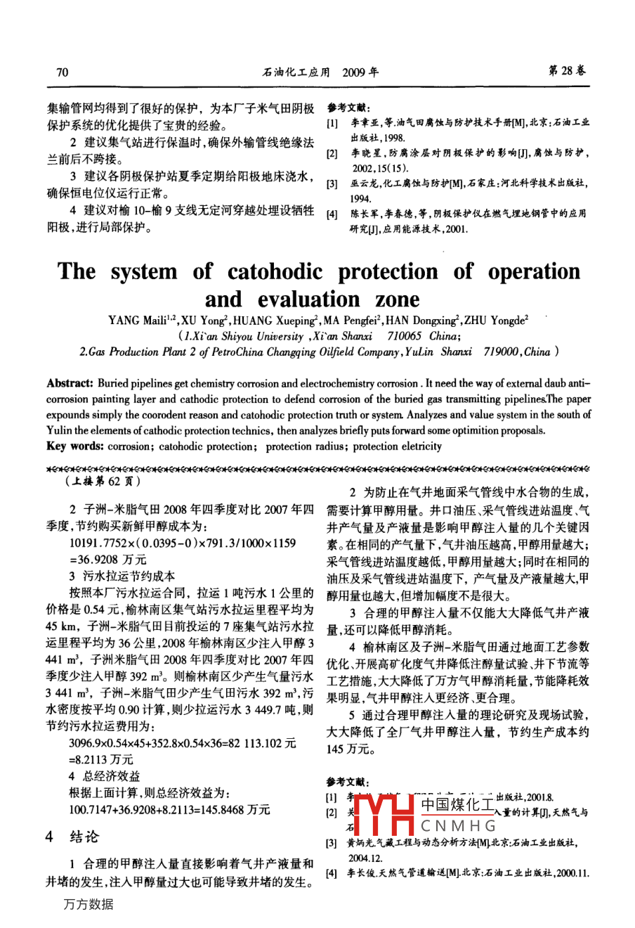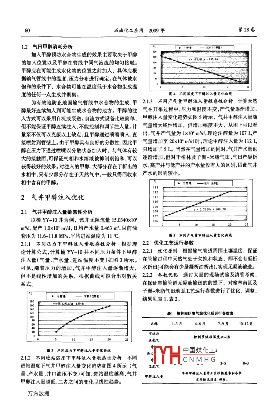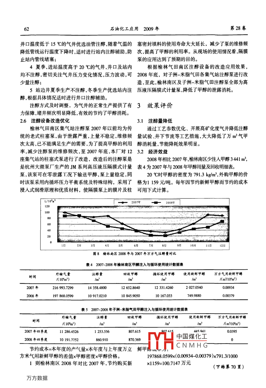 第28卷第4期石油化工應(yīng)用Vol 28 No 42009年7月PETROCHEMICAL INDUSTRY APPLICATIONJuly 2009氣井甲醇注人優(yōu)化周玉榮,陳兵,馬國華,許曉偉,田喜軍(中國石油長慶油田公司第二采氣廠,陜西榆林719000摘要:目前榆林氣田南區(qū)及子洲米脂氣田天然氣開采主要采用多井高壓集氣、集中注醇、加熱節(jié)流、輪換計(jì)量、淺度分離、集中凈化等工藝流程。在甲醇的使用過程中又存在兩方面問題,一方面,只有在集輸管線中注入足量的甲醇,才可降低天然氣水合溫度,使其比天然氣可能冷卻到的溫度還低(如果管線中還有液烴存在,甲醇也必須加到使其在烴液相中達(dá)到飽和的程度),破壞水合物的形成條件,抑制水合物的形成;另一方面,由于甲醇在氣田生產(chǎn)中大量使用,過量注入又會(huì)造成較大的經(jīng)濟(jì)損失,因此,只有合理的注醇量,才能有效的抑制水合物的形成,又能節(jié)約生產(chǎn)成本。通過工藝參數(shù)優(yōu)化、開展高礦化度氣井降低注醇量試驗(yàn)、井下節(jié)流等工藝措施優(yōu)化氣井甲醇注入量,取得了顯著的經(jīng)濟(jì)效益關(guān)鍵詞:高礦化度氣井氣井;注入甲醇;實(shí)驗(yàn)中圖分類號:TE375文獻(xiàn)標(biāo)識(shí)碼:A文章編號:1673-5285(2009)04-0059051注醇現(xiàn)狀分析100m/d、150m/d,要求產(chǎn)品甲醇含量≥95%,塔底水甲醇含量≤01%。11注醇系統(tǒng)運(yùn)行現(xiàn)狀子洲-米脂氣田建集氣站13座,建井103口,建產(chǎn)截止2008年底,榆林南區(qū)建集氣站12座,建井能60×10ym/a,單井配產(chǎn)1.84xl0md,注醇系統(tǒng)主172口,建產(chǎn)能20.×10m/a,單井配產(chǎn)39X×104m/d,要是利用站內(nèi)注醇泵向單井井口注醇,必要時(shí)可向集注醇系統(tǒng)主要是利用站內(nèi)注醇泵向單井井口及進(jìn)站注輸支干線注入甲醇,建立甲醇回收裝置1套,處理量為人甲醇,建立甲醇回收處理裝置2套,處理量分別為150md。甲醇注入與回收生產(chǎn)流程見圖1、圖2。井口注醇甲醇集氣站污水站內(nèi)注醇購買甲醇甲醇回收圖1檎林南區(qū)甲醇注入與回收生產(chǎn)流程示意圖井口注醇甲醇集氣站污水外輸管線購買甲醇甲醇回收圖2子洲-米脂氣田甲醇注入與回收H中國煤化工CNMHG收稿日期:200905-01作者簡介:周玉榮,女(1975-),工程師,1999年畢業(yè)于大慶石油學(xué)院化學(xué)工程專業(yè),主要從事氣田工藝技術(shù)管理及研究工作石油化工應(yīng)用200年第28卷12氣田甲醇消耗分析廠n孵線怍(汴量加入甲醇預(yù)防水合物生成的效果主要取決于甲醇的加入位置以及甲醇在管線中同氣液流的均勻接觸y-13.3tx+255,8甲醇應(yīng)在可能生成水化物的位置之前加入,具體應(yīng)根據(jù)輸氣管線中的溫度、壓力分布進(jìn)行確定。在氣體被水飽和的條件下,水合物可能在溫度低于水合物生成溫度的任何一點(diǎn)生成并聚集。圖4不同溫度下甲醇注入量變化曲線為有效地防止地面輸氣管線中水合物的生成,甲213不同產(chǎn)氣量甲酶注入量敏感性分析計(jì)算天然醇最好連續(xù)加入到可能生成水合物的地方。甲醇的注氣在開采過程中壓力和溫度不變,產(chǎn)氣量逐漸增加入方式可以釆用自流或泵送。自流方式設(shè)備比較簡單,甲醇注入量變化趨勢如圖5所示,氣井甲醇注人量隨但不能保證甲醇連續(xù)注入,不能控制和調(diào)節(jié)注入量。計(jì)氣量增大線性增加,但增加幅度不大,從圖上可以看量泵不僅可以克服以上缺點(diǎn),且甲醇通過噴嘴噴入,直出,氣井產(chǎn)氣量為1×0°md,理論注醇量為107L產(chǎn)接噴射到管壁上。由于甲醇具有良好的分散性,因此甲氣量增加至20×10md時(shí),理論甲醇注入量為112L醇在壓力下通過噴嘴以分散狀態(tài)加入時(shí),與氣體有較只增加了5L。當(dāng)然在氣量增加的同時(shí),氣井產(chǎn)水量也大的接觸面,可保證氣相和水溶液被抑制劑飽和,可以逐漸增加,但對于榆林及子洲-米脂氣田,氣田產(chǎn)凝析獲得較好的效果。對注入的甲醇大部分存在于析出的水高產(chǎn)井與低產(chǎn)井的產(chǎn)水量沒有大的區(qū)別因此氣井水相中,只有少部分存在于天然氣中,一般只需回收水產(chǎn)水的影響較小。相中含有的甲醇。線性(注2氣井甲醇注入優(yōu)化2.1氣井甲醇注入量敏感性分析y·0.2658x+106.79以榆Y10并為例,該井無阻流量150340×0-01620m/d,配產(chǎn)10x10md,日均產(chǎn)水量0463m3,目前油套壓為116-11.8MPa,平均進(jìn)站溫度為11℃圖5不同產(chǎn)氣量甲醇注入量變化曲線211不同壓力下甲醇注入量敏感性分析根據(jù)理2.2優(yōu)化工藝運(yùn)行參數(shù)論計(jì)算公式,計(jì)算榆YY-10井不同壓力條件下甲醇22.1優(yōu)化原則根據(jù)輸氣管道周圍土壤溫度,保證注入量(氣量產(chǎn)水量、進(jìn)站溫度不變)如圖3所示。在管輸過程中天然氣處于欠飽和狀態(tài),即不會(huì)有凝析可見,隨著壓力的增加,氣井甲醇注入量逐漸增大,水析出(可能會(huì)有少量凝析油析出),實(shí)現(xiàn)無凝液輸送。但不是線性增加的關(guān)系,根據(jù)曲線可擬合出對數(shù)關(guān)222參數(shù)優(yōu)化通過大量的現(xiàn)場試驗(yàn)及清管考察系式。在保證集輸管道無凝液輸送的前提下,對榆林南區(qū)及子洲-米脂氣田地面工藝運(yùn)行參數(shù)進(jìn)行了優(yōu)化、調(diào)整,注醇囊對數(shù)(注醇量)結(jié)果見表1表2。r:9828L-13941喪1榆林南區(qū)集氣站優(yōu)化后運(yùn)
