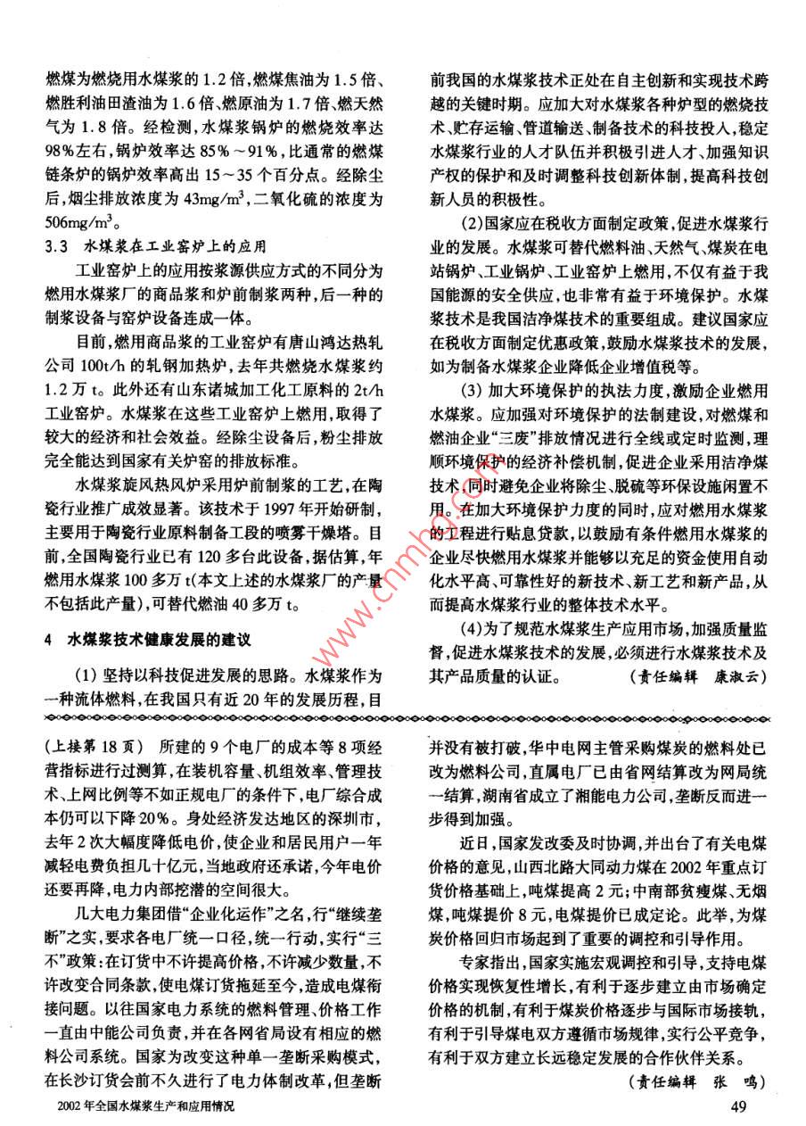 ★加工轉(zhuǎn)化★2002年全國(guó)水煤漿生產(chǎn)和應(yīng)用情況劉珊1)文芳2)(1.國(guó)家水煤漿工程技術(shù)研究中心,北京市和平里,100013;2.煤炭科學(xué)研究總院北京煤化所,北京市和平里,100013)摘要介紹了我國(guó)水煤漿廠的概況,對(duì)2002年全國(guó)水煤漿廠的生產(chǎn)、運(yùn)輸、銷(xiāo)售和燃用情況進(jìn)行了闡述,并對(duì)今后水煤漿的發(fā)展提出了建議。關(guān)鍵詞水煤漿生產(chǎn)燃燒應(yīng)用建議1我國(guó)水煤漿廠概況盛泰水煤漿廠、青島新源水煤漿廠、廣東茂名水煤漿廠擴(kuò)建工程、吉林石化水煤漿廠、遼河油田水煤漿廠1998年以前,我國(guó)只有北京水煤漿示范廠、兗和廣東南海水煤漿廠等。日水煤漿廠、棗莊礦務(wù)局八一水煤漿廠、株洲選煤廠水煤漿車(chē)間、撫順勝利礦水煤漿廠5家水煤漿制備22002年水煤漿廠的生產(chǎn)與運(yùn)輸銷(xiāo)售情況企業(yè),總設(shè)計(jì)能力約為065Mt/a。其中規(guī)模較大的2.1水煤漿的生產(chǎn)量北京水煤漿示范廠(250kt/a)、兗日水煤漿廠2002年全國(guó)水煤漿廠共生產(chǎn)水煤漿99.5萬(wàn)t,(250kta)均為引進(jìn)國(guó)外水煤漿制備技術(shù)建廠。占設(shè)計(jì)能力的23.4%。2000年全國(guó)水煤漿廠共生1998年以來(lái),我國(guó)水煤漿制備廠的發(fā)展較快,產(chǎn)43.7萬(wàn)t,占設(shè)計(jì)能力的248%。2002年的生產(chǎn)先是八一水煤漿廠經(jīng)過(guò)多年的建設(shè),建成了250kt/a量是2000年生產(chǎn)量的2.3倍,由此可見(jiàn),水煤漿行的制漿生產(chǎn)線,并擁有了我國(guó)自主知識(shí)產(chǎn)權(quán)的制備業(yè)在近2年有了較快速度的發(fā)展,但從占總設(shè)計(jì)制技術(shù)。接著建起了白楊河發(fā)電廠自備漿廠、邢臺(tái)東備能力的比率來(lái)看,2002年的情況與2000年的情龐礦水煤漿廠、大同匯海水煤漿廠、勝利油田水煤漿況相當(dāng),只占設(shè)計(jì)制備能力的近1/4。也就是說(shuō),目廠、廣東茂名熱電廠自備漿廠、北京燕化新東方水煤前水煤漿的制備生產(chǎn)線并沒(méi)有被充分利用,沒(méi)有足漿廠新汶良莊水煤漿廠、孫村水煤漿廠等,同時(shí)也夠的用戶燃用水煤漿。因此如何完善制備、貯運(yùn),特建起了一些非國(guó)有企業(yè)的水煤漿制備廠,如大同的別是燃燒利用技術(shù),積極開(kāi)發(fā)燃燒用戶,是我國(guó)水煤新源水煤漿廠、河北霸州水煤漿廠、河北宏達(dá)水煤漿漿事業(yè)今后發(fā)展過(guò)程中的重點(diǎn)。廠。這些新建的水煤漿廠都是由我國(guó)自主設(shè)計(jì),采2002年水煤漿生產(chǎn)量最高的企業(yè)是白楊河電用我國(guó)的制漿技術(shù)、設(shè)備、添加劑,因此我國(guó)的制漿廠自備漿廠,共生產(chǎn)水煤漿32萬(wàn)t。其它水煤漿生工藝和添加劑性能已達(dá)到國(guó)際先進(jìn)水平。截止產(chǎn)量較大的企業(yè)分別是八一礦水煤漿廠(生產(chǎn)量為2002年底,我國(guó)共有水煤漿廠15座,設(shè)計(jì)能力約為16.6萬(wàn)t)大同匯海水煤漿公司(生產(chǎn)量為12.6萬(wàn)4.26Mt/a,是5年前的6.5倍,水煤漿廠的數(shù)量和t)兗日水煤漿廠(生產(chǎn)量8萬(wàn)t)、茂名熱電廠自備總生產(chǎn)能力均居世界第一位。電廠(生產(chǎn)量為7.6萬(wàn)t)、東龐礦水煤漿廠(生產(chǎn)量我國(guó)水煤漿廠主要分布在山東省,總設(shè)計(jì)制備為56萬(wàn)t)勝利發(fā)電廠水煤漿廠(生產(chǎn)量為6.5萬(wàn)能力約為1.80Mt/a,占全國(guó)總設(shè)計(jì)制備能力的t)北京水煤漿廠(生產(chǎn)量3.8萬(wàn)t)燕化新東方水42.3%;其次分布在山西大同和北京,總制備設(shè)計(jì)能煤漿公司(生產(chǎn)量為約3萬(wàn)t)等。力分別為1.00Mt/a和0.50Mt/a,占全國(guó)的23.5%2.2水煤漿的質(zhì)量和11.7%。我國(guó)水煤漿廠的制漿原料煤為水選精煤、浮選我國(guó)還有一批正在建設(shè)中的水煤漿廠,主要集精煤、低灰原煤,制漿工藝主要為高濃度磨礦工藝。中在東北地區(qū)和廣東省,如沈陽(yáng)石蠟水煤漿廠、大慶我國(guó)主要的制漿設(shè)備為球磨機(jī)。2002年投產(chǎn)的北2002年全國(guó)水煤漿生產(chǎn)和應(yīng)用情況京燕化新東方水煤漿公司用振動(dòng)磨機(jī)替代球磨機(jī)作足生產(chǎn)需要但也存在著個(gè)別水煤漿含有雜質(zhì)穩(wěn)定為主要磨礦設(shè)備,是對(duì)我國(guó)制漿工藝進(jìn)行新的嘗試。性不能滿足貯存運(yùn)輸?shù)囊蟮痊F(xiàn)象。2002年全國(guó)從2002年的生產(chǎn)情況看我國(guó)制漿技術(shù)基本上能滿水煤漿廠生產(chǎn)的水煤漿的質(zhì)量特性如表1所示。表12002年全國(guó)水煤漿質(zhì)量指標(biāo)一覽表水煤漿質(zhì)量指標(biāo)濃度C/%63.0-68.0粘度/mPa.s750~1400發(fā)熱量Q,/Mkg17.8~21.0硫分S,m/%0.25~0.73灰分A、m/%3.9~8.2揮發(fā)分V/%大于0.3mm的物料含量,Pm+0.m/%0~2.00灰熔點(diǎn)ST1250~1450小于0.075mm的物料含量,P69.0~89.12.3水煤漿的生產(chǎn)成本我國(guó)水煤漿廠生產(chǎn)的水煤漿主要供電站鍋爐燃由于制漿廠所處地理位置不同,制漿原料煤的用,全國(guó)目前共有4家企業(yè)在電站鍋爐上燃用水煤價(jià)格也有很大差別,例如,大同匯海水煤漿公司地處漿,這些企業(yè)分別是山東白楊河電廠廣東茂名熱電大同煤城,其制漿原料煤的價(jià)格僅為90元/t,而茂廠、北京燕山石化第三熱電站、廣東汕頭萬(wàn)豐熱電名熱電廠自備水