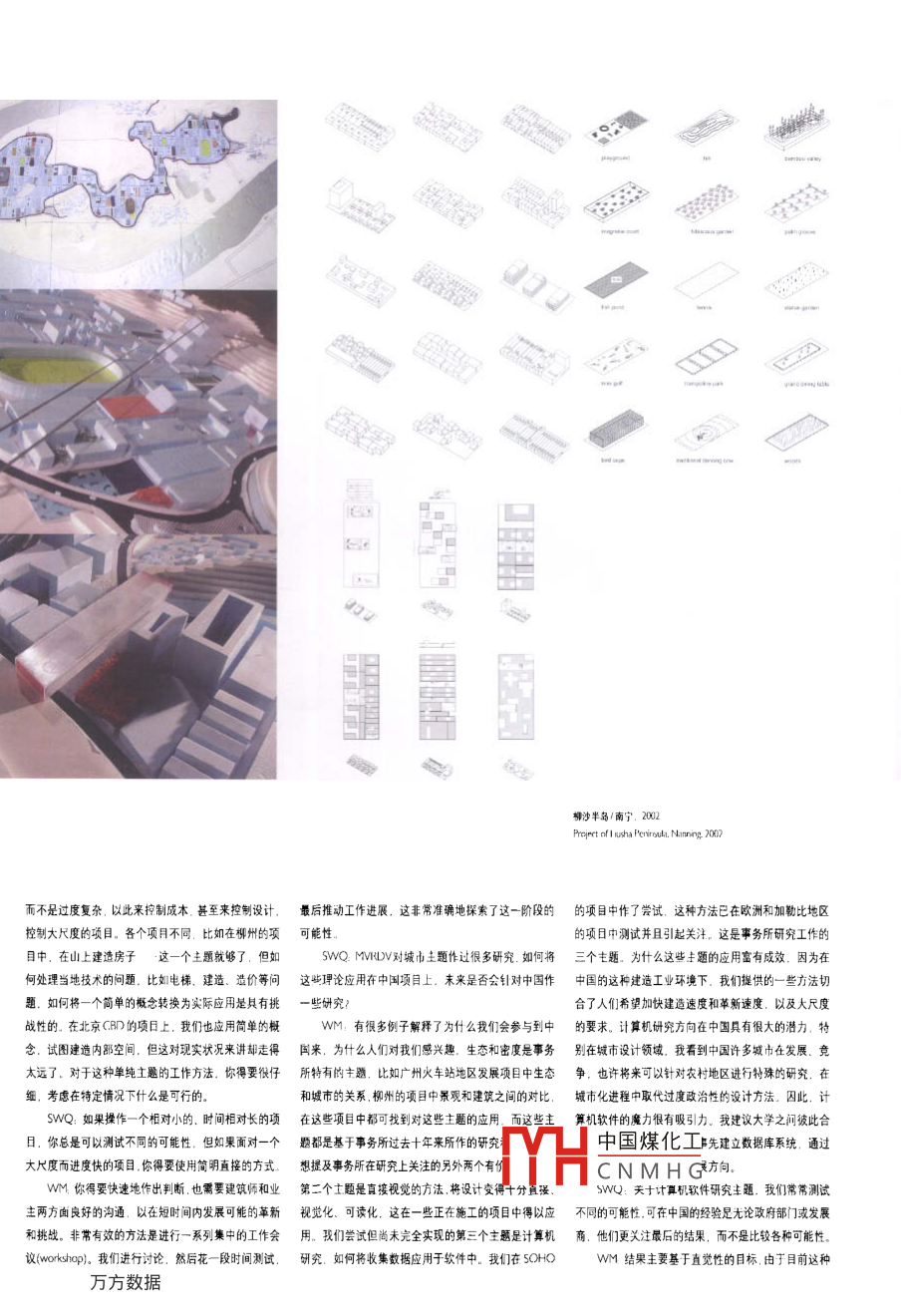 史文情 SHI Wen-qianMVRDV的中國之旅MVRDV In china泰達城墁型,天津.2004Model ul IHA City, Turut\ 2摘要RDN事務(wù)所由 Winy Maas, Jacob accompany the process in contemporary5MQMR在中國參與了不少項目,從規(guī)劃到建筑等各種不同尺度的項目.你對中國項日的經(jīng)驗是anRs和 Nathalie de vries于1991年在荷蘭 architectural design. The products of this鹿特丹建立。MRDV堅持追求對城市密度 approach varies and ranges from buildings of all w它們各有不同,如我以前討論的一方面它的理想和研究通過對與當代建筑和設(shè)計過 ypes and sizes, from architecture to urban們總是充沸活力的,許多事件在發(fā)生,速度銀人它程相關(guān)的大量復(fù)雜數(shù)據(jù)的分析來塑造空間. design from landscape design to publications and狀況,另一方面,你可以感覺到缺王一種監(jiān)督制度和這些研究方法的成果滲透于各種尺度和類型 nstallations MVRDV starts working on Chinese改葬,也許這需要時間,特別是在政府部門這一塊,獲的建筑設(shè)計,城市設(shè)計、景觀設(shè)計、發(fā)行刊 project in00. n the past few years. It has得審批需要時間。盡管許多發(fā)展商做-些嘗試,希望革新.個性來適應(yīng)特定的市場目標,但由于長時間的物和展覽MRDV的中國之旅始于2002年。 experienced different Chinese citics frorn south政府手續(xù)而使得這種譽試變得困難,這需要一些途徑幾年來也歷游了多個中國城市,涉及規(guī)劃、 to north, collaborated with different clients來改進,國內(nèi)設(shè)計院與政府部門應(yīng)該合作找到一種方法來促進這個過欄,同時能夠確保必要的技術(shù)上的質(zhì)建筑等不同的項目。文章通過與 Winy Maasading government or private developer.B是,比如結(jié)構(gòu),地震等等方面這是積極和消極兩方的訪談以及對MRD∨在中國項目的介紹, interviewing with Winy Maas, the author血的探討了NR在中國的工作方法和面臨的 introduced the projects they have done,andsWQ我認為閂際建筑師介入中國項目對政府部門來說也足一個攙戰(zhàn),政府有革新試驗的愿望.但首discusses the design approach of the projects先得要改變一下態(tài)度關(guān)鍵詞密度生態(tài)視覺化計算機研究 and the difficultics they have faced in ChinaWM你總是知遴你已經(jīng)有的是什么革新和試驗數(shù)據(jù)庫KEY WORD Density, Ecology Visualization.導(dǎo)致下一步的發(fā)展。有些事件相對簡單。比如由于新的高科技存中國的發(fā)展,上海的磁懸浮列車很快得以ABSTRACT MVRDV was set up in Computer Research Database實施,而在一些沒有那么重要和前沿的方面就顯得比較困難。所以下一步政府需要做更廣泛的革新TRDV是否對中國項目有一些特殊的工作方式呢office continues to pursue research on the文章編號:1005684×(2005)01中國煤化工過分強調(diào)中國的大度和速fascination of urban density. It uses a method ofTYHCNMH一日似的情況。比較一下這以冬的質(zhì)量方面。這總是有正shaping space through analysis of complicate面和負面的因素.如我剛才講的.在嘗試實驗和審批,amounts of relevant datd which usually或者說目前法規(guī)之間的落差、目前事務(wù)所里應(yīng)用不同的工作方法。方法之一是每個項日關(guān)注一,兩個主題時代建筑Time+ Architecture2005/l65沙半島/南寧,業(yè)主計劃在南寧市東面的自然區(qū)域發(fā)展一塊新的城市地帶.面積約256萬m2,基地是一個三邊環(huán)水的島地.島地內(nèi)是起伏的坡地和幾座山峰.現(xiàn)有一些村落和大片的果林。在高處的山峰地帶和低處的堤岸地帶之間,創(chuàng)造一個可以建造城市的平臺,形成由高到低的景觀.城市堤岸三個標高的空間在保留湖泊,樹林、村莊的前提下建造城市。城市由一條環(huán)形道路和網(wǎng)格系統(tǒng)組成,網(wǎng)格的大小由適合各種類型建筑類型的最優(yōu)化尺寸決定,建筑形式可以是別墅.連排住宅、多層,高層住宅等及其變形.再加上不同公共空間的組合.創(chuàng)造出網(wǎng)格內(nèi)變化無窮的建筑類型和空間,這創(chuàng)造了一種混合的生活方式.以改變大多數(shù)單一建筑類型的新城規(guī)劃模式。這種混合模式避免了單一類型可能帶來的市場危險性,也適應(yīng)實施過程中可能發(fā)生的多變性這是一個烏托邦的理想堿市模式.處在自然環(huán)境中的新興城市地帶很接近市中心,而河流又將理想城市與外界隔絕開來。中間標高的城市地帶有著山峰和堤岸的雙重保護.形成一個世外桃源。網(wǎng)格和環(huán)形道路為每個單元提供了均等的到達性,這表達了對均質(zhì)平等城市的理想中國煤化工CNMHG柳沙半島/南寧.200而不是過度復(fù)雜,以此來控制成本、甚至來控制設(shè)計,最后推動工作進展,這非常準確地探索了這一階段的的項目中作了嘗試,這種方法已在歐洲和加勒比地區(qū)控制大尺度的項目。各個項月不同,比如在柳州的項可能性的項日中測試并且引起關(guān)注。這是事務(wù)所研究工作的目中,在山上建造房子這一個主題就夠了,但如5WQMw對城市主題作過很多研究如何將三個主題。為什么這些主題的應(yīng)用盒有成效.因為在何處理當?shù)丶夹g(shù)的問題。比如電梯,建造、造價等問這些評論應(yīng)用存中國項目上.末來是否會針對中國作中國的這種建造工業(yè)環(huán)境下。我們提供的一些方法切題.如何將一個簡單的概念轉(zhuǎn)換為實際應(yīng)用是具有挑一些研究合了人們希望加快