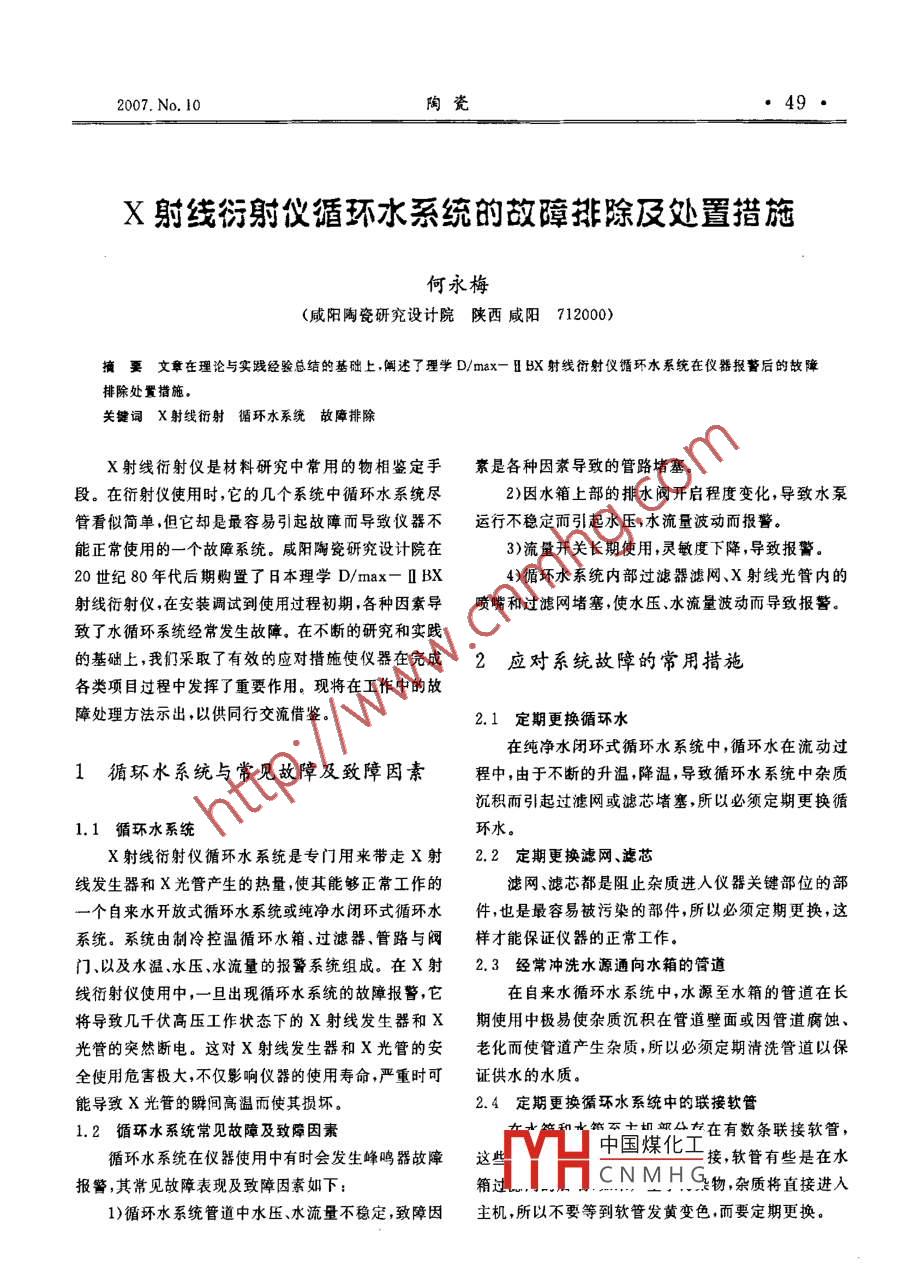 2007. No. 10陶瓷X射線衍射儀循環(huán)水系統(tǒng)的故障排除及處置措施何永梅(咸陽陶瓷研究設計院陜西咸陽712000)摘要文章在理論與實踐經(jīng)驗總結的基礎上,闡述了理學D/max-HBX射線衍射儀循環(huán)水系統(tǒng)在儀器報警后的故障排除處置措施。關鍵詞 X射線衍射循環(huán)水系統(tǒng) 故障排除X射線銜射儀是材料研究中常用的物相鑒定手素是各種因素導致的管路堵塞。段。在衍射儀使用時,它的幾個系統(tǒng)中循環(huán)水系統(tǒng)盡2)因水箱上部的排水閥開啟程度變化,導致水泵.管看似簡單,但它卻是最容易引起故障而導致儀器不運行不穩(wěn)定而引起水 壓,水流量波動而報警。能正常使用的一個故障系統(tǒng)。咸陽陶瓷研究設計院在3)流量開關長期使用,靈敏度下降,導致報警。20世紀80年代后期購置了日本理學D/max- I BX4)循環(huán)水系統(tǒng)內(nèi)部過濾器濾網(wǎng)、X射線光管內(nèi)的射線衍射儀,在安裝調(diào)試到使用過程初期,各種因素導噴嘴和過濾網(wǎng)堵塞,使水壓、水流量波動而導致報警。致了水循環(huán)系統(tǒng)經(jīng)常發(fā)生故障。在不斷的研究和實踐的基礎上,我們采取了有效的應對措施使儀器在完成2應對系統(tǒng)故障的常用措施.各類項目過程中發(fā)揮了重要作用?,F(xiàn)將在工作中的故障處理方法示出,以供同行交流借鑒。2.1 定期更換循環(huán)水在純凈水閉環(huán)式循環(huán)水系統(tǒng)中,循環(huán)水在流動過1循環(huán)水系統(tǒng)與常見故障及致障因素程中,由于不斷的升溫,降溫,導致循環(huán)水系統(tǒng)中雜質沉積而引起過濾網(wǎng)或濾芯堵塞,所以必須定期更換循1.1 循環(huán)水系統(tǒng)環(huán)水。X射線衍射儀循環(huán)水系統(tǒng)是專門用來帶走X射.2 定期更換濾網(wǎng)、濾芯線發(fā)生器和X光管產(chǎn)生的熱量,使其能夠正常工作的濾網(wǎng)、濾芯都是阻止雜質進人儀器關鍵部位的部--個自來水開放式循環(huán)水系統(tǒng)或純凈水閉環(huán)式循環(huán)水件,也是最容易被污染的部件,所以必須定期更換,這系統(tǒng)。系統(tǒng)由制冷控溫循環(huán)水箱、過濾器、管路與閥樣才能保證儀器的正常工作。門、以及水溫、水壓、水流量的報警系統(tǒng)組成。在X射2.3經(jīng)常沖洗水源通向水箱的管道線衍射儀使用中,一旦出現(xiàn)循環(huán)水系統(tǒng)的故障報警,它在自來水循環(huán)水系統(tǒng)中,水源至水箱的管道在長將導致幾千伏高壓工作狀態(tài)下的X射線發(fā)生器和X期使用中極易使雜質沉積在管道壁面或因管道腐蝕、光管的突然斷電。這對X射線發(fā)生器和X光管的安老化而使管道產(chǎn)生雜質,所以必須定期清洗管道以保全使用危害極大,不僅影響儀器的使用壽命,嚴重時可證供水的水質。能導致X光管的瞬間高溫而使其損壞。2.4定期更換循環(huán)水系統(tǒng)中的聯(lián)接軟管1.2循環(huán)水系統(tǒng)常見故障及致障因素.中國煤化工在有數(shù)條聯(lián)接軟管,循環(huán)水系統(tǒng)在儀器使用中有時會發(fā)生峰鳴器故障接,軟管有些是在水報警,其常見故障表現(xiàn)及致障因素如下:箱:TH. CN M HG物,雜質將直接進入1)循環(huán)水系統(tǒng)管道中水壓、水流量不穩(wěn)定,致障因主機,所以不要等到軟管發(fā)黃變色,而要定期更換。,50●陶瓷、2007. No.102.5加裝過濾器極、陽極及柵材料在高壓下電子釋放和管內(nèi)真空度的在水箱吸水口的管道中,我們又加裝了一個過濾降低,導致管內(nèi)顏色逐漸發(fā)黃,X射線的發(fā)射效率逐漸部件,這個部件在自來水開放式循環(huán)水系統(tǒng)中能夠防下降直到失效,這是正常的衰老過程。如果是冷卻水止進入水箱的污垢再進入冷卻系統(tǒng),加裝后在很大程的污染,當拆開靶后的冷卻水系統(tǒng)時,會發(fā)現(xiàn)其中顏色度上保證了進入冷卻系統(tǒng)的水質。變黃,也可導致X光管損壞。出現(xiàn)X光管的失效是很2.6定期清理水箱突然的迅變過程,事先并沒有明顯的預兆,只有通過排在儀器使用中,水箱是貯存和穩(wěn)定水源壓力的一除其它故障因素,換上一只新管子做比較,才能證明X個重要裝置,在自來水開放式循環(huán)水系統(tǒng)中,自來水首光管的損壞。先進人水箱;在純凈水閉環(huán)式循環(huán)水系統(tǒng)中,它是貯存3)X光管產(chǎn)生X射線的效率是很低的,99%以上水和供水的一個裝置,污垢極易在其中沉積,所以必須的能量都轉變?yōu)闊崃總鬟f給了陽極靶,如不及時散熱,定期打開水箱上蓋清理其中的污垢。靶面將受熱變形而影響X光管的使用壽命。為了減少光管的拆卸清洗,提高工作效率,延長光管使用壽3處理故障報警常用的方法及原理命,建議最好能夠使用純凈水循環(huán)水系統(tǒng)。這可能引起使用成本的增加。1)對于自來水開放式循環(huán)水系統(tǒng),外接自來水直4)純凈水閉環(huán)式循環(huán)水系統(tǒng)是一種避免因循環(huán)水接進入水箱,通過水泵輸送至冷卻系統(tǒng)。由于自來水水質而引起儀器故障的較好方法,它需要增加一個防雜質多,尤其是管路維修后水質會嚴重變差,這樣導致污染的貯水箱,此水箱起到貯存純凈水和冷卻水散熱使用一段時間后水箱內(nèi)有較多污垢,污垢為淺黃色,其的作用。在使用純凈水閉環(huán)式循環(huán)水系統(tǒng)時,同樣要中還有細微的顆粒物、絮狀物。這些
