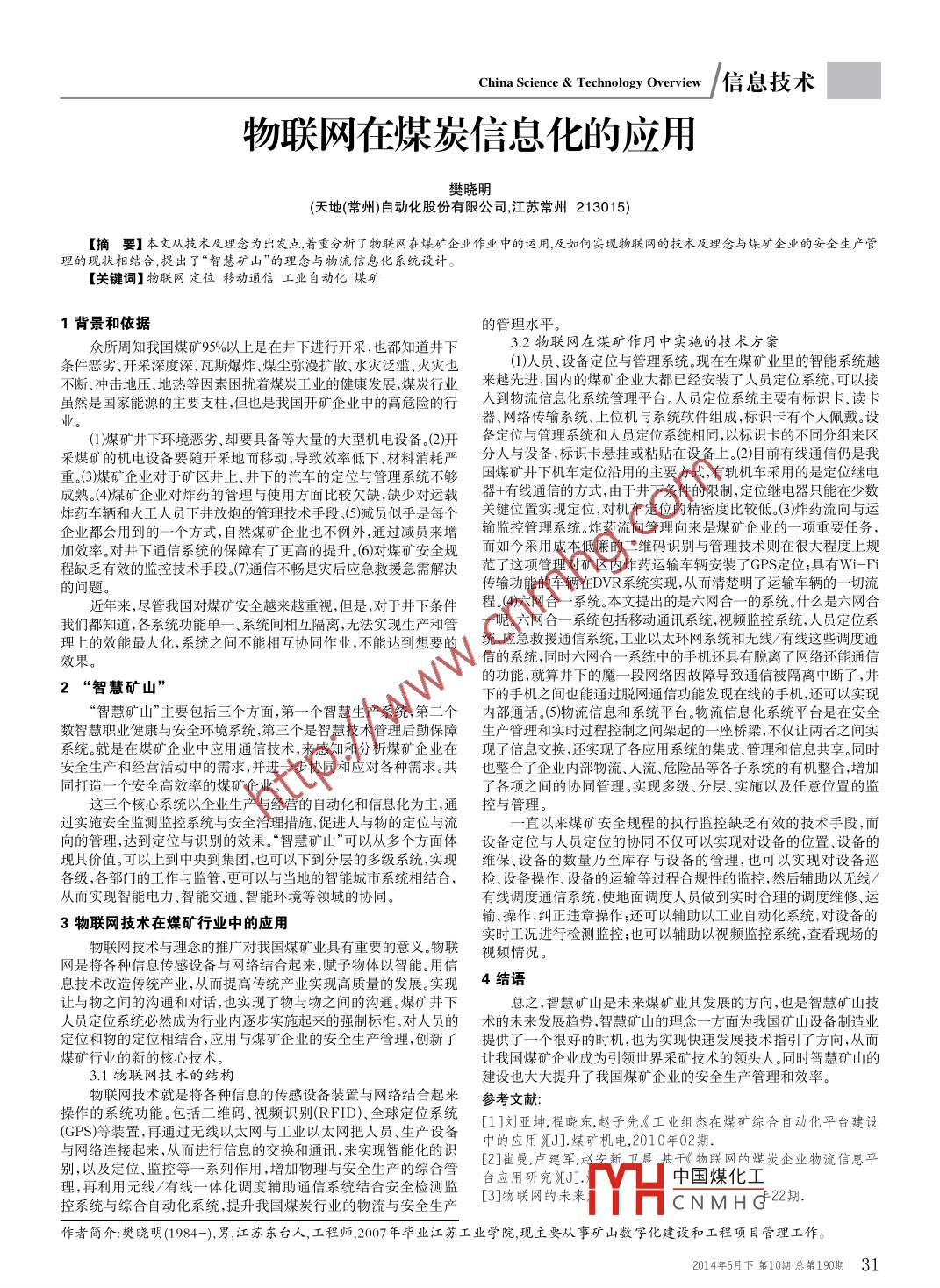 China Science & Technology Overview/信息技術(shù)物聯(lián)網(wǎng)在煤炭信息化的應(yīng)用樊曉明(天地(常州)自動(dòng)化股份有限公司,江蘇常州213015)[摘要]本文從技術(shù)及理念為出發(fā)點(diǎn)著重分析了物聯(lián)網(wǎng)在煤礦企業(yè)作業(yè)中的運(yùn)用,及如何實(shí)現(xiàn)物聯(lián)網(wǎng)的技術(shù)及理念與煤礦企業(yè)的安全生產(chǎn)管理的現(xiàn)狀相結(jié)合,提出了“智慧礦山”的理念與物流信息化系統(tǒng)設(shè)計(jì)。[關(guān)鍵詞]物聯(lián)網(wǎng)定位移動(dòng)通信工業(yè)自動(dòng)化煤礦1背景和依據(jù)的管理水平。眾所周知我國(guó)煤礦95%以上是在井下進(jìn)行開采,也都知道井下3.2物聯(lián)網(wǎng)在煤礦作用中實(shí)施的技術(shù)方案條件惡劣.開采深度深、瓦斯爆炸.煤塵彌漫擴(kuò)散、水災(zāi)泛濫.火災(zāi)也(1)人員、設(shè)備定位與管理系統(tǒng)?,F(xiàn)在在煤礦業(yè)里的智能系統(tǒng)越不斷、沖擊地壓.地?zé)岬纫蛩乩_著煤炭工業(yè)的健康發(fā)展,煤炭行業(yè)來越先進(jìn),國(guó)內(nèi)的煤礦企業(yè)大都已經(jīng)安裝了人員定位系統(tǒng),可以接雖然是國(guó)家能源的主要支柱,但也是我國(guó)開礦企業(yè)中的高危險(xiǎn)的行入到物流信息化系統(tǒng)管理平臺(tái)。人員定位系統(tǒng)主要有標(biāo)識(shí)卡、讀卡器、網(wǎng)絡(luò)傳輸系統(tǒng)、上位機(jī)與系統(tǒng)軟件組成,標(biāo)識(shí)卡有個(gè)人佩戴。設(shè)(1)煤礦井下環(huán)境惡劣、卻要具備等大量的大型機(jī)電設(shè)備。(2)開備定位 與管理系統(tǒng)和人員定位系統(tǒng)相同,以標(biāo)識(shí)卡的不同分組來區(qū)采煤礦的機(jī)電設(shè)備要隨開采地而移動(dòng),導(dǎo)致效率低下、材料消耗嚴(yán)分人與設(shè)備標(biāo)識(shí)卡懸掛或粘貼在設(shè)備上。(2)目前有線通信仍是我重。(3)煤礦企業(yè)對(duì)于礦區(qū)井上、井下的汽車的定位與管理系統(tǒng)不夠國(guó)煤礦井下機(jī)車定位沿用的主要方式,有軌機(jī)車采用的是定位繼電成熟。(4)煤礦企業(yè)對(duì)炸藥的管理與使用方面比較欠缺,缺少對(duì)運(yùn)載器+有線通信的方式,由于井下條件的限制,定位繼電器 只能在少數(shù)炸藥車輛和火工人員下井放炮的管理技術(shù)手段.(5)藏員似乎是每個(gè)關(guān)鍵位 置實(shí)現(xiàn)定位,對(duì)機(jī)車定位的精密度比較低.。3)炸藥流向與運(yùn)企業(yè)都會(huì)用到的一-個(gè)方式,自然煤礦企業(yè)也不例外,通過減員來增輸監(jiān)控管理系統(tǒng)。炸藥流向管理向來是煤礦企業(yè)的一-項(xiàng)重要任務(wù),加效率。對(duì)井下通信系統(tǒng)的保障有了更高的提升(6)對(duì)煤礦安全規(guī)而如今 采用成本低廉的二維碼識(shí)別與管理技術(shù)則在很大程度上規(guī)程缺乏有效的監(jiān)控技術(shù)手段.(7)通信不暢是災(zāi)后應(yīng)急救授急需解決范 了這項(xiàng)管理對(duì)礦區(qū)內(nèi)炸藥運(yùn)輸車輛安裝了GPS定位:具有Wi-Fi的問題傳輸功能的車輛在DVR系統(tǒng)實(shí)現(xiàn),從而清楚明了運(yùn)輸車輛的- -切流近年來,盡管我國(guó)對(duì)煤礦安全越來越重視,但是,對(duì)于井下條件程。(4)六網(wǎng)合- 系統(tǒng)。 本文提出的是六網(wǎng)合- -的系統(tǒng)。什么是六網(wǎng)合我們都知道,各系統(tǒng)功能單一、系統(tǒng)間相互隔離,無法實(shí)現(xiàn)生產(chǎn)和管呢。六網(wǎng)合一系統(tǒng)包括移動(dòng)通訊系統(tǒng),視頻監(jiān)控系統(tǒng),人員定位系理上的效能最大化,系統(tǒng)之間不能相互協(xié)同作業(yè),不能達(dá)到想要的統(tǒng), 應(yīng)急救授通信系統(tǒng),工業(yè)以太環(huán)網(wǎng)系統(tǒng)和無線/有線這些調(diào)度通效果。信的系統(tǒng),同時(shí)六網(wǎng)合一系統(tǒng) 中的手機(jī)還具有脫離了網(wǎng)絡(luò)還能通信的功能,就算井下的魔一段網(wǎng)絡(luò)因故障導(dǎo) 致通信被隔離中斷了,井2“智慧礦山”“智慧礦山”主要包括三個(gè)方面,第一一個(gè)智慧生產(chǎn)系統(tǒng),第二個(gè)下的手機(jī)之間也能通過脫網(wǎng)通信功能發(fā)現(xiàn)在線的手機(jī),還可以實(shí)現(xiàn)內(nèi)部通話。(5)物流信息和系統(tǒng)平臺(tái)。物流信息化系統(tǒng)平臺(tái)是在安全數(shù)智慧職業(yè)健康與安全環(huán)境系統(tǒng),第三個(gè)是智慧技術(shù)管理后勤保障生產(chǎn)管理和實(shí)時(shí)過程控制之間架起的--座橋梁,不僅讓兩者之間實(shí)系統(tǒng)。就是在煤礦企業(yè)中應(yīng)用通信技術(shù),來感知和分析煤礦企業(yè)在現(xiàn)了信息交換,還實(shí)現(xiàn)了各應(yīng)用系統(tǒng)的集成、管理和信息共享。同時(shí)安全生產(chǎn)和經(jīng)營(yíng)活動(dòng)中的需求,并進(jìn)一一步 協(xié)同和應(yīng)對(duì)各種需求。共也整合 了企業(yè)內(nèi)部物流、人流.危險(xiǎn)品等各子系統(tǒng)的有機(jī)整合,增加同打造--個(gè)安全高效率的煤礦企業(yè)。了各項(xiàng)之間的協(xié)同管理。實(shí)現(xiàn)多級(jí)、分層.實(shí)施以及任意位置的監(jiān)這三個(gè)核心系統(tǒng)以企業(yè)生產(chǎn)與經(jīng)營(yíng)的自動(dòng)化和信息化為主,通控與 管理。過實(shí)施安全監(jiān)測(cè)監(jiān)控系統(tǒng)與安全