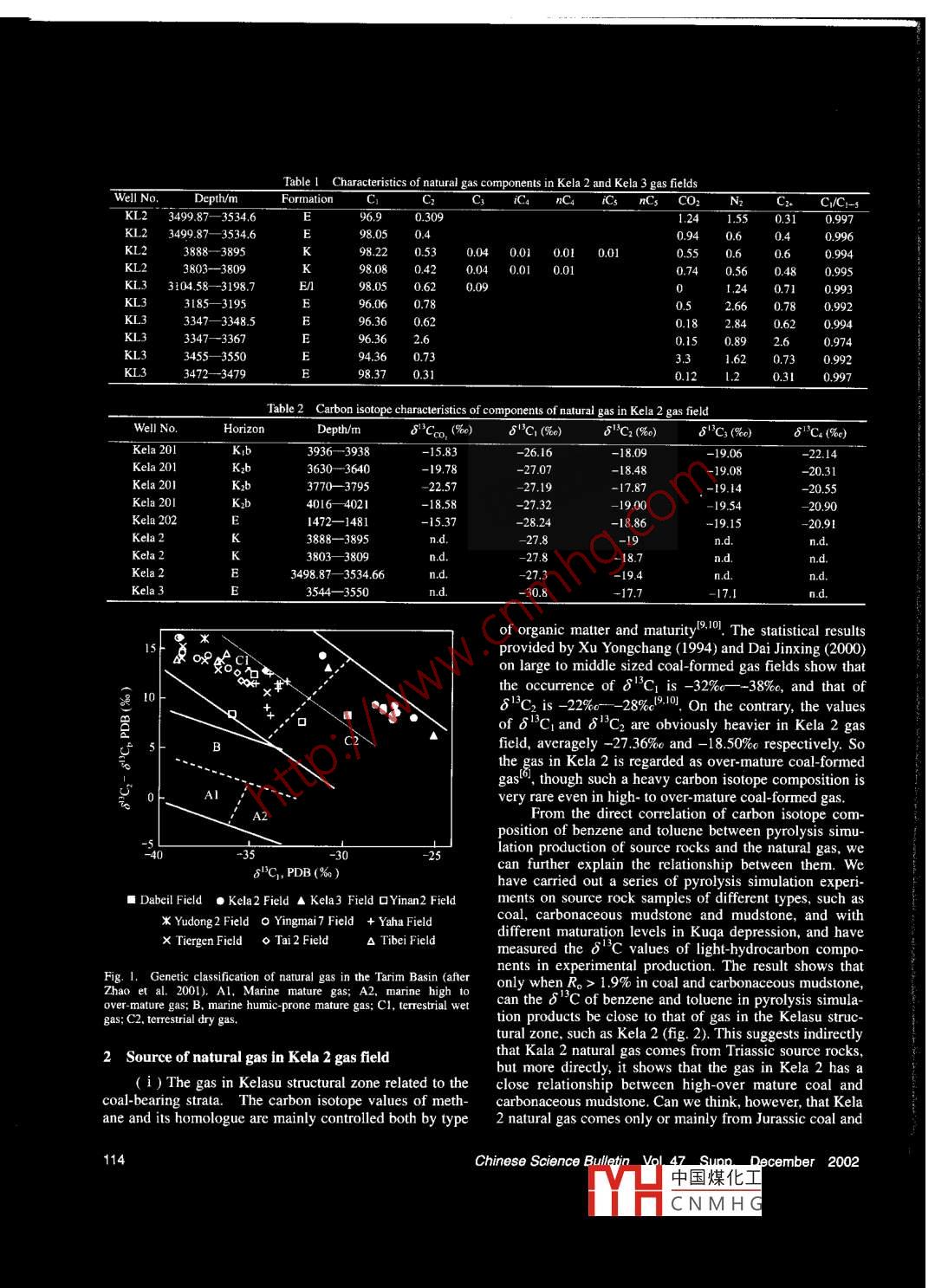 fields, located in the frontal uplit zone and originate fromGeochemical characteristicsthe same source rocksl8!. Gas occurred in the Kelasustructural zone (such as in Kela 2 gas field) is relativelyand formation process ofdry in components and heavier in carbon isotope, but thenatural gas in Kela 2 gas fieldreasonable explanation to which has not been provided sofar. In this paper, by studying geochemical characteristicsZHAO Mengjun,LU Shuangfang,of the gas and source of Kela 2 gas field, we think that theWANG Tingdong & LI Jianabnormal character is related to source rock quality, bu1. Rscarch Lstiture of Perolem Exploraion and Development. Pet more imporantly, it has something to do with theroC hina, Beifing 100083, China;multistage gas pool formation process. We have alsoDaging Petroleum Institute. Anda 15 1400, China;discussed the possibility and process of the twice pool3. Southwest Petroleum Institule, Nanchong 637000,ChinaCorrespondence should be adressed to Zhao Mengjun (e mail: zmj@ formation of Kela 2 gas field.petrochina com.cn)IGeochemical characteristics of natural gas in KelaAbstract On the basis of a large amount of natural gas 2 gas fieldcomponents and the carbon isotope as well as some other( i ) Obviously drier in gas components. Theanalysis data in Kela 2 gas field, the geochemical character-component of natural gas in Kela 2 gas field iistics, source, origin, and formation process of natural gashave been dscussed The components of gas in the feld tend hydrocarbon (able D), and it contains litle non-bydro-to be“dry", and the drying eoffcient is close to 1.0. The carbon, for example, the content of CO2 is 0%- 1.24%,carbon isotope tends to be heavier, for instance, the average N2 is 0.6%- 2.84%; methane is the main componentof 8"C1 is -27.36%o and that of 8"C2 is -18.5%c Compre-among gaseous hydrocarbons, the content of which ishensive analysis shows that humic natural gas in the Kuqa 96.9%- 98.22%, whereas the content of ethane is as lowpetroleum systen comes mainly from Triassic and Jurassicas 0.31%- 0.53%,and there are little hydrocarbonsource rocks, and the contribution of Jurassic source rocks tocomponents heavier than ethane, so the drying coefficientl maybeimore than that of Triassic rocks. The maino poRC,es,, Feoto is close to 1.0. Compared with natural gas occurring incomposition lies in the fact that Kela 2 natural gas is the ac-Yiqikelike structural zone and frontal uplift in Kuqa de-Cumnulation of late production of humic souree Tocks, and it pression, Kela 2 gas tends obviousty to be dryer.is affected by the abnormal high pressure as well. Consider-Most of the gas in Yiqikelike structural zone aning the lhydrocarbon generating and structural history, we frontal uplift in Kuqa depression presents wet gascan regard the gas pool formation processes as twice fllingcharacteristic, for example, in Yinan 2 gas pool, the con-and twice adjusting (destroying),hat is,ne fllingd tent of C is 82.78%- -94.41 %, and averagely 89.03%; thedestroying process in the early Himnalayan movement and thecontent of C2+ is 2.15% -10.02%,on average 6.26%,illing and adjusting in the late Himalayan movement.Condensate gas pools occur in the north front of theKeywords: natural gas geochemlstry, source of natural gas, reservoir north uplift of the Tarim Basin,formation process, Kela 2 gas field.take, Yingmai 7, Yaha, Tiergen, etc., the content of C isKela 2 gas field lies in the west of the beeline anti-66%- 92.38%,averagely 71.8%- 88.31%; that of C2+cline zone of Kuqa depression, Tarim Basin, the south ofis 1.33%- 26.18%,on average 6.78% 17.25%. As forcondensate oil, its content is 31.8一185.6 g/m in Yangwhich is Baicheng sag, and the north is monocline zoneTriassic-Jurassic hydrocarbon source rocks devel-take and Yingmai 7 reservoir, whereas 547.6- 760.3 g/moped in Kuqa depession 5 Some scholars think that the in Yaha and Tiergen reservoir(in) Obviously heavier in carbon isotopecomposi-natural gas comes from Jurassic coal bearing source rockstion. Except for some gas in the Kelasu structural zoneaccording to the components and carbon isotope charac-teristics, and it is typical coal-derived ga[26]. kbut moreof Kuqa depression, 8"C1 value of the gas in condensate一39%,, and 8'C2 is -22%o I 25%oinvestigators think that the natural gas is related to both gas pooTriassic and Jurassic rockslL37.8, and the contribution t(fig. 1), which represents the typical humic gas character.the gas pool of Jurassie rocks is more than that of TriassicThe 8"C and 8'C2 values in Kela 2 gas field are obvi-rocks'8!. Gas in the Kelasu structural zone also comesously more positive, 8"C1 is -27.3%o- 31.1%o, andmainly from Triassic Jurassic source rocks, but it is quite8'C2 is -16.8%0- -19.4%00 (table 2), the difference be-different from that in Yangtake, Yaha, Yingmai 7th gastween 8"C2 and δ°C is as highas 7.9- 14.3.Chinese Science Bulltin Vol. 47 Supp. December 2002113中國(guó)煤化工MHCNMHGTable 1 Characteristics of natural gas components in Kela 2 and Kela 3 gas fieldsWell No.Depth/mFormation C1CC3iC4售nC4iCsnCsCO2C2+C/C-KL2 3499.87- 3534.696.90.3091.24 1.55 0.31 0.997KL2 3499.87 3534.698.05 0.40.94 0.60.40.996KL23888 389598.22 0.53 0.04 0.01 0.01 0.010.55 0.6.60.9943803- -380998.08 0.42 0.04 0.01 0.014 0.56KL33104.58 -3198.70.091.240.9933185- 319596.06 0.780.5 2.66 0.78 0.9923347- 3348.596.36 0.620.18 2.840.62 0.9943347- -336796.36 2.60.15 0.892.60.9743455- -35594.360.733.3 1.620.9923472- -347998.370.310.12 1.20.997Table2 Carbon isotope characteristics of components of natural gas in Kela 2 gas fieldHorizonDepth/n8"Cco, (%8'C (%e)8'C2 (%o)8'C; (%o)8'Cs (%c)Kela 201Kb3936- 3938-15.83-26.16-19.06-2214K2b3630 -3640-27.07-18.48-19.08- 20.313770- 3795-22.57-27.19-17.87-19.14- 20.55K,b4016- 4021-18.58-27.3219.00-19.5420.90Kela 2021472-1481-15.3728.24-18.86-19.1520.91Kela 2n.d.-27.-193803- 38027 8-1873498.87-3534.66-27一19.4n.d,3544 3550n.一30.8-17.717.1of organic matter and maturity9.10. The statistical