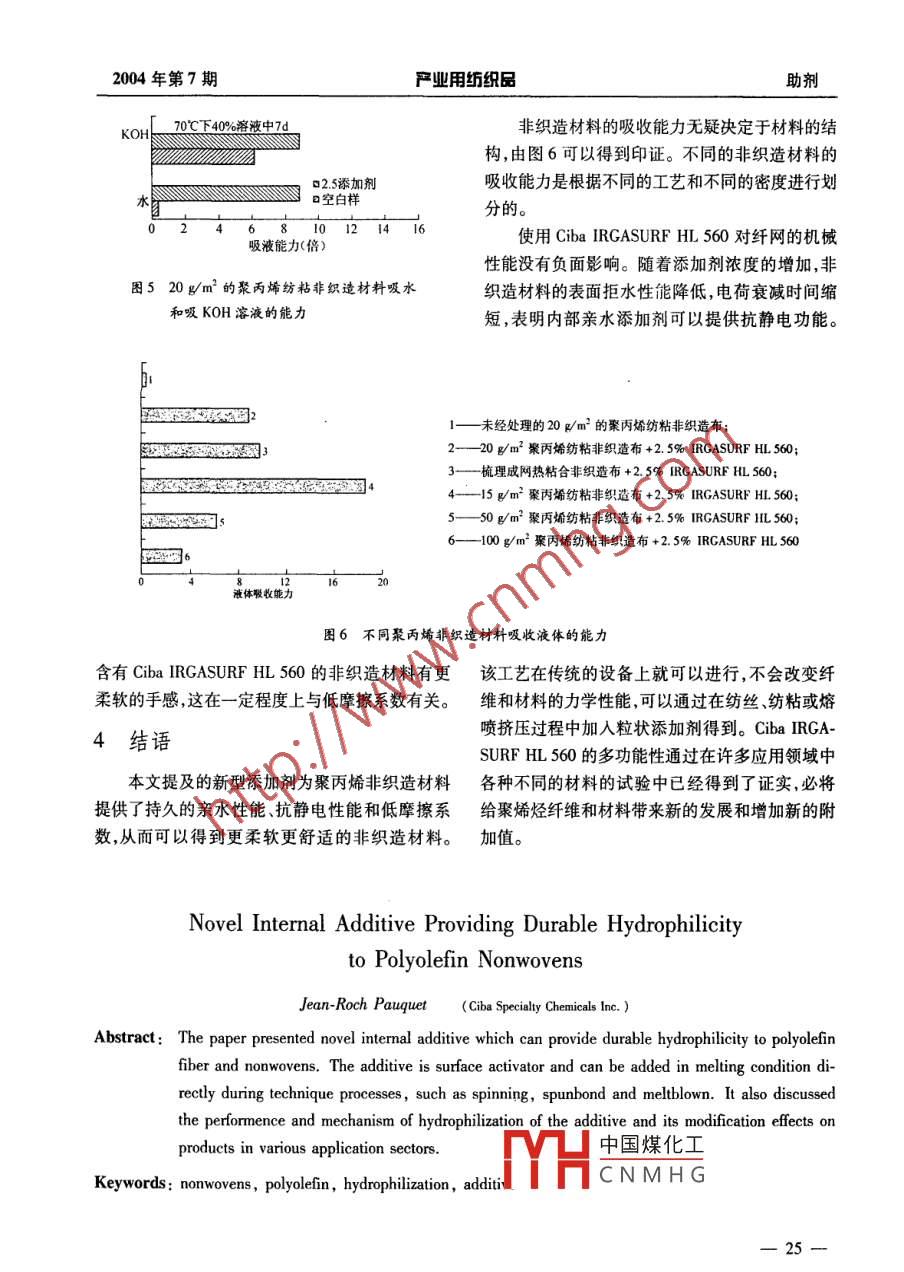 助劑嚴(yán)業(yè)用紡織品總第166期為聚烯烴非織造材料提供永久親水性的新型內(nèi)部添加劑Jean- Roch Paquet(汽巴精化有限公司,瑞士)摘要:介紹了一種為聚烯烴纖維和非織造材料提供永久親水性的新型添加劑,該添加劑是一種表面活性劑,在紡絲、紡粘或嫆噴過(guò)程中直接以熔融狀態(tài)加入。闡述了該添加劑的特性、親水改性機(jī)理以及對(duì)不同應(yīng)用領(lǐng)域中產(chǎn)品的改性效果關(guān)鍵詞:非織造材料,聚烯烴,親水改性,添加劑中圖分類號(hào):TS176;TQ314.246文獻(xiàn)標(biāo)識(shí)碼:A文章編號(hào):1004-7093(2004)07-0022-04聚烯烴特別是聚丙烯(P)已經(jīng)被廣泛地用經(jīng)過(guò)洗滌或機(jī)械摩擦很容易剝落于制造非織造材料,如用梳理成網(wǎng)、紡粘熔噴或種替代并改進(jìn)的方法就是直接在聚烯烴中復(fù)合等方法制成的材料,可以應(yīng)用在很多領(lǐng)域,包施加熔融的表面活性劑,該化合物可以移動(dòng)到表括醫(yī)衛(wèi)用品、吸收劑、揩布、過(guò)濾器和蓄電池隔板面以提供親水性等。但是聚烯烴具有疏水性,在上述應(yīng)用領(lǐng)域中Ciba IRGASURF HL560是一種用于聚烯烴疏水的性質(zhì)或者限制了其使用,或者要求對(duì)由聚纖維和非織造材料的新型親水內(nèi)部添加劑,不含烯烴制成的材料進(jìn)行表面改性。硅,能為聚烯烴制品提供持久的親水性。該物質(zhì)本項(xiàng)研究要求在不改變聚丙烯纖維和非織造呈粒狀,在纖維紡絲、紡粘或熔噴擠壓過(guò)程中添材料的整體性質(zhì)的前提下,通過(guò)表面改性以獲得加。使用親水添加劑簡(jiǎn)化了非織造材料生產(chǎn)線,永久的親水性和抗靜電性,特別是經(jīng)改性后的非不再需要接觸羅拉或噴灑器和干燥器??椩觳牧暇哂械陀?s的滲透時(shí)間,該滲透時(shí)間可作為內(nèi)部添加劑使用的表面活性分子物質(zhì)足夠支持10次以上滲透;非織造纖網(wǎng)同時(shí)具有高應(yīng)該滿足一些特殊的要求,至少在纖維工業(yè)生產(chǎn)吸水性和表面抗靜電性;添加劑還可改善非織造的溫度條件下,要保持熱穩(wěn)定性(不發(fā)生熱分材料的柔軟性使其具有更好的手感。新型的表面解);相對(duì)分子質(zhì)量應(yīng)該足夠高以防止生產(chǎn)過(guò)程改性劑呈熔融狀態(tài),能給聚烯烴纖維及其制品帶中的揮發(fā)損失,同時(shí)又要足夠低以使其能盡快轉(zhuǎn)來(lái)新的附加值。移到聚烯烴纖維的表面。非離子型表面活性劑是聚烯烴表面活性添加劑的一個(gè)重要分支。低相對(duì)添加劑性能分子質(zhì)量的低聚物的典型特征是其結(jié)構(gòu)系由一個(gè)長(zhǎng)長(zhǎng)的疏水尾端和一個(gè)親水頭端組成。親水頭端通過(guò)在后整理工序中添加親水膜以得到改性基本上不與聚烯烴結(jié)構(gòu)相容,并且有轉(zhuǎn)移到表面聚烯烴已經(jīng)廣為流傳如在非織造材料上或噴灑的趨勢(shì)(圖1)。長(zhǎng)的疏水鏈會(huì)固定住聚合物結(jié)構(gòu)或?qū)訅阂粚颖”〉挠H水性表面活性劑。根據(jù)市場(chǎng)中的分子,從而防止親水基團(tuán)從表面丟失。添加的需要現(xiàn)在可以通過(guò)后整理得到各種不同的性劑通能但是纖維的后整理并不具有持久性如親水膜擴(kuò)散。中國(guó)煤化工婿烴結(jié)構(gòu)中形從靚 LACNMHG被擠壓成無(wú)定收稿日期:2003-05-08要想在纖維表面得到理想的永久親水性的關(guān)22一2004年第7期嚴(yán)業(yè)用紡織E助劑鍵是在相對(duì)分子質(zhì)量和親水頭端和疏水尾端的比 IRGASURF HL560在10h、1d和5d得到3s滲例之間尋求最佳的平衡。 Ciba IRGASURF HL透時(shí)間的濃度分別為3.3%、2.5%和2.0%。560就是這樣一個(gè)優(yōu)化結(jié)果,可以為聚烯烴非織造材料提供很好的性能和杰出的持久性。3.5%≈求代(酸202230-354246(a)添加劑在聚合物熔融體中分散良好老化期(b)(b)冷卻時(shí)添加劑分離趨向表面圖 Ciba IRGASURF HL560在聚烯烴中的特征圖2添加劑濃度與滲透時(shí)間述結(jié)果清楚地顯示 Ciba IRGASURF HL2吸收產(chǎn)品市場(chǎng)特性560是一種可游移的添加劑,滲透時(shí)間取決于聚丙烯材料上添加劑的濃度。應(yīng)該指出,幾天后隨在個(gè)人護(hù)理領(lǐng)域中吸收性產(chǎn)品的市場(chǎng)包括嬰著添加劑濃度的降低可以得到合適的低滲透時(shí)兒尿片、衛(wèi)生用紙以及成人失禁產(chǎn)品。通過(guò)射流間。為了達(dá)到質(zhì)量控制的目的,可以使用一個(gè)強(qiáng)噴網(wǎng)、梳理成網(wǎng)或熱粘合得到的聚烯烴纖網(wǎng)是尿制性的滲透方法以加速滲透。用這個(gè)方法可以在片的首選材料。聚丙烯體積質(zhì)量輕,與其他聚合生產(chǎn)后馬上進(jìn)行測(cè)量。物相比價(jià)格低,但是需要進(jìn)行親水處理才能得到多重滲透檢驗(yàn)用來(lái)評(píng)估聚烯烴非織造材料親合適的性能。保健市場(chǎng)對(duì)非織造工業(yè)有很大的影水處理的持久性。這個(gè)方法中同樣的試樣在堿液響,一是市場(chǎng)份額的影響;另一是產(chǎn)品更新?lián)Q代速中重復(fù)多次測(cè)量。試樣允許在兩次測(cè)量中間干燥度的影響。為檢驗(yàn)非織造材料對(duì)特定用途的適用1h。圖3比較了兩種濃度的 Ciba IRGaSURF HL性需要特定的檢測(cè)方法。滲透時(shí)間和多重滲透檢560多重處理過(guò)的非織造材料和一種用工業(yè)化生測(cè)是典型