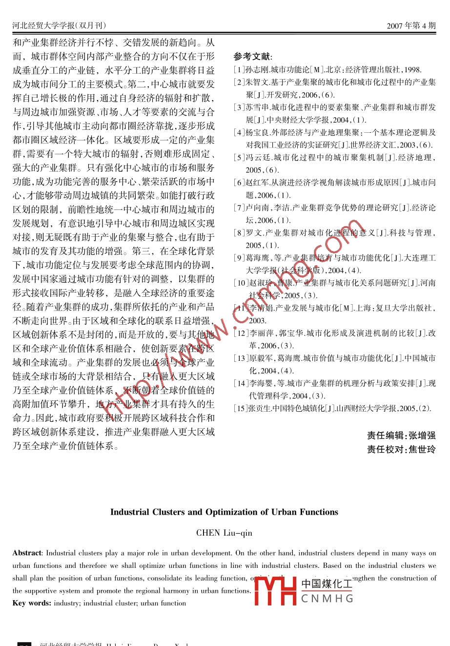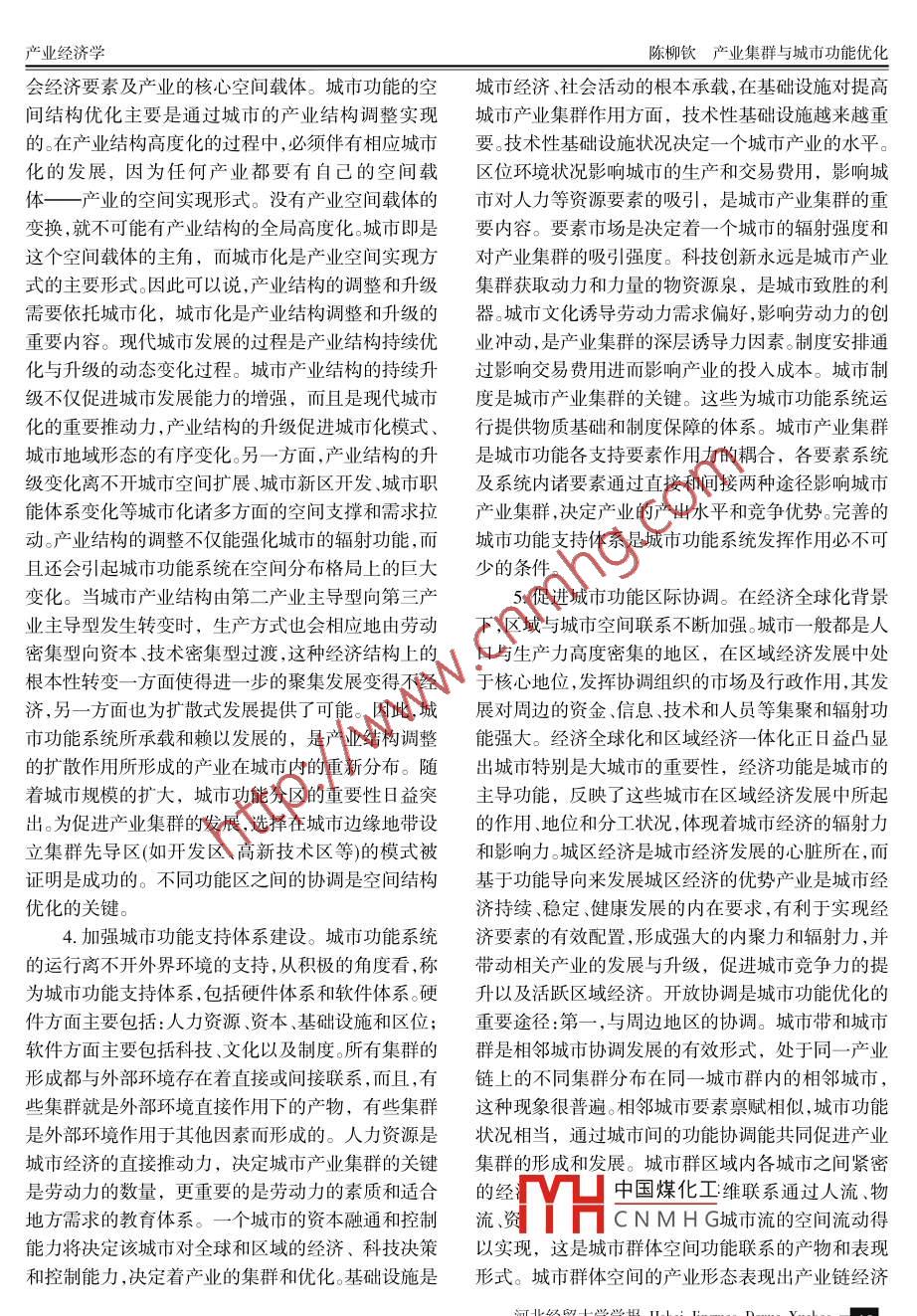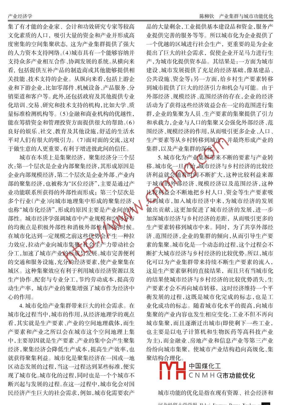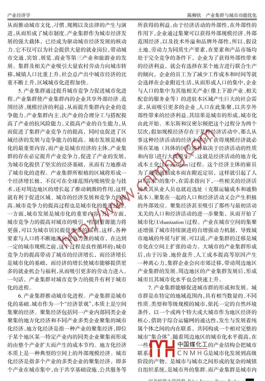 2007年7月河北經(jīng)貿(mào)大學(xué)學(xué)報(bào)Jul.2007第28卷第4期Journal of Hebei University of Economics and TradeVol. 28 No.4O產(chǎn)業(yè)經(jīng)濟(jì)學(xué)產(chǎn)業(yè)集群與城市功能優(yōu)化陳柳欽(天津社會(huì)科學(xué)院城市經(jīng)濟(jì)研究所,天津300191)摘要:產(chǎn)業(yè)集群在城市發(fā)展中發(fā)揮著非常重要的作用,產(chǎn)業(yè)集群對(duì)城市功能亦存在諸多依賴(lài),因此,以產(chǎn)業(yè)集群為導(dǎo)向來(lái)優(yōu)化城市功能,我們要以城市產(chǎn)業(yè)集群為基礎(chǔ)規(guī)劃城市功能定位,強(qiáng)化城市主導(dǎo)功能,優(yōu)化城市功能空間結(jié)構(gòu),加強(qiáng)城市功能支持體系建設(shè),并促進(jìn)城市功能區(qū)際協(xié)調(diào)。關(guān)鍵詞:產(chǎn)業(yè);產(chǎn)業(yè)集群;城市功能中圖分類(lèi)號(hào):F291文獻(xiàn)標(biāo)識(shí)碼:A文章編號(hào): 1007-2101(2007)04- -0043- 08的競(jìng)爭(zhēng)力是非集群和集群外企業(yè)所無(wú)法擁有的。也一、產(chǎn)業(yè)集群在城市發(fā)展中的功能分析.就是說(shuō),在其他條件相同的情況下,集群將比非集群更具有競(jìng)爭(zhēng)力:集群加劇了競(jìng)爭(zhēng),競(jìng)爭(zhēng)是產(chǎn)業(yè)獲得核產(chǎn)業(yè)集群是指集中于一定區(qū)域內(nèi)特定產(chǎn)業(yè)的眾心競(jìng)爭(zhēng)力的重要?jiǎng)恿?。?jìng)爭(zhēng)不僅僅表現(xiàn)在對(duì)市場(chǎng)的多具有分工合作關(guān)系的不同規(guī)模等級(jí)的企業(yè)和與其爭(zhēng)奪,還表現(xiàn)在合作上。產(chǎn)業(yè)集群的最重要特點(diǎn)之發(fā)展有關(guān)的各種機(jī)構(gòu)、組織等行為主體通過(guò)縱橫交一,就是它的地理集中性,即大量的相關(guān)產(chǎn)業(yè)相互集錯(cuò)的網(wǎng)絡(luò)關(guān)系緊密聯(lián)系在一起的空間集聚體,代表中在特定的地域范圍內(nèi)。由于地理位置接近,產(chǎn)業(yè)集著介于市場(chǎng)和等級(jí)制之間的一-種新的空間經(jīng)濟(jì)組織群內(nèi)部的競(jìng)爭(zhēng)自強(qiáng)化機(jī)制將在集群內(nèi)形成“優(yōu)勝劣形式。產(chǎn)業(yè)集群作為一種為創(chuàng)造競(jìng)爭(zhēng)優(yōu)勢(shì)而形成的汰”的自然選擇機(jī)制,刺激企業(yè)創(chuàng)新和企業(yè)衍生。在產(chǎn)業(yè)空間組織形式,它具有的群體競(jìng)爭(zhēng)優(yōu)勢(shì)和集聚產(chǎn)業(yè)集群內(nèi),大量企業(yè)相互集中在一起,既展開(kāi)激烈發(fā)展的規(guī)模效益是其他形式無(wú)法比擬的。的市場(chǎng)競(jìng)爭(zhēng),又進(jìn)行多種形式的合作。如聯(lián)合開(kāi)發(fā)新1.產(chǎn)業(yè)集群能提高城市產(chǎn)業(yè)的整體競(jìng)爭(zhēng)能力。產(chǎn)品,開(kāi)拓新市場(chǎng),建立生產(chǎn)供應(yīng)鏈,由此形成-種產(chǎn)業(yè)集群的本質(zhì)是企業(yè)在地緣基礎(chǔ)上相互交流、競(jìng)既有競(jìng)爭(zhēng)又有合作的合作競(jìng)爭(zhēng)機(jī)制。這種合作機(jī)制爭(zhēng)與合作的-種新的產(chǎn)業(yè)組織形式。與分散的產(chǎn)業(yè)的根本特征是互動(dòng)互助、集體行動(dòng)。通過(guò)這種合作方組織形式相比,集群的最大優(yōu)勢(shì)是發(fā)揮內(nèi)部企業(yè)的式,中小企業(yè)可以在培訓(xùn)金融、技術(shù)開(kāi)發(fā)、產(chǎn)品設(shè)聚集效應(yīng)、共生效應(yīng)、協(xié)同效應(yīng)、區(qū)位效應(yīng),使集群內(nèi)計(jì)、市場(chǎng)營(yíng)銷(xiāo)、出口、分配等方面,實(shí)現(xiàn)高效的網(wǎng)絡(luò)化的企業(yè)具有較強(qiáng)的競(jìng)爭(zhēng)優(yōu)勢(shì),產(chǎn)業(yè)競(jìng)爭(zhēng)力增強(qiáng)。一-般的互動(dòng)和合作,以克服其內(nèi)部規(guī)模經(jīng)濟(jì)的劣勢(shì),從而說(shuō)來(lái),當(dāng)產(chǎn)業(yè)集群形成后,將可以通過(guò)多種途徑,如能夠與比自己強(qiáng)大的競(jìng)爭(zhēng)對(duì)手相抗衡。在產(chǎn)業(yè)集群降低成本刺激創(chuàng)新、提高效率、加劇競(jìng)爭(zhēng)等,提升整內(nèi)部,許多單個(gè)的、與大企業(yè)相比毫無(wú)競(jìng)爭(zhēng)力的小企個(gè)區(qū)域的競(jìng)爭(zhēng)能力,并形成一種集群競(jìng)爭(zhēng)力。這種新業(yè)一旦用發(fā)達(dá)的區(qū)域網(wǎng)絡(luò)聯(lián)系起來(lái),其表現(xiàn)出來(lái)的收稿日期:2007-04 -25基金項(xiàng)目:國(guó)家軟科學(xué)研究計(jì)劃項(xiàng)目《東北老工業(yè)基地技術(shù)創(chuàng)新體系實(shí)中國(guó)煤化工,;、國(guó)家社科基金項(xiàng)目《集群視角下的創(chuàng)新網(wǎng)絡(luò)與區(qū)域國(guó)際競(jìng)爭(zhēng)力研究》和國(guó)家自然科學(xué):YHC N M H G企業(yè)技術(shù)創(chuàng)新集群行為研究》的階段性成果作者簡(jiǎn)介:陳柳欽( 1969- ), 男,湖南邵東人,天津社會(huì)科學(xué)院城市經(jīng)濟(jì)研究所教授,研究方向:產(chǎn)業(yè)經(jīng)濟(jì)、城市經(jīng)濟(jì).河北經(jīng)貿(mào)大學(xué)學(xué)報(bào)Hebei Jingmao Daxue Xuebao| 43河北經(jīng)貿(mào)大學(xué)學(xué)報(bào)(雙月刊)2007年第4期競(jìng)爭(zhēng)能力就不再是單個(gè)企業(yè)的競(jìng)爭(zhēng)力,而是- -種比運(yùn)用效率。隨著產(chǎn)業(yè)集群的成功,集群所依托的產(chǎn)業(yè)所有單個(gè)企業(yè)競(jìng)爭(zhēng)力簡(jiǎn)單疊加起來(lái)