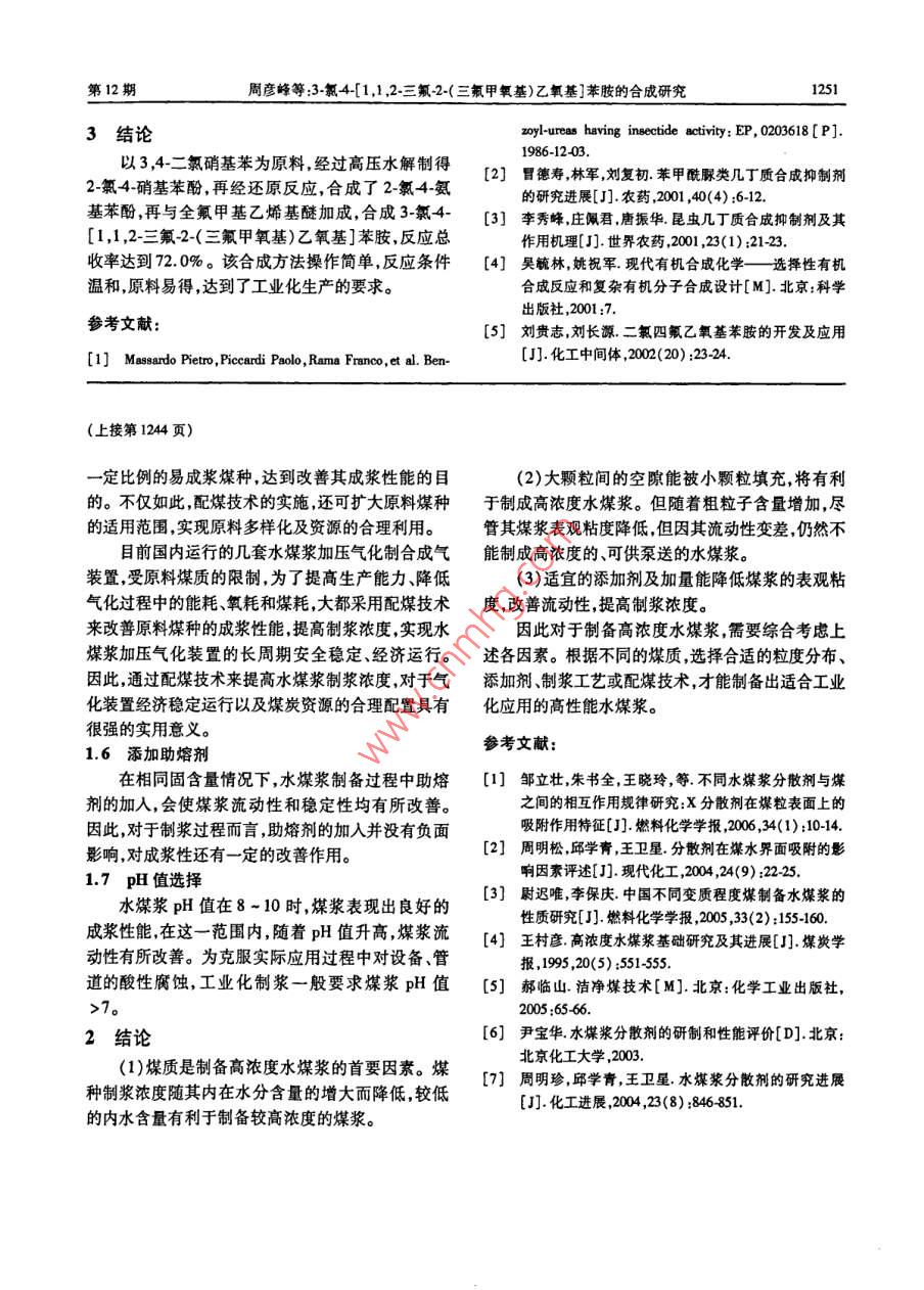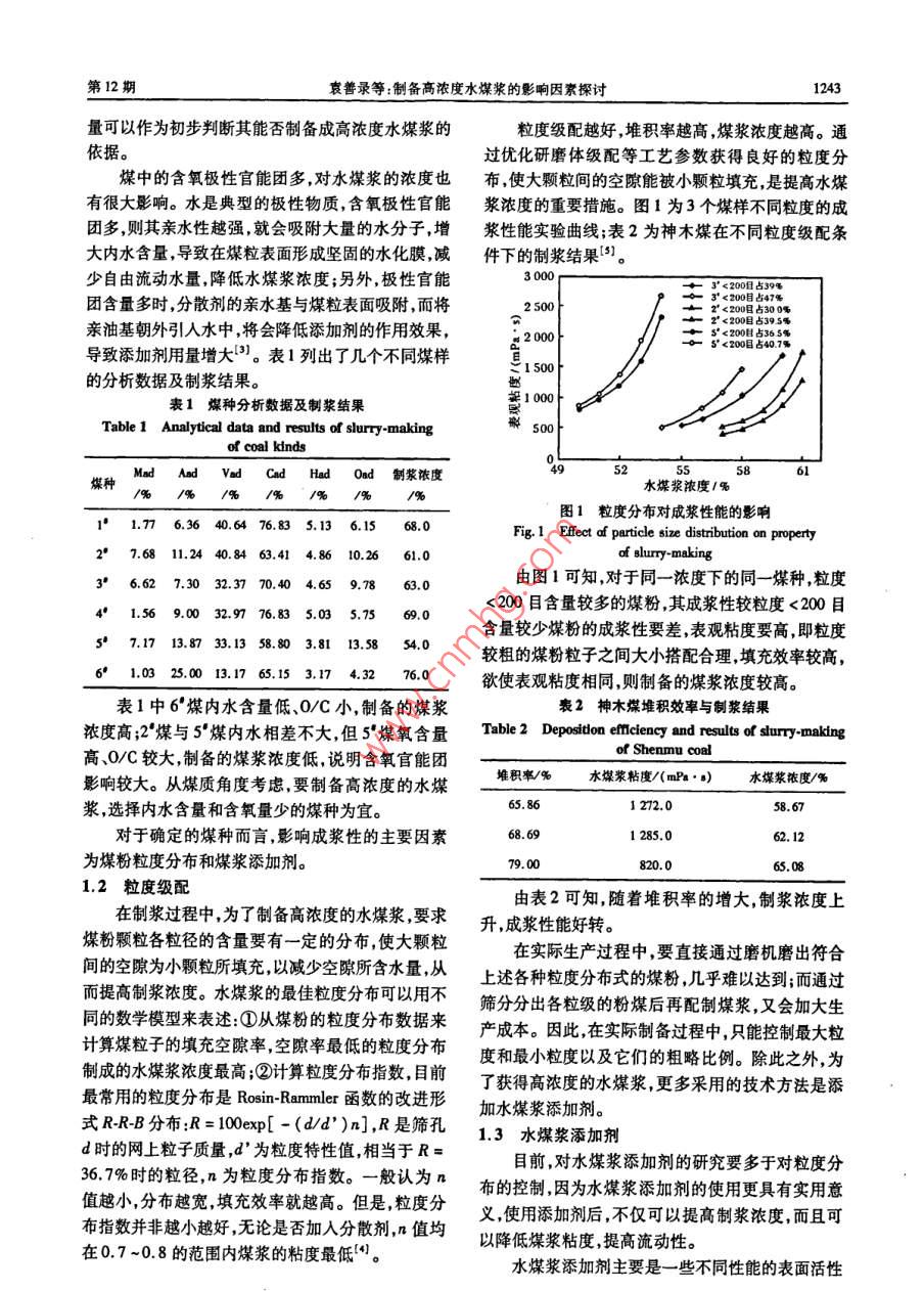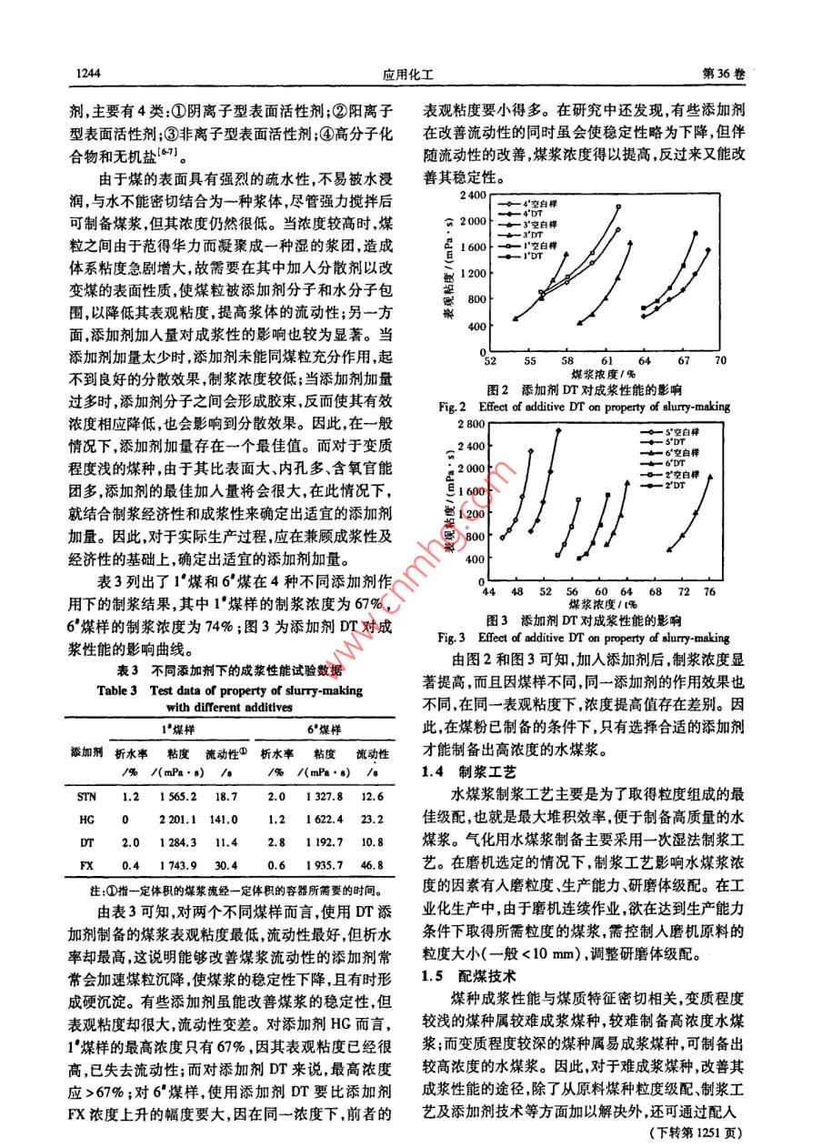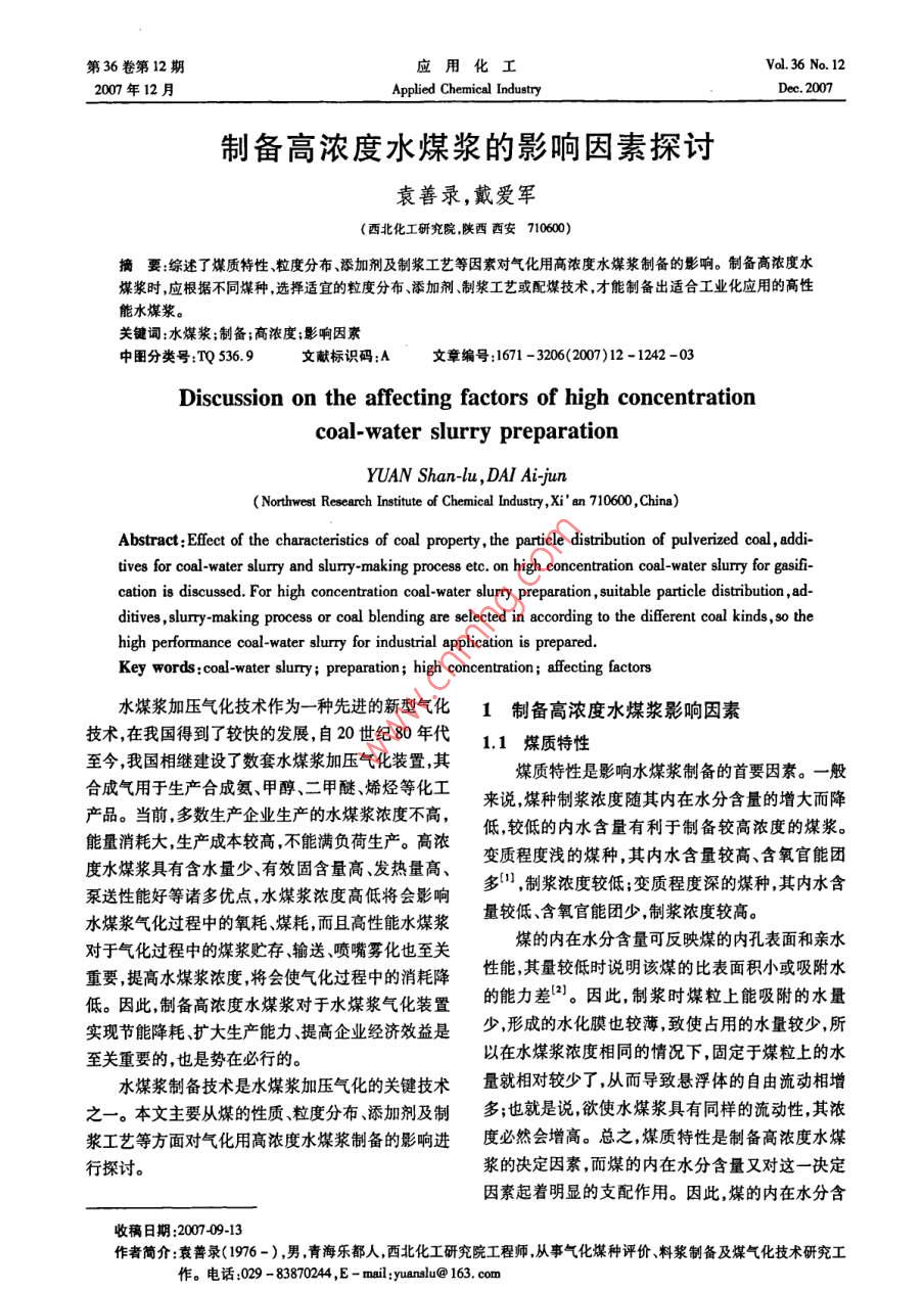 第36卷第12期應(yīng)用化工vl.36No.12200年12月Applied Chemical IndustDe.2007制備高濃度水煤漿的影響因素探討袁善錄,戴愛軍(西北化工研究院陜西西安710600)摘要綜述了煤質(zhì)特性粒度分布、添加劑及制漿工藝等因素對氣化用高濃度水煤漿制備的影響。制備高濃度水煤漿時,應(yīng)根據(jù)不同煤種選擇適宜的粒度分布、添加劑制漿工藝或配煤技術(shù)才能制備出適合工業(yè)化應(yīng)用的高性能水煤漿。關(guān)鍵詞:水煤漿;制備;高濃度;影響因素中圖分類號:TQ5369文獻標識碼:A文章編號:1671-3206(2007)12-1242-03Discussion on the affecting factors of high concentrationcoal-water slurry preparationYUAN Shan-lu, DAI Ai-junNorthwest Research Institute of Chemical Industry, Xi'an 710600, China)Abstract: Effect of the characteristics of coal property, the particle distribution of pulverized coal, addi-tives for coal-water slurry and slurry-making process etc. on high concentration coal-water slurry for gasification is discussed. For high concentration coal-water slurry preparation, suitable particle distribution, additives, slurry-making process or coal blending are selected in according to the different coal kinds, so thehigh performance coal-water slurry for industrial application is preparedKey words: coal-water slurry i preparation; high concentration; affecting factors水煤漿加壓氣化技術(shù)作為一種先進的新型氣化1制備高濃度水煤漿影響因素技術(shù)在我國得到了較快的發(fā)展自0世紀80年代1.1煤質(zhì)特性至今,我國相繼建設(shè)了數(shù)套水煤漿加壓氣化裝置,其煤質(zhì)特性是影響水煤漿制備的首要因素。一般合成氣用于生產(chǎn)合成氨、甲醇、二甲醚、烯烴等化工來說煤種制漿濃度隨其內(nèi)在水分含量的增大而降產(chǎn)品。當前,多數(shù)生產(chǎn)企業(yè)生產(chǎn)的水煤漿濃度不高,能量消耗大生產(chǎn)成本較高不能滿負荷生產(chǎn)。高濃坻,較低的內(nèi)水含量有利于制備較高濃度的煤漿。度水煤漿具有含水量少、有效固含量高、發(fā)熱量高變質(zhì)程度淺的煤種,其內(nèi)水含量較高、含氧官能團泵送性能好等諸多優(yōu)點,水煤漿濃度高低將會影響多y,制漿濃度較低;變質(zhì)程度深的煤種,其內(nèi)水含水煤漿氣化過程中的氧耗煤耗,而且高性能水煤漿量較低、含氧官能團少,制漿濃度較高。對于氣化過程中的煤漿貯存、輸送、噴嘴霧化也至關(guān)煤的內(nèi)在水分含量可反映煤的內(nèi)孔表面和親水重要,提高水煤漿濃度,將會使氣化過程中的消耗降性能,其量較低時說明該媒的比表面積小或吸附水低。因此,制備高濃度水煤漿對于水煤漿氣化裝置的能力差。因此,制漿時煤粒上能吸附的水量實現(xiàn)節(jié)能降耗、擴大生產(chǎn)能力提高企業(yè)經(jīng)濟效益是少,形成的水化膜也較薄,致使占用的水量較少,所至關(guān)重要的,也是勢在必行的。以在水煤漿濃度相同的情況下,固定于煤粒上的水水煤漿制備技術(shù)是水煤漿加壓氣化的關(guān)鍵技術(shù)量就相對較少了,從而導致懸浮體的自由流動相增之一。本文主要從煤的性質(zhì)粒度分布、添加劑及制多;也就是說欲使水煤漿具有同樣的流動性,其濃漿工藝等方面對氣化用高濃度水煤漿制備的影響進度必然會增高??傊嘿|(zhì)特性是制備高濃度水煤行探討。漿的決定因素,而煤的內(nèi)在水分含量又對這一決定因素起著明顯的支配作用。因此,煤的內(nèi)在水分含收稿日期:2007-09-13作者簡介:袁善錄(1906-)男青海樂都人,西北化工研究院工程師從事氣化煤種評價、料漿制備及煤氣化技術(shù)研究工作。電話:029-83870244,E-mail:yuansu@163.com12袁善錄等:制備高濃度水煤漿的影響因素探討量可以作為初步判斷其能否制備成高濃度水煤漿的粒度級配越好,堆積率越髙,煤漿濃度越高。通依據(jù)。過優(yōu)化研磨體級配等工藝參數(shù)獲得良好的粒度分煤中的含氧極性官能團多,對水煤漿的濃度也布,使大顆粒間的空隙能被小顆粒填充,是提高水煤有很大影響。水是典型的極性物質(zhì)含氧極性官能漿濃度的重要措施。圖1為3個煤樣不同粒度的成團多則其親水性越強就會吸附大量的水分子,增漿性能實驗曲線;表2為神木煤在不同粒度級配條大內(nèi)水含量,導致在煤粒表面形成堅固的水化膜減件下的制漿結(jié)果少自由流動水量降低水煤漿濃度;另外,極性官能200占39等團含量多時,分散劑的親水基與煤粒表面吸附,而將親油基朝外引人水中,將會降低添加劑的作用效果2000導致添加劑用量增大3。表1列出了幾個不同煤樣的分析數(shù)據(jù)及制漿結(jié)果1500表1煤種分析數(shù)據(jù)及制漿結(jié)果Table 1 Analytical data and results of slurry-makingof coal kinds煤種 Mad Aad vad Cad HadOad制漿濃度席%蕩%%偉%%水煤漿濃度/%圖1粒度分布對成漿性能的影響63640.6476.835.136.1568.0Fig. 1 Effect of particle size distribution on property2°1.6811.2440.8463.4148610.2661.0of slurry-making6627.3032.3770.404.659.7863.0由圖1可知對于同一濃度下的同一煤種粒度4°1.569.0032976.835.035.7569.0<200目含量較多的煤粉,其成漿性較粒度<200目含量較少煤粉的成漿性要差,表觀粘度要高,即粒度57.1713.8331358.803.8113.5854.0較粗的煤粉粒子之間大小搭配合理填充效率較高6”1.0325.0013.176.153.174.3216.0欲使表觀粘度相同,則制備的煤漿濃度較高表1中6煤內(nèi)水含量低、O/C小,制備的煤漿表2神木煤堆積效率與制漿結(jié)果濃度高;2煤與5煤內(nèi)水相差
