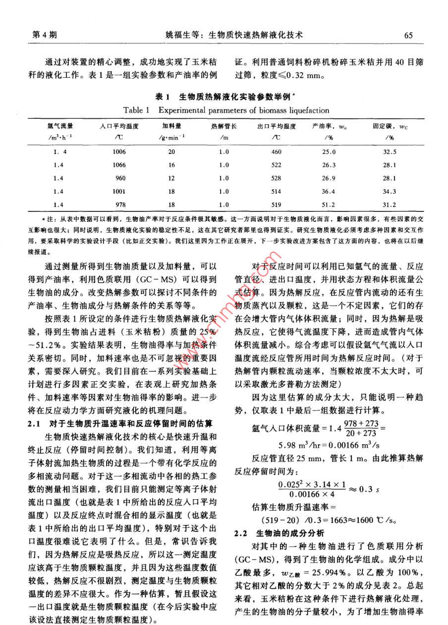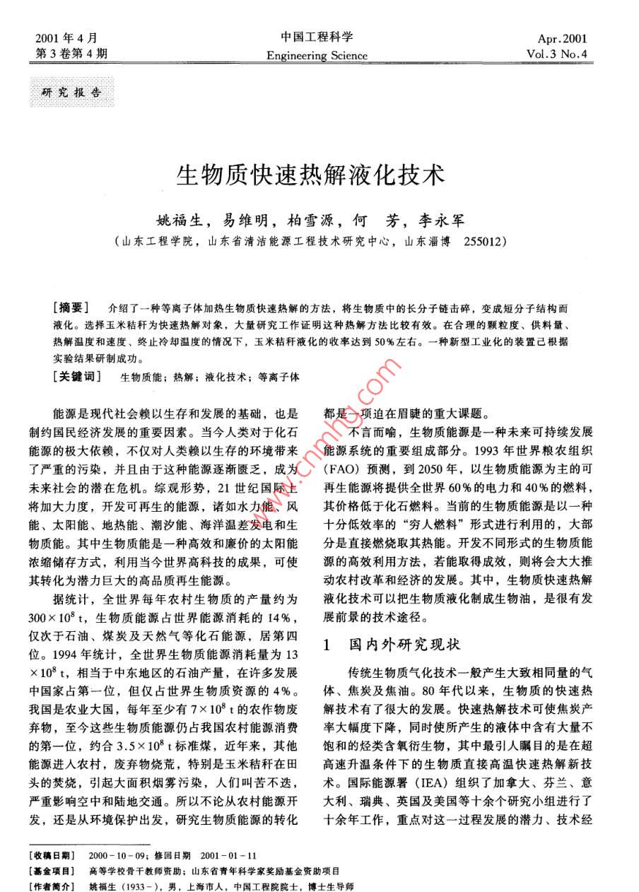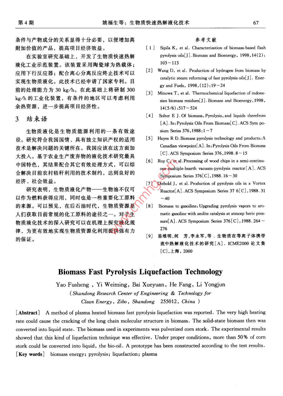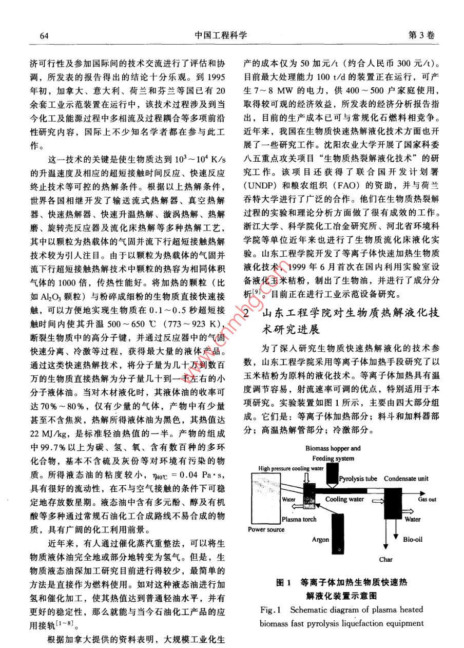 2001年4月中國工程科學Apr.2001第3卷第4Vol. 3 No4研究報告生物質(zhì)快速熱解液化技術(shù)姚福生,易維明,柏雪源,何芳,李永軍(山東工程學院,山東省清潔能源工程技術(shù)研究中心,山東淄博255012)[摘要]介紹了一種等離子體加熱生物質(zhì)快速熱解的方法,將生物質(zhì)中的長分子鏈擊碎,變成短分子結(jié)構(gòu)而液化。選擇玉米秸稈為快速熱解對象,大量研究工作證明這種熱解方法比較有效。在合理的顆粒度、供料量熱解溫度和速度、終止冷卻溫度的情況下,玉米秸稈液化的收率達到50%左右。一種新型工業(yè)化的裝置己根據(jù)實驗結(jié)果研制成功。[關(guān)鍵詞]生物質(zhì)能;熱解;液化技術(shù);等離子體能源是現(xiàn)代社會賴以生存和發(fā)展的基礎(chǔ),也是都是一項迫在眉睫的重大課題。制約國民經(jīng)濟發(fā)展的重要因素。當今人類對于化石不言而喻,生物質(zhì)能源是一種未來可持續(xù)發(fā)展能源的極大依賴,不僅對人類賴以生存的環(huán)境帶來能源系統(tǒng)的重要組成部分。1993年世界糧農(nóng)組織了嚴重的污染,并且由于這種能源逐漸匱乏,成為(FAO)預(yù)測,到2050年,以生物質(zhì)能源為主的可未來社會的潛在危機。綜觀形勢,21世紀國際上再生能源將提供全世界60%的電力和40%的燃料,將加大力度,開發(fā)可再生的能源,諸如水力能、風其價格低于化石燃料。當前的生物質(zhì)能源是以一種能、太陽能、地熱能、潮汐能、海洋溫差發(fā)電和生十分低效率的“窮人燃料”形式進行利用的,大部物質(zhì)能。其中生物質(zhì)能是一種高效和廉價的太陽能分是直接燃燒取其熱能。開發(fā)不同形式的生物質(zhì)能濃縮儲存方式,利用當今世界高科技的成果,可使源的高效利用方法,若能取得成效,則將會大大推其轉(zhuǎn)化為潛力巨大的高品質(zhì)再生能源。動農(nóng)村改革和經(jīng)濟的發(fā)展。其中,生物質(zhì)快速熱解據(jù)統(tǒng)計,全世界每年農(nóng)村生物質(zhì)的產(chǎn)量約為液化技術(shù)可以把生物質(zhì)液化制成生物油,是很有發(fā)300×108t,生物質(zhì)能源占世界能源消耗的14%,展前景的技術(shù)途徑。僅次于石油、煤炭及天然氣等化石能源,居第四位。1994年統(tǒng)計,全世界生物質(zhì)能源消耗量為131國內(nèi)外研究現(xiàn)狀×10°t,相當于中東地區(qū)的石油產(chǎn)量,在許多發(fā)展傳統(tǒng)生物質(zhì)氣化技術(shù)一般產(chǎn)生大致相同量的氣中國家占第一位,但僅占世界生物質(zhì)資源的4%。體、焦炭及焦油。80年代以來,生物質(zhì)的快速熱我國是農(nóng)業(yè)大國,每年至少有7×10t的農(nóng)作物廢解技術(shù)有了很大的發(fā)展??焖贌峤饧夹g(shù)可使焦炭產(chǎn)棄物,至今這些生物質(zhì)能源仍占我國農(nóng)村能源消費率大幅度下降,同時使所產(chǎn)生的液體中含有大量不的第一位,約合3.5×108t標準煤,近年來,其他飽和的烴類含氧衍生物,其中最引人矚目的是在超能源進人農(nóng)村,廢棄物燒荒,特別是玉米秸稈在田高速升溫條件下的生物質(zhì)直接高溫快速熱解新技頭的焚燒,引起大面積煙霧污染,人們叫苦不迭,術(shù)。國際能源署(IEA)組織了加拿大、芬蘭、意嚴重影響空中和陸地交通。所以不論從農(nóng)村能源開大利、瑞典、英國及美國等十余個研究小組進行了發(fā),還是從環(huán)境保護出發(fā),研究生物質(zhì)能源的轉(zhuǎn)化十余年工作,重點對這一過程發(fā)展的潛力、技術(shù)經(jīng)[收稿日期]2000-10-09;修回日期2001-01-11蕃金項目]高等學校骨干教師資助;山東省青年科學家獎勵基金資助項目作者簡介]姚福生(1933國工程士生導師中國工程科學第3卷濟可行性及參加國際間的技術(shù)交流進行了評估和協(xié)產(chǎn)的成本僅為50加元/t(約合人民幣300元/)。調(diào),所發(fā)表的報告得出的結(jié)論十分樂觀。到1995目前最大處理能力100t/d的裝置正在運行,可產(chǎn)年初,加拿大、意大利、荷蘭和芬蘭等國已有20生7~8MW的電力,供400~500戶家庭使用,余套工業(yè)示范裝置在運行中,該技術(shù)過程涉及到當取得較可觀的經(jīng)濟效益,所發(fā)表的經(jīng)濟分析報告指今化工及能源過程中多相流及過程耦合等多項前沿出,目前的生產(chǎn)成本已可與常規(guī)化石燃料相競爭。性研究內(nèi)容,國際上不少知名學者都在參與此工近年來,我國在生物質(zhì)快速熱解液化技術(shù)方面也開作展了一些研究工作。沈陽農(nóng)業(yè)大學開展了國家科委這一技術(shù)的關(guān)鍵是使生物質(zhì)達到103~104K/s八五重點攻關(guān)項目“生物質(zhì)熱裂解液化技術(shù)”的研的升溫速度及相應(yīng)的超短接觸時間反應(yīng)、快速反應(yīng)究工作。該項目還獲得了聯(lián)合國開發(fā)計劃署終止技術(shù)等可控的熱解條件。根據(jù)以上熱解條件,(UNDP)和糧農(nóng)組織(FAO)的資助,并與荷世界各國相繼開發(fā)了輸送流式熱解器、真空熱解吞特大學進行了廣泛的合作。他們在生物質(zhì)熱裂解器、快速熱解器、快速升溫熱解、漩渦熱解、熱解過程的實驗和理論分析方面做了很有成效的工作。磨、旋轉(zhuǎn)殼反應(yīng)器及流化床熱解等多種熱解工藝,浙江大學、科學院化工冶金研究所、河北省環(huán)境科其中以顆粒為熱載體的氣固并流下行超短接觸熱解學院等單位近年來也進行了生物質(z
