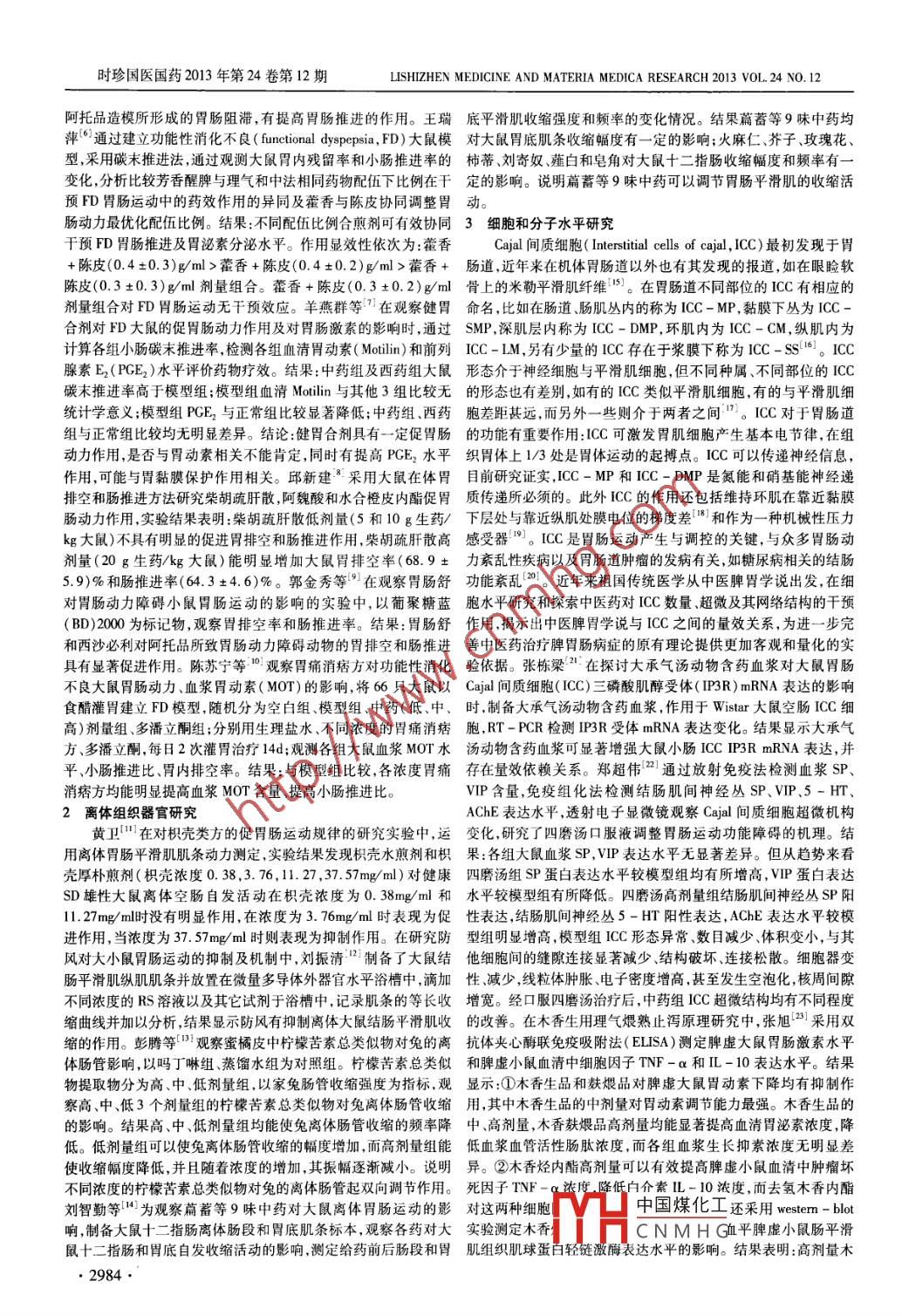 LISHIZHEN MEDICINE AND MATERIA MEDICA RESEARCH 2013 VOL 24 NO 12時(shí)珍國(guó)醫(yī)國(guó)藥2013年第24卷第12期中藥胃腸動(dòng)力學(xué)研究概況劉慧敏,劉莉·,肖煒,劉強(qiáng)(南方醫(yī)科大學(xué)中醫(yī)藥學(xué)院,廣東廣州510515)摘要:對(duì)中藥在胃腸動(dòng)力學(xué)方面的研究進(jìn)行了文獻(xiàn)整理及分析。胃腸動(dòng)力障礙在臨床上十分普遍,中藥在治療胃腸動(dòng)力障礙性疾病中應(yīng)用廣泛,具有促進(jìn)胃腸運(yùn)動(dòng)、抑制胃腸運(yùn)動(dòng)、雙向調(diào)節(jié)胃腸運(yùn)動(dòng)三種基本作用。通過(guò)CNK、維普、PubMed等數(shù)據(jù)庫(kù)查閱了有關(guān)胃腸動(dòng)力學(xué)中藥的相關(guān)文獻(xiàn),從整體水平、離體組織器官、細(xì)胞和分子水平對(duì)其實(shí)驗(yàn)研究進(jìn)行了分析和總結(jié),指出了胃腸動(dòng)力中藥研究的優(yōu)勢(shì)和不足。關(guān)鍵詞:胃腸動(dòng)力學(xué);中藥;整體水平;離體組織器官;細(xì)胞和分子水平DOI標(biāo)識(shí):doi:10.3969/j.issn.10080805.2013.12.072中圖分類號(hào):R282.7文獻(xiàn)標(biāo)識(shí)碼:A文章編號(hào):10080805(2013)122983403Progress of the Studies on Gastrointestinal Motility Regulation of Chinese MedicineLIU Hul-min, LIU LI XIAO Wel, LIU QiangCollege of TCM, Southern Medical University, Guangzhou 510515, China)Abstract: Objective Literature about gastrointestinal motility of Chinese medicine has been sorted and analyzed. Gastrointestinaldisorder is common in clinic and Chinese medicine is widely applied to treat it. There are three basic functions about the therapywhich are promoting gastrointestinal motility, inhibiting gastrointestinal motility and two-ways regulation of gastrointestinal motility By searching related literature from databases such as CNKI, VIP and PubMed, we analylized the literature and made a conclusion about the present situation of progress of studies on gastrointestinal motility regulation of Chinese medicine from integrated level, isolated tissue and organs level, cellular and molecular level. Also, we analyzed out the advantages and disadvantages of ChiKey words: Gastrointestinal motility; Chinese medicine; Integrated level; Isolated level: Cellular and molecular level近年來(lái)隨著胃腸動(dòng)力研究方法學(xué)的發(fā)展、胃腸動(dòng)力生理和以疏肝行氣、益氣活血清熱化濕等治法,均取得較好的效果(。病理研究的不斷深入,以及促動(dòng)力藥物臨床應(yīng)用的推廣,胃腸動(dòng)隨著對(duì)胃腸動(dòng)力研究的深入,“胃腸動(dòng)力中藥”這一概念已經(jīng)被力學(xué)得到了迅速發(fā)展。胃腸動(dòng)力相關(guān)疾病甚多,包括胃食管反流眾學(xué)者廣泛接受。胃腸動(dòng)力中藥是指具有增強(qiáng)蠕動(dòng)、促進(jìn)排空、病、食管痙攣、便秘等消化系統(tǒng)常見(jiàn)疾病。除可引起反酸、燒心、降逆止嘔、消痞除滿、疏肝利膽、健脾和胃及攻積導(dǎo)滯等作用的呃逆、堵脹感、排便困難等消化系統(tǒng)癥狀,還可出現(xiàn)咳嗽、咳痰胸類中藥2。研究顯示,對(duì)胃腸運(yùn)動(dòng)功能有影響的中藥可分為三痛等癥狀。而隨著臨床發(fā)現(xiàn)不少其他系統(tǒng)疾病(如糖尿病、甲類:促進(jìn)胃腸運(yùn)動(dòng)抑制胃腸運(yùn)動(dòng)雙向調(diào)節(jié)胃腸運(yùn)動(dòng)。包括:①亢、肺心病等)都有不同程度的胃腸運(yùn)動(dòng)功能紊亂,胃腸動(dòng)力學(xué)理氣類中藥。如能疏肝理氣的香附、青皮、陳皮,能理氣和胃的蘇越發(fā)受到人們的重視。胄腸動(dòng)力疾病已成為了目前消化內(nèi)科的梗、木香,能理氣消食導(dǎo)滯的枳實(shí)、厚樸、大腹皮等,這些對(duì)胃腸都研究熱點(diǎn),特別是中藥對(duì)胃腸動(dòng)力疾病的研究,由于療效確切,不具有促進(jìn)作用,適宜用于胃腸運(yùn)動(dòng)功能亢進(jìn)的氣滯作痛。②活血良反應(yīng)小,臨床應(yīng)用廣泛,被認(rèn)為有廣闊的應(yīng)用前景。藥三棱、莪術(shù)能通過(guò)刺激MTL的釋放分泌,提高腸管張力來(lái)發(fā)揮胃腸動(dòng)力是維持人體正常消化功能的一個(gè)重要因素,表現(xiàn)為促胃腸動(dòng)力作用,對(duì)于胃腸運(yùn)動(dòng)功能降低的瘀血作痛有良好效慢波驅(qū)動(dòng)下胃腸道節(jié)律性收縮運(yùn)動(dòng),任何影響胃腸道正常收縮與果;健脾藥白術(shù)作用平和,低濃度時(shí)有緩和胃腸運(yùn)動(dòng)的作用,可舒張的因素皆可導(dǎo)致胃腸動(dòng)力障礙。胃腸動(dòng)力障礙屬于中醫(yī)的治療慢性泄瀉較大濃度時(shí)能增強(qiáng)胃腸推送能力而幫助消化;③痞證”、“腹?jié)M”、“納呆”、“嘈雜”等疾病范疇。脾胃是人體氣機(jī)潤(rùn)腸通便類或健脾消食類中藥多具有促進(jìn)大小腸運(yùn)動(dòng)的作升降的樞紐,脾升胃降是胃腸運(yùn)動(dòng)的基本動(dòng)力?!捌⒅魃?胃用主降濁”,“脾宜升則健胃宜降則和”,此為脾胃納化之相互依存現(xiàn)代醫(yī)學(xué)檢測(cè)手段發(fā)展迅速,能為我中醫(yī)所用。消化界對(duì)的關(guān)系。脾胃氣機(jī)的升降是胃腸維持“胃滿則腸虛,腸滿則胃胃腸動(dòng)力方面的生理和病理研究逐漸增多,常用的試驗(yàn)方法有胃虛,更虛更滿”傳導(dǎo)功能的基本條件。脾胃運(yùn)納升降的和諧一旦排空率測(cè)定,小腸推進(jìn)功能測(cè)定,胃腸道腔外電橋式應(yīng)力傳感器遭到破壞,即傳導(dǎo)失司,運(yùn)化失調(diào)則