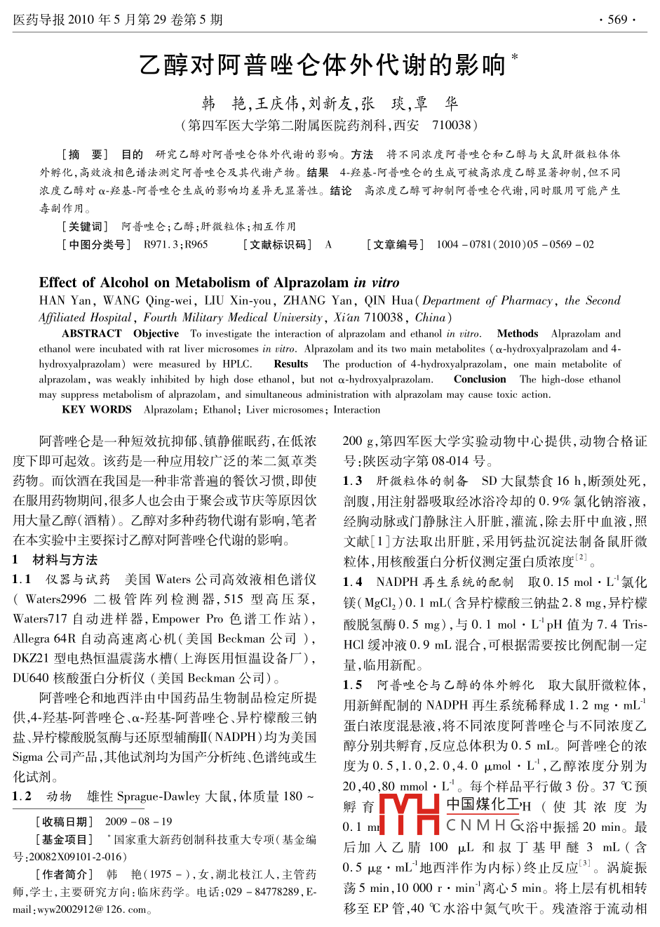 醫(yī)藥導(dǎo)報2010年5月第29卷第5期乙醇對阿普唑侖體外代謝的影響韓艷,王慶偉,劉新友,張琰,覃華(第四軍醫(yī)大學第二附屬醫(yī)院藥劑科,西安710038[摘要]目的研究乙醇對阿普唑侖體外代謝的影響。方法將不同濃度阿普唑侖和乙醇與大鼠肝微粒體體外孵化,高效液相色譜法測定阿普唑侖及其代謝產(chǎn)物。結(jié)果4-羥基-阿普唑侖的生成可被高濃度乙醇顯著抑制,但不同濃度乙醇對α-羥基-阿普唑侖生成的影響均差異無顯著性。結(jié)論高濃度♂醇可抑制阿普唑侖代謝,同時服用可能產(chǎn)生毒副作用。[關(guān)鍵詞]阿普唑侖;乙醇;肝微粒體;相互作用[中圖分類號]R971.3;R965文獻標識碼]A[文章編號]1004-0781(2010)05-0569-02Effect of Alcohol on Metabolism of Alprazolam in vitroHAN Yan, WANG Qing-wei, LIU Xin-you, ZHANG Yan, QIN Hua( Department of Pharmacy, the SecondAfiliated Hospital, Fourth Military Medical University, Xian 710038, ChinaABSTRACt Objective To investigate the interaction of alprazolam and ethanol in vitro. Methods Alprazolam andethanol were incubated with rat liver microsomes in vitro. Alprazolam and its two main metabolites(a-hydroxyalprazolam and 4hydroxyalprazolam) were measured by HPLC. Results The production of 4-hydroxyalprazolam, one main metabolite ofalprazolam, was weakly inhibited by high dose ethanol, but not a-hydroxyalprazolam. Conclusion The high-dose ethanolmay suppress metabolism of alprazolam, and simultaneous administration with alprazolam may cause toxic actionKEY WORDS Alprazolam; Ethanol; Liver microsomes; Interaction阿普唑侖是一種短效抗抑郁、鎮(zhèn)靜催眠藥,在低濃200g,第四軍醫(yī)大學實驗動物中心提供,動物合格證度下即可起效。該藥是一種應(yīng)用較廣泛的苯二氮草類號:陜醫(yī)動字第08-014號。藥物。而飲酒在我國是一種非常普遍的餐飲習慣,即使1.3肝微粒體的制備SD大鼠禁食16h,斷頸處死,在服用藥物期間,很多人也會由于聚會或節(jié)慶等原因飲剖腹,用注射器吸取經(jīng)冰浴冷卻的0.9%氯化鈉溶液用大量乙醇(酒精)。乙醇對多種藥物代謝有影響,筆者經(jīng)胸動脈或門靜脈注入肝臟,灌流,除去肝中血液,照在本實驗中主要探討乙醇對阿普唑侖代謝的影響。文獻[1]方法取出肝臟,采用鈣鹽沉淀法制備鼠肝微1材料與方法粒體用核酸蛋白分析儀測定蛋白質(zhì)濃度?分鼠肝微1.1儀器與試藥美國 Waters公司高效液相色譜儀1.4 NADPH再生系統(tǒng)的配制取0.15mol·L氯化(waes2996二極管陣列檢測器,515型高壓泵,鎂(MsCl)0.1mL(含異檸檬酸三鈉鹽2.8mg,異檸檬Waters717自動進樣器, Empower Pro色譜工作站),酸脫氫酶0.5mg),與0.1mol·LpH值為74TriAllegra64R自動高速離心機(美國 Beckman公司)HCl緩沖液0.9mL混合,可根據(jù)需要按比例配制一定DKZ21型電熱恒溫震蕩水槽(上海醫(yī)用恒溫設(shè)備廠),量,臨用新配DU640核酸蛋白分析儀(美國 Beckman公司)。1.5阿普唑侖與乙醇的體外孵化取大鼠肝微粒體阿普唑侖和地西泮由中國藥品生物制品檢定所提用新鮮配制的 NADPH再生系統(tǒng)稀釋成1.2mg·mL鹽異檸檬酸脫氫酶與還原型輔酶Ⅱ( NADPH)均為美國蛋白濃度混懸液,將不同濃度阿普唑侖與不同濃度乙供,4-羥基-阿普唑侖、α-羥基-阿普唑侖、異檸檬酸三鈉醇分別共孵育,反應(yīng)總體積為0.5mL。阿普唑侖的濃Sigma公司產(chǎn)品,其他試劑均為國產(chǎn)分析純、色譜純或生化試劑。度為0.5,1.0,2.0,4.0mol·L,乙醇濃度分別為1.2動物雄性 Sprague- Dawley大鼠,體質(zhì)量18020,40,80mmol·L。每個樣品平行做3份。37℃預(yù)孵育中國煤化工H(使其濃度為[收稿日期]2009-08-190.1CNMHG浴中振搖20min。最基金項目]·國家重大新藥創(chuàng)制科技重大專項(基金編號:20082X09101-2-016)后加入乙腈100μ和叔丁基甲醚3mL(含[作者簡介]韓艷(1975-),女,湖北枝江人,主管藥0.5g:mL地西洋作為內(nèi)標)終止反應(yīng)。渦旋振師,學士,主要研究方向:臨床藥學。電話:029-84778289,E蕩5min,10000r·min離心5min。將上層有機相轉(zhuǎn)mailwyw2002912@126.como移至EP管,40℃水浴中氮氣吹干。殘渣溶于流動相570Herald of Medicine Vol 29 No 5 May 2010200μ,取50μL進樣和日內(nèi)精密度均<6%,回收率均>97%。1.6阿普唑侖及其代謝產(chǎn)物的測定色譜條件:C11.7統(tǒng)計學方法所有結(jié)果均用均數(shù)±標準差反相柱(150mm×4.6mm,5wm),美國 Waters公司;(x±s)表示,組間比較用 ANOVA檢驗,P<0.05表示流動相:20mmol·L磷酸二氫鉀(KH2PO4)-甲醇-乙差異有顯著性。腈(40:20:30,VWV);流速:0.6mL·min;檢測波2結(jié)果長:254m;柱溫30℃。α-羥基-阿普唑侖、4-羥基測定結(jié)果見表1,不同濃度(20,40,80mmol·L)阿普唑侖、阿普唑侖和地西泮的保留時間分別為9.6,乙醇對α-羥基-阿普唑侖生成無明顯影響,而高濃度乙10.5,15.0,25.0min。ax-羥基-阿普唑侖、4羥基阿普醇(80mmol·L)對4羥基阿普唑侖生成有一定抑唑侖的定量限分別為50和25ng:mL,日間精密度制作用(P<0.01)。表1乙醇對肝微粒體中阿普唑侖代謝的影響Tab 1 Effect of alcohol on the metabolism of alprazolam in hepatic microsome nmol. min.mg, x*s, n=3而日0.5umL1.0pml:L20pmL.0pmd.t-OH4-OH4-OH4-OH4-OH乙醇20mmol·L-112.2±4.124.8±4.514.4±3.956.7±6.714.3±3.5120.2±13.326.3±5.1211.1±33.440mmol·L-114.2±4.422.7±2.2112.9±2.954.8±7.211.9±2.6110.8±23.126.8±3.2199.5±4180mmol·L14.8±5.319.8±3.1*213.5±4.247.8±6.0*213.8±2.88±14.7*225.6±3.7201.8±20對照組11.7±3.827.6±5.912.8±3.359.1±4.912.7±1.9118.1±23.427.0±4.7254.8±43.3αOH:α-羥基-阿普唑倉;4-OH:4-羥基-阿普唑侖;與對照組比較,P<0.05,“P<0.01a-OH: a-hydroxyalprazolam; 4-0H: 4-hyd