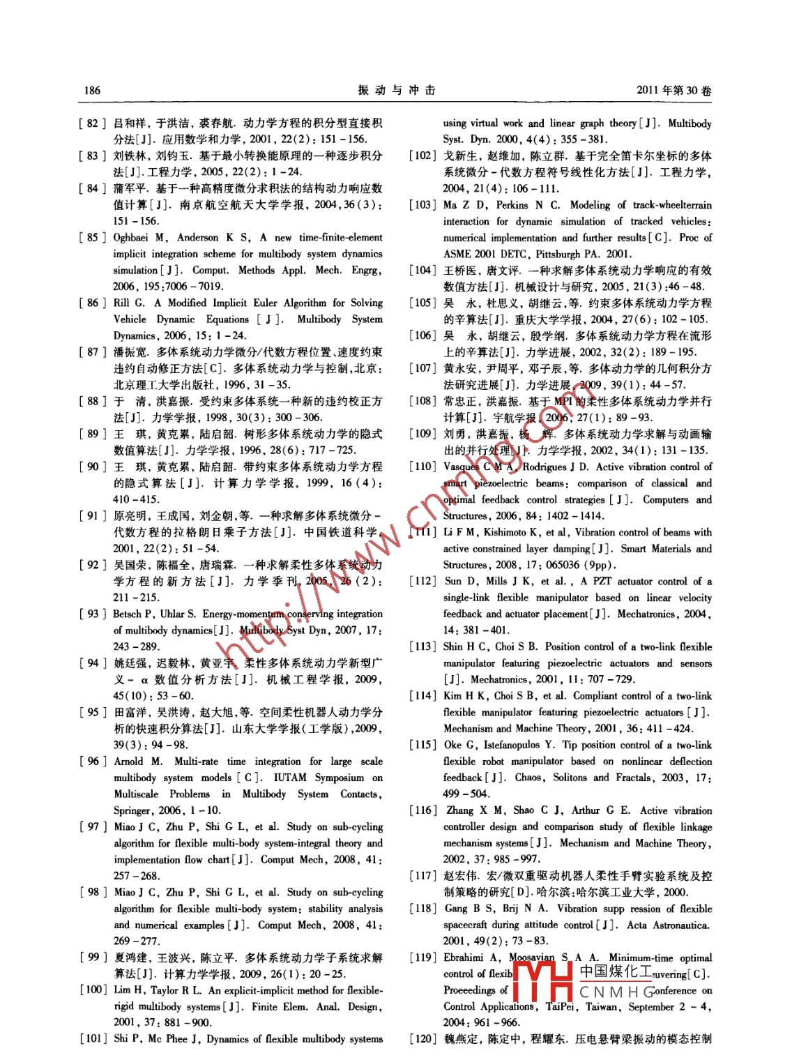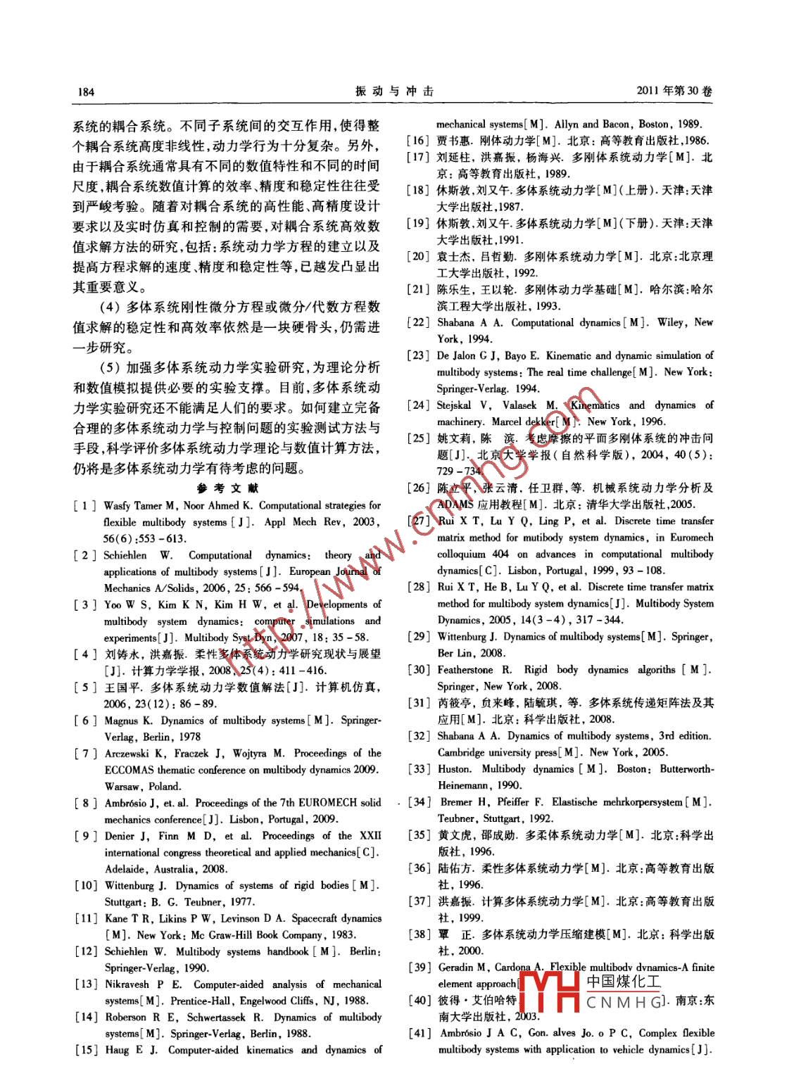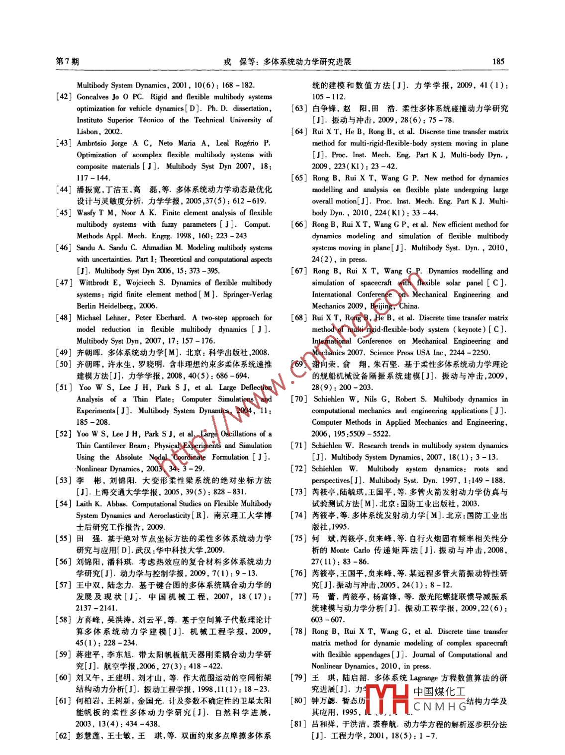 振動與沖擊第30卷第7期JOURNAL OF VIBRATION AND SHOCKvol.30Na.72011多體系統(tǒng)動力學(xué)研究進(jìn)展戎保2,芮筱亭',王國平,楊富鋒(1.南京理工大學(xué)發(fā)射動力學(xué)研究所,南京210094;2.南昌陸軍學(xué)院,南昌330103)摘要:多體系統(tǒng)動力學(xué)是當(dāng)今力學(xué)領(lǐng)域的研究熱點(diǎn)和難點(diǎn)之一,為機(jī)械航空航天、兵器、機(jī)器人等領(lǐng)域中大量機(jī)楲系統(tǒng)的動態(tài)性能評估和優(yōu)化設(shè)計(jì)提供了強(qiáng)有力的理論工具與技術(shù)支撐。復(fù)雜多體系統(tǒng)動力學(xué)建模、設(shè)計(jì)和控制研究是當(dāng)前重大工程領(lǐng)域的迫切需求。對近年來國內(nèi)外多體系統(tǒng)動力學(xué)建模方法、求解策略、控制設(shè)計(jì)、軟件開發(fā)、實(shí)驗(yàn)研究等方面的研究現(xiàn)狀進(jìn)行了較為全面地概括和總結(jié),并簡要展望了多體系統(tǒng)動力學(xué)的發(fā)展趨勢。關(guān)鍵詞:建模理論;多體系統(tǒng)動力學(xué);控制;計(jì)算方法;仿真;實(shí)驗(yàn)中圖分類號:TH2l2;TH213.3文獻(xiàn)標(biāo)識碼:ADevelopments of studies on multibody system dynamicsRONG Bao, RUI Xiao-ting, WANG Guo-ping, YANG Fu-feng(1. Institute of Launch Dynamics, Nanjing University of Science and Technology, Nanjing 210094,China2. Nanchang Military Academy, Nanchang 330103, China)Abstract: Multibody system dynamics is an important branch in the field of the modern mechanics. It provides astrong tool for dynamic performance estimation and optimizing design of many mechanical systems in a lot of importantengineering fields, such as, weapon, aeronautics, astronautics, vehicle, robot, precision machinery, and so on. Thestudy on dynamic modeling, design and control of complex multibody systems is the urgent demand of modern engineeringproblems. Here studies on dynamic modeling methods, computational strategies, control design, software exploitationsand experiments of multibody systems in recently years were reviewed. The future directions of this field were indicatedKey words: modeling theory multibody system dynamics; control; numerical method; simulation; experiment多體系統(tǒng)是以一定方式相聯(lián)接的多個(gè)物體(剛體、現(xiàn)今多體系統(tǒng)動力學(xué)已成為現(xiàn)代力學(xué)的重要發(fā)展方彈性體/柔體、質(zhì)點(diǎn)等)組成的系統(tǒng)。在兵器、機(jī)器人、向,各種新興的研究方法層出不窮,出現(xiàn)了兩個(gè)著名的航空、航天、機(jī)械等國防和國民經(jīng)濟(jì)建設(shè)中,諸如發(fā)射專業(yè)學(xué)術(shù)國際期刊: Springer出版社的《 Multibody Sys-系統(tǒng)、飛行器、機(jī)器人、車輛、民用機(jī)械等大量機(jī)械系統(tǒng) tem Dynamics〉和英國機(jī)械工程協(xié)會的《 Journal of均可歸結(jié)為多體系統(tǒng)。隨著國民經(jīng)濟(jì)和國防建設(shè)對機(jī) Multi-body Dynamics。械系統(tǒng)產(chǎn)品動態(tài)性能要求的提高,需要對大型復(fù)雜機(jī)本文對近年來國內(nèi)外多體系統(tǒng)動力學(xué)建模方法械系統(tǒng)動力學(xué)特性進(jìn)行準(zhǔn)確而快速地分析和預(yù)測。在求解策略、控制設(shè)計(jì)軟件開發(fā)及實(shí)驗(yàn)研究等方面的研這樣的工程背景下,出現(xiàn)了多體系統(tǒng)動力學(xué)這一新的兗現(xiàn)狀進(jìn)行了較為全面地概括和總結(jié),并簡要展望了學(xué)科分支。多體系統(tǒng)動力學(xué)的發(fā)展趨勢。近年來,國內(nèi)外諸多學(xué)者對多體系統(tǒng)建模、設(shè)計(jì)、控制、求解策略及其實(shí)驗(yàn)等方面進(jìn)行了深入地研究,基1多體系統(tǒng)動力學(xué)建模于這一課題發(fā)表的文獻(xiàn)層出不窮。自1977年國際多體系統(tǒng)動力學(xué)的核心問題是建模和求解問題,理論與應(yīng)用力學(xué)聯(lián)合會在德國慕尼黑發(fā)起第一次多體其系統(tǒng)研究始于20世紀(jì)60年代,早期研究對象是多動力學(xué)國際研討會以來,關(guān)于多體系統(tǒng)動力學(xué)及其剛體系統(tǒng)。 Wittenburg0將好圖論方法引入多體系統(tǒng)動應(yīng)用方面的國際會議也如雨后春筍般不斷涌現(xiàn)。力學(xué),出版了第一本多體系統(tǒng)動力學(xué)專著,奠定了多剛基金項(xiàng)目:國家自然科學(xué)基金(00江蘇省自然科學(xué)基金攀登計(jì)體系統(tǒng)動力學(xué) Lagrange的基礎(chǔ)。Kae在對各劃(BK2008046)種動力學(xué)原理進(jìn)行中國煤化工了兼有矢收稿日期:2010-04-06修改稿收到日期:2010-06-28量力學(xué)和分析力學(xué)CNMHG了該方法第一作者戎保男博士生,1984年9月生在航天器動力學(xué)上的應(yīng)用。 Schiehlen12出版了第一本通訊作者芮筱亭男博士教授博士生導(dǎo)師,1956年8月生統(tǒng)一的多體系統(tǒng)動力學(xué)手冊,有限元系統(tǒng)和連續(xù)系統(tǒng)第7期保等:多體系統(tǒng)動力學(xué)研究進(jìn)展可視為統(tǒng)一的等價(jià)模型。 Nikravesh出版了多體系統(tǒng)此類系統(tǒng)中柔體變形可通常按模態(tài)展開等線性方法處計(jì)算機(jī)輔助分析的第一本專著。 Roberson等討論了理,可很方便地把模態(tài)分析和實(shí)驗(yàn)?zāi)B(tài)識別等技巧推多體系統(tǒng)的起源、剛體建模、線性化方程以及計(jì)算機(jī)模廣到柔性多體系統(tǒng)動力學(xué)。旋轉(zhuǎn)坐標(biāo)方法針對柔性擬技術(shù)等。Haug提出了多剛體系統(tǒng)建模的笛卡爾構(gòu)件上每個