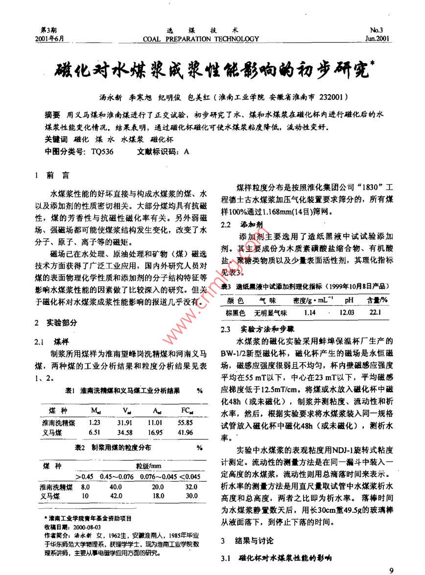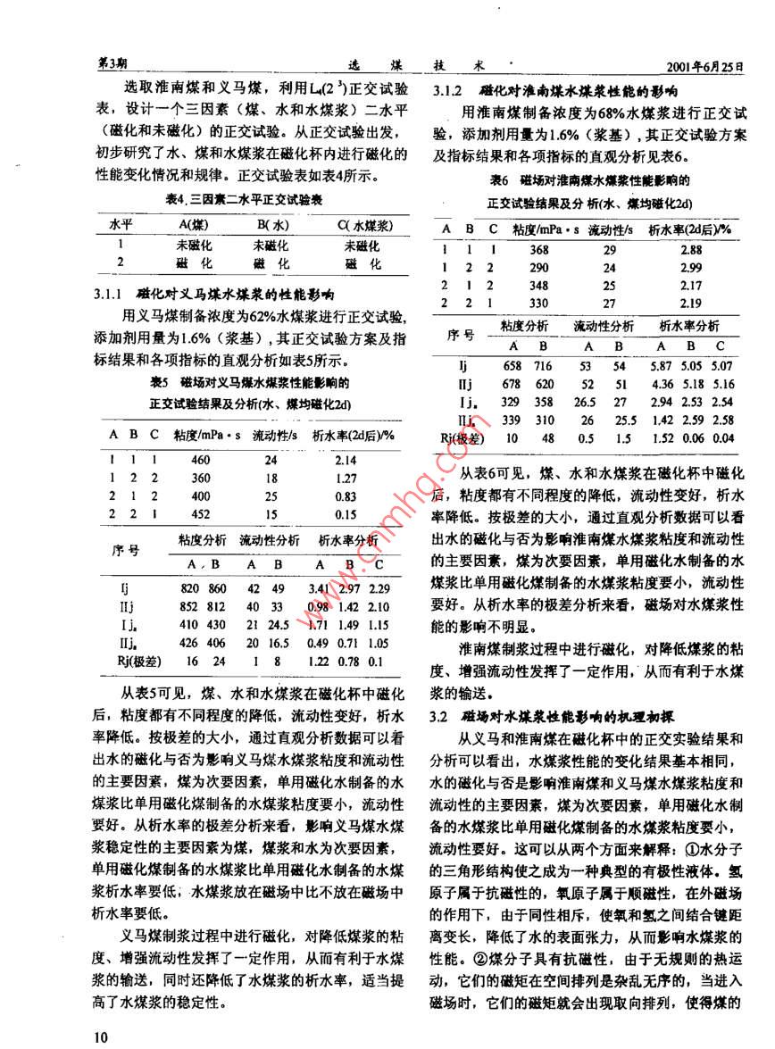 No. 3年6月COAL PREPARATION TECHNOLOGYJun. 2001磁化對(duì)水煤漿成漿性能影響的初步究湯永新李寒旭紀(jì)明俊包美紅(淮南工業(yè)學(xué)院安撒省淮南市23200)摘要用義馬煤和淮南煤進(jìn)行了正交試驗(yàn),初步研究了水、煤和水煤漿在磁化杯內(nèi)進(jìn)行磁化后的水煤漿性能變化情況。結(jié)果表明,通過(guò)磁化杯磁化可使水煤漿粘度降低,流動(dòng)性變好關(guān)鍵詞磁化煤水水煤漿磁化杯中圖分類號(hào):TQ536文獻(xiàn)標(biāo)識(shí)碼:A1前言水煤漿性能的好壞直接與構(gòu)成水煤漿的煤、水煤樣粒度分布是按照淮化集團(tuán)公司“1830”工以及添加劑的性質(zhì)密切相關(guān)。大部分煤均具有抗磁程德士古水煤漿加壓氣化裝置要求篩分的,所有煤性,煤的芳香性與抗磁性磁化率有關(guān)。另外弱磁樣100通過(guò)1168mm(14目)篩網(wǎng)場(chǎng)、強(qiáng)磁場(chǎng)都可能使煤漿結(jié)構(gòu)發(fā)生變化,改變了水22添加劑分子、原子、離子等的磁矩。添加劑主要選用了造紙黑液中試試驗(yàn)添加磁場(chǎng)己在水處理、原油處理和礦物(煤)磁選劑。其主要成份為木質(zhì)素磺酸鹽縮合物、有機(jī)酸技術(shù)方面獲得了廣泛工業(yè)應(yīng)用,國(guó)內(nèi)外研究人員對(duì)鹽、聚糖類物質(zhì)以及少量表面活性劑,其理化指標(biāo)煤的表面物理化學(xué)性質(zhì)和添加劑的分子結(jié)構(gòu)特征等見(jiàn)表3影響水煤漿性能的因素做了比較深入的研究。但關(guān)表3造紙票液中試添加劑理化指標(biāo)(19910月8日產(chǎn)品)于磁化杯對(duì)水煤漿成漿性能影響的報(bào)道幾乎沒(méi)有。顏色氣味密度mLpH含量棕黑色無(wú)明顯氣味114120322.l2實(shí)驗(yàn)部分23實(shí)驗(yàn)方法和步輩2.1煤樣水煤漿的磁化實(shí)驗(yàn)采用蚌埠保溫杯廠生產(chǎn)的制漿所用煤樣為淮南望峰崗洗精煤和河南義馬BW-/2新型磁化杯,磁化杯產(chǎn)生的磁場(chǎng)是永恒磁煤,兩種煤的工業(yè)分析結(jié)果和粒度分析結(jié)果見(jiàn)表場(chǎng),磁感應(yīng)強(qiáng)度很弱且不均勻,杯內(nèi)壁磁感應(yīng)強(qiáng)度平均在55mT以下,中心在23mT以下,平均磁感表1淮南洗精煤和義馬煤工業(yè)分析結(jié)果%應(yīng)梯度低于125mTm。將煤或水放入磁化杯中磁化48h(或未磁化),制漿并測(cè)粘度、流動(dòng)性和析又馬*651965水率,然后,根據(jù)實(shí)驗(yàn)要求將水媒裝入同一規(guī)格淮南洗精煤1.2331試管放入磁化杯中磁化48h(或未磁化),測(cè)析水96率表2制漿用煤的粒度分布實(shí)驗(yàn)中水煤漿的表觀粘度用NDJ-旋轉(zhuǎn)式粘度煤種計(jì)測(cè)定。流動(dòng)性的測(cè)量方法是在同一漏斗中裝入一>0.450.45~00760076~0.045<0.045定高度的水煤漿,流動(dòng)性則用總滴落時(shí)間來(lái)表示。淮南洗精煤8040.020.032.0析水率的測(cè)量方法是用直尺量取試管中水煤漿析水義馬煤18.030.0高度和總高度,兩者之比即為析水率。落棒時(shí)間為水煤漿靜置數(shù)天后,用長(zhǎng)30cm重495g的玻璃棒淮南工業(yè)學(xué)院膏年基金資助項(xiàng)目收稿日期:20000803從液面落下,到停止下落的時(shí)間。作者簡(jiǎn)介:湯永新962生,安徽淮南人,1985年蘋(píng)業(yè)于華東師范大學(xué)物理系,獲理學(xué)學(xué)士,現(xiàn)為淮工業(yè)學(xué)院數(shù)3結(jié)果與討論理系講師,主要從事電磁學(xué)應(yīng)用方面的研究31磁化杯對(duì)水煤漿性能的影響第3期選。渫_技術(shù)200年6月25日選取淮南煤和義馬煤,利用L4(2)正交試驗(yàn)3.2磁化對(duì)淮南煤水煤漿性能的影響表,設(shè)計(jì)一個(gè)三因素(煤、水和水煤漿)二水平用淮南煤制備濃度為68%水煤漿進(jìn)行正交試(磁化和未磁化)的正交試驗(yàn)。從正交試驗(yàn)出發(fā),驗(yàn),添加劑用量為16%(漿基),其正交試驗(yàn)方案初步研究了水、煤和水煤漿在磁化杯內(nèi)進(jìn)行磁化的及指標(biāo)結(jié)果和各項(xiàng)指標(biāo)的直觀分析見(jiàn)表6。性能變化情況和規(guī)律。正交試驗(yàn)表如表4所示表6磁場(chǎng)對(duì)淮南煤水煤漿性能影響的表4,三因素二水平正交試驗(yàn)襲正交試驗(yàn)結(jié)果及分析(水、煤均磁化2d水平B(水)C(水煤漿ABC粘度/mPa·s流動(dòng)性/析水率(2后%未磁化未磁化29化311磁化對(duì)義馬煤水煤漿的性能影響2122.17用義馬煤制備濃度為62%水煤漿進(jìn)行正交試驗(yàn),添加劑用量為1.6%(漿基),其正交試驗(yàn)方案及指序號(hào)粘度分析流動(dòng)性分析析水率分析標(biāo)結(jié)果和各項(xiàng)指標(biāo)的直觀分析如表5所示。J65871653545.875.055075磁場(chǎng)對(duì)義馬爆水煤漿性能影響的盯6786205251436518516正交試驗(yàn)結(jié)果及分析(水、蝶均磁化I。32935826.5272942532.54lj.3393102625.51422592.58ABC粘度mPa·s流動(dòng)性析水率(2d后)%Rj(極差)48051.51.520060.04l22360181.27從表6可見(jiàn),煤、水和水煤漿在磁化杯中磁化2124000.83后,粘度都有不同程度的降低,流動(dòng)性變好,析水22l150.15率降低。按極差的大小,通過(guò)直觀分析數(shù)據(jù)可以看粘度分析流動(dòng)性分析析水率分析出水的磁化與否為影響淮南煤水煤漿粘度和流動(dòng)性序號(hào)B A B C的主要因素,煤為次要因素,單用磁化水制備的水82086042493.41297229煤漿比單用磁化煤制備的水煤漿粘度要小,流動(dòng)性85281240330981.42210要好。從析水率的極差分析來(lái)看,磁場(chǎng)對(du