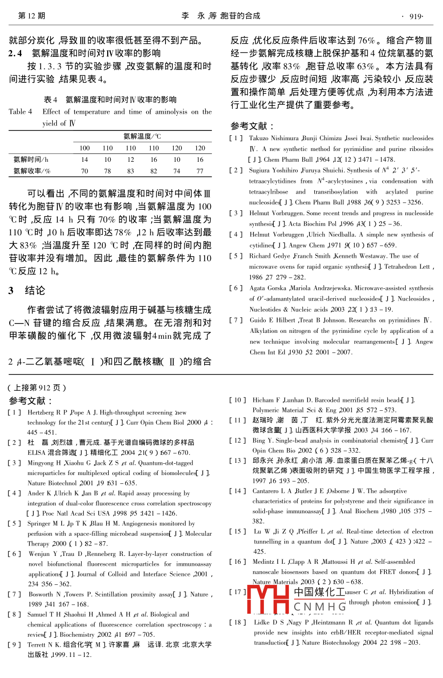 第21卷第12期精細(xì)化工Vol.21 ,No. 122004年12月FINE CHEMICALS .Dee. 2004生物工程胞苷的合成李永渠桂榮*,劉啟賓韓素輝(河南師范大學(xué)化學(xué)與環(huán)境科學(xué)學(xué)院河南新鄉(xiāng)453007 )摘要在微波輻射和無溶劑條件下,以2 4-二乙氧基嘧啶( I )和四乙酰核糖( II )為原料對(duì)甲苯磺酸為催化劑進(jìn)行縮合得到中間體4-乙氧基{2' 3' 5'-=-0-乙酰基)尿苷( I )收率76%隨后通過氨一甲醇一步氨解得到胞苷( IV )收率83%胞苷總收率63% ;Il 和IV的結(jié)構(gòu)經(jīng)HNMR和"CNMR證實(shí)。最佳縮合條件是n( I ):n( I )=1.4:1對(duì)甲苯磺酸的用量為0.1 g/g I 280 W微波輻射4 min最佳氨解條件是在110 C反應(yīng)12 h。關(guān)鍵詞胞苷2 A-二乙氧基嘧啶四乙酰核糖微波輻射中圖分類號(hào):0626文獻(xiàn)標(biāo)識(shí)碼:A文章編號(hào):1003-5214( 2004 )012 -0917 -03Synthesis of CytidineLI Yong QU Gui-rong* LIU Qi-bin ,HAN Su-hui( Collge of Chemistry and Environmental Science ,Henan Normal University ,Xinxiang 453007 ,Henan ,China )Abstract :Condensation of 2 A4-diethoxypyrimidind( I )and tetraacetylribofuranose( I )in the presenceof TsOH as catalyst under microwave irradiation and without solvent gave 4-ethoxy( 2' ,3' 5'tri-O-acetyl )uridine( I ) in 76% yield. Cytidine( IV )was obtained in 83% yield by treating I with NH3 -CH.OH. The total yield of IV was 63%. Structures of II and IV were confirmed with' HNMR and'CNMR. The best conditions for condensation wasn( I )n( II )=1.4 0.1 g TsOH/g II and 280 Wmicrowave irradiation for 4 min. The best condition for aminolysis was 110 C for 12 h.Key words cytidine 2 A -diethoxypyrimidine tetraacetylribofuranose ;microwave irradiationFoundation item :Granted by national natural science foundation( No. 20372018 )胞苷是人體和動(dòng)植物體內(nèi)RNA的結(jié)構(gòu)片段在以24-二乙氧基嘧啶和四乙酰核糖為原料,采用微生物體內(nèi)生理生化過程中起著重要的調(diào)控作用具波輻射和無溶劑條件,在對(duì)甲苯磺酸的催化下進(jìn)行有多方面生理活性;同時(shí),胞苷又是很多抗病毒、抗縮合反應(yīng)然后通過氨解制備胞苷,反應(yīng)經(jīng)兩步完腫瘤和抗艾滋病藥物的良好中間體以及基因工程研成總收率達(dá)63%。究的重要原材料。因此,胞苷的制備方法研究已經(jīng)1實(shí)驗(yàn)成為化學(xué)工作者和生物工作者研究的熱點(diǎn)。目前國內(nèi)外制備胞苷的方法主要是化學(xué)合成法,即以胞嘧1.1 試劑與儀器啶和核糖1~3]或者以尿苷41為主要原料進(jìn)行制備,四乙酰核糖為新鄉(xiāng)拓新生化科技有限公司產(chǎn)品;但存在反應(yīng)步驟多,反應(yīng)條件苛刻操作繁瑣環(huán)境對(duì)甲苯磺酸、二氯乙烷、乙醇均為AR。家用微波爐,污染較大和原料成本高的問題。自R.N.Gedye最大輸出功率700 W頻率為2450 MHz核磁共振儀等S]首次報(bào)道微波輻射在有機(jī)合成中的應(yīng)用之后,Brucker - AV -400M反應(yīng)用TLC進(jìn)行跟蹤。微波輻射已經(jīng)廣泛應(yīng)用于各類有機(jī)合成反應(yīng),但將1.2_ 合成路線其應(yīng)用于核苷類化合物的合成報(bào)道極少61。作者中國煤化工MHCNMHG*收稿日期 2004 -04 -23基金項(xiàng)目國家自然科學(xué)基金資助項(xiàng)目( No. 20372018 )作者簡介李永( 1979- )男河南沈丘人河南師范大學(xué)化學(xué)與環(huán)境科學(xué)學(xué)院在讀碩士研究生師從渠桂榮教授主要研究方向?yàn)楹塑疹愃幬锛八幬镏虚g體的合成。聯(lián)系人渠桂榮電話0373 -3326504 E - mail diyong7998@ sohu. com。,918精細(xì)化工FINE CHEMICALS第21卷0EtNH2CH,C00~ .0C0CH,CHC00l0<0一OTs0HMierowave110COFtCH,C0O0C0CH3CHCOO0C0CH, .(山)(I)(M)(IV)1.3 合成方法到0.1g時(shí),收率達(dá)到最高76%。如果繼續(xù)增加1.3.1 2 4-二乙氧基嘧啶的制備TsOH的用量原料將開始炭化,而得不到產(chǎn)品。參照文獻(xiàn)7 ]制備。表1催化劑 TsOH用量對(duì)縮合收率的影響1.3.2 4-乙氧基( 2' ,3' ,5'三-0-乙?;?尿苷Table 1 Effeet of TsOH amount on the condensation yield( II )的合成催化劑TsOH/g將0.5 gI、1.0 gII和0.1 g對(duì)甲苯磺酸0.03).050.070.1 0.12( TsOH )投入50 mL圓底燒瓶中加入15 mL1 2-二縮合收率/%-5676炭化氯乙烷充分?jǐn)嚢枞芙鈸]發(fā)干溶劑后置于微波爐中設(shè)定功率為280 W加熱4 min。反應(yīng)完畢,加入202.2原料配比對(duì)縮合收率的影響mL熱乙醇冷卻結(jié)晶過濾得白色晶體II0.. 96 g收采用1.3.2節(jié)的步驟,催化劑的用量、微波輻射率76%。' HNMR( DMSO-d。 ,δ ):1.299( t ,3H ,功率及輻射時(shí)間不變 調(diào)節(jié)原料的比例結(jié)果見表2。CH3CH2)2. 037 ~2. 080( m 9H CH,CO ) A4.233( t,表2原料配比對(duì)縮 合收率的影響2H 5'-H)4.277( q ,2H ,0CH2 ),4.361( t ,1H ,4'-Table2 Effect ofn( I )/n( I )on the condensation yieldH),5.361( t 1H 3'-H )5.487( q ,H 2'-H ) 5.926()(I)(d ,1H 1'-H )6.097( d ,1H ,5-H) 8.004( d ,1H ,6-0.91.11.31.41.5 1.8H )。I3CNMR( DMSO-d。δ ):15.00( CH,CH2 ) 21.26縮合收率/% 2558777~21. 52( CH,CO ) ,63. 65( OCH, ) ,63. 96( 5'-C ) ,70. 84( 3'-C)73. 53(2'-C) 80.18(4'-C)91. 13( 1'-可以看出,由于I為液體在微波加熱下蒸發(fā)散C) ,96.73( 5-C ),146.57( 6-C ),155.47( 2-C ),失,因此不同的原料配比對(duì)縮合收率有很大影響。170. 32( 4-C) ,170. 35 ~172.18( COCH; )。原料配比n(I)/n(II)=1.1時(shí),縮合收率只有1.3.3 胞苷( IV )的合成58%增至1.4 時(shí),收率為76% ;繼續(xù)增大比值,則將3.0g中間體溶于50mL氨-甲醇溶液0縮合收率沒有明顯增加。因此,在實(shí)驗(yàn)中采用nC飽和)然后置于不銹鋼封管中密封,油浴加熱至( I )1( II )=
