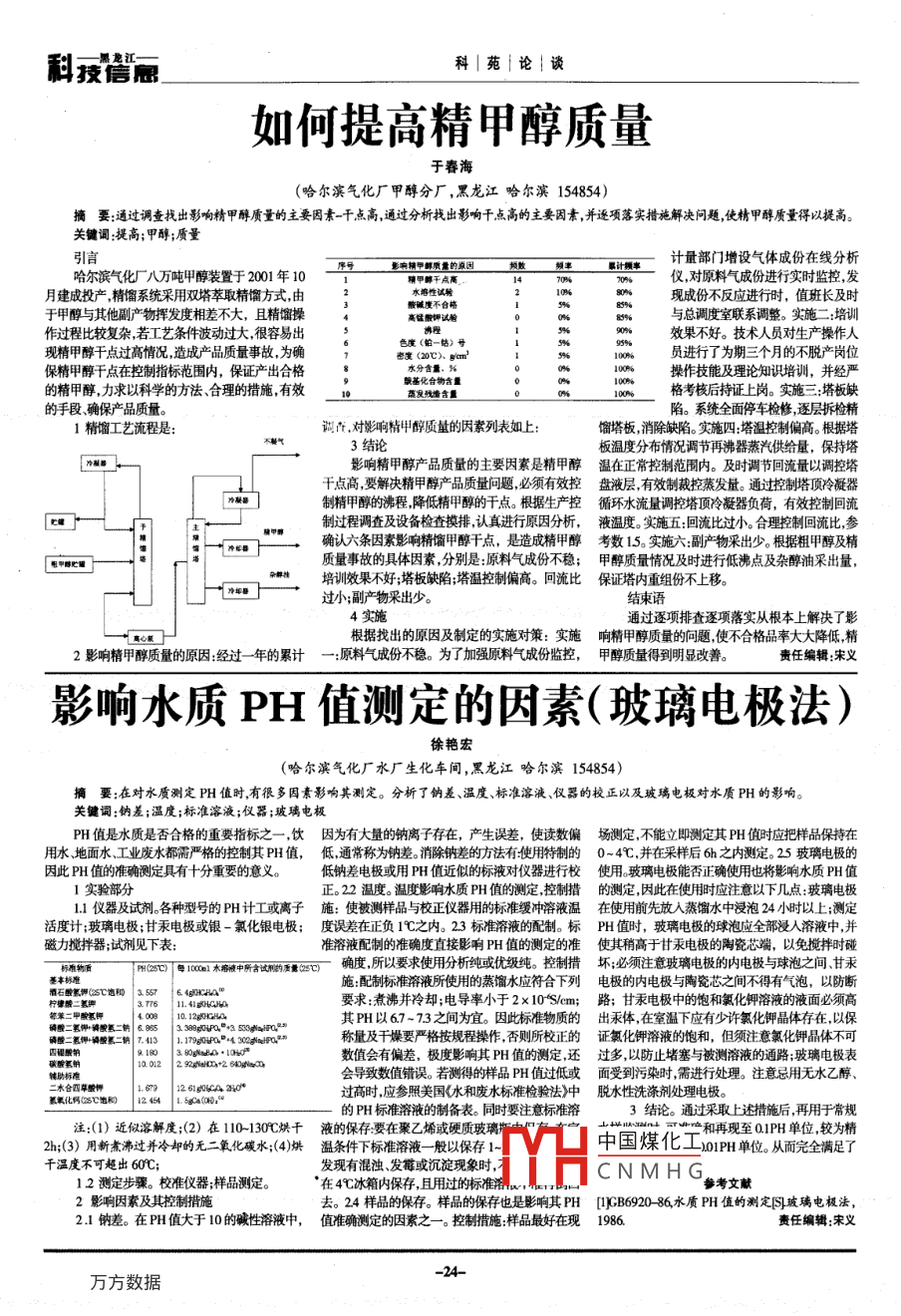 科搜情科|苑|論|談如何提高精甲醇質(zhì)量于春海(哈爾濱氣化廠甲醇分廠,黑龍江哈爾濱154854)摘要:通過調(diào)查找出影響精甲醇質(zhì)量的主要因素-干點(diǎn)高,誦過分析找出影響干點(diǎn)高的主要因素,并逐項(xiàng)落實(shí)措施解決問題使精甲醇質(zhì)量得以提高關(guān)鍵詞提高;甲醇;質(zhì)量引言響輔甲醇質(zhì)量的點(diǎn)因計(jì)量部門增設(shè)氣體成份在線分析哈爾濱氣化廠八萬噸甲醇裝置于2001年10儀對(duì)原料氣成份進(jìn)行實(shí)時(shí)監(jiān)控發(fā)月建成投產(chǎn),精餾系統(tǒng)采用雙塔萃取精餾方式,由水溶性試酸堿度不合格s現(xiàn)成份不反應(yīng)進(jìn)行時(shí),值班長(zhǎng)及時(shí)于甲醇與其他副產(chǎn)物揮發(fā)度相差不大,且精餾操高酸鉀試驗(yàn)作過程比較復(fù)雜若工藝條件波動(dòng)過大很容易出5現(xiàn)精甲醇干點(diǎn)過高情況造成產(chǎn)品質(zhì)量事故為確7度(2C)gaml10員進(jìn)行了為期三個(gè)月的不脫產(chǎn)崗位保精甲醇干點(diǎn)在控制指標(biāo)范圍內(nèi),保證產(chǎn)出合格1操作技能及理論知識(shí)培訓(xùn),的精甲醇,力求以科學(xué)的方法、合理的措施有效蒸發(fā)殘情含1∞格考核后持證上崗。實(shí)施三的手段確保產(chǎn)品質(zhì)量。陷。系統(tǒng)全面停車檢修逐層拆檢精1精餾工藝流程是調(diào)惰,對(duì)影響精甲醇質(zhì)量的因素列表如上:餾塔板,消除缺陷。實(shí)施四:塔溫控制偏髙。根據(jù)塔板溫度分布情況調(diào)節(jié)再沸器蒸汽供給量,保持塔影響精甲醇產(chǎn)品質(zhì)量的主要因素是精甲醇溫在正??刂品秶鷥?nèi)。及時(shí)調(diào)節(jié)回流量以調(diào)控塔干點(diǎn)高要解決精甲醇產(chǎn)品質(zhì)量問題,必須有效控盤液層有效制裁控蒸發(fā)量。通過控制塔頂冷凝器制精甲醇的沸程降低精甲醇的于點(diǎn)。根據(jù)生產(chǎn)控循環(huán)水流量調(diào)控塔頂冷凝器負(fù)荷,有效控制回流制過程調(diào)查及設(shè)備檢查摸排認(rèn)真進(jìn)行原因分析,液溫度。實(shí)施五回流比過小合理控制回流比參確認(rèn)六條因索影響精餾甲醇干點(diǎn),是造成精甲醇考數(shù)15實(shí)施六副產(chǎn)物采出少。根據(jù)粗甲醇及精醇貯質(zhì)量事故的具體因素分別是原料氣成份不穩(wěn);甲醇質(zhì)量情況及時(shí)進(jìn)行低沸點(diǎn)及雜醇油采出量,培訓(xùn)效果不好;塔板缺陷;塔溫控制偏高。回流比保證塔內(nèi)重組份不上移。過小;副產(chǎn)物采出少。結(jié)束語4實(shí)施通過逐項(xiàng)排查逐項(xiàng)落實(shí)從根本上解決了影根據(jù)找出的原因及制定的實(shí)施對(duì)策:實(shí)施響精甲醇質(zhì)量的問題使不合格品率大大降低,精2影響精甲醇質(zhì)量的原因經(jīng)過一年的累計(jì)一:原料氣成份不穩(wěn)。為了加強(qiáng)原料氣成份監(jiān)控,甲醇質(zhì)量得到明顯改善責(zé)任編輯宋義影響水質(zhì)PH值測(cè)定的因素(玻璃電極法)徐艷宏(哈爾濱氣化廠水廠生化車間,黑龍江哈爾濱154854)摘要:在對(duì)水質(zhì)測(cè)定PH值時(shí),有很多因素影響其測(cè)定。分析了鈉差、溫度、標(biāo)準(zhǔn)溶液、儀器的校正以及玻璃電極對(duì)水質(zhì)PH的影響。關(guān)鍵詞:鈉差;溫度;標(biāo)準(zhǔn)溶液;儀器;玻璃電極PH值是水質(zhì)是否合格的重要指標(biāo)之一,飲因?yàn)橛写罅康拟c離子存在,產(chǎn)生誤差,使讀數(shù)偏場(chǎng)測(cè)定,不能立即測(cè)定其PH值時(shí)應(yīng)把樣品保持在用水地面水、工業(yè)廢水都需嚴(yán)格的控制其PH值,低通常稱為鈉差。消除鈉差的方法有使用特制的0~4℃,并在采樣后6h之內(nèi)測(cè)定。25玻璃電極的因此PH值的準(zhǔn)確測(cè)定具有十分重要的意義。低鈉差電極或用PH值近似的標(biāo)液對(duì)儀器進(jìn)行校使用玻璃電極能否正確使用也將影響水質(zhì)PH值1實(shí)驗(yàn)部分正。22溫度。溫度影響水質(zhì)PH值的測(cè)定,控制措的測(cè)定,因此在使用時(shí)應(yīng)注意以下幾點(diǎn):玻璃電極11儀器及試劑。各種型號(hào)的PH計(jì)工或離子施:使被測(cè)樣品與校正儀器用的標(biāo)準(zhǔn)緩沖溶液溫在使用前先放入蒸餾水中浸泡24小時(shí)以上;測(cè)定活度計(jì);玻璃電極;甘汞電極或銀-氯化銀電極;度誤差在正負(fù)1℃之內(nèi)。23標(biāo)準(zhǔn)溶液的配制。標(biāo)PH值時(shí),玻璃電極的球泡應(yīng)全部浸入溶液中并磁力攪拌器;試劑見下表:準(zhǔn)溶液配制的準(zhǔn)確度直接影響PH值的測(cè)定的準(zhǔn)使其稍高于甘汞電極的陶瓷芯端,以免攪拌時(shí)碰0T每100木液中所含試樹的量口確度,所以要求使用分析純或優(yōu)級(jí)純。控制措壞;必須注意玻璃電極的內(nèi)電極與球泡之間甘汞施配制標(biāo)準(zhǔn)溶液所使用的蒸餾水應(yīng)符合下列電極的內(nèi)電極與陶瓷芯之間不得有氣泡,以防斷石酸氯鉀(S℃泡和|3.56ea要求:煮沸并冷卻;電導(dǎo)率小于2×10cm;路;甘汞電極中的飽和氯化鉀溶液的液面必須高其PH以67-73之間為宜。因此標(biāo)準(zhǔn)物質(zhì)的出汞體在室溫下應(yīng)有少許氯化鉀晶體存在,以保酸二氫伸磷酸氫二鈉稱量及干燥要嚴(yán)格按規(guī)程操作,否則所校正的證氯化鉀溶液的飽和,但須注意氯化鉀品體不可數(shù)值會(huì)有偏差,極度影響其PH值的測(cè)定,還過多