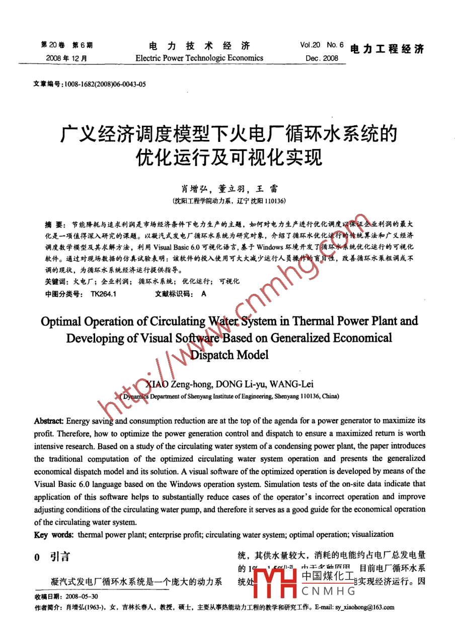 第20卷第6期電力技術(shù)經(jīng)濟(jì)Vol.20 No.6電力工程經(jīng)濟(jì)2008年12月Eletric Power Technologic EconomicsDec.2008文章編號(hào):1008-1682(2008)06-0043-05廣義經(jīng)濟(jì)調(diào)度模型下火電廠循環(huán)水系統(tǒng)的優(yōu)化運(yùn)行及可視化實(shí)現(xiàn)肖增弘,董立羽,王雷(沈陽工程學(xué)院動(dòng)力系,遼寧沈陽110136)摘要:節(jié)能降耗與追求利潤是市場經(jīng)濟(jì)條件下電力生產(chǎn)的主題,如何對(duì)電力生產(chǎn)進(jìn)行優(yōu)化調(diào)度以保證企業(yè)利潤的最大化是一項(xiàng)值得深入研究的課題。以凝汽式發(fā)電廠循環(huán)水系統(tǒng)為研究對(duì)象,介紹了循環(huán)水優(yōu)化運(yùn)行的傳統(tǒng)算法和廣義經(jīng)濟(jì)調(diào)度數(shù)學(xué)模型及其求解方法,利用Visual Basic 6.0可視化語言,基于Windows環(huán)境開發(fā)了循環(huán)水系統(tǒng)優(yōu)化運(yùn)行的可視化軟件。通過對(duì)現(xiàn)場數(shù)據(jù)的仿真試驗(yàn)表明:該軟件的投入使用可大大減少運(yùn)行人員操作的盲目性,改善循環(huán)水泵粗調(diào)或不調(diào)的現(xiàn)狀,為循環(huán)水系統(tǒng)經(jīng)濟(jì)運(yùn)行提供指導(dǎo)。關(guān)鍵詞:火電廠;企業(yè)利潤;循環(huán)水系統(tǒng);優(yōu)化運(yùn)行;可視化中圖分類號(hào): TK264.1文獻(xiàn)標(biāo)識(shí)碼: AOptimal Operation of Circulating Water System in Thermal Power Plant andDeveloping of Visual Software Based on Generalized EconomicalDispatch ModelXIAO Zeng-hong, DONG Li-yu, WANG-Lei(Dynamics Departmeat of Sbenyang Intitute of Engincering Shenyang 110136, China)Abstact: Energy saving and consumption reduction are at the top of the agenda for a power generator to maximize itsprofit. Therefore, how to optimize the power generation control and dispatch to ensure a maximized retum is worthintensive research. Based on a study of the circulating water system of a condensing power plant, the paper introducesthe traditional computation of the optimized circulating water system operation and presents the generalizedeconomical dispatch model and its solution. A visual software of the optimized operation is developed by means of theVisual Basic 6.0 language based on the Windows operation system. Simulation tests of the on- site data indicate thatapplication of this software helps to substantially reduce cases of the operator' s incorrect operation and improveadjusting conditions of the circulating water pump, and therefore it serves as a good guide for the economical operationof the circulating water system.Key words: thermal power plant; enterprise proft; circulating water system; optimal operation; visualization0引言統(tǒng),其供水量較大,消耗的電能約占電廠總發(fā)電量的小工安種盾田目前電廠循環(huán)水系凝汽式發(fā)電廠循環(huán)水系統(tǒng)是一個(gè)龐大的動(dòng)力 系統(tǒng)處中國煤化工實(shí)現(xiàn)經(jīng)濟(jì)運(yùn)行。因收稿日期: 2008-05-30YRCNMHG作者簡介:肖增弘(1963-), 女,吉林長春人,教授,碩士,主要從事熱能動(dòng)力工程的教學(xué)和研究工作。E-mail: sy. xiaobong@163.com43電力工程經(jīng)濟(jì)電力技術(shù)經(jīng)濟(jì)第20卷此,研究循環(huán)水系統(tǒng)的優(yōu)化運(yùn)行方式是提高電廠經(jīng)供電量減少;再者,單位發(fā)電燃料成本恒小于上網(wǎng)濟(jì)性的一項(xiàng)重要措施。電價(jià),即機(jī)組功率增量與循環(huán)水泵耗功增量兩者是本文以某電廠300 MW機(jī)組為例,對(duì)循環(huán)水系不等價(jià)的,由此引出了省煤和節(jié)電的價(jià)值比較問題。統(tǒng)的優(yōu)化運(yùn)行進(jìn)行了深人研究,開發(fā)了循環(huán)水系統(tǒng)因此,即使機(jī)組功率增量大于循環(huán)水泵耗功增量,優(yōu)化運(yùn)行的可視化軟件。有時(shí)也未必能給企業(yè)帶來效益。2.1廣 義經(jīng)濟(jì)調(diào)度的數(shù)學(xué)模型8刀1傳統(tǒng)經(jīng)濟(jì)調(diào)度模型下循環(huán)水系統(tǒng)的優(yōu)為了方便討論,這里只計(jì)算毛利潤,即只考慮化計(jì)算凹售電收人和發(fā)電燃料費(fèi)用2項(xiàng),暫不考慮其他費(fèi)用。可得如下公式:傳統(tǒng)的循環(huán)水系統(tǒng)的優(yōu)化運(yùn)行問題,實(shí)際上是對(duì)某一時(shí)刻,毛利潤為:尋求機(jī)組的最大凈功率。由于循環(huán)水系統(tǒng)較復(fù)雜,R=(N-N)x D-N,xbxDmx 10*(2)其優(yōu)化運(yùn)行不能孤立地僅針對(duì)某-部分,必須建立在另一時(shí)刻當(dāng)循環(huán)水泵運(yùn)行方式發(fā)生變化后,系統(tǒng)的數(shù)學(xué)模型進(jìn)行優(yōu)化求解4。毛利潤變?yōu)?假設(shè)此時(shí)負(fù)荷不變):眾所周知,增加循環(huán)水量會(huì)使汽輪機(jī)的凝汽器r=(N;-N')xD~-Ngxb' x D_x 10*(3)真空提高凹,使機(jī)組的發(fā)電量增加,但增加循環(huán)水量式中: R、r分別為某- -時(shí)刻毛利潤和某時(shí)刻循環(huán)水泵也會(huì)使循環(huán)水泵的耗電量增加,因此,兩者之間存運(yùn)行方式變化后的毛利潤,元/ h; N為機(jī)組發(fā)電量,在某個(gè)最佳值,使系統(tǒng)的凈功率最大。以兩者的差kW *h;N