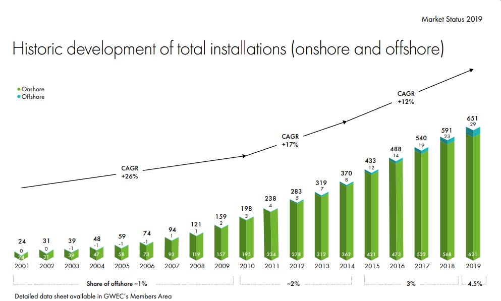 "The global installed wind capacity in 2019 was 60.4GW, an increase of 19% over 2018 and the second best year in the history of wind power. 2. Currently, the cumulative installed capacity of global wind energy is over 651GW, an increase of 10% over 2018. 3. China and the us remain the world's largest onshore wind markets, accounting for more than 60% of new installations in 2019. 4. Offshore wind power is playing an increasingly important role in driving global wind power installation, with a record 6.1GW of installed capacity in 2019, accounting for 10% of new installations. 5. The report identifies two key tools for further accelerating wind energy growth: the focus to support the long-term sustainability of the wind and renewable energy industries shifts from leveling the cost of kilowatt hour (LCOE) to the energy markets being built; And the adoption of emerging technological solutions, such as hybrid technology and green hydrogen (production), opens up new opportunities for the industry. 6.2020 is expected to be a record year for wind power, with GWEC forecasting 76GW of new installations. However, the full impact of covid-19 on wind installations remains unknown. GWEC will revise its 2020-2024 forecast based on COVID 19's potential impact on the global economy and energy markets, and will release an updated market outlook in the second quarter of 2020.
