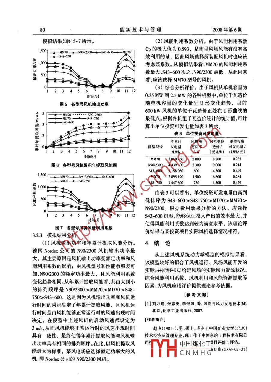 78能源技術(shù)與管理2008年第6期風(fēng)機(jī)選擇的系統(tǒng)動力學(xué)評價(jià)趙飛·衛(wèi)雅琦2趙健3(1中國京冶工程技術(shù)有限公司投賚管理部,北京10088:2中國礦業(yè)大學(xué)(北京),北京100083;3.中國人民解放軍防化指揮工程學(xué)院,北京102205)[摘要]風(fēng)機(jī)是風(fēng)力發(fā)電機(jī)組的重要組成部分,其性能的發(fā)揮直接影響到風(fēng)場資源的利用和風(fēng)能利用效率的高低。以風(fēng)場風(fēng)力資源狀況為基礎(chǔ),剖析了影響風(fēng)機(jī)工作的各個(gè)因素,并建立了風(fēng)機(jī)選擇的系統(tǒng)動力模型。利用 Vensim Ple(5.5b)軟件進(jìn)行仿真模擬,驗(yàn)證了模型的正確性,最后以德國 Nordex公司、德國 Repower公司和金風(fēng)科技公司生產(chǎn)的幾種風(fēng)機(jī)為例,對風(fēng)機(jī)機(jī)型選擇進(jìn)行了實(shí)證分析。[關(guān)鍵詞]系統(tǒng)動力學(xué);風(fēng)機(jī);評價(jià);可再生能源[中圖分類號]TK89[文獻(xiàn)標(biāo)識碼]A[文章編號]167294320080600784030引言是風(fēng)機(jī)所適用的風(fēng)場狀況,簡稱為風(fēng)場系統(tǒng),包括風(fēng)能資源、風(fēng)速地形海拔高度和大氣壓狀況;另在風(fēng)力發(fā)電中,風(fēng)機(jī)是風(fēng)力發(fā)電中最重要的一部分是風(fēng)機(jī)自身的特征、特性,簡稱為風(fēng)機(jī)系設(shè)備,對風(fēng)能的利用和風(fēng)電項(xiàng)日經(jīng)濟(jì)效益有直接統(tǒng),包括風(fēng)輪材料、風(fēng)輪長度、風(fēng)機(jī)角速度、風(fēng)機(jī)轉(zhuǎn)影響;又由于風(fēng)的特性是隨機(jī)的,風(fēng)向、風(fēng)速大小速等。模型分析的重點(diǎn)是在風(fēng)能資源利用充分、風(fēng)都是隨機(jī)在變化,風(fēng)機(jī)需具有變速運(yùn)行、功率調(diào)節(jié)能利用系數(shù)最大的情況下,選擇合適的現(xiàn)有風(fēng)機(jī)等功能,因此針對不同的風(fēng)力電場選擇合適的風(fēng)機(jī)型(在此不考慮風(fēng)機(jī)發(fā)電的經(jīng)濟(jì)性)。機(jī)設(shè)備成為風(fēng)力發(fā)電項(xiàng)目中的重要一環(huán)。22模型構(gòu)建1在風(fēng)機(jī)選擇方面應(yīng)用系統(tǒng)動力學(xué)分析22.1風(fēng)場系統(tǒng)的可行性及流程風(fēng)速隨高度變化而變化,地面粗糙度越大,這種變化就越大,風(fēng)速大小隨高度增大而非線性增1.1應(yīng)用系統(tǒng)動力學(xué)分析的可行性加。高度h處的風(fēng)速與高度h處的風(fēng)速關(guān)系為在風(fēng)機(jī)選擇評價(jià)中,所涉及的各因素不僅繁V(h)=V(wh)a多,而且部分因素之間互相影響。風(fēng)機(jī)選擇所涉及式中,V(h)為高度h處風(fēng)速,m;V為高度到的各因素之間的關(guān)系適宜用系統(tǒng)動力學(xué)的方法h處風(fēng)速,m;n為經(jīng)驗(yàn)指數(shù),由大氣穩(wěn)定度和地進(jìn)行描述和分析,剖析風(fēng)機(jī)運(yùn)行影響因素之間的面粗糙度決定范圍在1/2~18之間,一般取1/7相互作用關(guān)系,并在此基礎(chǔ)上建立系統(tǒng)動力學(xué)模在特定的地理環(huán)境下,同一風(fēng)場的大氣壓、大型,進(jìn)行模擬分析。氣密度隨海拔高度的增加而減小,此種因素關(guān)系1.2風(fēng)機(jī)選擇的系統(tǒng)動力學(xué)建模流程可利用系統(tǒng)動力學(xué)中的表函數(shù)加以表述;而影響首先,收集風(fēng)機(jī)、風(fēng)場等基礎(chǔ)資料,并對風(fēng)機(jī)、空氣動能的主要因素是風(fēng)速和大氣密度,隨著高風(fēng)場進(jìn)行系統(tǒng)分析,確定系統(tǒng)動力學(xué)的模擬邊界;度的上升,風(fēng)速增大,大氣密度減小,空氣動能與然后構(gòu)建風(fēng)機(jī)、風(fēng)場的系統(tǒng)動力學(xué)模型,設(shè)定模擬風(fēng)速之間成非線形關(guān)系。參數(shù)進(jìn)行模型模擬,并根據(jù)實(shí)際情況檢驗(yàn)?zāi)M結(jié)2.2.,2風(fēng)機(jī)系統(tǒng)果和修正模型;最后根據(jù)確定的模型進(jìn)行實(shí)證分析提出決策建議。機(jī)V凵中出煤化工為例,不的風(fēng)2模型構(gòu)建輪葉CNMHG利用系數(shù)曲線不同所以葉片數(shù)目應(yīng)根據(jù)風(fēng)力機(jī)的用途來確定,21系統(tǒng)邊界的界定要得到較大輸出轉(zhuǎn)矩的風(fēng)力機(jī),就需要較多的葉本文研究所涉及的對象分為兩部分:一部分片數(shù)。同時(shí)由于受葉片構(gòu)成材料、變速齒輪箱技術(shù)2008年第6期趙飛,等風(fēng)機(jī)選擇的系統(tǒng)動力學(xué)評價(jià)的限制,在風(fēng)機(jī)設(shè)計(jì)過程中要盡可能提高風(fēng)輪的(1)初始風(fēng)速根據(jù)某風(fēng)電場測定的10m高轉(zhuǎn)速減少葉片寬度、葉片數(shù)。從上述兩方面分析處風(fēng)力速度設(shè)定如表1所示大氣密度為12kgm,來看,要合理選擇葉片數(shù)目、葉片尺寸,使葉片的分析期為1a,風(fēng)機(jī)葉片數(shù)目為3(根據(jù)現(xiàn)有風(fēng)機(jī)幾何形式和轉(zhuǎn)速達(dá)到均衡狀態(tài)。機(jī)型設(shè)定)23模型參數(shù)的設(shè)定表1某風(fēng)電場10m高處月平均風(fēng)力速度測定風(fēng)速6845785,253.563.883.707.35819744757(2)風(fēng)機(jī)風(fēng)輪半徑、風(fēng)機(jī)額定功率根據(jù)不同風(fēng)機(jī)機(jī)型出廠時(shí)的參數(shù)分別加以確定;(3)測定風(fēng)場有效風(fēng)速3-25m范圍內(nèi)有效風(fēng)速小時(shí)數(shù),用表函數(shù)形式給出(月份,有效風(fēng)速