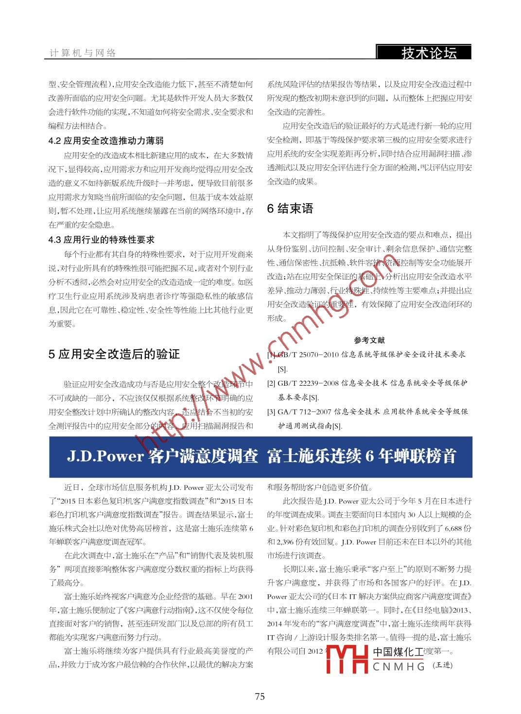 算機(jī)與網(wǎng)技術(shù)論壇應(yīng)用安全改造的要點(diǎn)與難點(diǎn)李陽(上海三零衛(wèi)士信息安全有限公司,上海200000[摘要]基于等級(jí)保護(hù)應(yīng)用安全的要求,結(jié)合應(yīng)用安全咨詢經(jīng)驗(yàn),分析了應(yīng)用安全主要問題點(diǎn),針對(duì)性的從應(yīng)用安全功能和應(yīng)用安全場(chǎng)景兩大維度提出了應(yīng)用安全改造的要點(diǎn),剖析了應(yīng)用安全改造整個(gè)過程中主要的難點(diǎn),并明確了應(yīng)用安全改造后的驗(yàn)證的重要性。[關(guān)鍵詞]應(yīng)用安全改造等級(jí)保護(hù)安全功能安全場(chǎng)景中圖分類號(hào):TN91508文獻(xiàn)標(biāo)識(shí)碼:A文章編號(hào):1008-1739(2015)16-73-3ain Points and Difficulties of Application Security reformLI Yang(Shanghai 30wish Information Security Co, Ltd, Shanghai 200000, ChinAbstract: Based on the requirement of classified protection application security, combined with application security consultingexperience, analyze the main problems, from the application security function and security scenario, put forward the main points of theapplication security reform, analyze the main difficulties in the whole process, and made clear the importance of the application securityverification after reformingKey words: application security; level protection; safety function; security scenario1引言2應(yīng)用安全主要問題點(diǎn)結(jié)合近幾年等級(jí)保護(hù)咨詢和客戶單位的等級(jí)測(cè)評(píng)結(jié)果分等級(jí)保護(hù)機(jī)制促進(jìn)了信息系統(tǒng)的安全保障,在應(yīng)用安全而如何進(jìn)行應(yīng)用安全改造成了系統(tǒng)安全責(zé)任單位應(yīng)用安全保下9個(gè)現(xiàn)狀,可發(fā)現(xiàn)當(dāng)前應(yīng)用安全的問題點(diǎn)主要集中在以析應(yīng)用安層面,提出了具體的基本要求,也明確了詳細(xì)的測(cè)評(píng)指標(biāo)身份鑒別,未實(shí)現(xiàn)雙因素身份鑒別機(jī)制和登錄失敗處理功障的薄弱環(huán)節(jié),缺乏系統(tǒng)性的應(yīng)用安全改造指導(dǎo)建議。同時(shí)應(yīng)用開發(fā)商在面對(duì)已發(fā)現(xiàn)的應(yīng)用安全風(fēng)險(xiǎn)和不足點(diǎn)時(shí),也缺應(yīng)用安全改造方向,在進(jìn)行應(yīng)用安全改造時(shí),無法有效的判訪問控制,對(duì)重要信息資源未設(shè)置敏感標(biāo)記及嚴(yán)格控制用戶相關(guān)操作;斷應(yīng)用安全改造的可行性和價(jià)值,加上多種新型應(yīng)用環(huán)境的安全審計(jì),僅實(shí)現(xiàn)用戶登錄登出操作記錄,未實(shí)現(xiàn)用戶大出現(xiàn),進(jìn)一步加大了應(yīng)用安全改造的難點(diǎn)和深度。本文為本人容性操作的審計(jì)報(bào)表憑借近些年有關(guān)網(wǎng)絡(luò)信息安全方面的咨詢經(jīng)驗(yàn),尤其是等級(jí)剩余信息保護(hù),未有效進(jìn)行空間釋放及信息清除保護(hù)建設(shè)與整改的經(jīng)歷,結(jié)合對(duì)等級(jí)保護(hù)基本要求中應(yīng)用安通信完整性,未采用密碼技術(shù)保證通信過程中數(shù)據(jù)的完整全層面的深度理解,分析總結(jié)出有關(guān)應(yīng)用安全改造的要點(diǎn)和難點(diǎn),尤其在改造要點(diǎn)方面針對(duì)主要問題點(diǎn)逐一展開安全功通信保密性,未實(shí)現(xiàn)對(duì)整個(gè)報(bào)文及會(huì)話過程加密能的實(shí)現(xiàn)論述。整篇文章可供安全責(zé)任單位、應(yīng)用開發(fā)商及安抗抵賴方面,未實(shí)現(xiàn)有關(guān)數(shù)據(jù)原發(fā)和接接收的數(shù)據(jù)原發(fā)證全咨詢機(jī)構(gòu)等單位在應(yīng)用安全改造環(huán)節(jié)時(shí)參考。據(jù)的功能軟件容錯(cuò)定稿日期:2015-07-26TH中國煤化工時(shí),應(yīng)用系統(tǒng)無CNMHG技術(shù)論壇算機(jī)與網(wǎng)絡(luò)資源控制,缺乏對(duì)應(yīng)用系統(tǒng)的最大并發(fā)會(huì)話連接數(shù)、單個(gè)操作,保證應(yīng)用系統(tǒng)按照安全策略進(jìn)行了合理、正確的訪間控賬戶的多重并發(fā)會(huì)話數(shù)以及一個(gè)時(shí)間段內(nèi)可能的并發(fā)會(huì)話連制配置接數(shù)的限制;對(duì)資源分配未設(shè)置最大限額和最小限額;未實(shí)現(xiàn)3.1.3安全審計(jì)根據(jù)服務(wù)優(yōu)先級(jí)分配系統(tǒng)資源。為了保持對(duì)應(yīng)用系統(tǒng)的運(yùn)行情況以及系統(tǒng)用戶行為的跟蹤,以便事后追蹤分析,安全審計(jì)功能實(shí)現(xiàn)必不可少。然而應(yīng)3應(yīng)用安全改造要點(diǎn)用系統(tǒng)開發(fā)時(shí),基本上都不會(huì)開發(fā)應(yīng)用系統(tǒng)自身的日志及審計(jì)功能模塊,用來對(duì)應(yīng)用用戶的各種行為、操作進(jìn)行記錄和審應(yīng)用系統(tǒng)面臨的風(fēng)險(xiǎn)是來自多方面的,不僅來自于應(yīng)用計(jì),或者對(duì)應(yīng)用用戶僅記錄登錄、登出等登錄信息。而且目前軟件自身、所依托的支撐平合(包括服務(wù)器操作系統(tǒng)、網(wǎng)絡(luò)平市場(chǎng)上的安全審計(jì)類產(chǎn)品,大部分都是針對(duì)網(wǎng)絡(luò)、操作系統(tǒng)和臺(tái)和支撐軟件等),在客戶端、應(yīng)用協(xié)議等方面,風(fēng)險(xiǎn)也是無所數(shù)據(jù)庫這類標(biāo)準(zhǔn)件、成熟產(chǎn)品的,針對(duì)個(gè)性化很強(qiáng)的應(yīng)用系統(tǒng)不在的;加之移動(dòng)應(yīng)用、云服務(wù)等新技術(shù)的誕生與