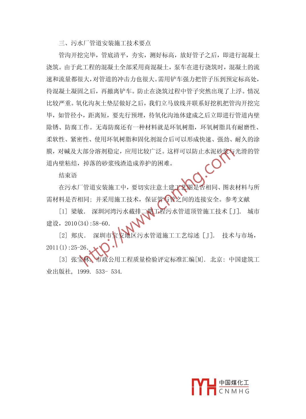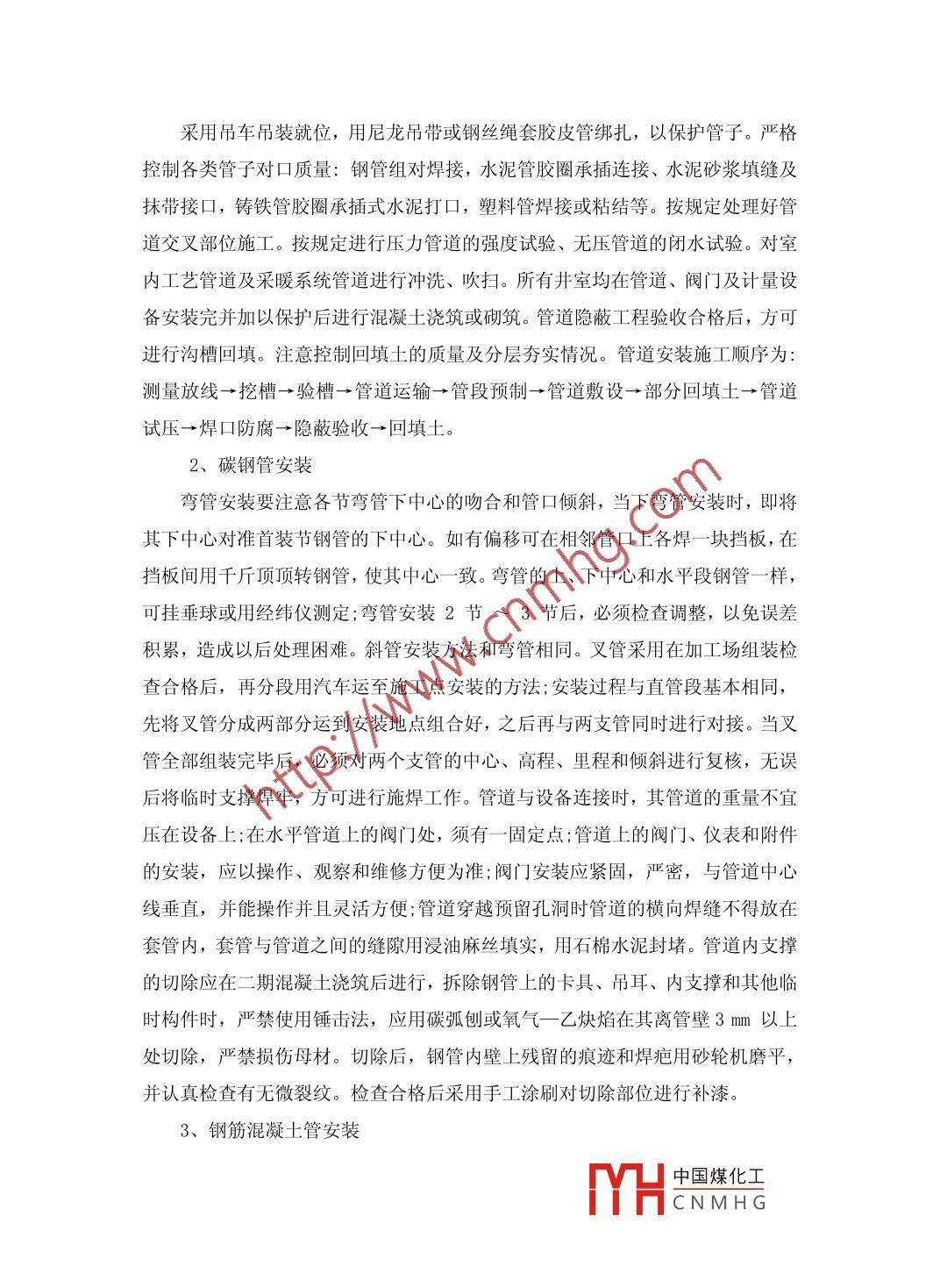 污水廠管道安裝施工技術研究李曉翔河北省安裝工程有限公司河北050031摘要:污水廠管道安裝施工中地質條件復雜,深基坑管溝開挖及支護難度較大,要大力研究其施工技術,進行總結歸納,并在污水廠管道安裝施工中進行嚴格控制。關鍵詞:污水處理工程,工藝管道,安裝施工技術中圖分類號: TU74 文獻標識碼: A文章編號:前言污水廠的建設對于城市的正常運轉,城市的經(jīng)濟發(fā)展、人民生活質量都有著直接關聯(lián)。但污水廠管道施工地質條件復雜,深基坑管溝開挖及支護難度較大等特點,這就需要對污水廠管道安裝施工技術進行研究。一、技術準備階段工程開工前,項目部組織各專業(yè)技術人員對各項施工文件和有關資料進行認真研究,由于管線較錯綜復雜,均勻布整個場區(qū),對平面位置和高程精度要求高,測量工作質量直接影響工程質量,測量工作是本工程重點控制環(huán)節(jié)。根據(jù)現(xiàn)場調(diào)查和施工圖紙,編制施工組織總設計,對每-一個具體的單位工程制定詳細的施工方案,并編制好作業(yè)指導書,進行圖紙會審,編制施工預算和材料計劃,編制施工進度計劃,合理安排場地,做好現(xiàn)場道路、臨建房、臨時用電、臨時用水、雨季排水等技術準備工作,確保施工能夠順利進行。工程剛剛開始主要是構筑物的建設,所以我們管道專業(yè)的工作主要是配合土建工種確定各種管道在各種構筑物池壁及底板等處預留孔洞及套管位置、尺寸,管道支吊架、在池壁上的預留位置,固定卡預留位置等。按照材料的品種性能和設計要求,對照相應的規(guī)范,檢查進場材料的外觀質量、性能參數(shù)等,經(jīng)檢查合格后,報安裝監(jiān)理驗收達標后方能用于工程施工。二、管道施工階段水廠管道施工多是在廠房及水處理構筑物完成后開始,受現(xiàn)場條件限制,施工用管材、設備的存放場地距作業(yè)點可能較遠,運輸?shù)缆芬苍S不便。1、預制管安裝與鋪設中國煤化工MHCNMH G采用吊車吊裝就位,用尼龍吊帶或鋼絲繩套膠皮管綁扎,以保護管子。嚴格控制各類管子對口質量:鋼管組對焊接,水泥管膠圈承插連接、水泥砂漿填縫及抹帶接口,鑄鐵管膠圈承插式水泥打口,塑料管焊接或粘結等。按規(guī)定處理好管道交叉部位施工。按規(guī)定進行壓力管道的強度試驗、無壓管道的閉水試驗。對室內(nèi)工藝管道及采暖系統(tǒng)管道進行沖洗、吹掃。所有井室均在管道、閥門及計量設備安裝完并加以保護后進行混凝土澆筑或砌筑。管道隱蔽工程驗收合格后,方可.進行溝槽回填。注意控制回填土的質量及分層夯實情況。管道安裝施工順序為:測量放線→挖槽→驗槽→管道運輸→管段預制→管道敷設→部分回填土→管道試壓→焊口防腐→隱蔽驗收-→回填土。2、碳鋼管安裝彎管安裝要注意各節(jié)彎管下中心的吻合和管口傾斜,當下彎管安裝時,即將其下中心對準首裝節(jié)鋼管的下中心。如有偏移可在相鄰管口上各焊-塊擋板,在擋板間用千斤頂頂轉鋼管,使其中心一致。彎管的上、下中心和水平段鋼管一樣,可掛垂球或用經(jīng)緯儀測定;彎管安裝2節(jié)~ 3節(jié)后,必須檢查調(diào)整,以免誤差積累,造成以后處理困難。斜管安裝方法和彎管相同。叉管采用在加工場組裝檢查合格后,再分段用汽車運至施工點安裝的方法;安裝過程與直管段基本相同,先將叉管分成兩部分運到安裝地點組合好,之后再與兩支管同時進行對接。當叉管全部組裝完畢后,必須對兩個支管的中心、高程、里程和傾斜進行復核,無誤后將臨時支撐焊牢,方可進行施焊工作。管道與設備連接時,其管道的重量不宜壓在設備.上;在水平管道上的閥門處,須有-固定點;管道上的閥門、儀表和附件的安裝,應以操作、觀察和維修方便為準;閥門安裝應緊固,嚴密,與管道中心線垂直,并能操作并且靈活方便;管道穿越預留孔洞時管道的橫向焊縫不得放在套管內(nèi),套管與管道之間的縫隙用浸油麻絲填實,用石棉水泥封堵。管道內(nèi)支撐的切除應在二期混凝土澆筑后進行,拆除鋼管上的卡具、吊耳、內(nèi)支撐和其他臨時構件時,嚴禁使用錘擊法,應用碳弧刨或氧氣一乙炔焰在其離管壁3 mm以上處切除,嚴禁損傷母材。切除后,鋼管內(nèi)壁上殘留的痕跡和焊疤用砂輪機磨平,并認真檢查有無微裂紋。檢查合格后采用手工涂刷對切除部位進行補漆。3、鋼筋混凝士管安裝中國煤化工MHCNMH G檢查埋管溝槽底基礎符合安裝條件后,對鋼筋混凝土管進行吊裝就位埋設工作。每根管的長度不應超過2. 5m, 管的實際內(nèi)徑與規(guī)定直徑的差距不應超過6% ~ 3%。 管壁任意一點徑向厚度不應小于設計壁厚的95%, 且不應超過立方抗壓強度試驗管的平均管壁厚度的105%。 鋼筋混凝士管安裝時,宜從下游開始,平口朝向施工前進方向,并將每一-管口對接緊密,按設計要求做好每一節(jié)管接 口處的橡膠止水圈的安裝工作。管道內(nèi)表面應保持光滑,任何突出的骨料必須清除。不允許設置提升孔,應采用吊索起吊每節(jié)管。鋼筋混凝土管管道采用金屬構件連接時,構件必須進行防腐處理。用水泥砂漿填縫、抹帶接口時應清除落入管道內(nèi)的接口材料,且抹帶的材質、高度和寬度必須符合設計要求。4、鋼管道防腐按設計要求進行鋼質管道的內(nèi)、外防腐工作。防腐前管壁處理應驗收合格,防腐過程中控制