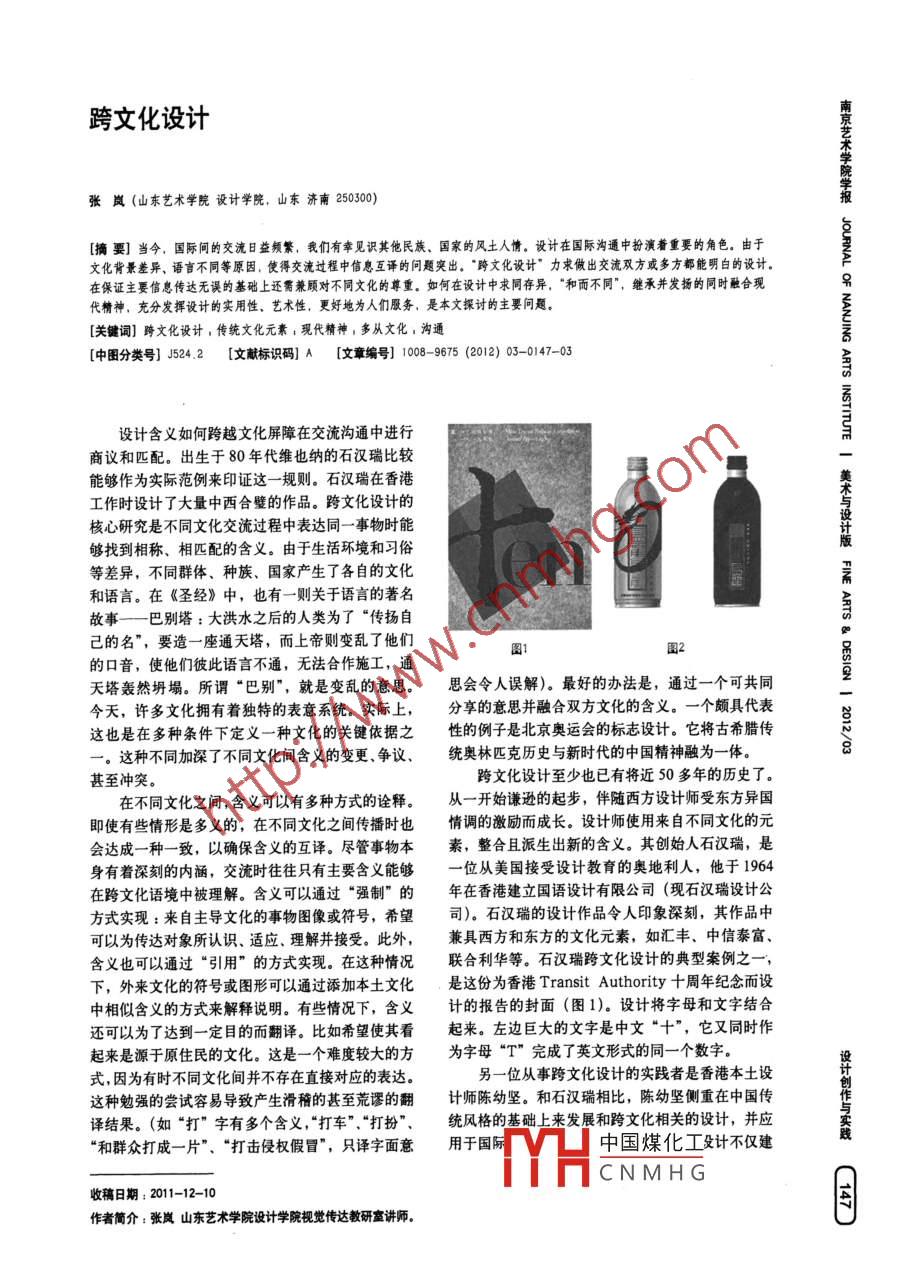 跨文化設(shè)計(jì)張嵐(山東藝術(shù)學(xué)院設(shè)計(jì)學(xué)院,山東濟(jì)南250300)[撟要]當(dāng)今,國際間的交流日益頻繁,我們有幸見識(shí)其他民族、國家的風(fēng)土人情。設(shè)計(jì)在國際溝通中扮演著重要的角色。由于文化背景差異、語言不同等原因,使得交流過程中信息互譯的問題突出?!翱缥幕O(shè)計(jì)”力求做出交流雙方或多方都能明白的設(shè)計(jì)。在保證主要信息傳達(dá)無誤的基礎(chǔ)上還需兼顧對(duì)不同文化的尊重。如何在設(shè)計(jì)中求同存異,“和而不同", 繼承并發(fā)揚(yáng)的同時(shí)融合現(xiàn)代精神,充分發(fā)揮設(shè)計(jì)的實(shí)用性、藝術(shù)性, 更好地為人們服務(wù),是本文探討的主要問題。.[關(guān)鍵詞]跨文化設(shè)計(jì),傳統(tǒng)文化元素,現(xiàn)代精神I多從文化、溝通[中團(tuán)分類號(hào)] J524.2 [文獻(xiàn)標(biāo)識(shí)碼] A [文章編號(hào)] 1008-9675 (2012) 03-0147-03設(shè)計(jì)含義如何跨越文化屏障在交流溝通中進(jìn)行商議和匹配。出生于80年代維也納的石漢瑞比較能夠作為實(shí)際范例來印證這一-規(guī)則。 石漢瑞在香港工作時(shí)設(shè)計(jì)了大量中西合璧的作品??缥幕O(shè)計(jì)的核心研究是不同文化交流過程中表達(dá)同- - 事物時(shí)能夠找到相稱、相匹配的含義。由于生活環(huán)境和習(xí)俗等差異,不同群體、種族、國家產(chǎn)生了各自的文化和語言。在《圣經(jīng)》中,也有一則關(guān)于語言的著名故事--巴別塔:大洪水之后的人類為了 “傳揚(yáng)自己的名”,要造一座通天塔,而上帝則變亂了他們?nèi)?圍2的口音,使他們彼此語言不通,無法合作施工,通天塔轟然坍塌。所謂“巴別”,就是變亂的意思。思會(huì)令人誤解)。最好的辦法是,通過-一個(gè)可共同今天,許多文化擁有著獨(dú)特的表意系統(tǒng)。實(shí)際上,分享的意思并融合雙方文化的含義。一個(gè)頗具代表這也是在多種條件下定義一種文化的關(guān)鍵依據(jù)之性的例子是北京奧運(yùn)會(huì)的標(biāo)志設(shè)計(jì)。它將古希臘傳一。這種不同加深了不同文化間含義的變更、爭議、統(tǒng)奧林匹克歷史與新時(shí)代的中國精神融為- -體。2甚至沖突。跨文化設(shè)計(jì)至少也已有將近50多年的歷史了。在不同文化之間,含義可以有多種方式的詮釋。從一開始謙遜的起步,伴隨西方設(shè)計(jì)師受東方異國即使有些情形是多義的,在不同文化之間傳播時(shí)也情調(diào)的激勵(lì)而成長。設(shè)計(jì)師使用來自不同文化的元會(huì)達(dá)成- -種-致,以確保含義的互譯。盡管事物本素,整合且派生出新的含義。其創(chuàng)始人石漢瑞,是身有著深刻的內(nèi)涵,交流時(shí)往往只有主要含義能夠一位從美國接受設(shè)計(jì)教育的奧地利人,他于1964在跨文化語境中被理解。含義可以通過“強(qiáng)制”的年在香港建立國語設(shè)計(jì)有限公司(現(xiàn)石漢瑞設(shè)計(jì)公方式實(shí)現(xiàn):來自主導(dǎo)文化的事物圖像或符號(hào),希望司)。石漢瑞的設(shè)計(jì)作品令人印象深刻,其作品中可以為傳達(dá)對(duì)象所認(rèn)識(shí)、適應(yīng)、理解并接受。此外,兼具西方和東方的文化元素,如匯豐、中信泰富、含義也可以通過“引用”的方式實(shí)現(xiàn)。在這種情況聯(lián)合利華等。石漢瑞跨文化設(shè)計(jì)的典型案例之一,下,外來文化的符號(hào)或圖形可以通過添加本土文化是這份為香港Transit Authority +周年紀(jì)念而設(shè)中相似含義的方式來解釋說明。有些情況下,含義計(jì)的報(bào)告的封面(圖1)。設(shè)計(jì)將字母和文字結(jié)合還可以為了達(dá)到一定目的而翻譯。比如希望使其看起來。左邊巨大的文字是中文“十”,它又同時(shí)作起來是源于原住民的文化。這是一個(gè)難度較大的方為字母“T” 完成了英文形式的同-一個(gè)數(shù)字。式,因?yàn)橛袝r(shí)不同文化間并不存在直接對(duì)應(yīng)的表達(dá)。另一位從事跨文化設(shè)計(jì)的實(shí)踐者是香港本土設(shè)這種勉強(qiáng)的嘗試容易導(dǎo)致產(chǎn)生滑稽的甚至荒謬的翻計(jì)師陳幼堅(jiān)。和石漢瑞相比,陳幼堅(jiān)側(cè)重在中國傳譯結(jié)果。(如“打"字有多個(gè)含義,“打車”.“打扮”、統(tǒng)風(fēng)格的基礎(chǔ)上來發(fā)展和跨文化相關(guān)的設(shè)計(jì),并應(yīng)“和群眾打成- -片"、“打擊侵權(quán)假冒”,只譯字面意中國煤化工殳計(jì)不僅建YHCNMHG收稿日期: 2011-12-10作者簡介:張嵐山東藝術(shù)學(xué)院設(shè)計(jì)學(xué)院枧覺傳達(dá)教研室講師。Bejing2002奇圖4?83號(hào)Bejing 2002立在對(duì)中國傳統(tǒng)風(fēng)格的尊敬之上,還融合了某些西Beyjing 2002900方的模式,采用人們耳熟能詳?shù)膱D像,將傳統(tǒng)風(fēng)格圖圖6和現(xiàn)代風(fēng)格相結(jié)合。比如陳幼堅(jiān)為一款烏龍茶口味的軟飲料系列形式與體育運(yùn)動(dòng)特征結(jié)合起來,巧妙地幻化成-一個(gè)(圖2),便使用了承載著悠久歷史文化的龍形圖案。向前奔跑、迎接勝利的運(yùn)動(dòng)人形。通過中國印、中其形象簡潔、大氣,極富動(dòng)感,接近漢代的表現(xiàn)方國字和五環(huán)徽的結(jié)合,表達(dá)13億中國人對(duì)于奧林式,距今已有4000年的歷史。匹克運(yùn)動(dòng)