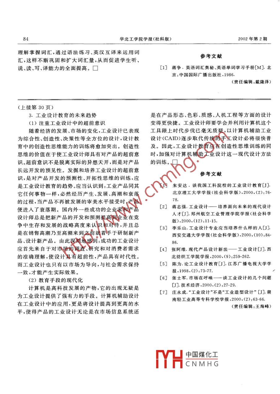 華北工學院學報(社科版)8JOURNAL OF NORTH CHINA INSTITUTE OF TECHNOLOGY(Social Sciences)2002年第2期工業(yè)設計與工業(yè)設計教育王俊元王旭東段能全(華北工學院機械工程系.山西太原030051)摘要:針對我國工業(yè)領域對工業(yè)設計的模糊認識,闡述了工業(yè)設計的產(chǎn)生、內涵。在此基礎上,指出工業(yè)設計的本質是產(chǎn)品設計,產(chǎn)品設計應遵循實用、經(jīng)濟、美觀的設計原則。其次,論述了工業(yè)設計的作用。最后,結合進行工業(yè)設計專業(yè)建設的實際,分析了工業(yè)設計教育的發(fā)展過程、教育特征、教育模式和未來趨勢。關鍵詞:工業(yè)設計;產(chǎn)品設計:工業(yè)設計教育中圖分類號:TB47文獻標識碼:A文章編號: 1009-4520(2002)02-0028-04Industrial Design and Industrial Designing EducationWANG Jun-yuan, WANG Xu-dong &. DUAN Neng quan(Dept. of Mechanical Engineering, North China instiute of Technology, 030051 Taiyuan)Abstract: To clarify the obscure cognition of industrial design in industry field, this paper discusses thegeneration and intension of industrial design. As the essence of industrial design,product design must obey thepractical, economical and beautiful rules. Besides, it discusses the efect of industrial design. Combining thepractices of constructing industrial design major, it analyzes the development,characteristics, patterns and fu-ture trends of industrial designing education.Keywords : industrial design; product design; industrial designing education引言設計教育,這是已經(jīng)開設和正在建立該專業(yè)的工科越來越多的人認識到:未來的競爭是高科技的院校所共同關心的問題。筆者結合近年來進行工業(yè)競爭。高科技只有通過工業(yè)設計才能變成商品,才有設計專業(yè)建設的體會,就工業(yè)設計及其教育談幾點競爭力。而工業(yè)設計人才的培養(yǎng)在于工業(yè)設計的教個人的認識與看法。育。從這一點看,一個國家的工業(yè)設計教育水平如何一、工業(yè)設計的產(chǎn)生將直接影響到這個國家的工業(yè)設計的發(fā)展。在18世紀末和19世紀初的產(chǎn)業(yè)革命以后,隨工業(yè)設計教育進人我國的年頭還不長,較有規(guī)著生產(chǎn)制造方式的變革,工業(yè)設計應運而生.工業(yè)設模地開展工業(yè)設計教育僅有十多年。國家教育部對計是一門專門研究工業(yè)產(chǎn)品在“人一機(產(chǎn)普通高校專業(yè)目錄的調整使許多院校為了機械類學品)--環(huán)境 ”系統(tǒng)中如何尋求最優(yōu)化的學科。它把科的發(fā)展,把目光對準了工業(yè)設計專業(yè),又一次掀起產(chǎn)品置于“人、社會環(huán)境和自然環(huán)境”的設計環(huán)境中,了建立工業(yè)設計專業(yè)的高潮。工業(yè)設計是技術與藝探求中國煤化工t會的需求和自然環(huán)術相交匯的一個學科,可在工科院校里開設,也可在境的YHCNMHG藝術院校里開設。在我國工科院校應如何開展工業(yè)工業(yè)設計產(chǎn)生的主要目的是針對工業(yè)化以來存收稿日期:2001-12-04作者簡介:王俊元(1968-),男,山西繁峙人,在讀工學博士,講師。2002年第2期工業(yè)設計與工業(yè)設計教育(王俊元等)29在的“以機器為本”和“以無限享受”為目的的生產(chǎn)方- - ,美觀第二,經(jīng)濟是約束條件,但這并不是說美觀式的弊病和缺陷,提出“以人為本”和“以自然為本”就不重要,因為美實在是一.種擋不住的誘惑;除非產(chǎn)的技術哲學觀,探索人與物的關系,規(guī)劃設計未來的品在市場上供不應求,只要有一點選擇余地,人們就工作概念、生活概念、交通概念、能源概念,在這種長會貨比三家,選擇精致、耐用、美觀的產(chǎn)品。遠規(guī)劃的考慮下設計各種具體產(chǎn)品和環(huán)境。(3)產(chǎn)品設計必須以人為中心.隨著科技的發(fā)展和社會的進步,工業(yè)設計在現(xiàn)早在20世紀初,工業(yè)設計的創(chuàng)始人瓦爾特●格代社會中的作用日趨重要。羅皮烏斯就提出“設計的目的是人而不是產(chǎn)品”的基二、工業(yè)設計的內涵本原則,人體尺寸是工業(yè)設計最重要的參考系。不同工業(yè)設計的對象是工業(yè)機械化生產(chǎn)出來的批量國家和地區(qū)人體尺寸不同,因此在設計和引進國外產(chǎn)品,不是手工業(yè)生產(chǎn)的產(chǎn)品;設計的內容或工作任產(chǎn)品時,應充分考慮不同地區(qū)人體尺寸的差異,以人務是賦予工業(yè)產(chǎn)品在材料、結構、構造、色彩、表面加.的需要作為新產(chǎn)品設計的出發(fā)點。成功的創(chuàng)新來自工以及裝飾方面以新的品質和規(guī)格。于切實滿足人的需要。工業(yè)設計的核心是產(chǎn)品設計,從某種意義上說(4)產(chǎn)品設計必須要有創(chuàng)新意識它是領域擴大了的產(chǎn)品設計,它既包含了科學技術-件成功的工業(yè)設計產(chǎn)品,必須符合“實用、經(jīng)知識,又涉及了文化藝術內涵,因此,總的說來,它屬濟、美觀”的設計原則,此外,還必須有創(chuàng)新意識。設于文化范疇,是- -種發(fā)展產(chǎn)品的文化。計時,要避免接觸任何固定的風格式樣,使設計人員從學科角度講,工業(yè)設計是吸收了社會、人文、從固定形式的束縛中解放出來,從個人體驗中創(chuàng)造經(jīng)濟等方面的成果,涉及創(chuàng)造學、市場學、生態(tài)學、應出自已的新穎風格。因為,只有創(chuàng)造出具有獨特藝術用技術及人機工程學等領域橫向交叉聯(lián)