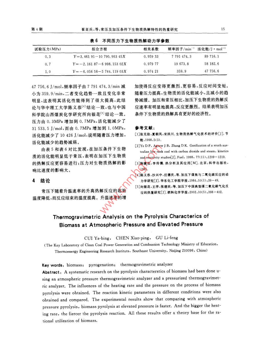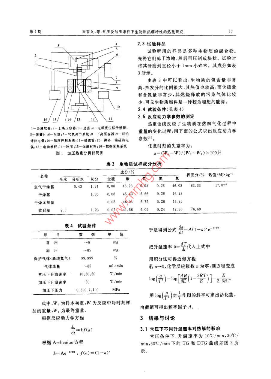第35卷第1期鍋爐技術(shù)Vol. 35,No. 42004年7月BOILER TECHNOLOGYJul. ,2004文章編號: CN31 - 1508(2004)04 - 0012 -04常壓及加壓條件下生物質(zhì)熱解特性的熱重研究崔亞兵,陳曉平,顧利鋒(東南大學(xué)潔凈煤發(fā)電及燃燒技術(shù)教育部重點(diǎn)實(shí)驗(yàn)室,江蘇南京210096)關(guān)鍵詞:生物質(zhì):熱解;熱重分析儀摘要:在常壓熱重分析儀和自行研制的加壓熱重分析儀上進(jìn)行了生物質(zhì)熱解特性的系統(tǒng)研究,得到了升溫速率、壓力等因索對生物質(zhì)熱解過程的影響規(guī)律。對不同試驗(yàn)條件下的反應(yīng)動(dòng)力學(xué)參數(shù)進(jìn)行了求解和比較,并作了機(jī)理分析。試驗(yàn)表明:與常壓熱解相比,在加壓條件下,生物質(zhì)的反應(yīng)速率有明顯提高;隨著升溫速率的增加,熱解反應(yīng)趨于更加激烈。上述研究結(jié)果為生物質(zhì)的合理利用提供了一定的理論基礎(chǔ)。中團(tuán)分類號: X37文獻(xiàn)標(biāo)識碼: A1前言2試驗(yàn)裝置生物質(zhì)燃料是一-種最古老、存在最廣泛的可2.1常壓熱重試驗(yàn)技術(shù)數(shù)據(jù)再生能源,它具有二氧化碳零排放的突出優(yōu)點(diǎn)。常壓熱重試驗(yàn)采用法國Setaram 公司的我國農(nóng)村每年產(chǎn)生各類秸稈6.2億t,林業(yè)每年TGA92型熱重一差熱分析儀,可獲得試樣的熱有木材殘余物1 620萬m' ,它們構(gòu)成了巨大的生重曲線、微商熱重曲線、差熱曲線和熱流曲線。物質(zhì)能源資料。到目前為止,被作為能源利用的主要技術(shù)數(shù)據(jù)如下,見表1。生物質(zhì)還不到其總量的1%,但它們卻已提供了表1常壓熱重試驗(yàn)技術(shù)數(shù)據(jù)世界總能耗的15%”。由于煤、石油和天然氣等項(xiàng)目,數(shù)據(jù)單位不可再生資源儲量的日益減少,以及世人對燃料熱天平精度0.1μ燃燒后生成的溫室效應(yīng)氣體CO2的日趨關(guān)注,而最大試樣量200m溫度精度土2C生物質(zhì)燃料有其所特有的二氧化碳零排放的突出優(yōu)點(diǎn),所以有關(guān)生物質(zhì)燃料的合理利用已提到溫度范圍室溫~1 600試驗(yàn)氣氛情性氣體日程上來。生物質(zhì)燃料要成為煤和石油等礦物升溫速率0.01~99. 99C /min燃料的替代品,其關(guān)鍵之處是將低品位的生物質(zhì)2.2加壓熱重分析儀簡圖及技術(shù)數(shù)據(jù)能轉(zhuǎn)換成高品位的能源(21。因而,研究生物質(zhì)的加壓熱重試驗(yàn)在自行研制的加壓熱重天平熱解及氣化特性顯得尤為重要。目前,國內(nèi)有關(guān)生物質(zhì)熱解及氣化特性研究上進(jìn)行,圖1所示為加壓熱重分析儀簡圖。.的報(bào)道雖已有一-定數(shù)量,但基本都是常壓的。本主要技術(shù)數(shù)據(jù),見表2。文在常壓熱重天平和自行研制的加壓熱重天平表2加壓熱重技術(shù)數(shù)據(jù)上對生物質(zhì)燃料的熱解特性進(jìn)行了大量的試驗(yàn)項(xiàng)目研究。系統(tǒng)研究了壓力、升溫速率等因素對生物熱天平精度 .1g質(zhì)熱解的影響規(guī)律,對不同試驗(yàn)條件下的反應(yīng)動(dòng)最大試樣重量250力學(xué)參數(shù)進(jìn)行了求解和比較,并作了機(jī)理分析。室溫~1 400.上述研究結(jié)果為生物質(zhì)燃料的合理利用提供了5~80一定的理論基礎(chǔ)。壓力(表壓)范圍0~1.4MPa收稿日期:2003-11-03;修回日期:2003-12-12基金項(xiàng)目:高等學(xué)校骨f教師資助計(jì)劃資助項(xiàng)目(3150051047)作者簡介:崔亞兵(1979 -).男,東南大學(xué)熱能工程研究所碩士研究生。第4期崔亞兵,等:常壓及加壓條件下生物質(zhì)熱解特性的熱重研究32.3試驗(yàn)樣品_3試驗(yàn)所用的樣品是多種生物質(zhì)的混合物。26先將它們涼干濃縮,然后再壓制成塊狀。試驗(yàn)時(shí)1將其研磨到直徑小于1mm小碎末。其成分如表3所示。由表3中可以看出,生物質(zhì)的氫含量非常9高,揮發(fā)分的比例很大,其熱值也較高,而含硫量和含氮量非常少,其燃燒釋放的污染氣體比較少,可見生物質(zhì)燃料是-種較為理想的能源。102.4試驗(yàn)條件(見表4)2.5反應(yīng)動(dòng)力學(xué)參數(shù)的測定16/ 15/ 14 1312\ 11熱重曲線反應(yīng)了生物質(zhì)在熱解氣化過程中1-.金屬軟管:2-上高壓容器:3-迷官:4-電渦流位移傳感器,重量的變化過程,用下面的公式求出反應(yīng)動(dòng)力學(xué)5-彈簧片16-吊籃;7-氣氛調(diào)節(jié)系統(tǒng):8-下高壓容器:9-雙鉑參數(shù)!8!。銠熱電偶;10-溫度控制系統(tǒng)11-硅碳管:12- -鎳鉻-鎳硅熱電偶;13-電動(dòng)推桿:14-剛玉15-保溫材料16-數(shù)據(jù)采集系統(tǒng)任意時(shí)刻的失重率為:圖1加壓熱重分析儀簡圖a=(W。- . W)/(W。- W;)X 100%表3生物質(zhì)試樣成分分析成分/%名稱揮發(fā)分1%熱值/MJj.kg全水分析水灰分全硫氫空氣干燥基0.431. 340.08 45.23 6.63 0.26 46.0383. 3317. 07干燥基1. 350. 0845.436.66 0.2646.23干燥無灰基0.0846.046.75 0. 2646. 86收到基8.51.230.0741.56 6.09 0.2442.3076.69表4試驗(yàn)條件于是得到公式=A(1-a)"e-ERT項(xiàng)目數(shù)捷單位常壓~6mg把升溫速率β=工代人上式中加壓~85保護(hù)氣體(高純氮?dú)?99. 999%用積分法可得近似方程氣體流量ml/ min若a→0,化學(xué)反應(yīng)級數(shù)n為零,則方程變成常壓下升溫速率10,30.60C /minE加壓下升溫速率20C/minlo(號)=log[能(1-1 )]-2.3RT加壓下壓力0.3.0.7.1.0MPa用log(號)對工作圖的斜率可求出活化能,式中,W。為樣本初重,W為反應(yīng)中每時(shí)刻樣由截距