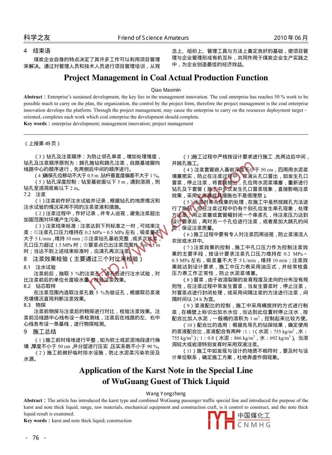 科學(xué)之友F riend of S cience Amateurs2010年06月項(xiàng)目管理在煤炭實(shí)際生產(chǎn)中的作用喬茂民(兗州煤業(yè)股份有限公司煤質(zhì)運(yùn)銷(xiāo)部,山東日照276826)摘要:企業(yè)的持續(xù)發(fā)展,關(guān)鍵在于管理創(chuàng)新。煤炭企業(yè)更有多達(dá)50 %的工作可以以項(xiàng)目的形式進(jìn)行計(jì)劃、組織、控制,因此項(xiàng)目管理是煤炭企業(yè)創(chuàng)新發(fā)展的平臺(tái)。通過(guò)項(xiàng)目管理,可以使企業(yè)有針對(duì)性地進(jìn)行資源配置,完成煤炭企業(yè)發(fā)展應(yīng)完成的各項(xiàng)工作。關(guān)鍵詞:企業(yè)發(fā)展;管理創(chuàng)新;項(xiàng)目管理中圖分類(lèi)號(hào):F425文獻(xiàn)標(biāo)識(shí)碼:A 文章編號(hào) : 1000- 8136(2010) 18- 0075 -021煤炭生產(chǎn)企業(yè)的特點(diǎn)除_上述直接具有項(xiàng)目特征的管理工作外,在煤炭企業(yè)中還煤炭企業(yè)屬采掘業(yè),是以天然資源為勞動(dòng)對(duì)象,有如下基有許多工作也可按項(xiàng)目進(jìn)行管理,如煤炭質(zhì)量提高、新生產(chǎn)工藝的引進(jìn)等等。本特征:(1)礦山地質(zhì)條件復(fù)雜,生產(chǎn)過(guò)程中不可預(yù)見(jiàn)的因素多。3煤炭生產(chǎn)企業(yè)項(xiàng)目管理要點(diǎn)(2 )煤炭企業(yè)生產(chǎn)的勞動(dòng)對(duì)象是非再生資源,井田開(kāi)拓方3.1 作為典型制造型企業(yè),煤炭生產(chǎn)企業(yè)應(yīng)采用矩陣式組織結(jié)式、回采方式、采煤方法等的選擇都要考慮到資源的賦存條件。構(gòu),組建項(xiàng)目辦公室負(fù)責(zé)企業(yè)項(xiàng)目管理工作(3)生產(chǎn)準(zhǔn)備工作周期長(zhǎng)、工程量大。對(duì)- -個(gè)生產(chǎn)礦井,在矩陣式結(jié)構(gòu)中項(xiàng)目負(fù)責(zé)人既是項(xiàng)目經(jīng)理又是部門(mén)經(jīng)理,移交生產(chǎn)的新水平或尚未開(kāi)發(fā)的新采區(qū),都必須做好生產(chǎn)準(zhǔn)備在領(lǐng)導(dǎo)項(xiàng)目時(shí),對(duì)項(xiàng)目的結(jié)果負(fù)責(zé),同時(shí)又對(duì)職能部門(mén)的業(yè)務(wù)工作,包括開(kāi)拓、掘進(jìn)、準(zhǔn)備和回采巷道, 安裝機(jī)電運(yùn)輸設(shè)備負(fù)責(zé)。矩陣式結(jié)構(gòu)有效地利用了企業(yè)的資源,減少了部門(mén)間工以及建立通風(fēng)安全系統(tǒng)。作的沖突,增加了橫向溝通。(4)煤炭生產(chǎn)多屬地下作業(yè),工作地點(diǎn)狹窄,準(zhǔn)備與生產(chǎn)3.2項(xiàng)目的分級(jí)管理同時(shí)進(jìn)行。在企業(yè)管理中同時(shí)有許多項(xiàng)目需要執(zhí)行,但由于資源、時(shí)(5 )生產(chǎn)過(guò)程中主要材料的消耗不構(gòu)成產(chǎn)品的實(shí)體。煤炭間等條件的制約,很多項(xiàng)目不能同時(shí)進(jìn)行,這就需要對(duì)企業(yè)多生產(chǎn)過(guò)程中消耗的主要材料如木材、水泥、鋼材等,只是一種項(xiàng)目進(jìn)行分級(jí)管理。根據(jù)項(xiàng)目范圍、復(fù)雜程度、項(xiàng)目?jī)?nèi)容、項(xiàng)耗費(fèi),不構(gòu)成產(chǎn)品(煤炭)的實(shí)體。目管理人員能力等要素,將企業(yè)內(nèi)的項(xiàng)目分為A、B、C三個(gè)等煤炭企業(yè)顯著的單件性特點(diǎn),決定了每一-項(xiàng)工作都是一個(gè)級(jí),按項(xiàng)目的創(chuàng)新程度分為創(chuàng)新級(jí)、改善級(jí)和保持級(jí)。在考慮' 項(xiàng)目”,完全可以采用項(xiàng)目管理的方法對(duì)其進(jìn)行管理,以取得企業(yè)實(shí)際資源的基礎(chǔ)上,根據(jù)不同級(jí)別對(duì)項(xiàng)目進(jìn)行評(píng)價(jià),不斷最佳的經(jīng)濟(jì)效益。完善管理方案。對(duì)于創(chuàng)新級(jí)的項(xiàng)目無(wú)論A級(jí)還是C級(jí),在資源2煤炭生產(chǎn)企業(yè)中項(xiàng)目管理的應(yīng)用領(lǐng)域分析上給予優(yōu)先考慮,這樣就解決了企業(yè)多項(xiàng)目管理中項(xiàng)目的選擇和優(yōu)先權(quán)問(wèn)題。2.1采區(qū)準(zhǔn)備在煤炭生產(chǎn)過(guò)程中,生產(chǎn)與準(zhǔn)備工作必須同時(shí)進(jìn)行且要合3.3 建立健全信息管理與文檔體系理接續(xù),這樣才能既保證生產(chǎn)的正常接續(xù)。- -個(gè)采區(qū)的準(zhǔn)備工企業(yè)各個(gè)項(xiàng)目在其執(zhí)行過(guò)程中會(huì)產(chǎn)生很多報(bào)告、合同、圖作,是一個(gè)- -次性的任務(wù),有時(shí)間的限制(采區(qū)正常接續(xù)),有紙、照片、音像等文檔資料,矩陣式組織結(jié)構(gòu)決定了項(xiàng)目經(jīng)理資源限制(掘進(jìn)隊(duì)人數(shù)、機(jī)械設(shè)備、資金等),還有具體的目標(biāo)不可能有足夠的精力管理項(xiàng)目文檔,原有分散型的項(xiàng)目文檔管要求(工期短、質(zhì)量合格),所以可把一個(gè)采區(qū)準(zhǔn)備視為一個(gè)項(xiàng)理方式已不能滿(mǎn)足企業(yè)項(xiàng)目管理發(fā)展的需求。因此在企業(yè)項(xiàng)目目,經(jīng)過(guò)項(xiàng)目設(shè)計(jì)、啟動(dòng)、控制和收尾等環(huán)節(jié),最終達(dá)到項(xiàng)目分級(jí)的基礎(chǔ)上,要制定項(xiàng)目信息管理的組織與流程,針對(duì)不同級(jí)別的項(xiàng)目制定與之相適應(yīng)的項(xiàng)目報(bào)告制度和檔案管理制度。目標(biāo)。通過(guò)項(xiàng)目文檔了解項(xiàng)目進(jìn)展?fàn)顩r及出現(xiàn)的問(wèn)題,制定解決的2.2礦井水平延深礦井水平延深的特