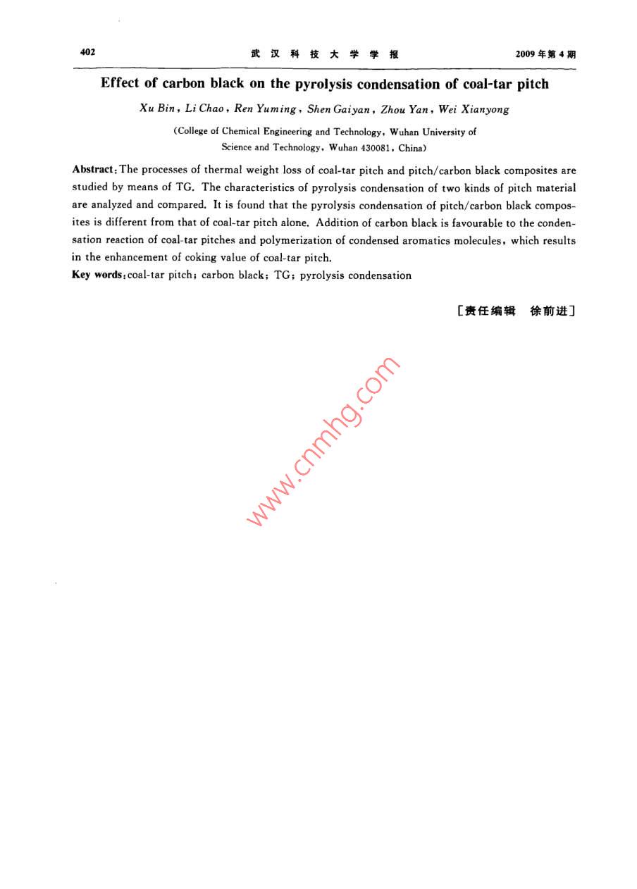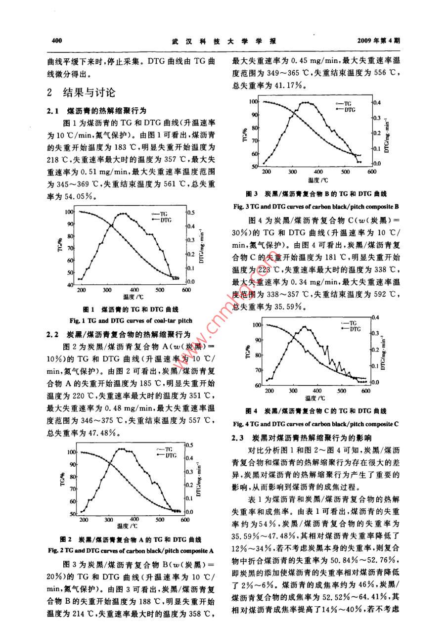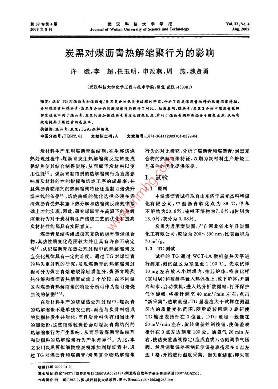 第32卷第4期武漢科技大學學報Vol. 32,No.42009年8月Journal of Wuhan University of Science and TechnologyAg.2009炭黑對煤瀝青熱解縮聚行為的影響許斌,李超,任玉明,申改燕,周燕,魏賢勇(武漢科技大學化學工程與技術學院,朔北武漢,430081)摘要:通過TG對煤瀝青和煤瀝青/炭黑復合物熱失重過程的研究,分析了兩類煤瀝青物料的熱解縮聚特征,并對煤瀝青和煤瀝青/炭黑復合物的熱解縮聚行為進行了對比。結果表明,煤瀝青/炭黑復合物中煤瀝青熱解揮發(fā)過程不同于煤瀝青,炭黑的添加使煤瀝青易發(fā)生縮聚反應,有利于煤瀝青稠環(huán)芳烴分子縮聚成焦,從而有效地提高了煤瀝青的成焦率。關鍵詞:堞瀝青;炭黑;TGA;熱解縮聚中圖分類號:TQ522. 63文獻標志碼:A文章編號:1674-3644<2009>04-0399-04炭材料生產(chǎn)采用煤瀝青黏結劑,在生坯焙燒行為的對比研究,分析了煤瀝青和煤瀝青/炭黑復熱處理過程中,煤瀝青發(fā)生熱解縮聚反應轉變成合物的熱解縮聚特征,以期為炭材料生產(chǎn)焙燒工黏結焦使其結合制得炭坯,從而賦予炭材料以使藝條件的優(yōu)化提供依據(jù)。用性能”。煤瀝青黏結劑的熱解縮聚行為直接影1試驗響著炭材料的性能指標和焙燒工序的成品率,并且煤瀝青黏結劑的熱解縮聚特征還是制訂焙燒升1.1 原料溫曲線的依據(jù)[2],焙燒曲線的優(yōu)化選撣必須在弄中溫煤瀝青試樣取自山東濟寧辰光杰科特煤清煤瀝青受熱狀態(tài)下熱分解和熱縮聚反應規(guī)律基化有限公司,中溫瀝青軟化點為89 C,甲苯礎上才能實現(xiàn),因此,研究煤瀝青在高溫下的熱解不溶物為20.8% ,喹啉不溶物為7.8%,β樹脂為縮聚行為對于炭材料生產(chǎn)焙燒工藝的優(yōu)化和提高13. 0%,灰分為0. 08%。炭材料性能都具有實際意義。炭黑為通用型炭黑,產(chǎn)自河北省永年縣炭黑煤瀝青是結構組成極其復雜的稠環(huán)芳烴混合化工有限公司,粒徑為200~300nm,比表面積為物,其熱性質(zhì)變化范圍較大并且具有許多不確定70 m2/g。性[3] ,認識煤瀝青在熱處理過程中的熱解縮聚反1.2 TG 測試應變化規(guī)律具有- -定的難度。通過TG對煤瀝青試樣的TG通過WCT-1A微機差熱天平進的熱失重過程的研究,發(fā)現(xiàn)煤瀝青的熱解縮聚過行測定,測試溫區(qū)為室溫至1 100 C.先取試樣程可分為煤瀝青熔融脫除輕質(zhì)組分、煤瀝青劇烈10 mg左右放入小坩堝內(nèi),抬起爐體,將參比樣熱分解和煤瀝青熱縮聚成焦3個階段,在不同溫(空坩堝)和被測樣置人熱偶板上;放下爐體,開啟區(qū)內(nèi)煤瀝青熱解縮聚的特征分析可作為制訂焙燒冷卻水,啟動微機,進人熱分析數(shù)據(jù)站,打開保護曲線的依據(jù)(4+5]。氣體旋鈕,將指針調(diào)至40 mm'/min左右,點擊;在炭材料生產(chǎn)的焙燒熱處理過程中,煤瀝青“新采集”,選取量程,TG量程應大于試樣在測溫的熱解縮聚不是單獨發(fā)生的,而是與炭骨料組成區(qū)內(nèi)的質(zhì)量變化范圍,隨后旋轉粗調(diào)0旋鈕使的炭糊料發(fā)生共炭化,而且炭骨料含有相當比率TG輸出表指針在0位置。DTG量程一般選在的細微粉,這些細微粒炭粉會對煤瀝青黏結劑的20 mV/min左右,旋轉偏差控制按鈕,使偏差表熱解縮聚行為產(chǎn)生影響,從而導致煤瀝青黏結劑指針在0點左邊刻度100處。通氮氣20 min左和炭糊料的熱解縮聚行為產(chǎn)生差異[0]。為此,本右,使熱失重基線穩(wěn)定(應成直線),否則調(diào)節(jié)氣壓文采用炭黑模擬細微粒炭粉添加到煤瀝青中,通閥。然后調(diào)整偏差控制鈕使偏差表指示在0點左過TG對煤瀝青和煤瀝青/炭黑復合物熱解縮聚邊1格,開始進行溫度采集。當失重結束,即失重收稿日期2009-04-20葛金項目:國家863”計劃贊助項目(2007AA06Z113):湖北省自然科學基金資助項目(2007ABA251).作者簡介:許斌(1963-),男 .武漢科技大學教授,博士. E mail,xubin1963@263. net400武漢科技大學學報2009年第4期曲線平緩下來時,停止采集。DTG曲線由TG曲最大失重速率為0. 45 mg/min,最大失重速率溫線微分得出。度范圍為349~365 C,失重結束溫度為556 C,總失重率為41. 17%.2結果與討論10002.1煤瀝青 的熱解縮聚行為90.圖1為煤瀝青的TG和DTG曲線(升溫速率為10 C/min,氮氣保護)。由圖1可看出,煤瀝青0.227的失重開始溫度為183C,明顯失重開始溫度為a1218 C ,失重速率最大時的溫度為357 C,最大失60fs0重速率為0.51 mg/min,最大失重速率溫度范圍20000600為345~369 C,失重結束溫度為561 C,總失重溫度/心圈3炭黑/煤瀝青復合物B的TG和DTG曲線率為54. 05%。Fig 3TG and DTG curves of carbon black/ pitch composite B100 ~二0.5圖4為炭黑/煤瀝青復合物C(w(炭黑)=30%)的TG和DTG曲線(升溫速率為10 C/8O0+0.3min,氮氣保護)。由圖4可看出,炭黑/煤瀝青復合物C的失重開始溫度為181 C,明顯失重開始+o.溫度為223 C ,失重速率最大時的溫度為338 C,最大失重速率為0. 34 mg/min,最大失重速率溫”20030050溫度1心度范圍為338~357 C,失重結束溫度為592 C,圈1煤瀝青的TG和DTG曲線總失重率為35. 59%。70.4Fig.1 TG and DTG curves of coal-tar pitch2.2炭黑/煤瀝青復合 物的熱解縮聚行為圖2為炭黑/煤瀝青復合物A(w(炭黑)=10%)的TG和DTG曲線(升溫速率為10 C/min,氮氣保護)。由圖2可看出,炭黑/煤瀝青復70}合物A的失重開始溫度為185 C,明顯失重開始Jo500溫度為220 C,失重速率最大時的溫度為351 C,最大失重速率為0. 48 mg/min,最大失重速率溫圈4炭黑/煤瀝青復合物C的TG 和DTG曲線度范圍為346~375 C,失重結束溫度為557 C,Fig. 4TG and DTG curves of carbon b
