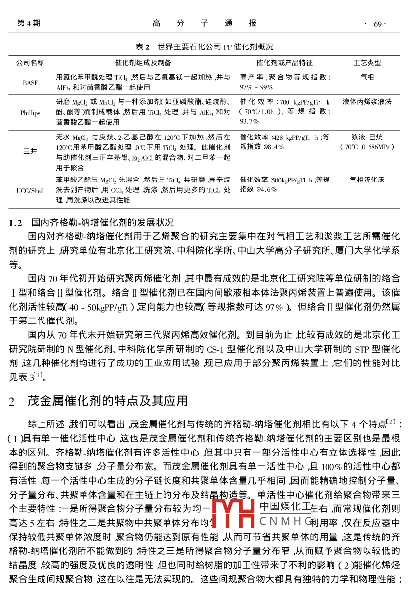 第4期子通抵67.高分子與 工業(yè)聚烯烴催化劑的發(fā)展及我們的對策朱博超',黃強”,焦寧寧*3( 1.中國科學院蘭州化學物理研究所蘭州730000 2.中國石油化工與銷售分公司,北京100724 3.中國石油蘭州石化公司石化研究院蘭州730060 )摘要:評述了聚烯烴催化劑的幾個重要發(fā)展階段討論了Ziegler-Natta 催化劑、茂金屬催化劑及非茂有機金屬催化劑的組成及特性提出了我國在聚烯烴催化劑開發(fā)方面的對策。關鍵詞Ziegler-Natta 催化劑;茂金屬催化劑;非茂催化劑;聚烯烴聚烯烴工業(yè)的發(fā)展是一個國家石化工業(yè)發(fā)展的重要標志90年代以來,世界聚烯烴生產(chǎn)能力大幅度增長,世界市場面臨著供大于求的形勢在這種情況下只有加大技術開發(fā)力度掌握和采用先進技術才能降低成本提高產(chǎn)品附加值和市場競爭力。聚烯烴技術的關鍵在于催化劑聚烯烴樹脂性能的改進與聚烯烴催化劑的開發(fā)有著極為密切的關系。所以研究和總結(jié)聚烯烴催化劑的發(fā)展歷程對制定我國在聚烯烴工業(yè)中的中、長期戰(zhàn)略目標具有十分重要的意義。在各種聚烯烴催化劑中,目前使用最廣泛的仍是齊格勒-納塔( Ziegler-Natta )催化劑,它自50年代問世以來經(jīng)過各國共同開發(fā)研究經(jīng)歷了由第-代至第四代的發(fā)展催化性能不斷提高推動了聚烯烴工業(yè)的迅猛發(fā)展生產(chǎn)規(guī)模的不斷擴大及高性能聚烯烴樹脂(如高等規(guī)聚丙烯)的合成均可歸因于齊格勒-納塔催化劑的成熟和發(fā)展。目前對這類催化劑的研究和開發(fā)工作主要集中在高活性和高度立體定向催化劑的研制上。1976年德國漢堡大學的Kaminsky教授偶然發(fā)現(xiàn)向Cp2ZrCl2/三甲基鋁( TMA )體系中加入少量水催化劑活性會明顯增大后來對產(chǎn)生這一現(xiàn)象的原因進行了深入研究結(jié)果發(fā)現(xiàn)少量水的引入使TMA變成了甲基鋁氧烷(MAO),由此揭開了烯烴聚合催化劑又一個新的篇章。茂金屬催化劑由于具有理想的單活性中心通過變換其配位基團又可以改變活性中心的電負性和空間環(huán)境,從而能精密地控制分子量、分子量分布、共聚單體含量和在主鏈上的分布及結(jié)晶構造。因而茂金屬催化劑在聚合物品種的開發(fā)上顯示出了明顯的優(yōu)勢用齊格勒_納塔催化劑很難實現(xiàn)的聚烯烴樹脂的功能化在茂金屬催化劑作用下則很快得到了解決。正是由于茂金屬聚烯烴所具備的優(yōu)異性能才使得茂金屬催化劑自80年代中期逐步成為聚烯烴工業(yè)中的研空地上世用夕士聚烯烴生產(chǎn)廠家都紛紛投入到茂金屬催化劑技術開發(fā)和應用大潮之中相中國煤化工業(yè)化規(guī)模。THCNMH G隨著茂金屬催化劑的開發(fā)應用90年代中后期n山永而A伙場主人山現(xiàn)了非茂有機金屬烯烴聚合催化劑,它與茂金屬催化劑和齊格勒納塔催化劑的不同之處在于其主催化劑的中心原子不光作者簡介朱博超( 1963- )男高級工程師搏士生主要從事聚烯烴催化劑的研究和開發(fā)工作,已發(fā)表論文多篇;#通訊聯(lián)系人。68●高分子通抵2002年8月是第四副族元素而是包括了幾乎所有過渡金屬元素尤其是第八副族元素(如鐵、鈷、鎳、鈀等)這類催化劑也是單活性中心均相催化劑,因此可以按照預定的目的極精確地控制聚合物的鏈結(jié)構。近幾年來非茂型催化劑的研究十分活躍盡管目前還沒有工業(yè)化應用但對試驗樣品的分析和表征表明這類催化劑所得的聚烯烴產(chǎn)品性能優(yōu)良而且成本也較低。1齊格勒納塔催化劑1.1國外 齊格勒-納塔催化劑的發(fā)展狀況1.1.1 聚乙烯用催化劑 聚乙烯的基本品種可分為線性低密度聚乙烯( LLDPE)高密度聚乙烯( HDPE和低密度聚乙烯( LDPE)生產(chǎn)LDPE的工藝主要是采用高壓釜式法和高壓管式法使用有機過氧化物為引發(fā)劑進行自由基聚合;生產(chǎn)LLDPE和HDPE的工藝主要有氣相法、溶液法、淤漿法。對于氣相法工藝,目前普遍使用美國UCC公司的Unipol 工藝及英國BP公司的BP氣相法采用溶液法聚合工藝的公司以美國DOW公司、荷蘭DSM公司以及加拿大杜邦公司為代表而淤漿法又分為攪拌釜淤漿法和環(huán)管反應器淤漿法攪拌釜淤漿法工業(yè)化較早,發(fā)展比較成熟,很多公司都擁有這種工藝,目 前世界上的HDPE大部分是用此工藝生產(chǎn)出來的,而采用環(huán)管反應器的主要是Phillips 公司,可用于LLDPE、HDPE等的生產(chǎn)。表1歸納出世界上一些著名石化公司PE催化劑概況。表1世界主要石化公司PE催化劑概況公司名稱催化劑組成及制備催化劑或產(chǎn)品特征工藝類型早期采用Gr03催化劑現(xiàn)在已向鈦系催化劑過渡,例:有300 ~ 6000kgPE/gTi環(huán)形反應器機鎂氯化物加入到烷基鹵化物和烷基鋁化合物中再加入TiCl4助催化劑為AlEt催化劑為TiC4 + VOCLs摻合物,助催化劑為AK( iBu) +MI :0.2 ~ 100g/ 10min ip :0.915溶液中壓Du PontAlEty~ 0.965g/cm?分子量分布窄( nBu )Mg AlEls配合物溶于IsoparE溶劑再與Ea2AICl 反MI 2.5~ 12g/ 10min ;催化效率溶液低壓Dow應向反應物加入四異丙基鈦酸酯制得固體催化劑172kgPE/gTi h分子量分布窄( 98.1kPa)用鉻茂和四異丙基鈦酸酯浸漬干燥的Si02 ,干燥后用ρ :0.920g/cm;催化效率:氣相流化床UCC0. 3%( NH4 )SiF。處理然后在300 ~ 800°C活化4900kgPE/gCr(84C 1.96MPa)TiCI4和MgCl2在THF中混合將此催化劑混合物負載于經(jīng)ρ 0.917 ~ 0.935g/em' ;催化效AlEl3處理的Si