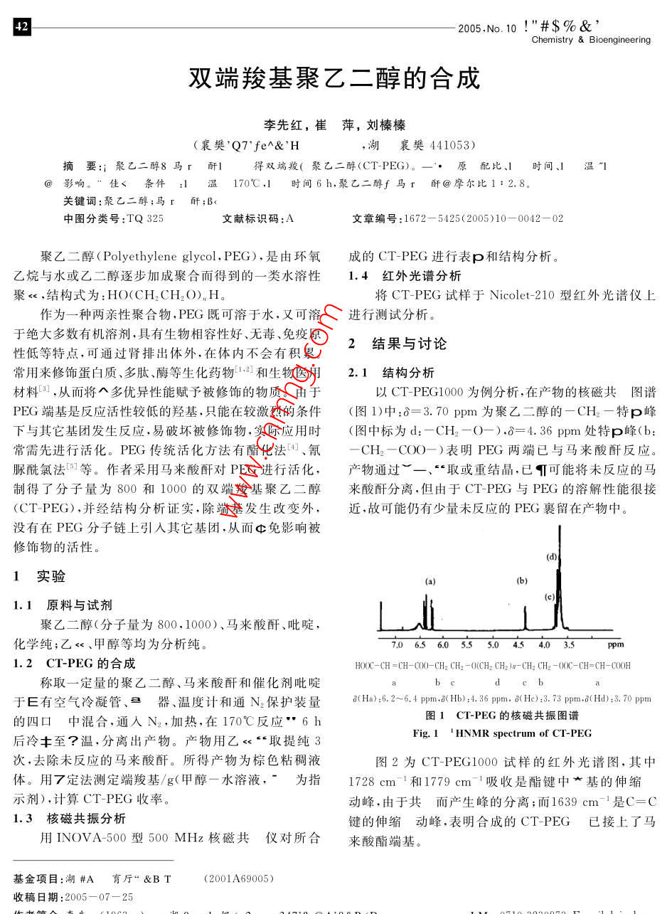 2005No.10!"#$%&hemistry Bioengineering雙端羧基聚乙二醇的合成李先紅,崔萍,劉榛榛(襄樊'Q7’fe^&'H湖襄樊441053)摘要:;聚乙二醇8馬r酐得雙端羧(聚乙二醇(CT-PEG)原配比、1時間、1溫"1@影響?!奔?條件:1溫170℃,1時間6h,聚乙二醇f馬r酐@摩爾比1:2.8關(guān)鍵詞:聚乙二醇;馬r酐;B<中圖分類號:TQ325文獻標(biāo)識碼:A文章編號:1672-5425(2005)10-0042-02聚乙二醇( Polyethylene glycol,PEG),是由環(huán)氧成的 CT-PEG進行表p和結(jié)構(gòu)分析乙烷與水或乙二醇逐步加成聚合而得到的一類水溶性1.4紅外光譜分析聚<,結(jié)構(gòu)式為:HO(CH2CH2O)nH。將 CT-PEG試樣于 Nicolet-210型紅外光譜儀上作為一種兩親性聚合物,PEG既可溶于水,又可溶進行測試分析。于絕大多數(shù)有機溶劑,具有生物相容性好、無毒、免疫原性低等特點,可通過腎排出體外,在體內(nèi)不會有積累2結(jié)果與討論常用來修飾蛋白質(zhì)、多肽、酶等生化藥物2和生物醫(yī)用2.1結(jié)構(gòu)分析材料,從而將八多優(yōu)異性能賦予被修飾的物質(zhì)。由于以CT-PEG1000為例分析,在產(chǎn)物的核磁共圖譜PEG端基是反應(yīng)活性較低的羥基,只能在較激烈的條件(圖1)中:δ=3.70pm為聚乙二醇的一CH2一特p峰下與其它基團發(fā)生反應(yīng),易破壞被修飾物,實際應(yīng)用時(圖中標(biāo)為d:CH2-O-),8=4.36ppm處特p峰(b常需先進行活化。PEG傳統(tǒng)活化方法有酯化法、氰CH2-COO—)表明PFG兩端已與馬來酸酐反應(yīng)脲酰氯法等。作者采用馬來酸酐對PEG進行活化,產(chǎn)物通過一、“取或重結(jié)晶,已T可能將未反應(yīng)的馬制得了分子量為800和1000的雙端羧基聚乙二醇來酸酐分離,但由于CT-PEG與PEG的溶解性能很接( CT-PEG),并經(jīng)結(jié)構(gòu)分析證實,除端基發(fā)生改變外,近,故可能仍有少量未反應(yīng)的PEG裹留在產(chǎn)物中沒有在PEG分子鏈上引入其它基團,從而¢免影響被修飾物的活性。1實驗1.1原料與試劑聚乙二醇(分子量為80,1000)、馬來酸酐、吡啶化學(xué)純;乙κ、甲醇等均為分析純。7.06.5605.55.045403.51.2CT-PEG的合成HOCX-CH=CH-C00-CH2 CH2-0(CH2 CH2w-CH2 CH2-((C-CH=CH-COOH稱取一定量的聚乙二醇、馬來酸酐和催化劑吡啶于E有空氣冷凝管、器、溫度計和通N2保護裝量aa):6.2-6.4pm,aHb):.36pm,aHe):3.73ppm,a(H:opm的四口中混合,通入N2,加熱,在170℃反應(yīng)6h圖1CT-PEG的核磁共振圖譜后冷豐至?溫,分離出產(chǎn)物。產(chǎn)物用乙≤“取提純3Fig 1HNMR spectrum of CT-PEG次,去除未反應(yīng)的馬來酸酐。所得產(chǎn)物為棕色粘稠液圖2為 CT-PEG1000試樣的紅外光譜圖,其中體。用了定法測定端羧基/g(甲醇一水溶液,為指1728cm-和1779cm-1吸收是酯鍵中*基的伸縮示劑),計算 CT-PEO收率。動峰,由于共而產(chǎn)生峰的分離;而1639cm-1是C=C1.3核磁共振分析鍵的伸縮動峰,表明合成的CT-PEG已接上了馬用 INOVA-500型500MHz核磁共儀對所合來酸酯端基?;痦椖?湖#A育廳“&BT(2001A69005)收稿日期:2005-07-25李先紅等:雙端羧基聚乙二醇的合成/2005正第10期較多的馬來酸酐升華損失;溫度太低,則反應(yīng)時間太長,而且不能保證反應(yīng)順利進行。隨著反應(yīng)溫度的升高,產(chǎn)品的顏色加深。由圖3可見, CT-PEG收率隨溫度升高而增加,溫度超過170℃以后,繼續(xù)升高溫度,收率增加不大。因此選定反應(yīng)溫度為170℃2.4時間的影響17788其它反應(yīng)條件不變,考察反應(yīng)時間對 CT-PEG收400035003000250020001波數(shù)率的影響,結(jié)果見圖4圖2Cr-PEG的紅外光譜圖Fig 2 IRum of CT-PEG2.2聚乙二醇與馬來酸酐摩爾比的影響在反應(yīng)溫度170℃、反應(yīng)時間6h,考察聚乙二醇與馬來酸酐摩爾比對 CT-PEG收率的影響,結(jié)果見表1。表1聚乙二醇與馬來酸酐摩爾比對收率的影響lab 1 Effect of molar ratio of peg to maleic anhydride on yield反應(yīng)時間/hPEG與馬來酸1:2.01:2.21:2.41:2.61:2.81:3.0圖4反應(yīng)時間對收率的影響酐摩爾比Fig 4 Effect of reaction time on yield收率/%86.791.195.497.898.798.5由圖4可見,CT-PEG收率隨反應(yīng)時間延長而增由表1可見, CT-PEG收率基本上隨醇酐摩爾比加,反應(yīng)6h以后,繼續(xù)延長反應(yīng)時間,收率變化不大減小而增加,但是當(dāng)醇酐摩爾比達1:2.8時,繼續(xù)減因此反應(yīng)時間定為6h。小醇酐摩爾比,CT-PEG收率變化不大。因此,醇酐摩3結(jié)論爾比選定為1:22.3溫度的影響CT-PEG的最佳合成工藝條件為:反應(yīng)溫度其它反應(yīng)條件不變,醇酐摩爾比1:2.8,考察反170℃、反應(yīng)時間6h、聚乙二醇與馬來酸酐的摩爾比應(yīng)溫度對 CT-PEO收率的影響,結(jié)果見圖31:2.8,在此條件下合成的 CT-PEG收率可達90%以上。通過核磁共振儀和紅外光譜儀測試,表明合成的CT-PEG確已接上了馬來酸酯端基參考文獻[1]姚日生,董岸杰,劉永瓊,藥用高分子材料[M].北京:化學(xué)工業(yè)出2]常遠,唐微,鄭仲承,等,氨基PEG化試劑的合成及其修飾能的測定[].生物化學(xué)雜志,1996,12(4):496-500.3]周文孝,袁慶輝,聚乙二醇在生化藥物化學(xué)修飾中的應(yīng)用[J].中110125141517185200反應(yīng)溫度/℃藥學(xué)雜志,1997,32(3):132-13「4]楊保珍,張?zhí)烀?王樹歧,聚乙二醇修飾超氧化物歧化酶的研究圖3反應(yīng)溫度對收率的影響J].藥物生化技術(shù),198,5(1):12-16Fig 3 Effect of reaction temperature on yield5]董炎明.高分子材料實用剖析技術(shù)[M].北京:中國石化出版社反應(yīng)開始階段溫度不能上升太快太高,否則會有1997:80-81Synthesis of Carboxylic-terminated polyethylene gly