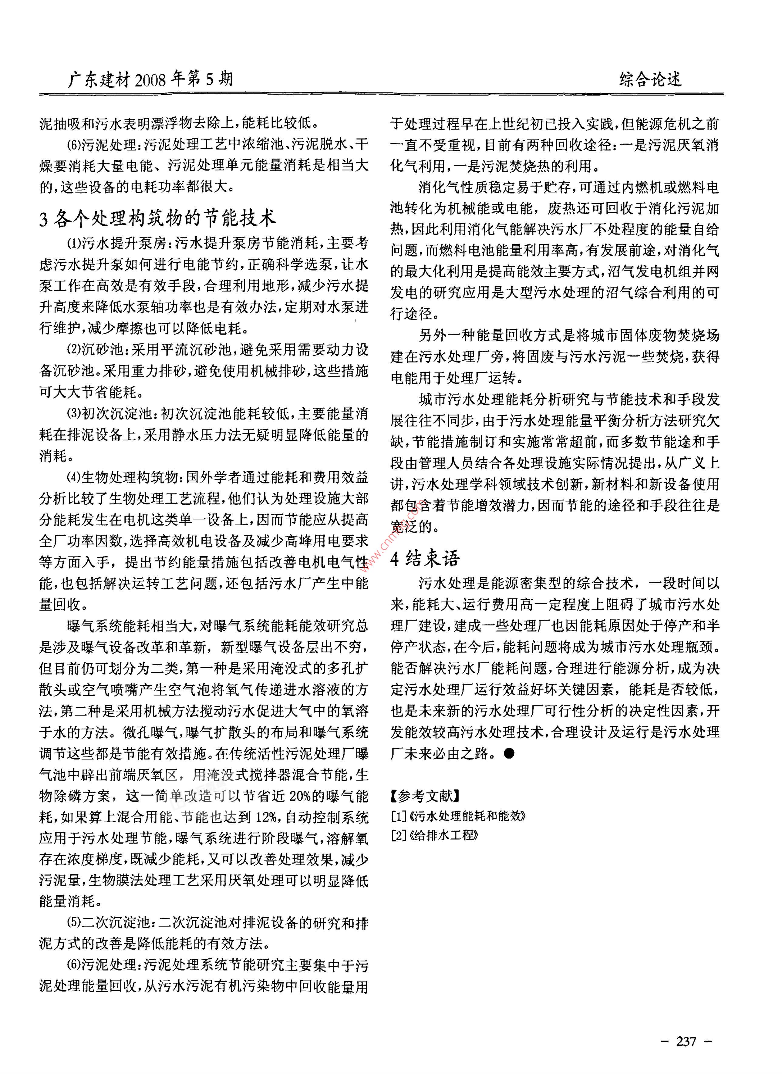 綜合論述廣東建材2008年第5期談污水處理節(jié)能技術(shù)梁俊韡(廣州市自來水公司南洲水廠)摘要:針對節(jié)能技術(shù),談污水處理工藝流程,各處理構(gòu)筑物能耗分析關(guān)鍵詞:污水處理:節(jié)能技術(shù)現(xiàn)代污水處理技術(shù),按處理程度劃分:分為一級、二(2)沉砂池:沉砂池功能是除比重較大無機顆粒,沉級和三級處理。砂池一般設(shè)于泵站前、倒虹管前,以便減輕無機顆粒對(1)一級處理,主要去除污水中呈懸浮狀態(tài)固體污染水泵、管道磨損,也可設(shè)于初沉池前,以減輕沉淀池負(fù)荷物質(zhì)物理處理法大部分只完成一級處理要求,經(jīng)過一及改善污泥處理構(gòu)筑物處理條件,常用沉砂池有平流沉級處理污水,B0D一般可去除30%左右,達不到排放標(biāo)砂池,曝氣沉砂池、多爾沉砂和鐘式沉砂池。沉砂池中需準(zhǔn),一級處理屬于二級處理的預(yù)處理。要能量供應(yīng)主要有砂水分享器和吸砂機,以及曝氣沉砂(2)二級處理,主要去除污水中呈膠體和溶解狀態(tài)有池曝氣系統(tǒng),多爾沉淀池和鐘式沉砂池動力系統(tǒng)。機污染物質(zhì) CBOD COD物質(zhì),去除率達90%以上,使有機3)初次沉淀池:初次沉淀池是一級污水處理廠主題污染物達到排放標(biāo)準(zhǔn)。處理構(gòu)筑物,或作為二級污水處理廠預(yù)處理構(gòu)筑物設(shè)在(3)三級處理,進一步處理難降解的有機物氮、磷等生物處理構(gòu)筑物的前面處理對象是SS和部分BOD5,可能夠?qū)е滤w富營養(yǎng)化可溶性無機物等,主要方法有生改善生物處理構(gòu)筑物運行條件并降低B0D5的負(fù)荷,初物脫氮除磷法,混凝沉淀法、砂率法、活性碳吸附法、離沉池包括平流沉淀池,輻流沉淀池和豎流沉淀池。初沉子交換法、電滲分析法等。池主要能耗設(shè)備是排泥裝置,比如鏈帶式刮泥機、刮泥1污水處理工藝流程排渣機、吸泥泵等,但由于排泥周期影響,初沉池的能耗是比較低的。整個過程為通過粗格柵的原污水經(jīng)過污水提升泵具體實例:南洲水廠現(xiàn)正試行使用攝像槍(固定的提升后,經(jīng)過格柵或篩率器,之后進入沉砂池,經(jīng)過砂水閉路電視)對反應(yīng)混凝效果進行監(jiān)控。目的是便于運行分離污水進入初次沉淀池,以上為一級處理(物理處值班人員對8個平流沉淀池進行2小時不間斷監(jiān)控,理),初淀池出水進入生物處理設(shè)備,有活性污泥法和生最大程度保障出廠水水質(zhì)。物膜法。(其中活性污泥法反應(yīng)器有曝氣池、氧化溝等,節(jié)能技術(shù):①由于攝像槍固定在架子上,日光照射生物膜法包括生物濾池、生物轉(zhuǎn)盤生物接觸氧化法和角度會隨時間變化,故造成某時段水面反光,不能清楚生物流化床),生物處理設(shè)備出水進入二次沉淀的出水看到水下情況,解決方法造黑箱屏蔽外界光源在黑經(jīng)過消毒排放或者進入三級處理,一級處理結(jié)束到此為箱內(nèi)提供固定光源解決;⑨實驗表明(自制模擬箱),水二級處理,三級處理包括生物脫氮除磷法,混凝沉淀法、下光源效果比水上光源效果要好;③風(fēng)、雨會導(dǎo)致水面砂率法、活性碳吸附法、離子交換法、電滲分析法等,沉波動影響監(jiān)控效果。建議反應(yīng)格中加頂蓋。池污泥一部分回流至初次沉淀池或生物處理設(shè)備,一部(4)生物處理構(gòu)筑物:污水生物處理單元過程能耗量分進入污泥濃縮池,之后進入污泥消化池,經(jīng)過脫水和要占污水廠直接能耗相當(dāng)大比例,它和污泥處理的單元于燥設(shè)備后,污泥被最后利用。過程能量之和占污水廠直接能耗60%以上,活性污泥法2各個處理構(gòu)筑物能耗分析曝氣系統(tǒng)的曝氣要消耗大量電能,其基本上是聯(lián)系運行)污水提升泵池:進入污水處理廠污水經(jīng)過粗格柵的,且功率較大,否則達不到較好曝氣效果,處理效果也進入污水提升泵房,之后被污水提升至沉砂池前池,水不好,氧化溝處理工藝安裝曝氣機也是能耗很大設(shè)備,泵運行要消耗大量能量,占污水廠運行部能耗相當(dāng)大比生物膜法處理設(shè)備和活性污泥法相比能耗低,但目前應(yīng)例,這與污水流量和要提升揚程有關(guān)。用較少,是以后需要大力推廣處理工藝。5)二次沉淀池:二次沉淀池的能力消耗主要是在污236廣東建材208年第5期綜合論述泥抽吸和污水表明漂浮物去除上,能耗比較低。于處理過程早在上世紀(jì)初已投入實踐,但能源危機之前6污泥處理:污泥處理工藝中濃縮池、污泥脫水、干一直不受重視,目前有兩種回收途徑:是污泥厭氧消燥要消耗大量電能、污泥處理單元能量消耗是相當(dāng)大化氣利用,一是污泥焚燒熱的利用。的,這些設(shè)備的電耗功率都很大。消化氣性質(zhì)穩(wěn)定易于貯存,可通過內(nèi)燃機或燃料電3各個處理構(gòu)筑物的節(jié)能技術(shù)池轉(zhuǎn)化為機槭能或電能,廢熱還可回收于消化污泥加熱,因此利用消化氣能解決污水廠不處程度的能量自給(污水提升泵房:污水提升泵房節(jié)能消耗,主要考問題,而燃料電池能量利用率高有發(fā)展前途,對消化氣慮污水提升泵如何進行電能節(jié)約,正確科學(xué)選泵讓水的最大化利用是提高能效主要方式沼氣發(fā)電機組并網(wǎng)泵工作在高效是有效手段,合理利用地形減少污水提發(fā)電的研究應(yīng)用是大型污水處理的沼氣綜合利用的可升高度來降低