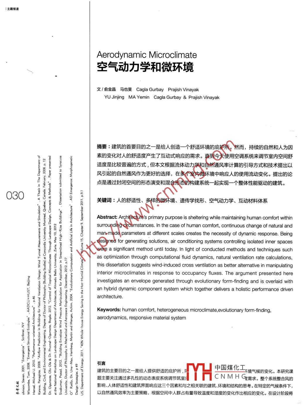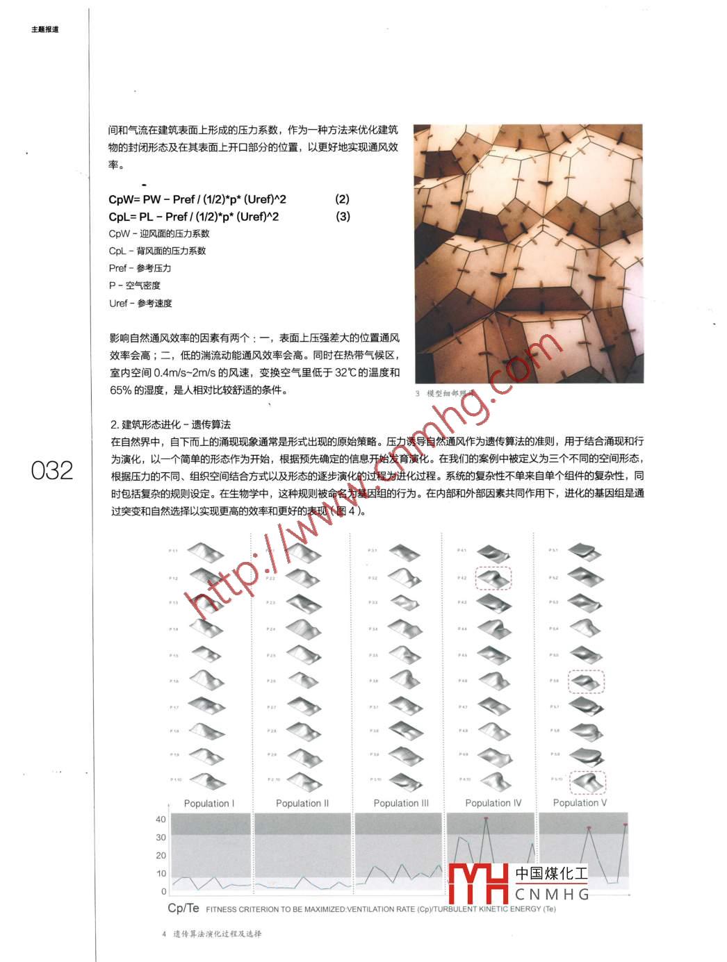 主題報(bào)道Aerodynamic Microclimate空氣動(dòng)力學(xué)和微環(huán)境文/俞金晶馬也旻 Cagla Gurbay Prajish VinayakYU Jinjing MA Yemin Cagla Gurbay Prajish vinaya摘要∶建筑的首要目的之一是給人創(chuàng)造一個(gè)舒適環(huán)境的庇護(hù)所。然而,持續(xù)的自然和人為因素的變化對(duì)人的舒適度產(chǎn)生了互動(dòng)式響應(yīng)的需求。直到今天使用空調(diào)系統(tǒng)來調(diào)節(jié)室內(nèi)空間舒適度是比較普遍的方式,但本文根據(jù)流體動(dòng)力學(xué)和自然通風(fēng)率計(jì)算的引導(dǎo)方式和技術(shù)提出以g風(fēng)引起的自然通風(fēng)作為更好的選擇,在多個(gè)室內(nèi)微環(huán)境中響應(yīng)人的使用流動(dòng)變化。提出的論點(diǎn)是通過封閉空間的形態(tài)演變和混合形態(tài)的構(gòu)建系統(tǒng)一起實(shí)現(xiàn)一個(gè)整體性能驅(qū)動(dòng)的建筑030關(guān)鍵詞:人的舒適性、多樣的微環(huán)境、遺傳學(xué)找形、空氣動(dòng)力學(xué)、互動(dòng)材料體系A(chǔ)bstract: Architecture 's primary purpose is sheltering while maintaining human comfort withinsurrounding circumstances. In the case of human comfort, continuous change of natural andman- made parameters at different scales creates the necessity of dynamic response. Being3/oesgreodtorgeneratngsouonr,arcondtosysermscontongioatedmnerspaceswere a significant method until today. In light of conducted methods and techniques suchas optimization through computational fluid dynamics, natural ventilation rate calculations,this dissertation suggests wind-induced cross ventilation as better alternative in manipulatinge interior microclimates in response to occupancy fluxes. The argument presented hereinvestigates an envelope generated through evolutionary form-finding and is overlaid with工952an hybrid dynamic component system which together delivers a holistic performance drivenarchitectureKeywords: human comfort, heterogeneous microclimate, evolutionary form-findingaerodynamics, responsive material system991o>s-引言建筑的主要目的之一是給人提供舒適的庇護(hù)所H中國(guó)煤化工境氣候的變化。本研究課8占題主要關(guān)注通過多孔性的動(dòng)態(tài)表皮系統(tǒng)調(diào)節(jié)筑室CNMH需求。整個(gè)系統(tǒng)整合風(fēng)的影響、人體舒適性和建筑界面響應(yīng)這三個(gè)因素和與之相關(guān)聯(lián)的建筑、環(huán)境和結(jié)構(gòu)的思考。在特定的氣候條件下,占以自然通風(fēng)效率為主要策略,根據(jù)空間中人群占有量導(dǎo)致溫度和濕度的變化作出相應(yīng)的變化。在設(shè)計(jì)階段將建筑室內(nèi)微環(huán)境與周遭大氣環(huán)境的相互關(guān)系納入思考中,而不是在最后階段為了提供人群相對(duì)的舒適環(huán)境而付出巨大的代價(jià)人體舒適度是建筑設(shè)計(jì)性能評(píng)估的基本要素之一。熱舒適度在自然環(huán)境和人為因素影響下的持續(xù)變化為建筑創(chuàng)建動(dòng)態(tài)響應(yīng)提供了必要性。迄今為止,對(duì)于波動(dòng)的舒適度要求,使用機(jī)械空調(diào)系統(tǒng)控制室內(nèi)的環(huán)境是一種普遍的決方案。據(jù)美國(guó)能源部公布的能源消耗,在熱帶氣候區(qū),建筑用于冷卻能源總量占總能源量的39%。而且,過多依賴機(jī)械系統(tǒng)可能會(huì)對(duì)健康造成不良的影響和結(jié)果,這種現(xiàn)象稱為病態(tài)建筑綜合征(SBS)。本方案提議的是一個(gè)低能耗高效率的方案,由材料性質(zhì)變化引起形態(tài)變化而形成的動(dòng)態(tài)表皮系統(tǒng)來控制自然通風(fēng),調(diào)節(jié)建筑室內(nèi)的微環(huán)境從而實(shí)現(xiàn)人特定的舒適度需求(圖1)。2室內(nèi)細(xì)部湓染照片果逐步優(yōu)化的,其中研究的類型是定量的;有限元結(jié)構(gòu)分析被用于形態(tài)幾何物理分析和受空氣動(dòng)力限制的組件和整體結(jié)構(gòu)性能設(shè)計(jì)的過程中;計(jì)算控制系統(tǒng)中包括接受濕度、溫度和風(fēng)壓強(qiáng)感應(yīng)器的數(shù)據(jù)和計(jì)算分析數(shù)據(jù)的代碼,控制材料的性質(zhì)從而滿足空間質(zhì)量變化的動(dòng)態(tài)需求。在材料研究中,記憶合金和膠合板的合成方法為整個(gè)系統(tǒng)提供了應(yīng)用可行性(圖2-3)二、設(shè)計(jì)過程1.自然通風(fēng)在過去60多年中,自然通風(fēng)已經(jīng)被科學(xué)詳細(xì)地分析,并已被證明是能夠代替機(jī)械來控制舒適性和維持空氣質(zhì)量的有效方式。內(nèi)部空氣的流動(dòng)主要是根據(jù)風(fēng)速的大小和開口的策略形成的壓力差而形成的,基于這一原則,自然通風(fēng)被分為風(fēng)壓和熱壓通風(fēng)。由于熱壓通風(fēng)在小規(guī)模項(xiàng)目中影響甚微,因此風(fēng)壓通風(fēng)被視為在特定室內(nèi)空間中形成多個(gè)微環(huán)境最有效的通風(fēng)技術(shù)。伯努利原理是依賴于流體的流量和壓力在建筑表面形成不同的流體勢(shì)能從而形成通風(fēng),且在速度大的地方壓力小,束度小的地方壓力大?;陲L(fēng)壓通風(fēng)主要根據(jù)表面的壓力差和開口,特定的數(shù)學(xué)公式被用于制定一項(xiàng)戰(zhàn)略以優(yōu)化建筑形式和開口通風(fēng)性能,從而實(shí)現(xiàn)最大通風(fēng)率。通過研究和實(shí)驗(yàn)得出,只有當(dāng)空隙率在低于23%的封閉總表面面積下,才可以考慮在表面上的壓強(qiáng)系數(shù)來實(sh