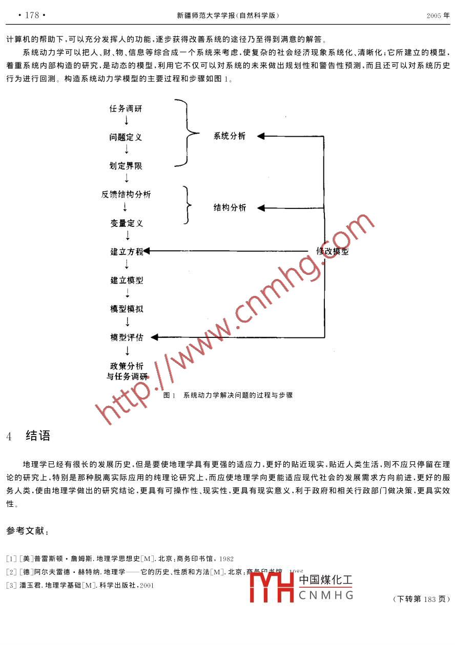 第24卷第3期新疆師范大學學報》(自然科學版Vol 24. No. 32005年9月Journal of Xinjiang Normal Universityp.2005(Natural sciences edition)淺談地理工程與系統(tǒng)動力學邢永建,趙梅,唐湘玲,龍海麗(新疆師范大學生命與環(huán)境科學學院,新疆烏魯木齊830053)摘要:地理學的發(fā)展從古典時期到近代時期到現(xiàn)代地理學,經(jīng)過了漫長過程,可以說自從人類誕生以來,地理學就產(chǎn)生了,并且不斷發(fā)展壯大,為社會的發(fā)展進步做出了很大的貢獻。隨著社會的進步,應(yīng)用地理學也隨之產(chǎn)生,它的產(chǎn)生使地理學更加貼近現(xiàn)實,更能符合人類社會的需求,使地理學更具生命力。文章所說的地理工程及系統(tǒng)動力學就是基于更好地為社會服務(wù),為人類服努的目的,通過借助計算機技術(shù),工程原理,模型化等使地理學更加適應(yīng)現(xiàn)代化建設(shè)需要,也使地理學具有更寬廣的發(fā)展空關(guān)鍵詞:地理學;地理學應(yīng)用;地理工程;系統(tǒng)動力學中圖分類號:P9文獻標識碼:A文章編號:10089659-(2005)-03-017603地理學具有相當長的發(fā)展史,可以說有了人類,地理學也就隨之誕生了,而且地理學的研究范團也特別寬廣,似乎與各:科都有一定聯(lián)系和各研究領(lǐng)域都有一定聯(lián)系,有人說地理學好比萬金油,哪里都用得上,可惜就是沾邊,不能比各更具體的學科研究得深刻,應(yīng)用得自如,比如地理學中的水文學不如水利部門的水文技術(shù),地理學的氣象知識不如氣象部門氣象專業(yè)知識,這樣很多地理學工作者就會發(fā)現(xiàn)地理學所涵蓋的知識很廣,但比相應(yīng)專業(yè)學科來得膚淺,特別是當面對政府,行政部門索要具體措施,實施步驟時更是無從下手。從這個角度上,地理學在實際上的應(yīng)用就勢必呈現(xiàn)一定問題,有人甚至提出地理學無用武之地的謬說,鑒于此已有許多地理工作者在研究地理學的出路問題1地理工程的產(chǎn)生及設(shè)計原則地理工程就在這樣一種情況下,應(yīng)運而生了,地理學要獨樹一幟,要在實際應(yīng)用中占有一席之地,更好地服務(wù)于現(xiàn)代化建設(shè)與工程結(jié)合確實是一條極好的道路。地理工程相當于地段設(shè)計,這在地理學的發(fā)展道路上走岀重要的一步,是地理學發(fā)展史上空前的壯舉更符合現(xiàn)代社會實際應(yīng)用的需要。地理工程相當于其他專業(yè)工程部門的工程設(shè)計,要求有很強的可操作性和規(guī)范性,人們在對地球表層空間系統(tǒng)進行有目的開發(fā)、保護、利用和改造時,有總體目標并按照一定的步驟和順序分階段,分項目進行,在這個過程中各階段和各項目的工作具有特殊性,但是這些工作必須在總體上相互協(xié)調(diào),以達到總體目標的實現(xiàn),做到“理論——設(shè)計——實施”地理工程是人為事物,是人類與地理環(huán)境的共生物,其設(shè)計應(yīng)符合系統(tǒng)工程原理,應(yīng)遵循社會安定優(yōu)化原則,環(huán)境穩(wěn)健控制原則和區(qū)域發(fā)展與優(yōu)化原則1.1系統(tǒng)設(shè)計從地理工程目標,構(gòu)成和協(xié)調(diào)方面來完成地理工程的設(shè)計大致包括以下三個方面(1)總體目標確定和方案選擇(2)總體結(jié)構(gòu)確定與子項目的確定(3)系統(tǒng)反饋中國煤化工1.2參數(shù)設(shè)計CNMH個確定的子頂目提出科學的、語義清楚的、可供實施的措施來如上任⊥言盟以爹效選定那樣,明確細致,毫無疑義,在地理學中選址問題應(yīng)該屬于這個范疇。“生態(tài)設(shè)計”工作屬于“參數(shù)”設(shè)計,它的結(jié)論可以被實施部門直接引用,過去我們對水土流失問題只講“種草種樹”,“宜農(nóng)則農(nóng),宜牧則牧”,但對種什么草,種在什么地方,什么季節(jié)種,什么地方宜農(nóng),什么地收璃百數(shù)據(jù)-3-9作者簡介:邢永建(1976—),男,漢族,在讀碩士研究生,主要從事GIs與地理學方向的研究第3期邢永建等淺談地理工程與系統(tǒng)動力學·177方宜牧,適宜程度如何,并不明確,結(jié)果不能付諸實施。地理學“戰(zhàn)略論”者,往往就是在這一點上趨于失敗,不提岀具體措施規(guī)劃,被實施部門拒絕或者擱置一邊,因為實施部門的領(lǐng)導者不知如何實現(xiàn)這種規(guī)劃,只能停留在“紙中畫畫,墻上掛掛”階段要做好參數(shù)設(shè)計,必須有科學根據(jù),必須基于對對象的深刻研究上,對于地理學而言,這個深刻研究的結(jié)論,一方面可以從其他學科吸取,另一方面,根據(jù)地學的區(qū)域性特點,應(yīng)把注意力放到中小尺度地理問題上,從而得到科學的“參數(shù)”,使我們在實施工程時,可以實現(xiàn)“參數(shù)”選擇和“參數(shù)”設(shè)計3決策分析與立法研究地理問題的復雜性在于可能同時存在幾種實施方案,并且各有優(yōu)劣,因此需要開展決策分析,決策分析內(nèi)容包括兩個方面,其一是基于地理工程的三個基本原則:對各方案直接的經(jīng)濟效益,生態(tài)效益,社會效益做出評價;其二是利用預測方法對地理工程的環(huán)境、社會、地緣效應(yīng)做岀較長期的預測,并對這種可能的長效做鳳險代價評估,通過決策分析,選定最后方案做設(shè)計決策,這樣地理工程既進入實施。為保證工程得以完成和保持,必須研究必要的保障地理工程的政策和結(jié)合政策和法令往往起著“硬操作