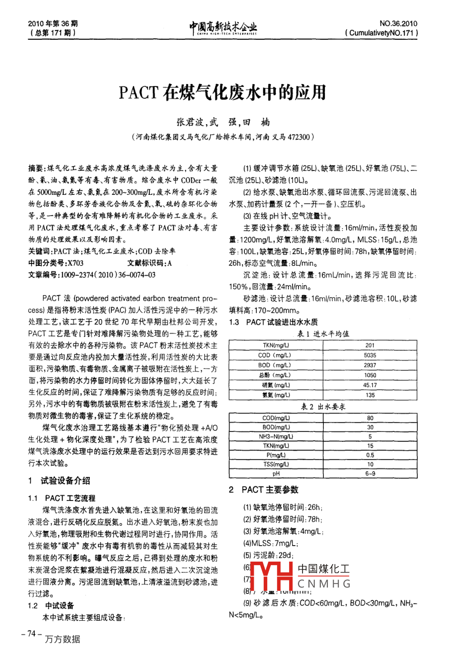 PACT在煤氣化廢水中的應(yīng)用