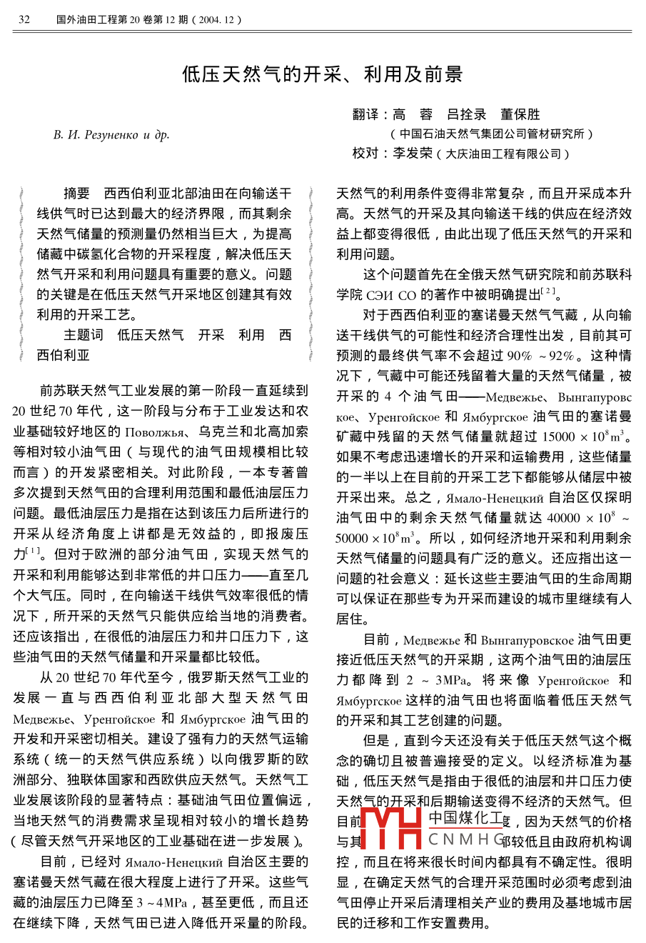 32國(guó)外油田工程第20卷第12期(2004.12)低壓天然氣的開采、利用及前景翻譯:高蓉呂拴錄董保勝B. H. PeayHeHKo u op中國(guó)石油天然氣集團(tuán)公司管材研究所校對(duì):李發(fā)榮(大慶油田工程有限公司)摘要西西伯利亞北部油田在向輸送干天然氣的利用條件變得非常復(fù)雜,而且開采成本升線供氣時(shí)已達(dá)到最大的經(jīng)濟(jì)界限,而其剩余高。天然氣的開采及其向輸送干線的供應(yīng)在經(jīng)濟(jì)效天然氣儲(chǔ)量的預(yù)測(cè)量仍然相當(dāng)巨大,為提高益上都變得很低,由此出現(xiàn)了低壓天然氣的開采和儲(chǔ)藏中碳?xì)浠衔锏拈_采程度,解決低壓天利用問(wèn)題。然氣開采和利用問(wèn)題具有重要的意義。問(wèn)題這個(gè)問(wèn)題首先在全俄天然氣研究院和前蘇聯(lián)科的關(guān)鍵是在低壓天然氣開采地區(qū)創(chuàng)建其有效學(xué)院 CeN CO的著作中被明確提出2利用的開采工藝。對(duì)于西西伯利亞的塞諾曼天然氣氣藏,從向輸主題詞低壓天然氣開采利用西送干線供氣的可能性和經(jīng)濟(jì)合理性出發(fā),目前其可西伯利亞預(yù)測(cè)的最終供氣率不會(huì)超過(guò)90%~92%。這種情況下,氣藏中可能還殘留著大量的天然氣儲(chǔ)量,被前蘇聯(lián)天然氣工業(yè)發(fā)展的第一階段一直延續(xù)到開采的4個(gè)油氣田Merbecke、 BbihrarypoE20世紀(jì)70年代,這一階段與分布于工業(yè)發(fā)達(dá)和農(nóng)Koe、 ypehroickoe和AM6 yprCKoe油氣田的塞諾曼業(yè)基礎(chǔ)較好地區(qū)的∏oBO、馬克蘭和北高加索礦藏中殘留的天然氣儲(chǔ)量就超過(guò)15000×10°m3等相對(duì)較小油氣田(與現(xiàn)代的油氣田規(guī)模相比較如果不考慮迅速增長(zhǎng)的開采和運(yùn)輸費(fèi)用,這些儲(chǔ)量而言)的開發(fā)緊密相關(guān)。對(duì)此階段,一本專著曾的一半以上在目前的開采工藝下都能夠從儲(chǔ)層中被多次提到天然氣田的合理利用范圍和最低油層壓力開采出來(lái)。總之,樂(lè) Mano-hehellkHI自治區(qū)僅探明問(wèn)題。最低油層壓力是指在達(dá)到該壓力后所進(jìn)行的油氣田中的剩余天然氣儲(chǔ)量就達(dá)400010開采從經(jīng)濟(jì)角度上講都是無(wú)效益的,即報(bào)廢壓5000×105m3。所以,如何經(jīng)濟(jì)地開采和利用剩余力1。但對(duì)于歐洲的部分油氣田,實(shí)現(xiàn)天然氣的天然氣儲(chǔ)量的問(wèn)題具有廣泛的意義。還應(yīng)指出這開采和利用能夠達(dá)到非常低的井囗壓力—直至幾問(wèn)題的社會(huì)意義:延長(zhǎng)這些主要油氣田的生命周期個(gè)大氣壓。同時(shí),在向輸送干線供氣效率很低的情可以保證在那些專為開采而建設(shè)的城市里繼續(xù)有人況下,所開采的天然氣只能供應(yīng)給當(dāng)?shù)氐南M(fèi)者。居住還應(yīng)該指出,在很低的油層壓力和井口壓力下,這目前, MerBecke和 BbIHrarrypoBckoe油氣田更些油氣田的天然氣儲(chǔ)量和開采量都比較低。接近低壓天然氣的開采期,這兩個(gè)油氣田的油層壓從20世紀(jì)70年代至今,俄羅斯天然氣工業(yè)的力都降到2~3MPa。將來(lái)像 y pehroickoe和發(fā)展一直與西西伯利亞北部大型天然氣田s6 yprckoe這樣的油氣田也將面臨著低壓天然氣MenBexkbe、 y pehroicKoe和6 yprcKoe油氣田的的開采和其工藝創(chuàng)建的問(wèn)題開發(fā)和開采密切相關(guān)。建設(shè)了強(qiáng)有力的天然氣運(yùn)輸?shù)?直到今天還沒有關(guān)于低壓天然氣這個(gè)概系統(tǒng)(統(tǒng)一的夭然氣供應(yīng)系統(tǒng))以向俄羅斯的歐念的確切且被普遍接受的定義。以經(jīng)濟(jì)標(biāo)準(zhǔn)為基洲部分、獨(dú)聯(lián)體國(guó)家和西歐供應(yīng)天然氣。天然氣工礎(chǔ),低壓天然氣是指由于很低的油層和井囗壓力使業(yè)發(fā)展該階段的顯著特點(diǎn):基礎(chǔ)油氣田位置偏遠(yuǎn),天然氣的開采和后期輸送變得不經(jīng)濟(jì)的天然氣。但當(dāng)?shù)靥烊粴獾南M(fèi)需求呈現(xiàn)相對(duì)較小的增長(zhǎng)趨勢(shì)目前中國(guó)煤化工,因?yàn)樘烊粴獾膬r(jià)格盡管天然氣開采地區(qū)的工業(yè)基礎(chǔ)在進(jìn)一步發(fā)展與其CNMH(邙較低且由政府機(jī)構(gòu)調(diào)目前,已經(jīng)對(duì)Mao-Heek自治區(qū)主要的控,而且在將來(lái)很長(zhǎng)時(shí)間內(nèi)都具有不確定性。很明塞諾曼天然氣藏在很大程度上進(jìn)行了開采。這些氣顯,在確定天然氣的合理開采范圍時(shí)必須考慮到油藏的油層壓力已降至3~4MPa,甚至更低,而且還氣田停止開采后清理相關(guān)產(chǎn)業(yè)的費(fèi)用及基地城市居在繼續(xù)下降,天然氣田已進(jìn)入降低開采量的階段。民的遷移和工作安置費(fèi)用。高蓉:低壓天然氣的開采、利用及前景33在確定停止向輸送干線供氣的時(shí)間時(shí),應(yīng)該考油氣田為例。在近25~30年內(nèi),將要確定這些油慮到在油氣田采用的天然氣開采和預(yù)處理工藝及設(shè)氣田低壓天然氣的儲(chǔ)量和開采水平。預(yù)測(cè)將以研究備安裝系統(tǒng),還要考慮到低壓天然氣利用的規(guī)劃工及其外延到設(shè)計(jì)預(yù)算范圍外的設(shè)計(jì)指數(shù)為基礎(chǔ)。藝。在秋明地區(qū)北部主要的塞諾曼油氣田基本上都近10年來(lái)在 BbIhranmypoBckoe和MeBe;be油采用兩級(jí)天然氣壓縮系統(tǒng)瓜KC。最初的設(shè)計(jì)壓縮