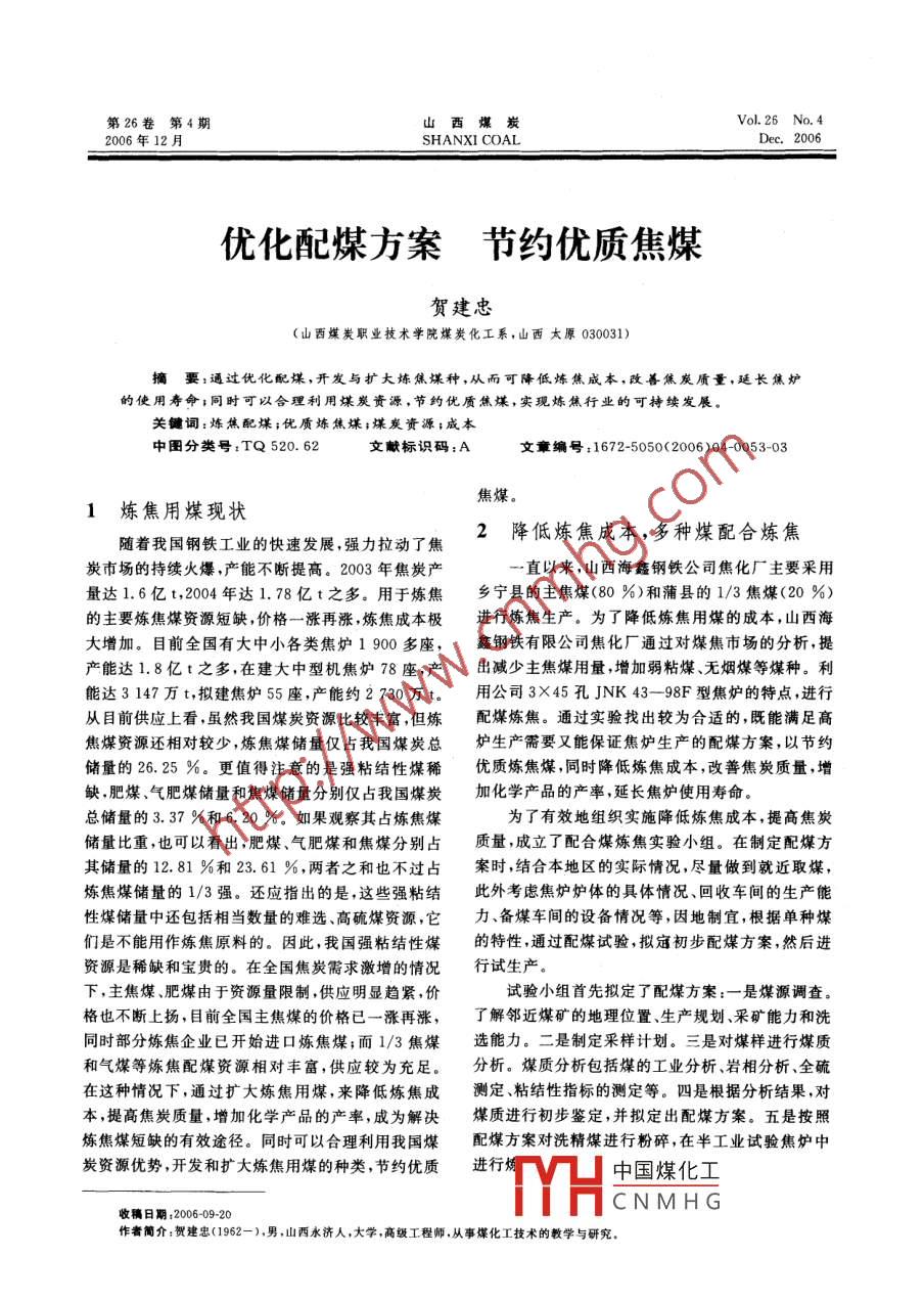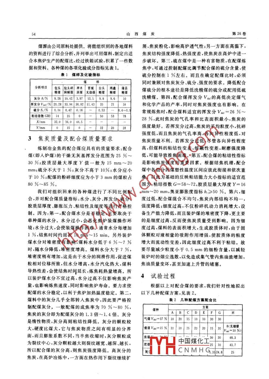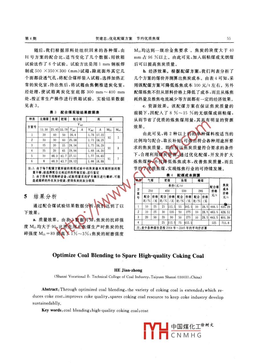 第26卷第4期山西煤炭Vol.26 No. 42006年12月SHANXI COALDec.2006優(yōu)化配煤方案節(jié)約優(yōu)質(zhì) 焦煤賀建忠(山西煤炭職業(yè)技術(shù)學(xué)院煤炭化工系,山西太原030031)摘要;通過(guò)優(yōu)化配煤,開(kāi)發(fā)與擴(kuò)大煉焦煤種,從而可降低煉焦成本,改善焦炭質(zhì)量,延長(zhǎng)焦?fàn)t的使用壽命;同時(shí)可以合理利用煤炭責(zé)源,節(jié)約優(yōu)質(zhì)焦煤,實(shí)現(xiàn)煉焦行業(yè)的可持續(xù)發(fā)展。關(guān)鍵詞:煉焦配煤;優(yōu)質(zhì)煉焦煤;煤炭資源;咸本中圈分類號(hào):TQ 520. 62文獻(xiàn)標(biāo)識(shí)碼:A文章編號(hào):1672-5050(2006)04-0053-03焦煤。1煉焦用煤現(xiàn)狀隨著我國(guó)鋼鐵工業(yè)的快速發(fā)展,強(qiáng)力拉動(dòng)了焦2降低煉焦成本,多種煤配合煉焦炭市場(chǎng)的持續(xù)火爆,產(chǎn)能不斷提高。2003 年焦炭產(chǎn)-直以來(lái),山西海鑫鋼鐵公司焦化廠主要采用量達(dá)1.6億t,2004年達(dá)1.78億t之多。用于煉焦鄉(xiāng)寧縣的主焦煤(80 %)和蒲縣的1/3焦煤(20 %)的主要煉焦煤資源短缺,價(jià)格一漲再漲,煉焦成本極進(jìn)行煉焦生產(chǎn)。為了降低煉焦用煤的成本,山西海.大增加。目前全國(guó)有大中小各類焦?fàn)t1 900多座,鑫鋼鐵有限公司焦化廠通過(guò)對(duì)煤焦市場(chǎng)的分析,提產(chǎn)能達(dá)1.8億t之多,在建大中型機(jī)焦?fàn)t78座,產(chǎn)出減少主焦煤用量,增加弱粘煤、無(wú)煙煤等煤種。利能達(dá)3 147萬(wàn)t,擬建焦?fàn)t55座,產(chǎn)能約2 730萬(wàn)t。用公司3X45孔JNK 43- -98F 型焦?fàn)t的特點(diǎn),進(jìn)行從目前供應(yīng)上看,雖然我國(guó)煤炭資源比較豐富,但煉配煤煉焦。通過(guò)實(shí)驗(yàn)找出較為合適的,既能滿足高焦煤資源還相對(duì)較少,煉焦煤儲(chǔ)量?jī)H占我國(guó)煤炭總爐生產(chǎn)需要又能保證焦?fàn)t生產(chǎn)的配煤方案,以節(jié)約儲(chǔ)量的26.25%。更值得注意的是強(qiáng)粘結(jié)性煤稀優(yōu)質(zhì)煉焦煤,同時(shí)降低煉焦成本,改善焦炭質(zhì)量,增缺,肥煤、氣肥煤儲(chǔ)量和焦煤儲(chǔ)量分別僅占我國(guó)煤炭加化學(xué)產(chǎn)品的產(chǎn)率,延長(zhǎng)焦?fàn)t使用壽命??們?chǔ)量的3.37 %和6. 20 %。如果觀察其占煉焦煤為了有效地組織實(shí)施降低煉焦成本,提高焦炭?jī)?chǔ)量比重,也可以看出,肥煤.氣肥煤和焦煤分別占質(zhì)量,成立了配合煤煉焦實(shí)驗(yàn)小組。在制定配煤方其儲(chǔ)量的12.81 %和23.61 %,兩者之和也不過(guò)占案時(shí),結(jié)合本地區(qū)的實(shí)際情況,盡量做到就近取煤,煉焦煤儲(chǔ)量的1/3強(qiáng)。還應(yīng)指出的是,這些強(qiáng)粘結(jié)此外考慮焦?fàn)t爐體的具體情況、回收車間的生產(chǎn)能性煤儲(chǔ)量中還包括相當(dāng)數(shù)量的難選、高硫煤資源,它力、備煤車間的設(shè)備情況等,因地制宜,根據(jù)單種煤.們是不能用作煉焦原料的。因此,我國(guó)強(qiáng)粘結(jié)性煤的特性,通過(guò)配煤試驗(yàn),擬定初步配煤方案,然后進(jìn)資源是稀缺和寶貴的。在全國(guó)焦炭需求激增的情況行試生產(chǎn)。下,主焦煤、肥煤由于資源量限制,供應(yīng)明顯趨緊,價(jià)試驗(yàn)小組首先擬定了配煤方案:-是煤源調(diào)查。格也不斷上揚(yáng),目前全國(guó)主焦煤的價(jià)格已一漲再漲,了 解鄰近煤礦的地理位置、生產(chǎn)規(guī)劃、采礦能力和洗同時(shí)部分煉焦企業(yè)已開(kāi)始進(jìn)口煉焦煤;而1/3焦煤選能力。二是制定采樣計(jì)劃。三是對(duì)煤樣進(jìn)行煤質(zhì)和氣煤等煉焦配煤資源相對(duì)豐富,供應(yīng)較為充足。分析。煤質(zhì)分析包括煤的工業(yè)分析、巖相分析、全硫在這種情況下,通過(guò)擴(kuò)大煉焦用煤,來(lái)降低煉焦成測(cè)定、粘結(jié)性指標(biāo)的測(cè)定等。四是根據(jù)分析結(jié)果,對(duì)本,提高焦炭質(zhì)量,增加化學(xué)產(chǎn)品的產(chǎn)率,成為解決煤質(zhì)進(jìn)行初步鑒定,并擬定出配煤方案。五是按照煉焦煤短缺的有效途徑。同時(shí)可以合理利用我國(guó)煤配煤方案對(duì)洗精煤進(jìn)行粉碎,在半工業(yè)試驗(yàn)焦?fàn)t中炭資源優(yōu)勢(shì),開(kāi)發(fā)和擴(kuò)大煉焦用煤的種類,節(jié)約優(yōu)質(zhì)進(jìn)行中國(guó)煤化工TYHCNMHG收稿日期2006-09-20作者簡(jiǎn)介;賀建忠(1962- ),男 ,山西永濟(jì)人,大學(xué),高級(jí)工程師,從事煤化工技術(shù)的教學(xué)與研究。54山西煤炭第26卷煤源由公司原料處提供。將能組織到的各地煤料展,焦炭粉化,影響高爐透氣性;另一方面在高溫下,的資料進(jìn)行了綜合分析,并列舉出可用煤料,制定出適焦炭結(jié)構(gòu)強(qiáng)度降低,熱強(qiáng)度差,使焦炭在高爐中進(jìn)-一合本焦?fàn)t生產(chǎn)的配煤比,經(jīng)過(guò)鐵箱試驗(yàn),積累了一些數(shù)步破壞。第三,硫在煤中是一種有害物質(zhì),在配煤煉據(jù)和資料。各種煤的各項(xiàng)化驗(yàn)成分指標(biāo)見(jiàn)表1.焦中,可通過(guò)控制配煤比調(diào)節(jié)配合煤的硫分含量,使表1煤樣及化驗(yàn)指標(biāo).硫分控制在1 %左右。而且在確定配煤比時(shí),必須煤同時(shí)兼顧對(duì)焦炭灰分、硫分、強(qiáng)度的要求。降低配合分析項(xiàng)目包頭包頭碎神木晉城臺(tái)頭鴻鑫蒲縣煤硫分的根本途徑是降低洗精煤的硫分或配用低碗精煤潤