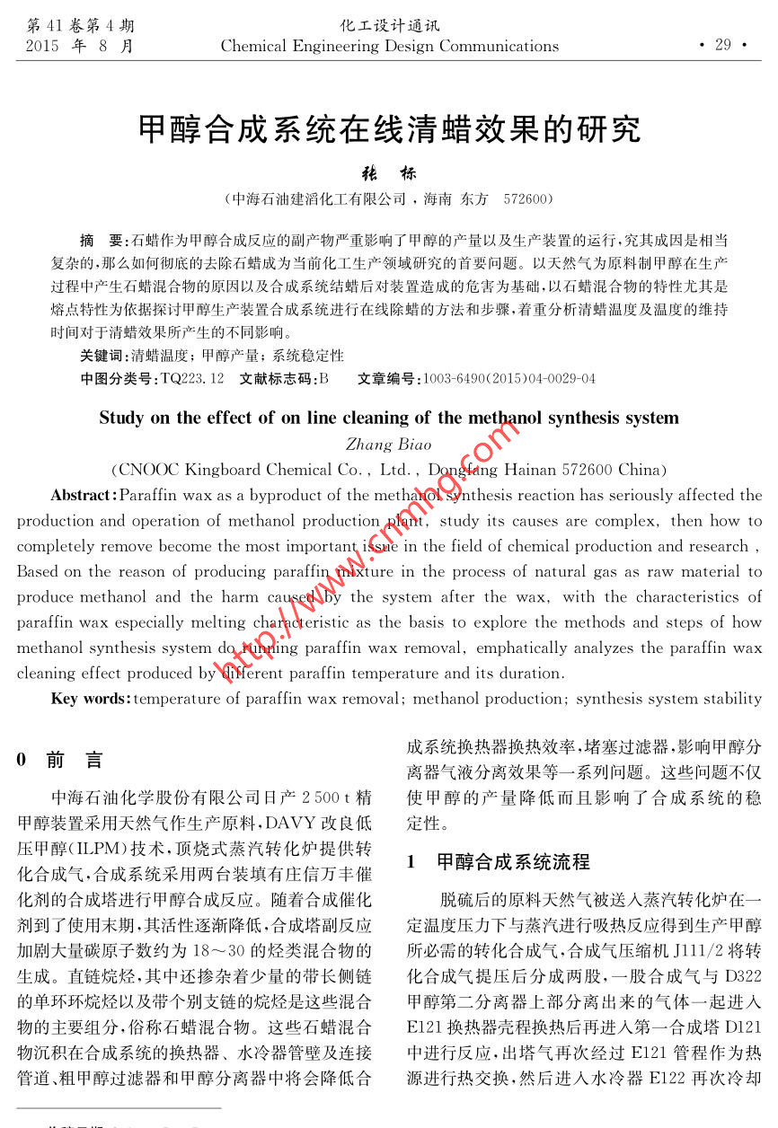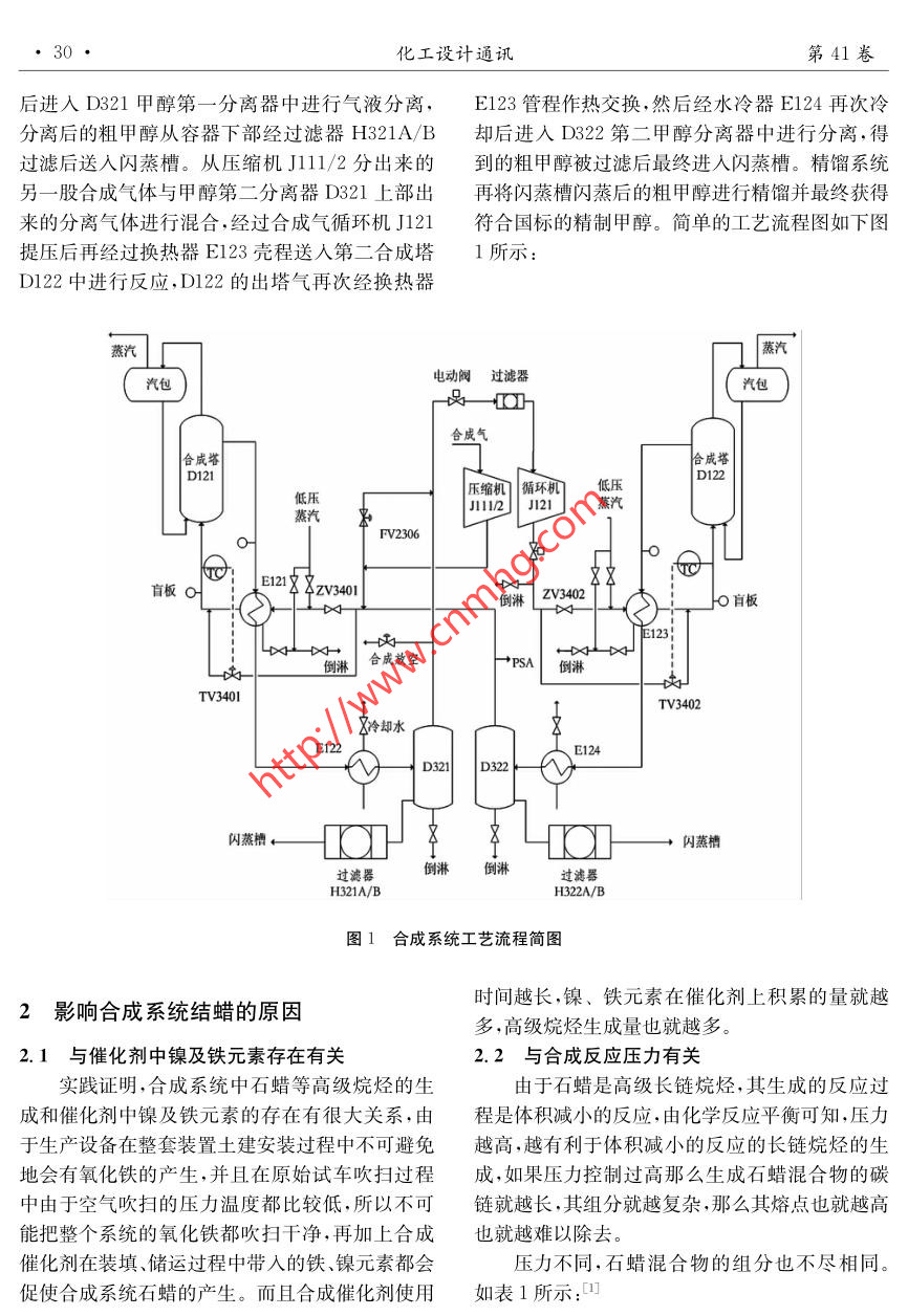 第41卷第4期化工設計通訊.2015年8月Chemical Engineering Design Communications●29●甲醇合成系統(tǒng)在線清蠟效果的研究張標(中海石油建滔化工有限公司,海南東方572600)摘要:石蠟作為甲醇合成反應的副產物嚴重影響了甲醇的產量以及生產裝置的運行,究其成因是相當復雜的,那么如何徹底的去除石蠟成為當前化工生產領域研究的首要問題。以天然氣為原料制甲醇在生產過程中產生石蠟混合物的原因以及合成系統(tǒng)結蠟后對裝置造成的危害為基礎,以石蠟混合物的特性尤其是熔點特性為依據(jù)探討甲醇生產裝置合成系統(tǒng)進行在線除蠟的方法和步驟,著重分析清蠟溫度及溫度的維持時間對于清蠟效果所產生的不同影響。關鍵詞:清蠟溫度;甲醇產量;系統(tǒng)穩(wěn)定性中圖分類號:TQ223.12文 獻標志碼:B文章編號:1003-6490( 2015)04-0029-04Study on the effect of on line cleaning of the methanol synthesis systemZhang Biao(CNOOC Kingboard Chemical Co., Ltd., Dongfang Hainan 572600 China)Abstract: Paraffin wax as a byproduct of the methanol synthesis reaction has seriously affected theproduction and operation of methanol production plant, study its causes are complex, then how tocompletely remove become the most important issue in the field of chemical production and research,Based on the reason of producing paraffin mixture in the process of natural gas as raw material toproduce methanol and the harm caused by the system after the wax,with the characteristics ofparaffin wax especially melting characteristic as the basis to explore the methods and steps of howmethanol synthesis system do running paraffin wax removal, emphatically analyzes the paraffin waxcleaning effect produced by different paraffin temperature and its duration.Key words:temperature of paraffin wax removal; methanol production; synthesis system stability成系統(tǒng)換熱器換熱效率,堵塞過濾器,影響甲醇分0前言離器氣液分離效果等一- 系列問題。這些問題不僅中海石油化學股份有限公司日產2500t精.使甲醇的產量降低而且影響了合成系統(tǒng)的穩(wěn)甲醇裝置采用天然氣作生產原料,DAVY改良低定性。壓甲醇(ILPM)技術,頂燒式蒸汽轉化爐提供轉甲醇合成系統(tǒng)流程化合成氣,合成系統(tǒng)采用兩臺裝填有莊信萬豐催化劑的合成塔進行甲醇合成反應。隨著合成催化脫硫后的原料天然氣被送人蒸汽轉化爐在一劑到了使用末期,其活性逐漸降低,合成塔副反應定溫度壓力下與蒸汽進行吸熱反應得到生產甲醇加劇大量碳原子數(shù)約為18~ 30的烴類混合物的所必需的轉化合成氣,合成氣壓縮機J111/2將轉生成。直鏈烷烴,其中還摻雜著少量的帶長側鏈化合成氣提壓后分成兩股,一股合成氣與D322的單環(huán)環(huán)烷烴以及帶個別支鏈的烷烴是這些混合甲醇第二分離器.上部分離出來的氣體- - 起進人.物的主要組分,俗稱石蠟混合物。這些石蠟混合E121換熱器殼程換熱后再進人第- -合成塔DI21 .物沉積在合成系統(tǒng)的換熱器、水冷器管壁及連接中進行反應,出塔氣再次經過E121管程作為熱管道、粗甲醇過濾器和甲醇分離器中將會降低合源進行熱交換,然后進入水冷器E122再次冷卻收稿日期:2015-07-07作者簡介:張標( 1982 - )男,山東淄博人,本科,助理工程師,從事甲醇生產及管理工作。郵箱:zhanggzt@ 126. com●30●化工設計通訊第41卷后進入D321甲醇第一分離器中進行氣液分離,E123管程作熱交換,然后經水冷器E124再次冷.分離后的粗甲醇從容器下部經過濾器H321A/B卻后進入D322第二甲醇分離器中進行分離,得過濾后送入閃蒸槽。從壓縮機J111/2分出來的到的粗甲醇被過濾后最終進人閃蒸槽。精餾系統(tǒng).另一股合成氣體與甲醇第二分離器D321上部出再將閃蒸槽閃蒸后的粗甲醇進行精餾并最終獲得來的分離氣體進行混合,經過合成氣循環(huán)機J121符合國標的精制甲醇。簡單的工藝流程圖如下圖提壓后再經過換熱器E123殼程送入第二合成塔1所示:D122中進行反應,D122的出塔氣再次經換熱器蒸汽電動閥過濾器汽包& COIh合成氣合成塔D121| D122| 壓縮機循環(huán)機低壓111/2 J121]蒸汽蒸汽農FV2306盲板oE21&XzV3401倒淋ZV3402fo盲板一D| E123←Dxt山合成放空+PSA山TV3401↑TV34028冷卻水E122E124D321|| D322閃蒸槽+K衛(wèi). 閃蒸槽過濾器H321A/BH322A/B圖1合成系統(tǒng)工 藝流程簡圖時間越長,鎳、鐵元素在催化劑上積累的量就越2影響合成系統(tǒng)結蠟的原因多,高級烷烴生成量也就越多。2.1與催化劑中鎳及鐵元素存在有關2.2 與合成反應壓力有關實踐證明,合成系統(tǒng)中石蠟等高級烷烴的生由于石蠟是高級長鏈烷烴,其生成的反應過成和催化劑中鎳及鐵元素的存在有很大關系,由程 是體積減小的反應,由化學反應平衡可知,壓力于生產設備在整套裝置土建安裝過程中不可避免越高,越有利于體積減小的反應的長鏈烷烴的生地會有氧化鐵的產生,并且在原始試車吹掃過程成,如果壓力控制過高那么生成石蠟混合物的碳中由于空氣吹掃的壓力溫度都比較低,所以不可鏈就越長,其組分就越復雜,那么其熔點也就越高能把整個系統(tǒng)的氧化鐵都吹掃干凈,再加上合成也就越 難以除去。催化劑在裝填、儲運過程中帶人的鐵、鎳元素都會壓力不同,石蠟混合物的組分也不盡相同。促使合成系統(tǒng)石蠟的產生。而且合成催化劑使用如表1所示:1第4期張標:甲醇合成 系統(tǒng)在線清蠟效果的研究●31●表1合成壓力(MPa)~C15C15~C20C20~C25C25~C30C15~C15C30~C35~C4051. 75%16. 84%50. 04%29. 25%2. 12%135. 60%41. 87%19.
